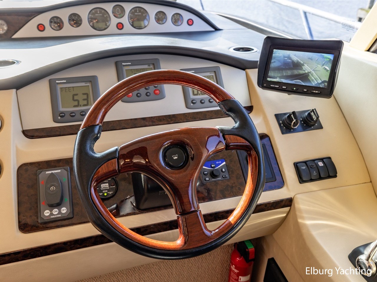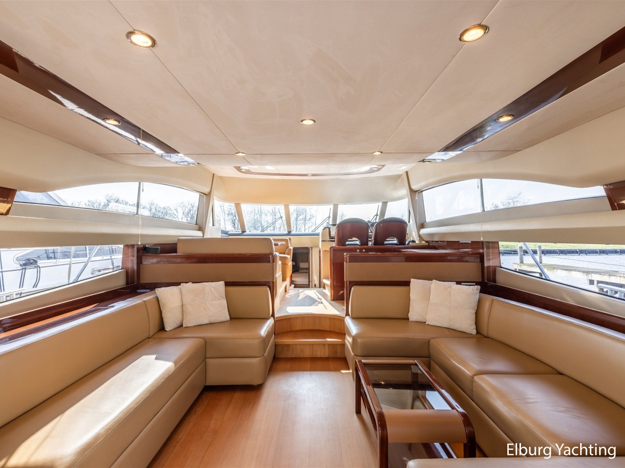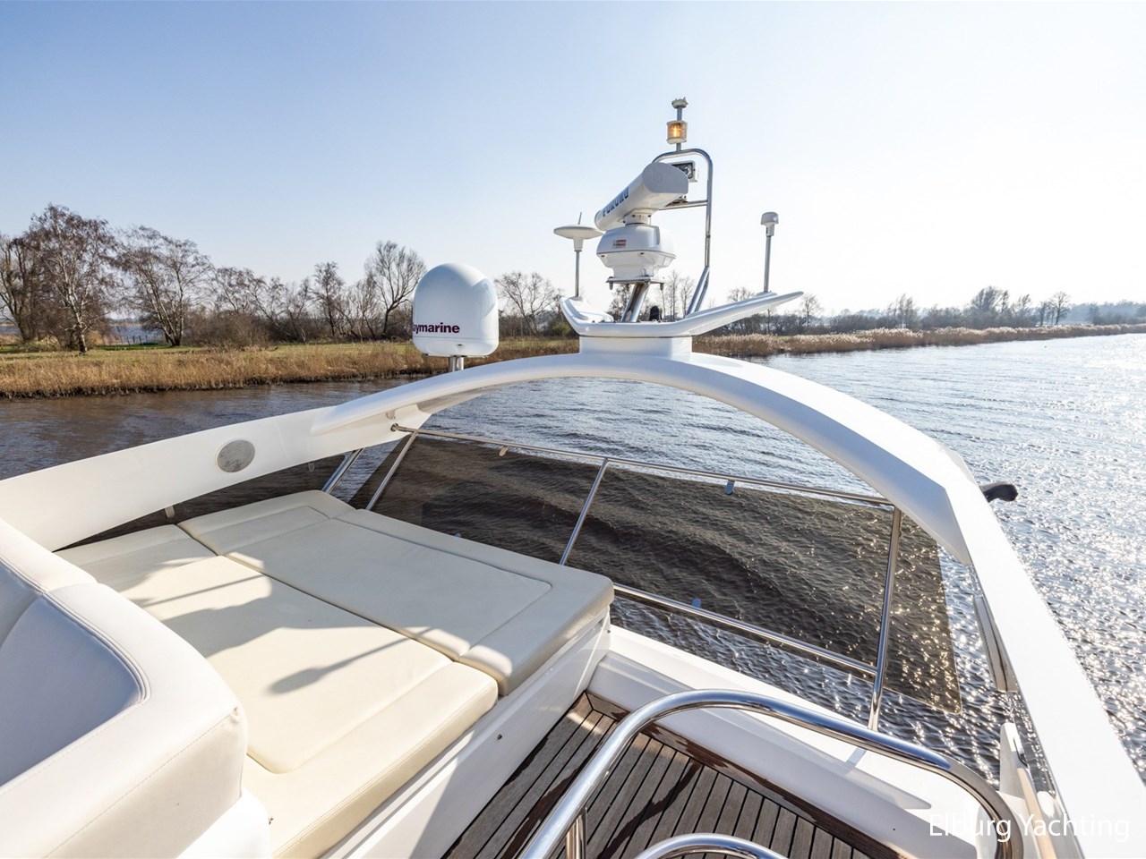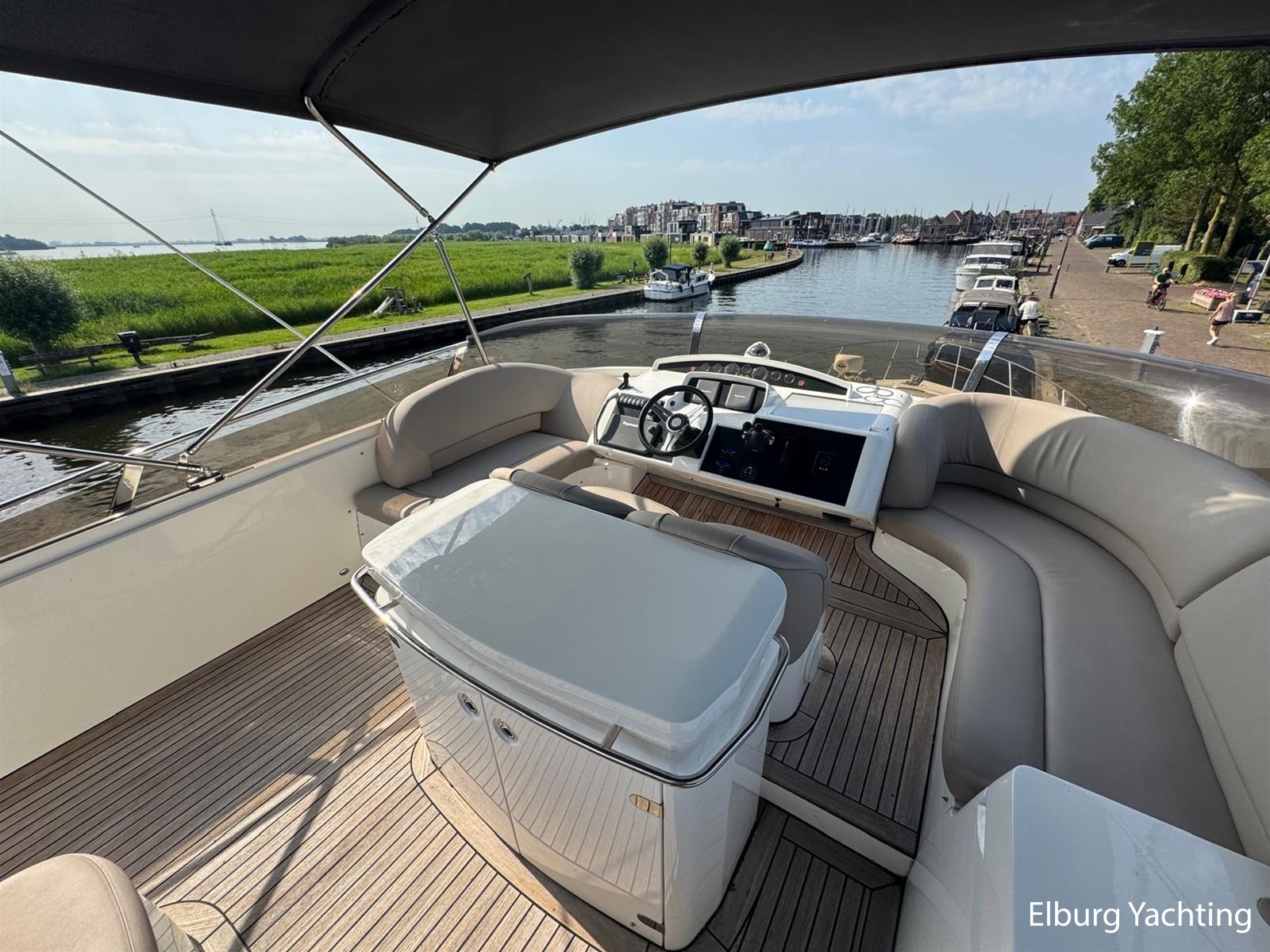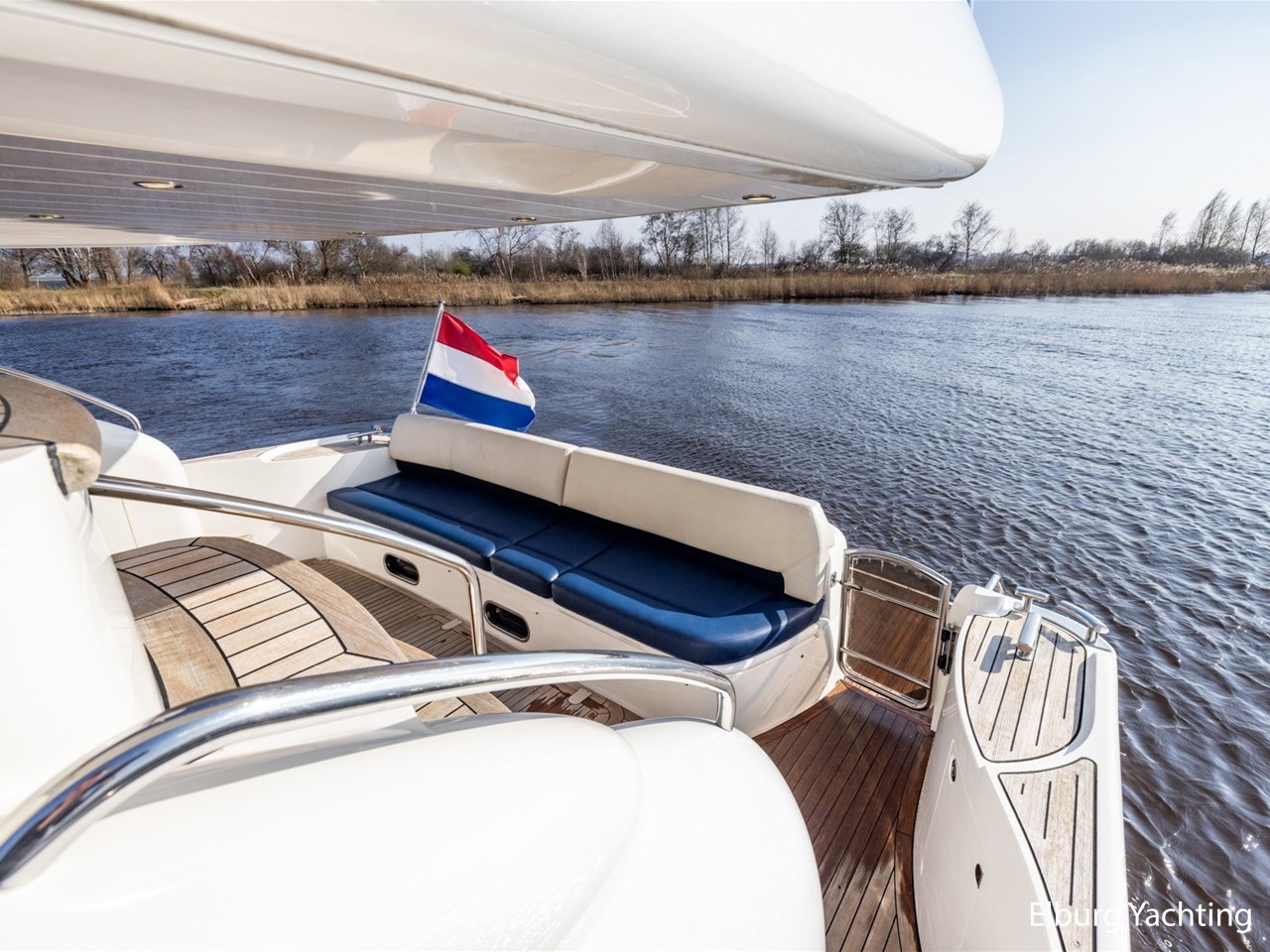 Beautiful Princess 58 Flybridge from renowned yacht builder Princess Yachts. The yacht features high-quality finishes and is fully equipped. The Princess 58 Fybridge has three spacious cabins, two of which have en-suite facilities. The yacht also has a crew cabin that can be accessed via the cockpit bench. The owners cabin is amidships with beautiful windows that provide plenty of light, great views and can be opened for ventilation. Luxurious interior. Spacious open cockpit that can be fully closed by means of a tent and has new upholstery (2024). Large stainless steel sliding door to spacious saloon, connecting indoor and outdoor space. Entering the saloon, you will find a spacious u-shaped settee with a TV on lift. The spacious dinette next to the steering position ensures that it is possible for the skipper to stay in touch with the company on board, the steering position features 2 luxury cruising seats, and a yacht controller remote control making docking and mooring easy. The yacht features: complete cockpit tent + bimini (2024), screens for the windows (2024), high-gloss cherry wood interior with beige leather upholstery, white suede ceilings, Bose audio system, fridge in saloon, new combi microwave (2024), dinette at co-sailing height, 2 leather cruising seats, rear-view camera, CruisAir air conditioning controllable in each room, Zanussi dishwasher, Bosch washer-dryer combination, lots of light through large windows in owner's cabin, one of the windows can be opened for ventilation, 2 showers in lockable cabin, spacious cockpit with lazy stairs to flybridge, wetbar with sink and grill on flybridge, refrigeration space between the benches, berth space on flybridge, upholstery completely covered with covers. For questions and/or to make an appointment, you are welcome 7 days a week at Elburg Yachting.