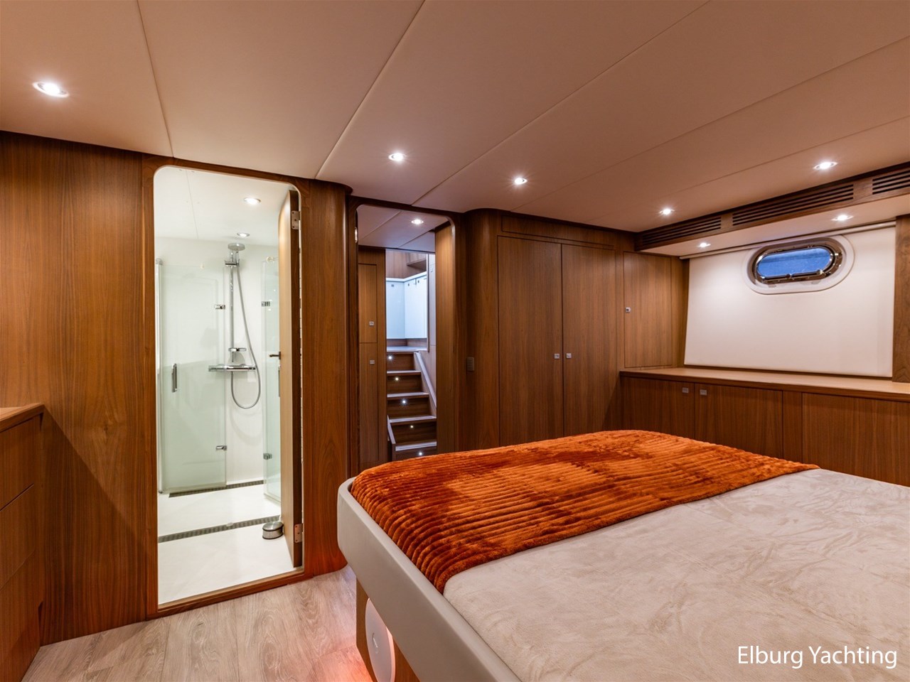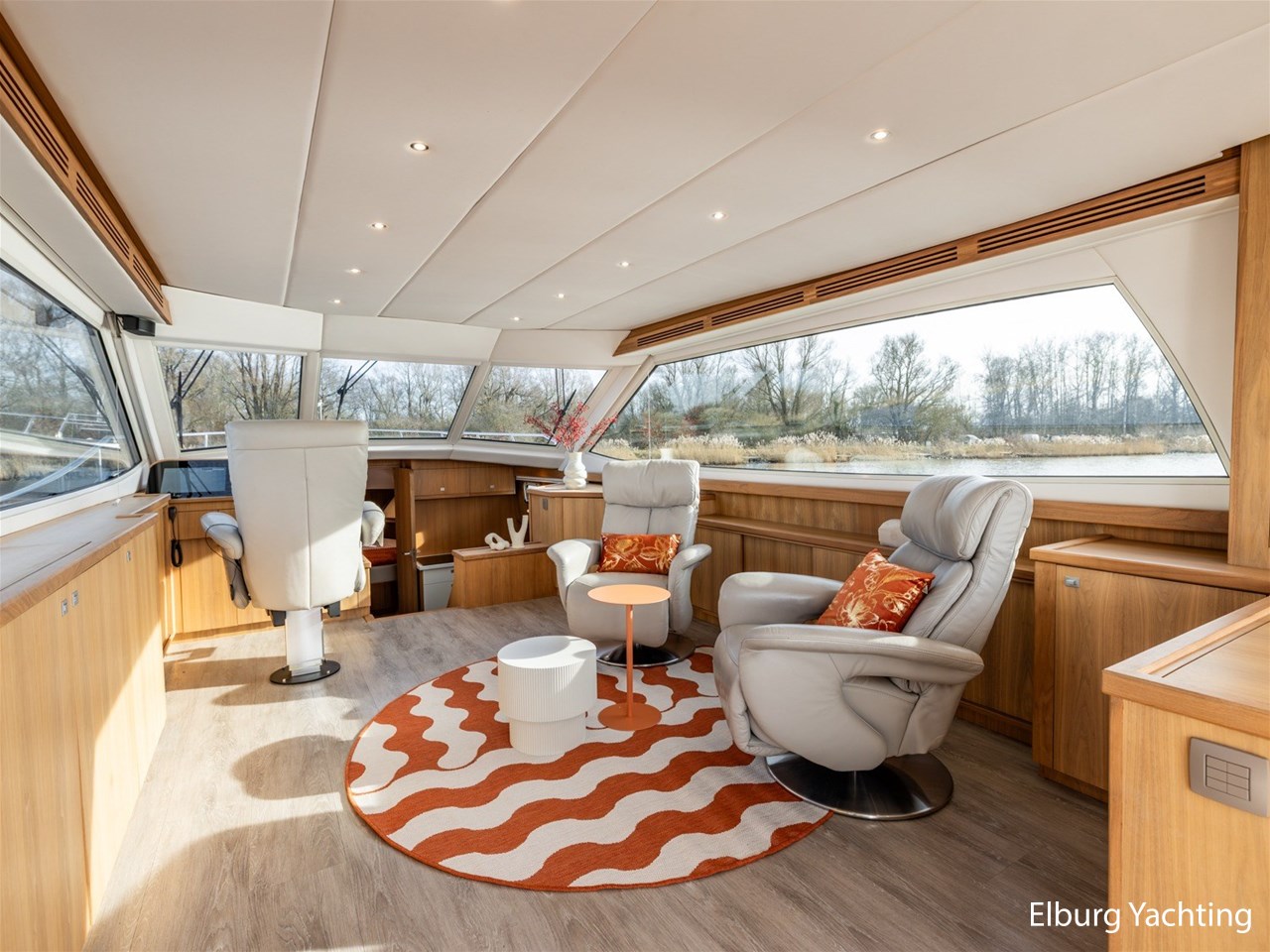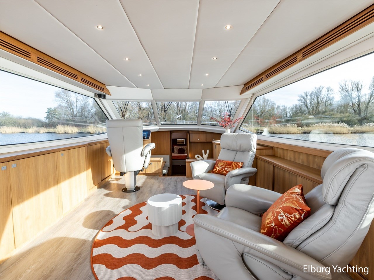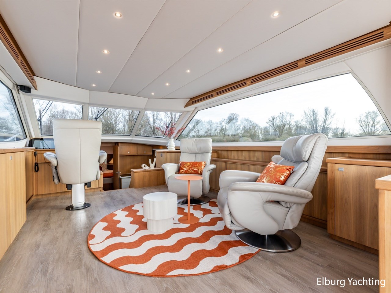 This motor yacht was designed by Vripack and built by the renowned shipyard Het Oude Maasje in Waspik (NL). This robust steel round bilge motor yacht with hydraulic fin stabilizers, elegant flared bow, high bulwark and partly covered side and aft deck is unique in its class. The yacht has two spacious 2-person cabins with shower and toilet en-suite. The saloon is spacious with two movable chairs which are electrically adjustable. The space in the saloon offers the possibility to place a fixed bench by a yacht wood worker in the future. There is good all-round visibility from the steering position and the ship can also be easily operated with a wired control unit with the functionalities rudder/engine and bow-stern thruster. This remote control can be placed on the armrest of the helmsman's seat or on two sides of the aft deck and even on the foredeck. The saloon and the aft deck can be fully connected by the foldable stainless steel doors. A complete tent around the aft deck (removable) provides a comfortable atmosphere. The aft deck can be closed off from the sidedeck with two side doors. Via the aft deck there is also access to a storage space in the aft ship and also a second passage to the engine room, which can also be reached from the inside. A nice addition to the technology on board are the two hydraulic spud poles, which make finding a mooring spot in shallow water child's play and offer almost complete (habitable) autonomy on the water. This Vripack 1700 is equipped with: Full tent around the aft deck with zip-out viewing windows, 4 x stainless steel foldable doors to saloon, outdoor lighting on the aft deck / gangways and stairs to the bathing platform, 3 x TV on lift in saloon + 1 x TV in owner's cabin, Boose audio, partly electrically operated blinds for saloon windows, luxury adjustable pilot seat, dinette table electrically adjustable in height, Miele dishwasher, corian tops in kitchen and bathroom, many 220V wall sockets, extra storage space under kitchen floor, LED lighting throughout the ship, AEG washer-dryer, 2 x access to engine room, central vacuum system, tanks with manholes, extensive hydraulic system for bow and stern thruster / stabilizers / anchor winch / mast lowering system / steering, the hydraulic system is equipped with an additional 24V hydro pump to use the single hydraulic functions without the engine running, double fuel filters + micro separator, double engine water intake, engine room with good accessibility to the technique, 2 x access in railing (SB + PS), air compressor, 2 x hydraulic spud poles, camera system, removable sunshades around saloon windows, oval stainless steel railing all around, removable lightweight gangway, 9 x zonnepaneel op salondak, hydraulically foldable radar mast. Clearance with folded radar bracket is approx. 3.50m.