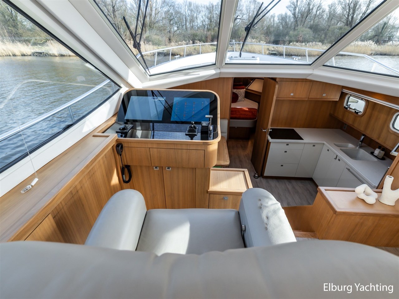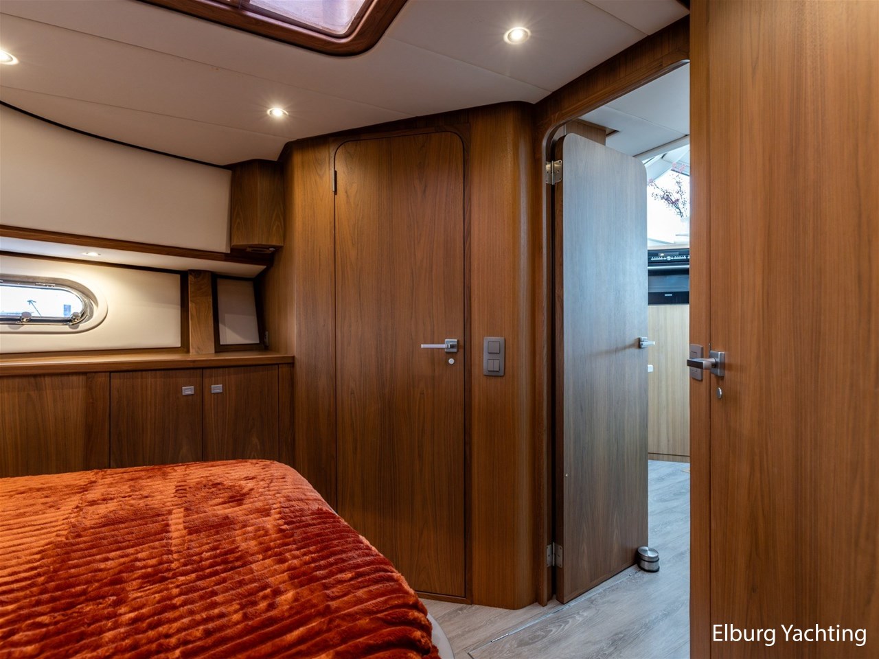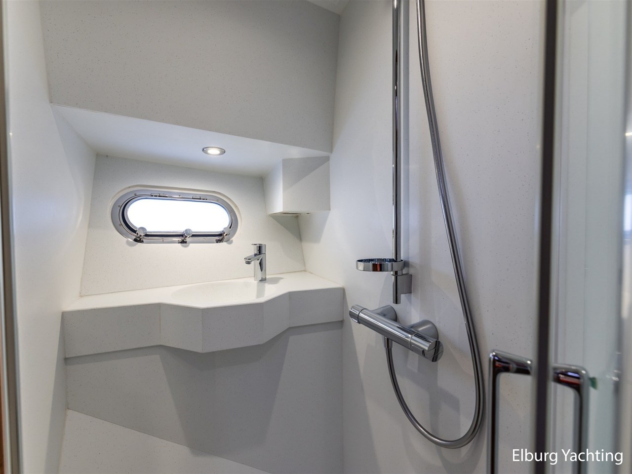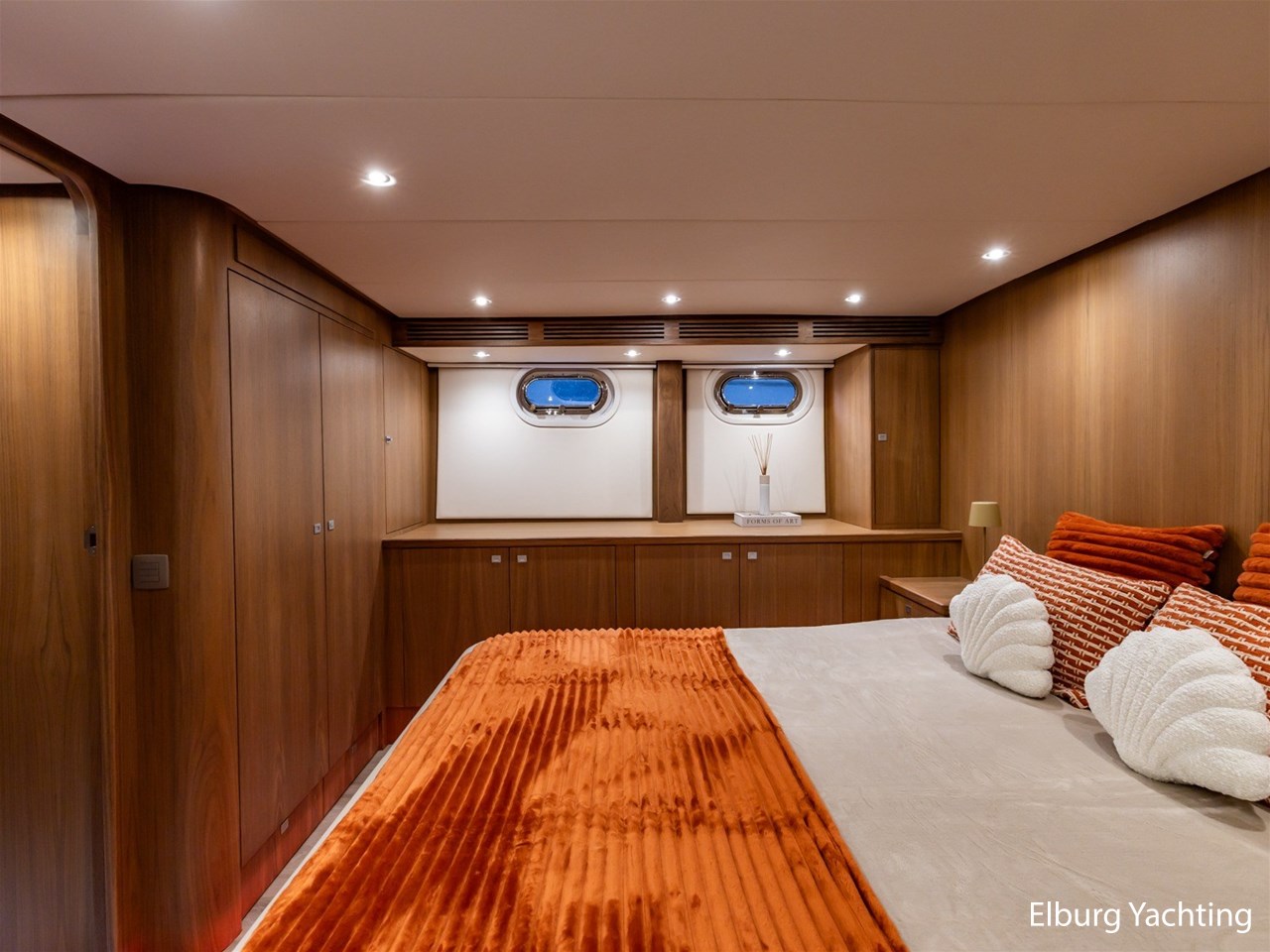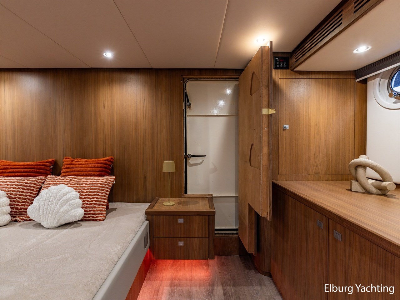 This motor yacht was designed by Vripack and built by the renowned shipyard Het Oude Maasje in Waspik (NL). This robust steel round bilge motor yacht with hydraulic fin stabilizers, elegant flared bow, high bulwark and partly covered side and aft deck is unique in its class. The yacht has two spacious 2-person cabins with shower and toilet en-suite. The saloon is spacious with two movable chairs which are electrically adjustable. The space in the saloon offers the possibility to place a fixed bench by a yacht wood worker in the future. There is good all-round visibility from the steering position and the ship can also be easily operated with a wired control unit with the functionalities rudder/engine and bow-stern thruster. This remote control can be placed on the armrest of the helmsman's seat or on two sides of the aft deck and even on the foredeck. The saloon and the aft deck can be fully connected by the foldable stainless steel doors. A complete tent around the aft deck (removable) provides a comfortable atmosphere. The aft deck can be closed off from the sidedeck with two side doors. Via the aft deck there is also access to a storage space in the aft ship and also a second passage to the engine room, which can also be reached from the inside. A nice addition to the technology on board are the two hydraulic spud poles, which make finding a mooring spot in shallow water child's play and offer almost complete (habitable) autonomy on the water. This Vripack 1700 is equipped with: Full tent around the aft deck with zip-out viewing windows, 4 x stainless steel foldable doors to saloon, outdoor lighting on the aft deck / gangways and stairs to the bathing platform, 3 x TV on lift in saloon + 1 x TV in owner's cabin, Boose audio, partly electrically operated blinds for saloon windows, luxury adjustable pilot seat, dinette table electrically adjustable in height, Miele dishwasher, corian tops in kitchen and bathroom, many 220V wall sockets, extra storage space under kitchen floor, LED lighting throughout the ship, AEG washer-dryer, 2 x access to engine room, central vacuum system, tanks with manholes, extensive hydraulic system for bow and stern thruster / stabilizers / anchor winch / mast lowering system / steering, the hydraulic system is equipped with an additional 24V hydro pump to use the single hydraulic functions without the engine running, double fuel filters + micro separator, double engine water intake, engine room with good accessibility to the technique, 2 x access in railing (SB + PS), air compressor, 2 x hydraulic spud poles, camera system, removable sunshades around saloon windows, oval stainless steel railing all around, removable lightweight gangway, 9 x zonnepaneel op salondak, hydraulically foldable radar mast. Clearance with folded radar bracket is approx. 3.50m.