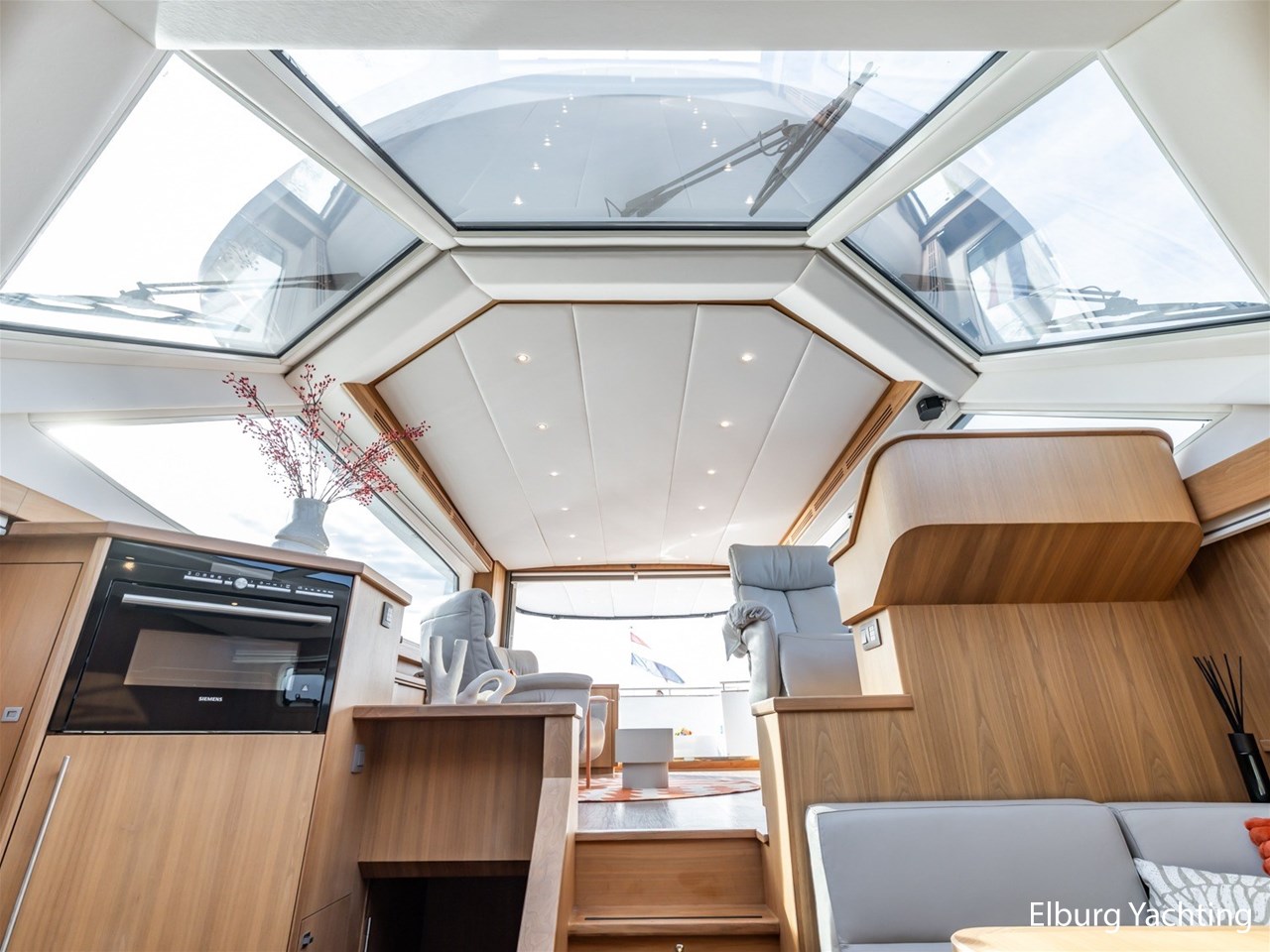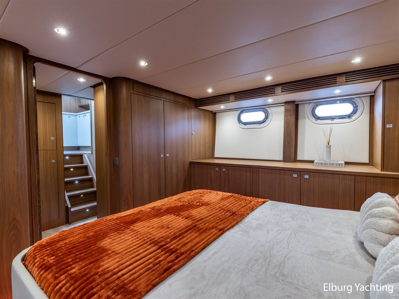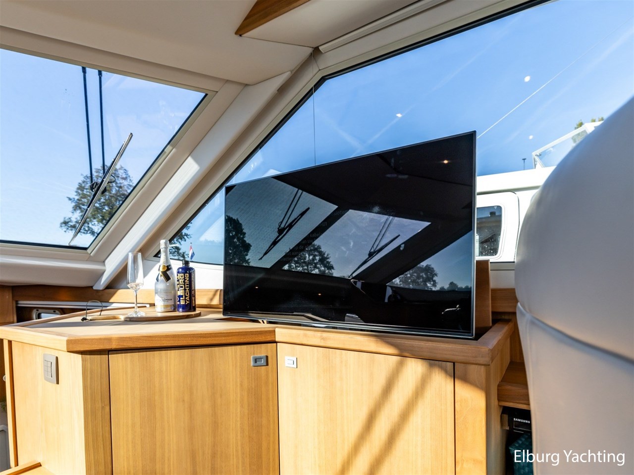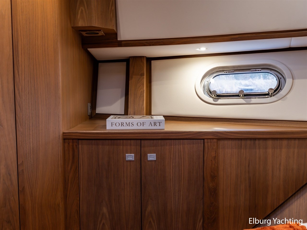 This motor yacht was designed by Vripack and built by the renowned shipyard Het Oude Maasje in Waspik (NL). This robust steel round bilge motor yacht with hydraulic fin stabilizers, elegant flared bow, high bulwark and partly covered side and aft deck is unique in its class. The yacht has two spacious 2-person cabins with shower and toilet en-suite. The saloon is spacious with two movable chairs which are electrically adjustable. The space in the saloon offers the possibility to place a fixed bench by a yacht wood worker in the future. There is good all-round visibility from the steering position and the ship can also be easily operated with a wired control unit with the functionalities rudder/engine and bow-stern thruster. This remote control can be placed on the armrest of the helmsman's seat or on two sides of the aft deck and even on the foredeck. The saloon and the aft deck can be fully connected by the foldable stainless steel doors. A complete tent around the aft deck (removable) provides a comfortable atmosphere. The aft deck can be closed off from the sidedeck with two side doors. Via the aft deck there is also access to a storage space in the aft ship and also a second passage to the engine room, which can also be reached from the inside. A nice addition to the technology on board are the two hydraulic spud poles, which make finding a mooring spot in shallow water child's play and offer almost complete (habitable) autonomy on the water. This Vripack 1700 is equipped with: Full tent around the aft deck with zip-out viewing windows, 4 x stainless steel foldable doors to saloon, outdoor lighting on the aft deck / gangways and stairs to the bathing platform, 3 x TV on lift in saloon + 1 x TV in owner's cabin, Boose audio, partly electrically operated blinds for saloon windows, luxury adjustable pilot seat, dinette table electrically adjustable in height, Miele dishwasher, corian tops in kitchen and bathroom, many 220V wall sockets, extra storage space under kitchen floor, LED lighting throughout the ship, AEG washer-dryer, 2 x access to engine room, central vacuum system, tanks with manholes, extensive hydraulic system for bow and stern thruster / stabilizers / anchor winch / mast lowering system / steering, the hydraulic system is equipped with an additional 24V hydro pump to use the single hydraulic functions without the engine running, double fuel filters + micro separator, double engine water intake, engine room with good accessibility to the technique, 2 x access in railing (SB + PS), air compressor, 2 x hydraulic spud poles, camera system, removable sunshades around saloon windows, oval stainless steel railing all around, removable lightweight gangway, 9 x zonnepaneel op salondak, hydraulically foldable radar mast. Clearance with folded radar bracket is approx. 3.50m.