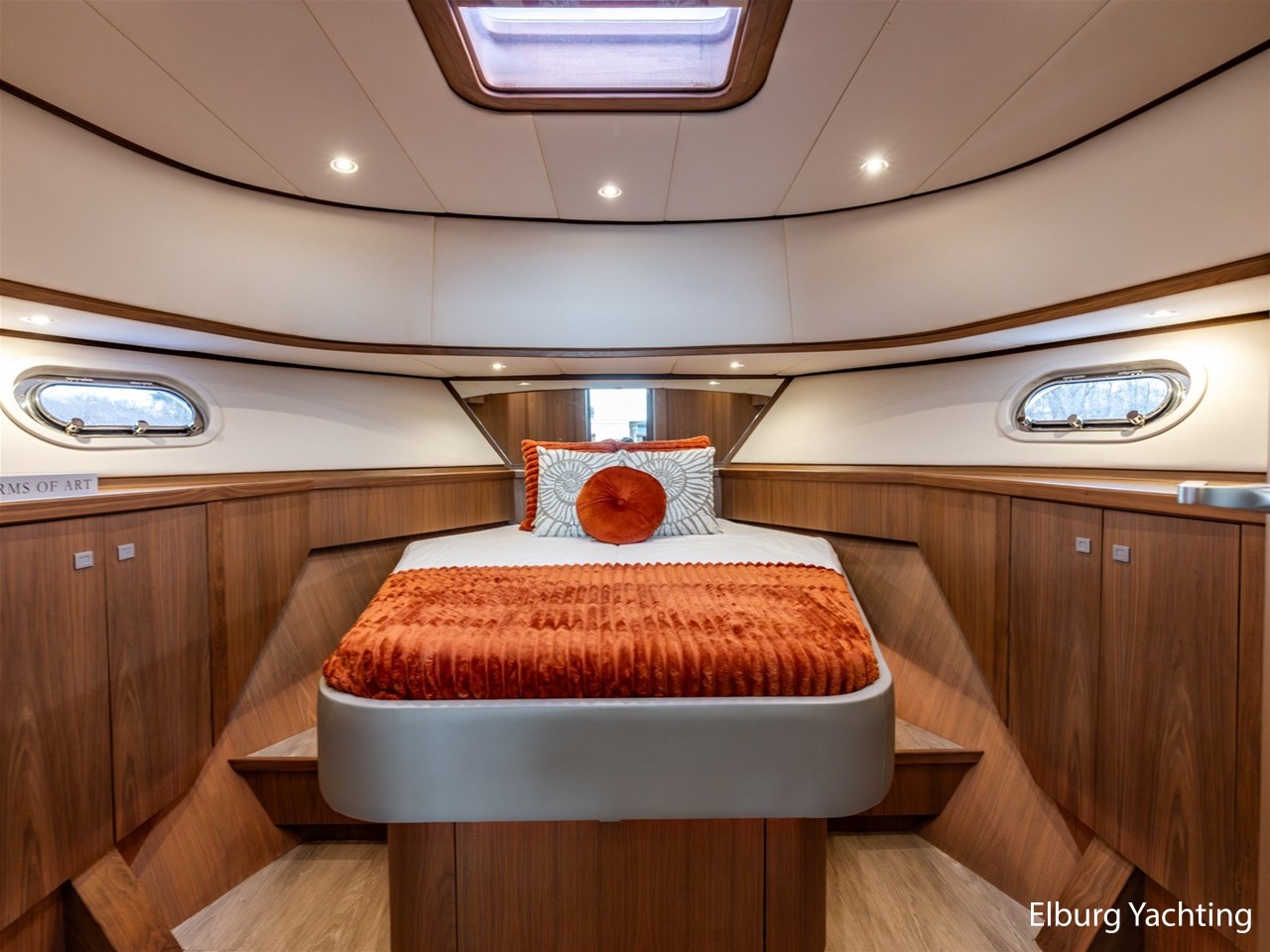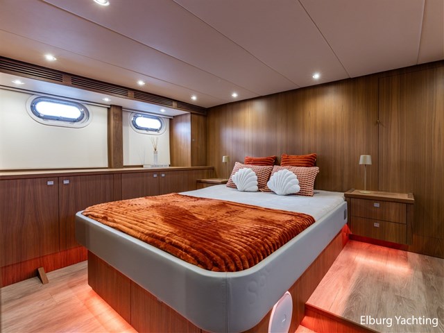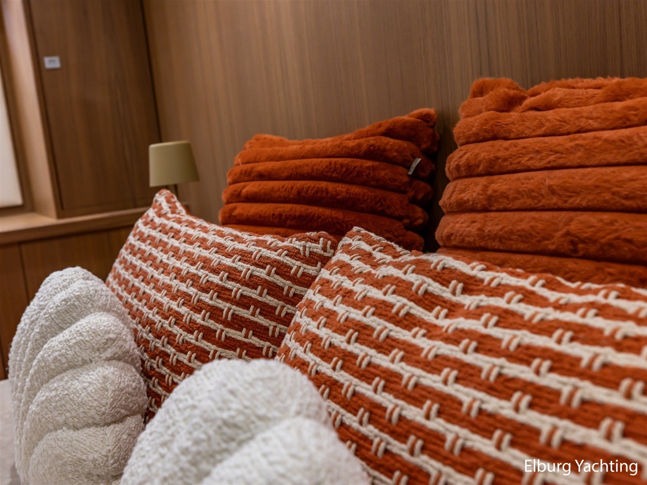 - 4 x fixed (1 x 2 pers. freestanding bed in front cabin + 1 x 2 pers. freestanding bed in owners cabin mid-ship) + dinette against galley can be used as an extra 2-pers. bed