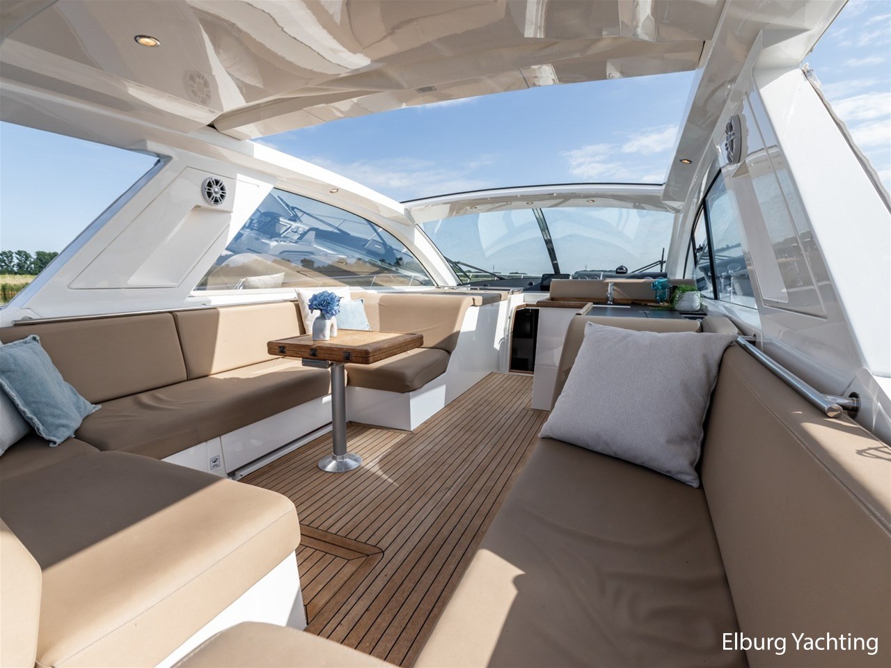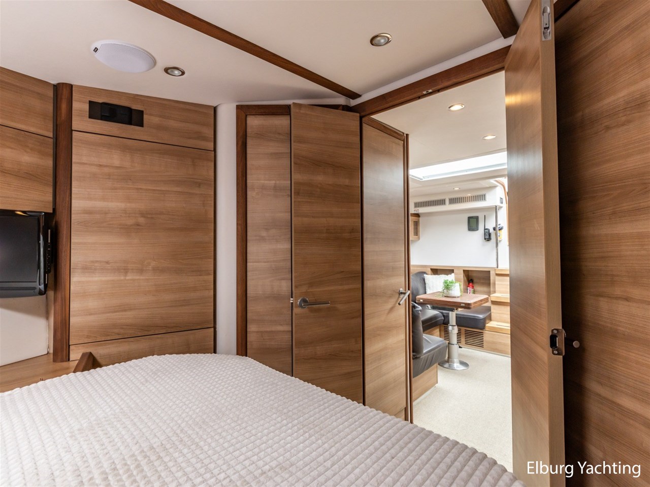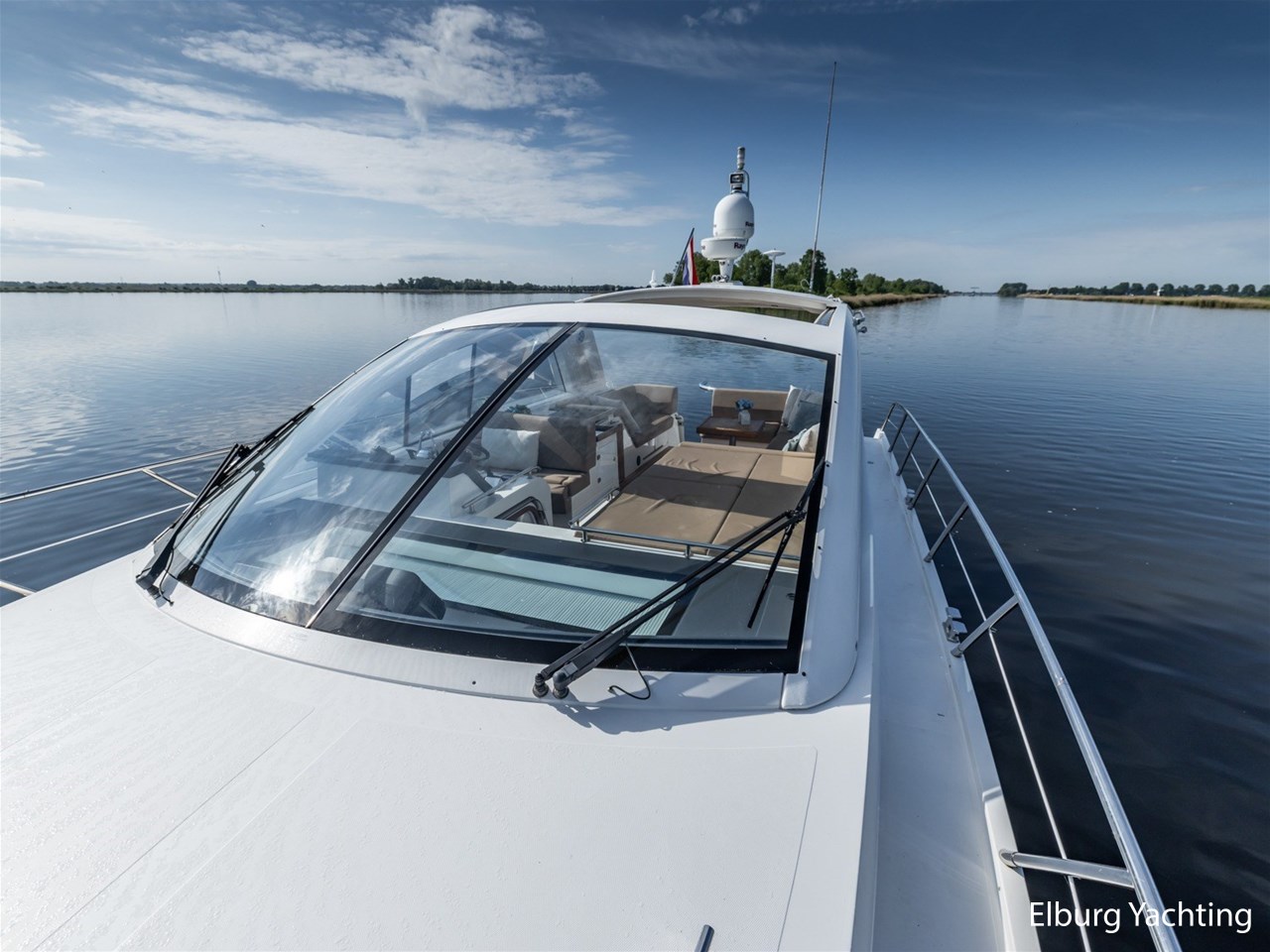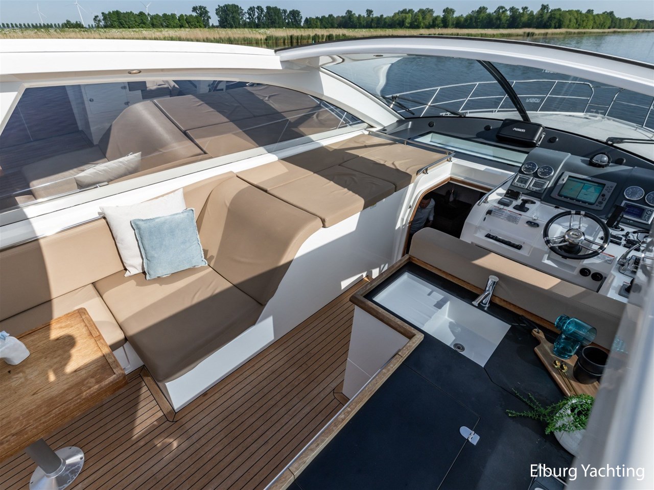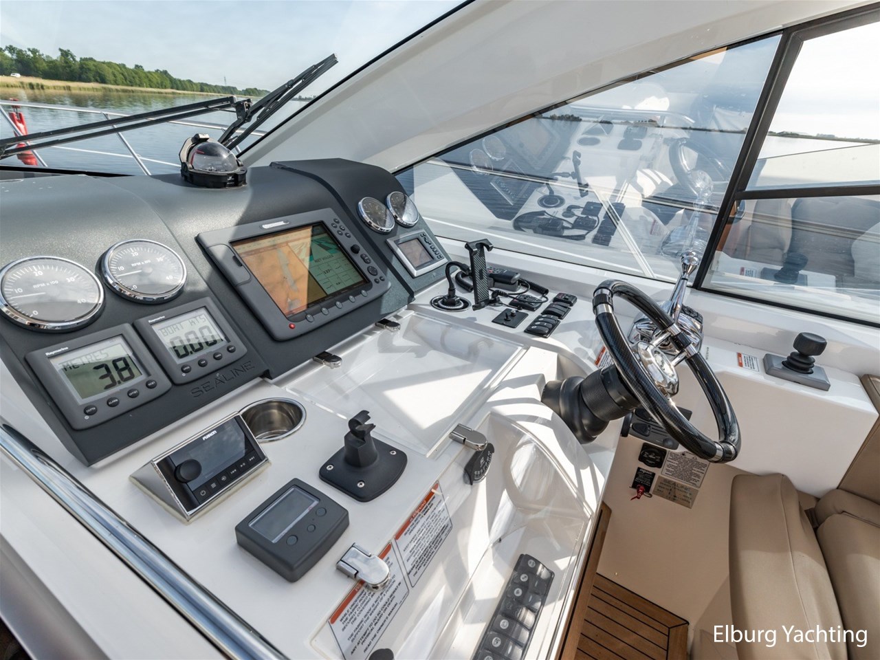 This bright and modern Sealine offers huge deck space, which can be sailed either open (large sliding roof, aft) or closed. Either way, the boat is well and easily walkable, with spacious gangways and easy steps to the bathing platform. The yacht further features a ship-wide owner's cabin with windows in the hull, a good guest cabin with french bed, and finally a spacious combination galley/dinette. Further equipment includes; camera system with 4 cameras (bow camera, port, starboard, stern camera), well-walkable gangway with handle on superstructure, 2 x pocket window in saloon, one of which is next to the steering position, stainless steel sea rail, various storage compartments around bathing platform, low-maintenance yacht, beautiful hinges and locks, handleless cupboard doors, ship-wide owner's cabin with lots of light and space, private seating, an ensuite bathroom which is unprecedented on a 47-footer, beautiful finish, cockpit tent that can be zipped away in parts, wetbar with outdoor grill, refrigerator and cooling compartment, Fusion sound system, electronic throttles with joystick control for mooring, trim tabs, clear dashboard, smartcraft vesselview tank indicators, large sunbed in deck saloon, panoramic windscreen and large windows all around in deck saloon.