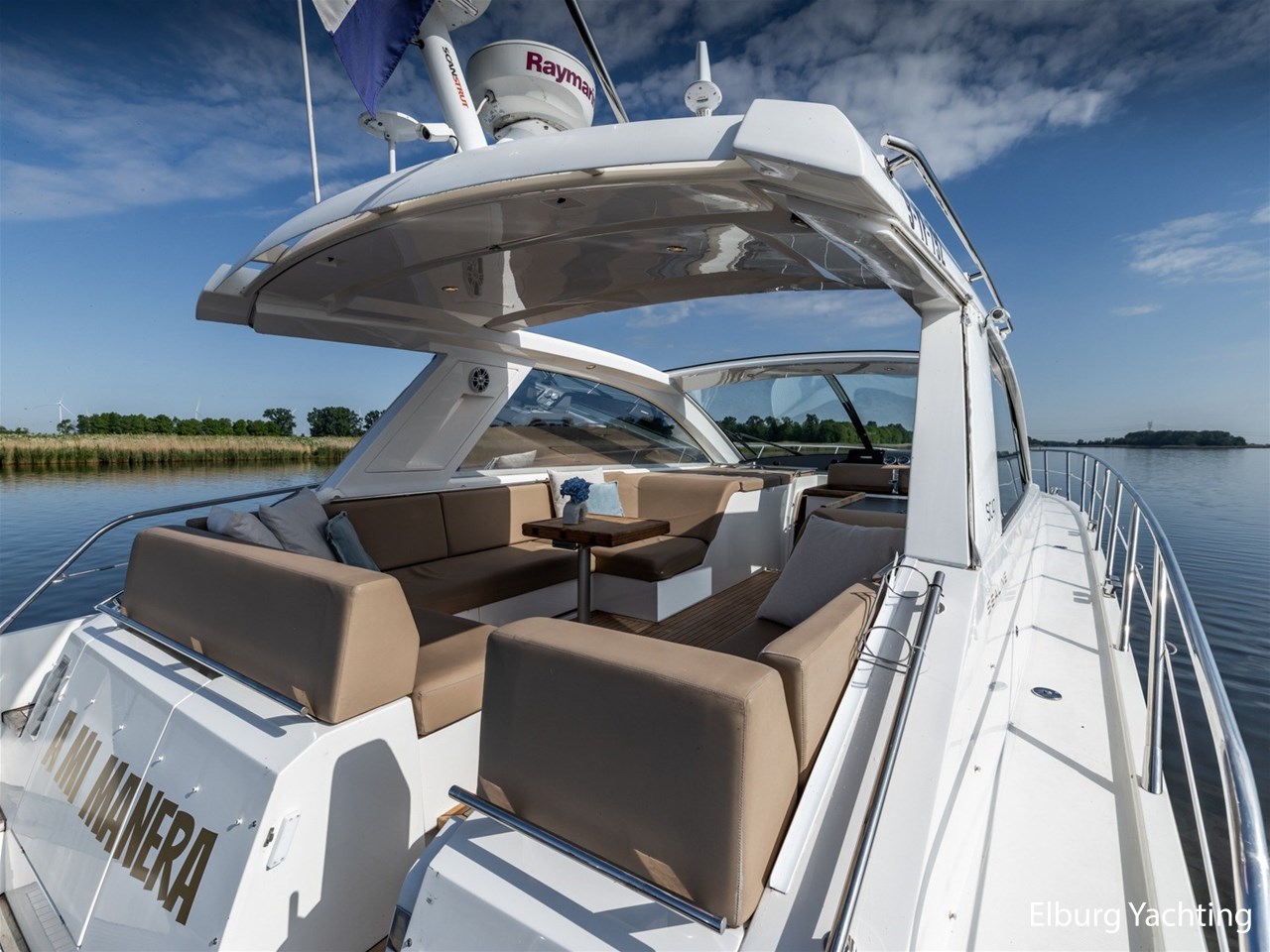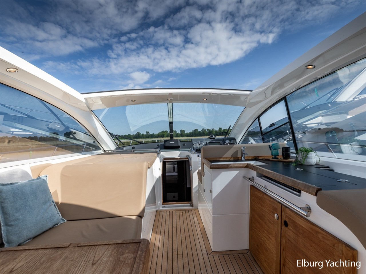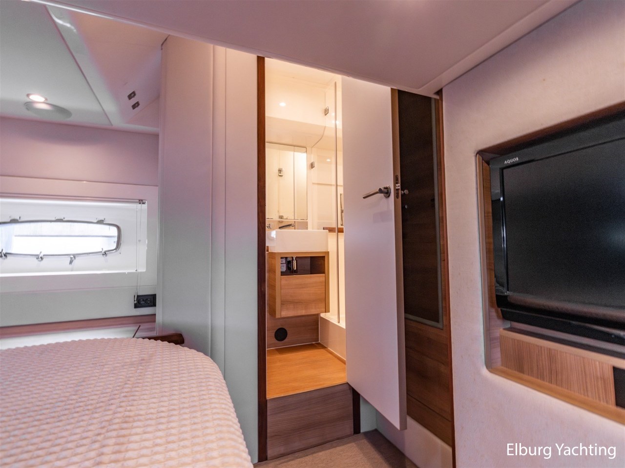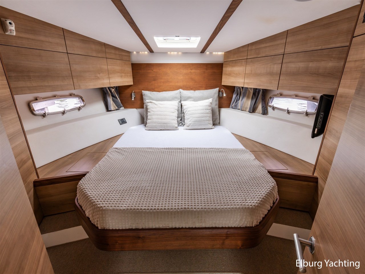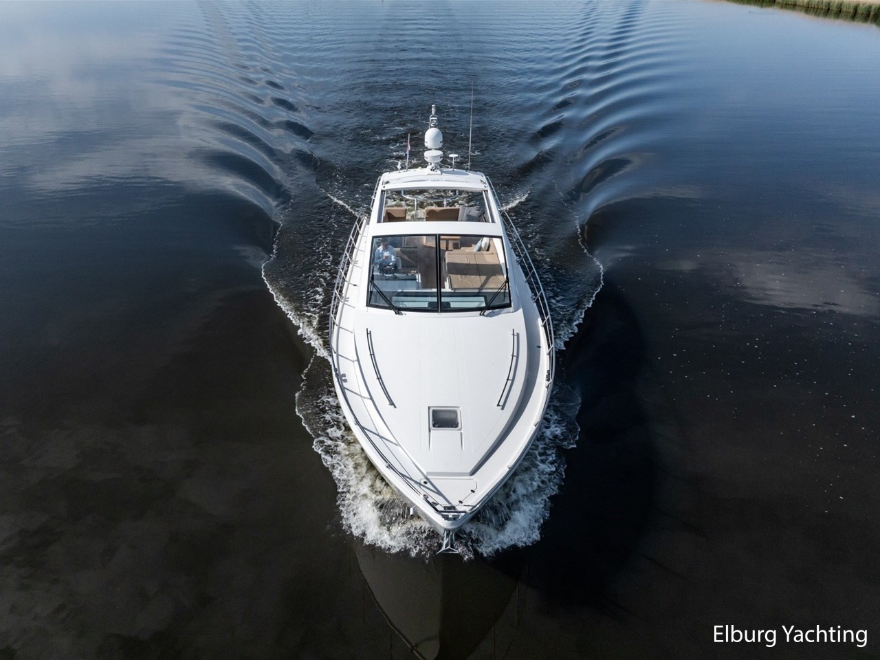 This bright and modern Sealine offers huge deck space, which can be sailed either open (large sliding roof, aft) or closed. Either way, the boat is well and easily walkable, with spacious gangways and easy steps to the bathing platform. The yacht further features a ship-wide owner's cabin with windows in the hull, a good guest cabin with french bed, and finally a spacious combination galley/dinette. Further equipment includes; camera system with 4 cameras (bow camera, port, starboard, stern camera), well-walkable gangway with handle on superstructure, 2 x pocket window in saloon, one of which is next to the steering position, stainless steel sea rail, various storage compartments around bathing platform, low-maintenance yacht, beautiful hinges and locks, handleless cupboard doors, ship-wide owner's cabin with lots of light and space, private seating, an ensuite bathroom which is unprecedented on a 47-footer, beautiful finish, cockpit tent that can be zipped away in parts, wetbar with outdoor grill, refrigerator and cooling compartment, Fusion sound system, electronic throttles with joystick control for mooring, trim tabs, clear dashboard, smartcraft vesselview tank indicators, large sunbed in deck saloon, panoramic windscreen and large windows all around in deck saloon.