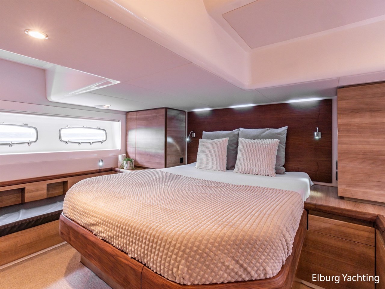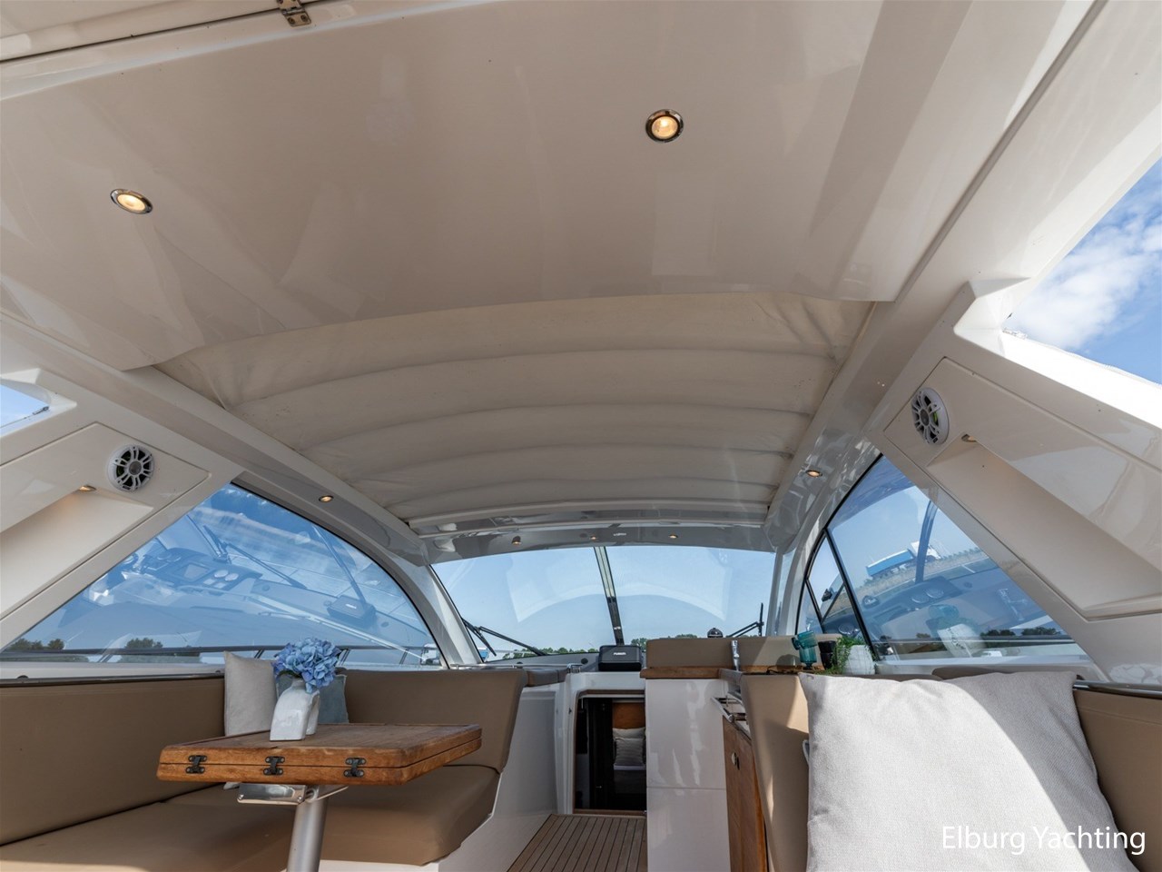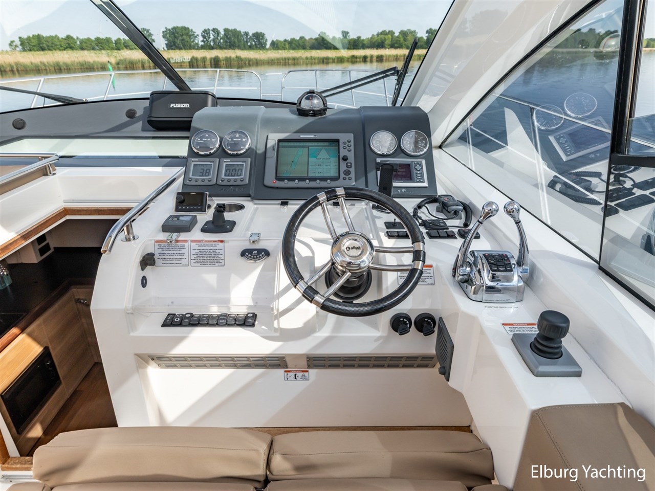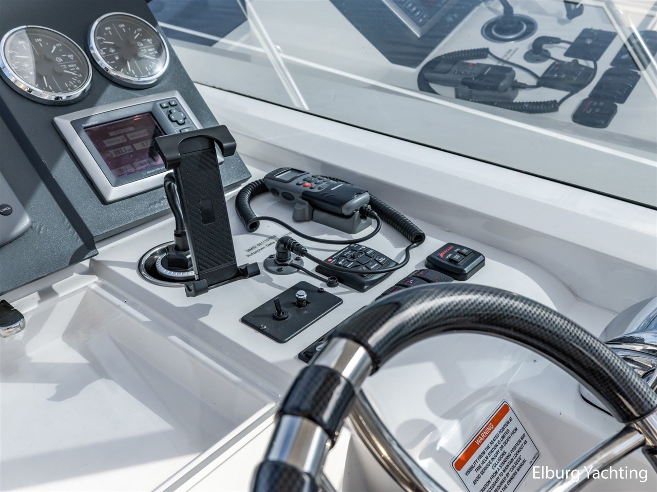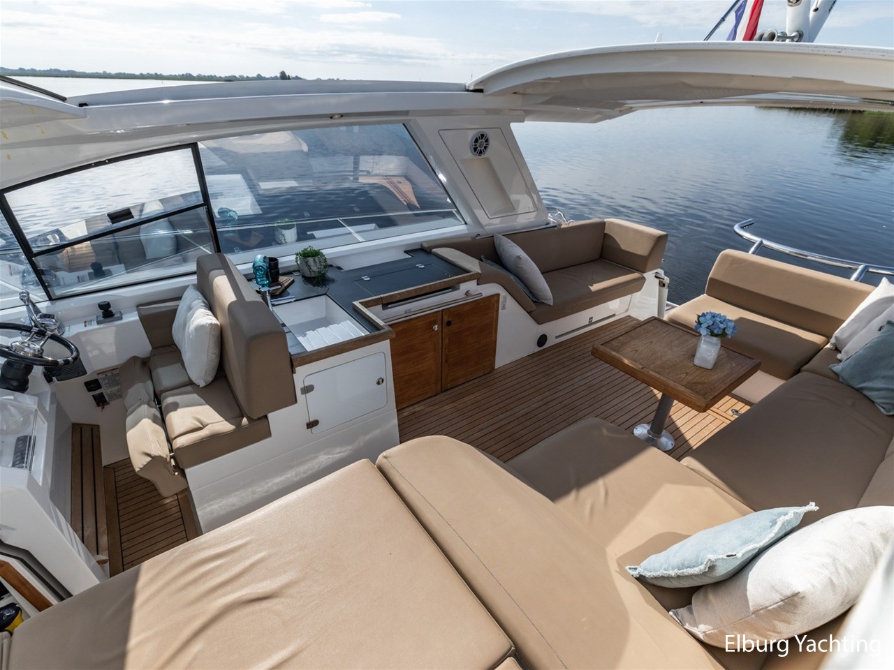 This bright and modern Sealine offers huge deck space, which can be sailed either open (large sliding roof, aft) or closed. Either way, the boat is well and easily walkable, with spacious gangways and easy steps to the bathing platform. The yacht further features a ship-wide owner's cabin with windows in the hull, a good guest cabin with french bed, and finally a spacious combination galley/dinette. Further equipment includes; camera system with 4 cameras (bow camera, port, starboard, stern camera), well-walkable gangway with handle on superstructure, 2 x pocket window in saloon, one of which is next to the steering position, stainless steel sea rail, various storage compartments around bathing platform, low-maintenance yacht, beautiful hinges and locks, handleless cupboard doors, ship-wide owner's cabin with lots of light and space, private seating, an ensuite bathroom which is unprecedented on a 47-footer, beautiful finish, cockpit tent that can be zipped away in parts, wetbar with outdoor grill, refrigerator and cooling compartment, Fusion sound system, electronic throttles with joystick control for mooring, trim tabs, clear dashboard, smartcraft vesselview tank indicators, large sunbed in deck saloon, panoramic windscreen and large windows all around in deck saloon.