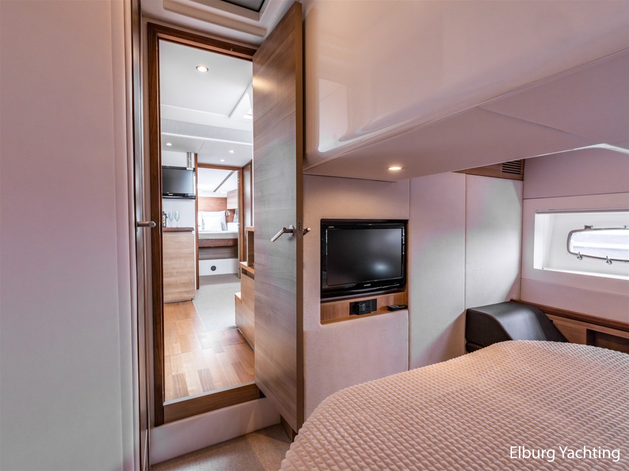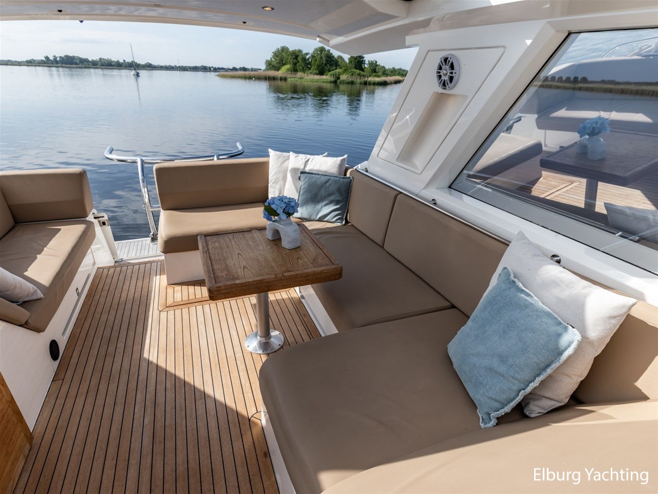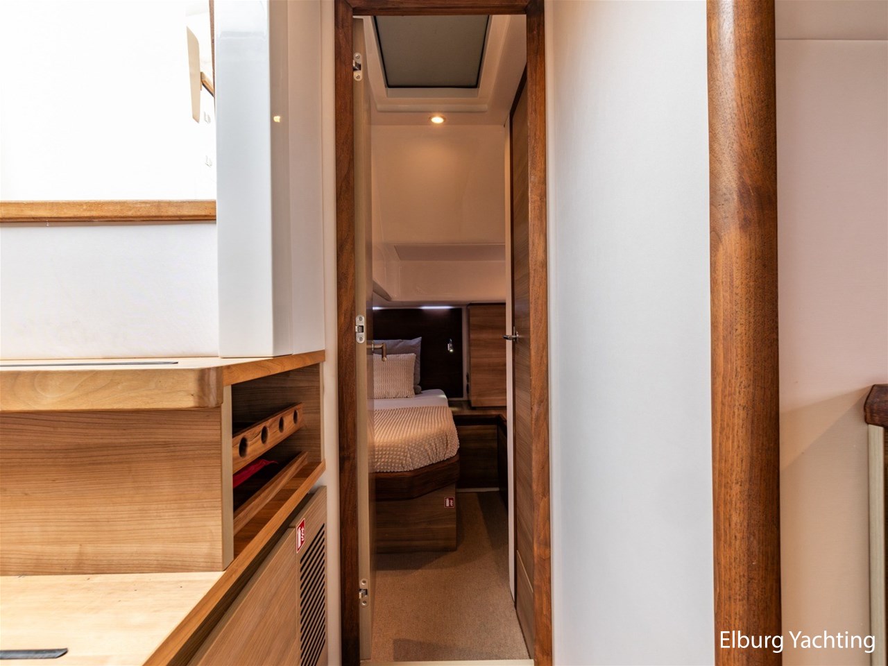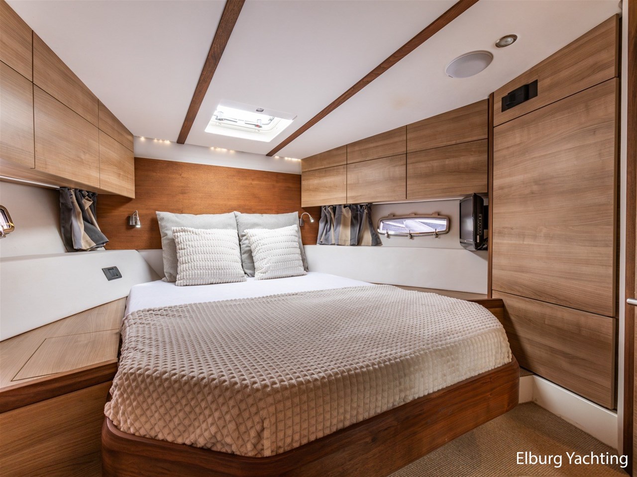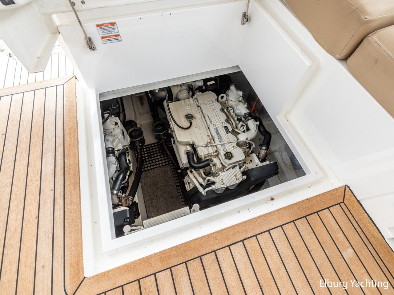 This bright and modern Sealine offers huge deck space, which can be sailed either open (large sliding roof, aft) or closed. Either way, the boat is well and easily walkable, with spacious gangways and easy steps to the bathing platform. The yacht further features a ship-wide owner's cabin with windows in the hull, a good guest cabin with french bed, and finally a spacious combination galley/dinette. Further equipment includes; camera system with 4 cameras (bow camera, port, starboard, stern camera), well-walkable gangway with handle on superstructure, 2 x pocket window in saloon, one of which is next to the steering position, stainless steel sea rail, various storage compartments around bathing platform, low-maintenance yacht, beautiful hinges and locks, handleless cupboard doors, ship-wide owner's cabin with lots of light and space, private seating, an ensuite bathroom which is unprecedented on a 47-footer, beautiful finish, cockpit tent that can be zipped away in parts, wetbar with outdoor grill, refrigerator and cooling compartment, Fusion sound system, electronic throttles with joystick control for mooring, trim tabs, clear dashboard, smartcraft vesselview tank indicators, large sunbed in deck saloon, panoramic windscreen and large windows all around in deck saloon.