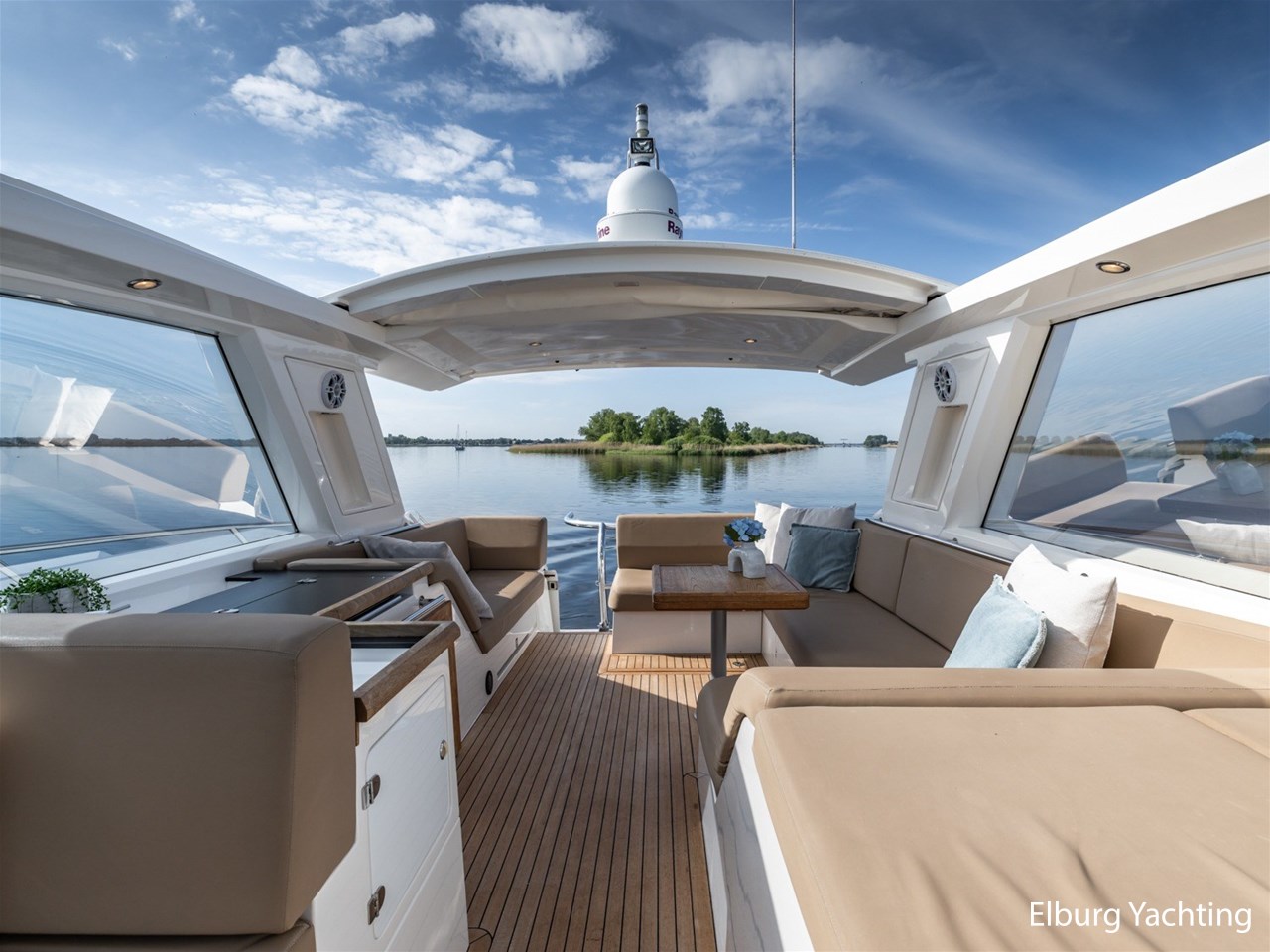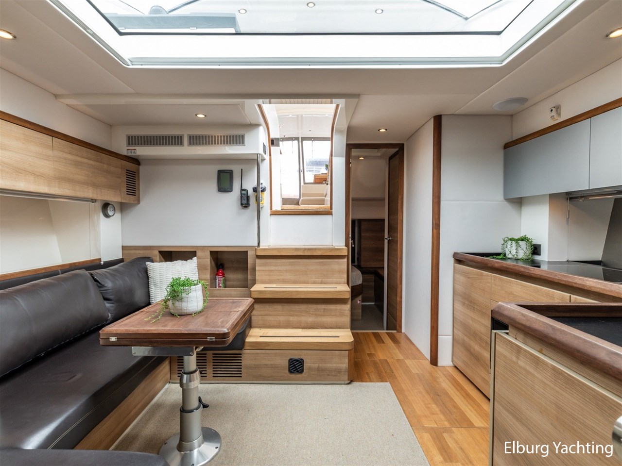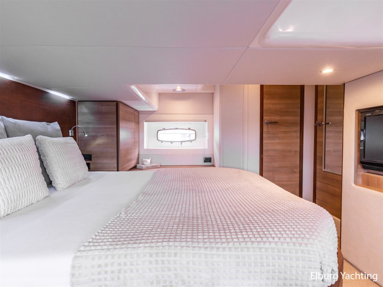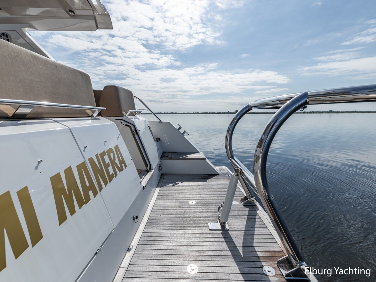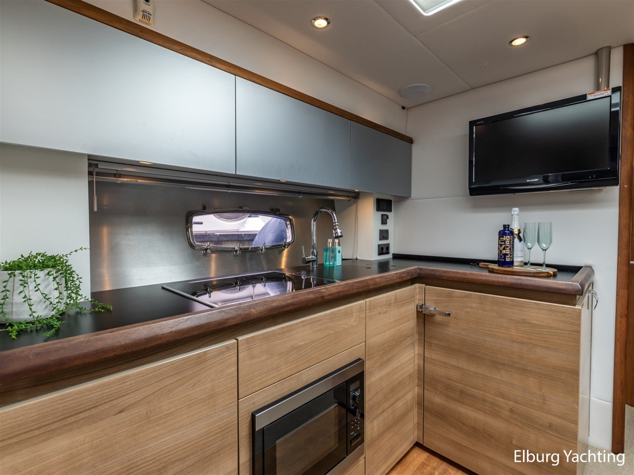 This bright and modern Sealine offers huge deck space, which can be sailed either open (large sliding roof, aft) or closed. Either way, the boat is well and easily walkable, with spacious gangways and easy steps to the bathing platform. The yacht further features a ship-wide owner's cabin with windows in the hull, a good guest cabin with french bed, and finally a spacious combination galley/dinette. Further equipment includes; camera system with 4 cameras (bow camera, port, starboard, stern camera), well-walkable gangway with handle on superstructure, 2 x pocket window in saloon, one of which is next to the steering position, stainless steel sea rail, various storage compartments around bathing platform, low-maintenance yacht, beautiful hinges and locks, handleless cupboard doors, ship-wide owner's cabin with lots of light and space, private seating, an ensuite bathroom which is unprecedented on a 47-footer, beautiful finish, cockpit tent that can be zipped away in parts, wetbar with outdoor grill, refrigerator and cooling compartment, Fusion sound system, electronic throttles with joystick control for mooring, trim tabs, clear dashboard, smartcraft vesselview tank indicators, large sunbed in deck saloon, panoramic windscreen and large windows all around in deck saloon.