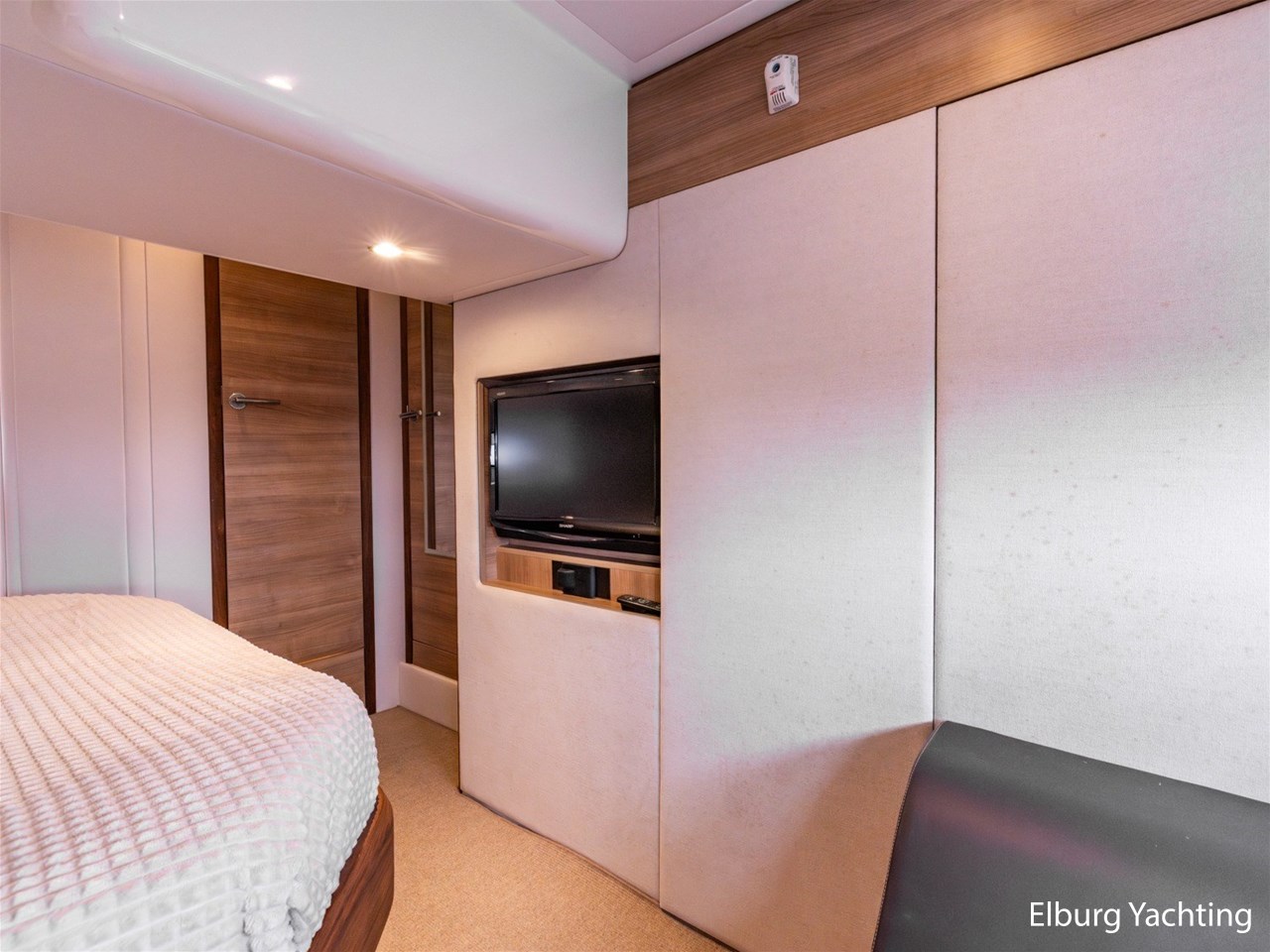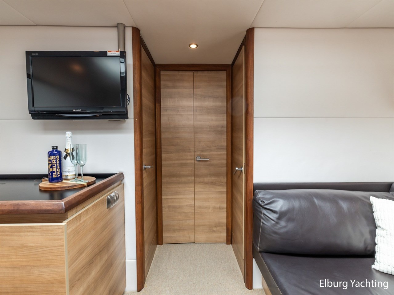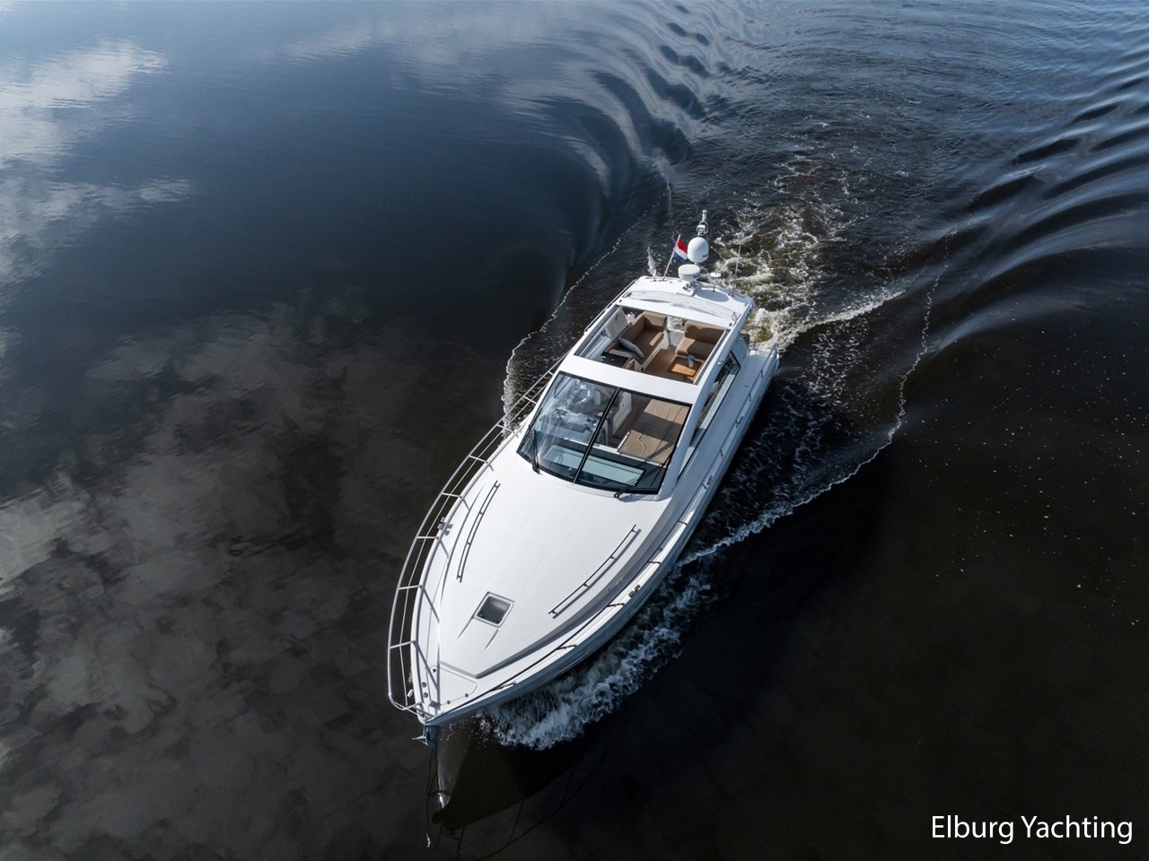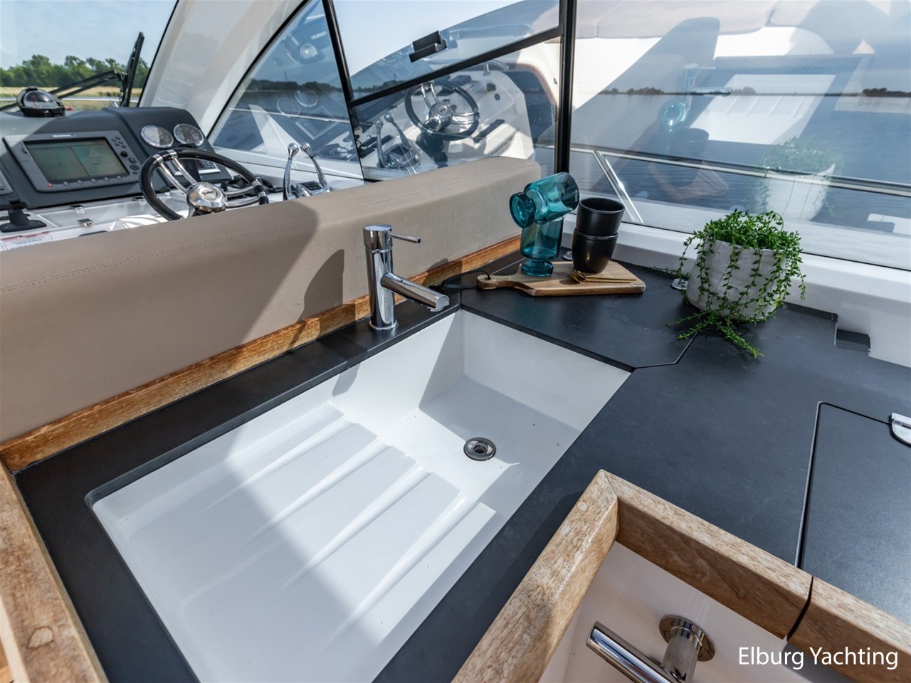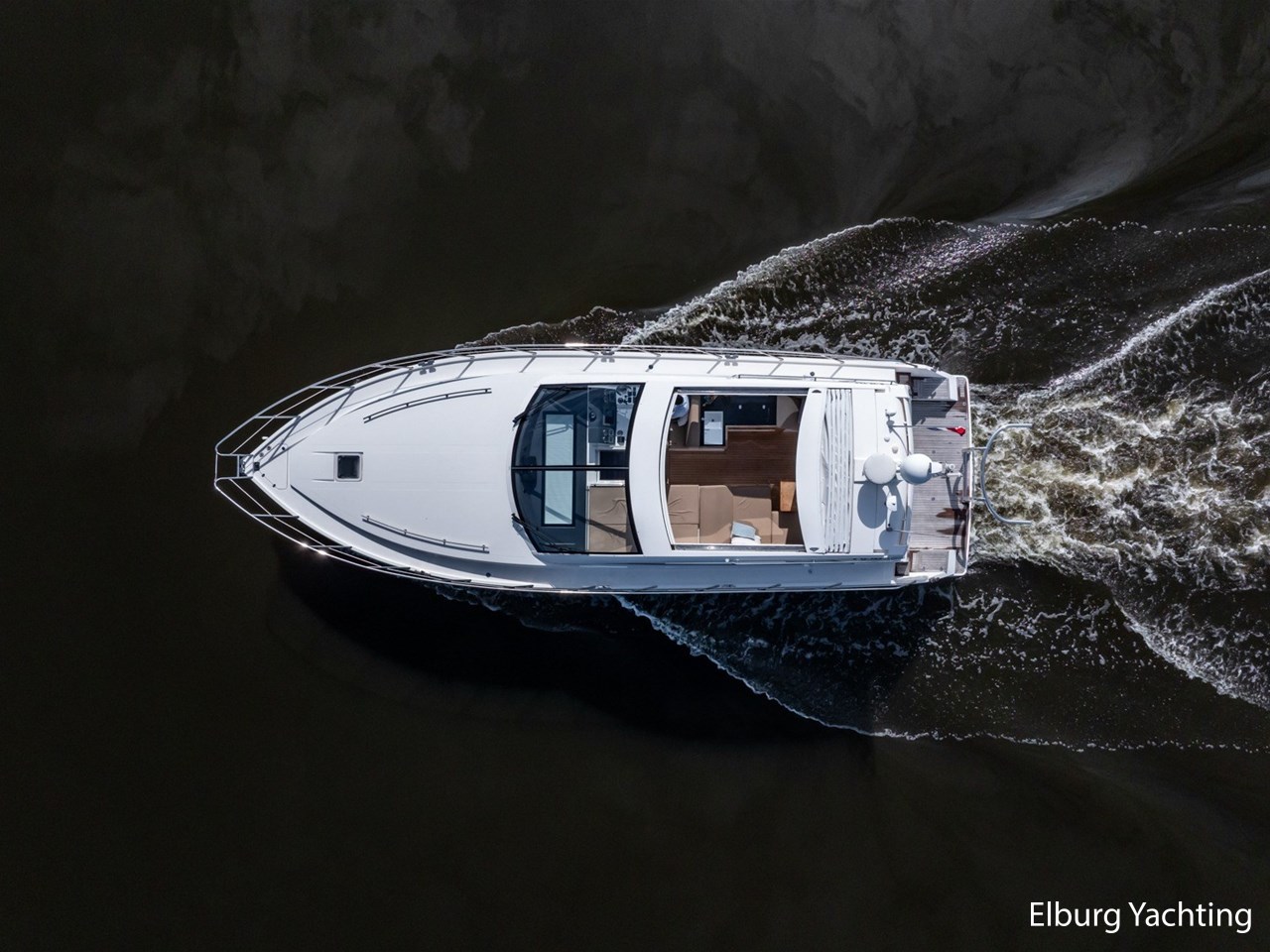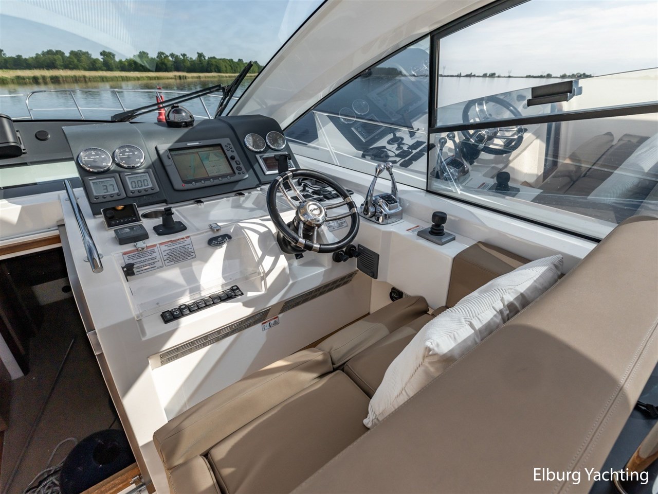 This bright and modern Sealine offers huge deck space, which can be sailed either open (large sliding roof, aft) or closed. Either way, the boat is well and easily walkable, with spacious gangways and easy steps to the bathing platform. The yacht further features a ship-wide owner's cabin with windows in the hull, a good guest cabin with french bed, and finally a spacious combination galley/dinette. Further equipment includes; camera system with 4 cameras (bow camera, port, starboard, stern camera), well-walkable gangway with handle on superstructure, 2 x pocket window in saloon, one of which is next to the steering position, stainless steel sea rail, various storage compartments around bathing platform, low-maintenance yacht, beautiful hinges and locks, handleless cupboard doors, ship-wide owner's cabin with lots of light and space, private seating, an ensuite bathroom which is unprecedented on a 47-footer, beautiful finish, cockpit tent that can be zipped away in parts, wetbar with outdoor grill, refrigerator and cooling compartment, Fusion sound system, electronic throttles with joystick control for mooring, trim tabs, clear dashboard, smartcraft vesselview tank indicators, large sunbed in deck saloon, panoramic windscreen and large windows all around in deck saloon.