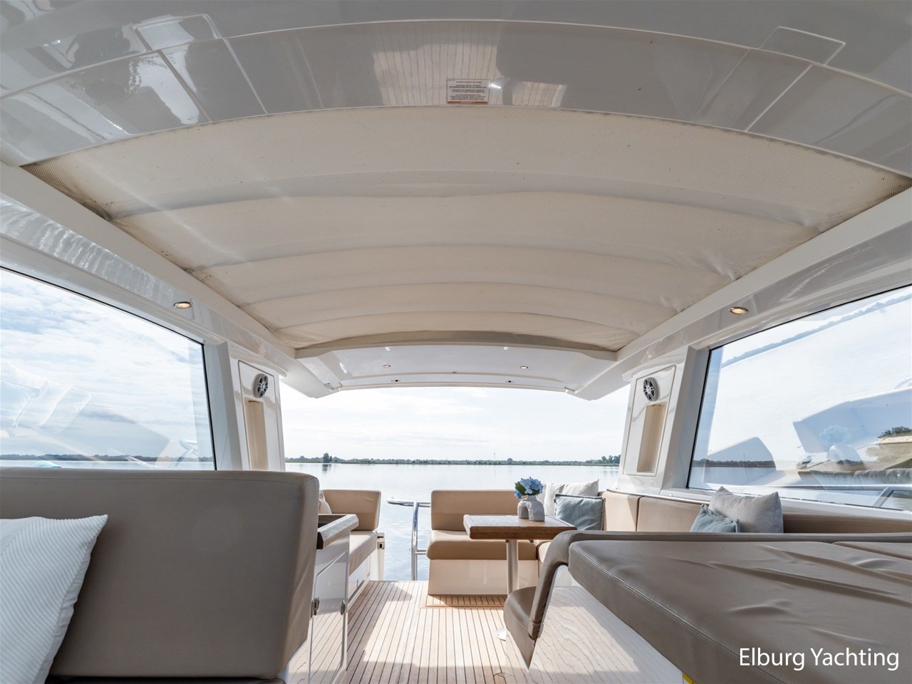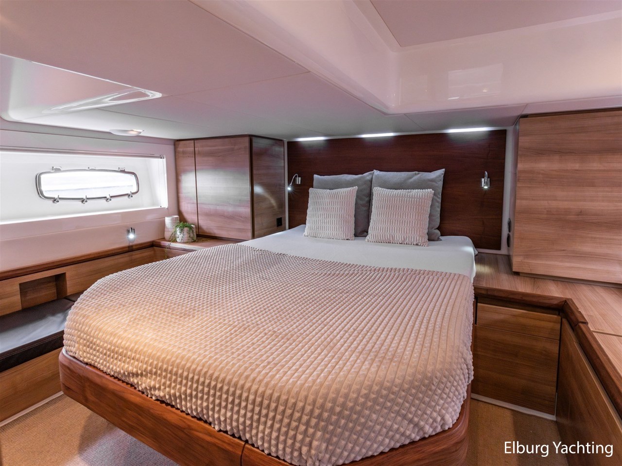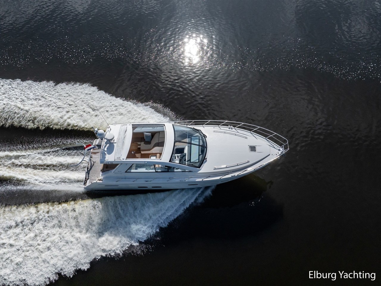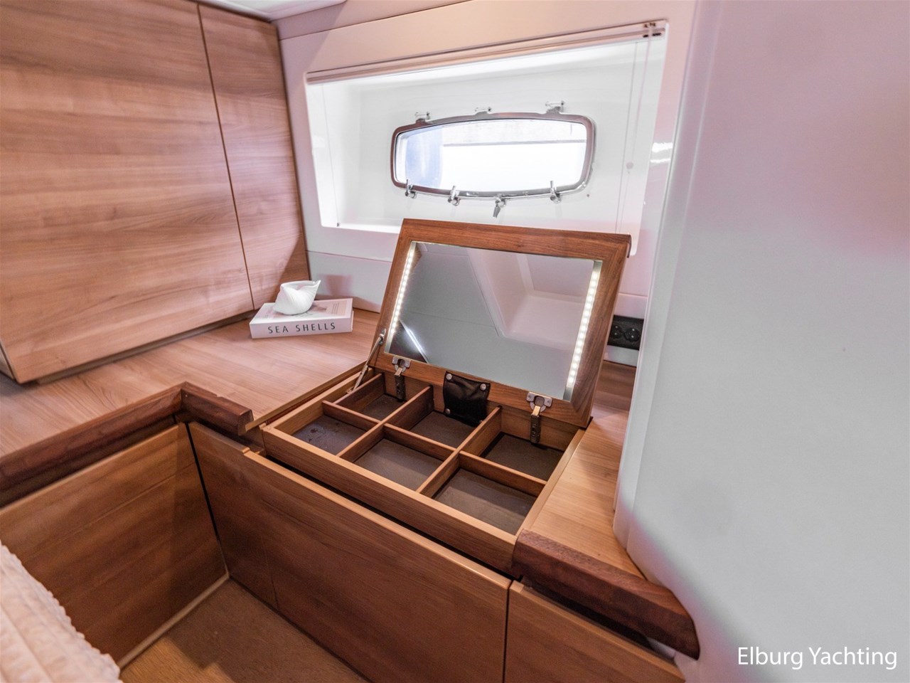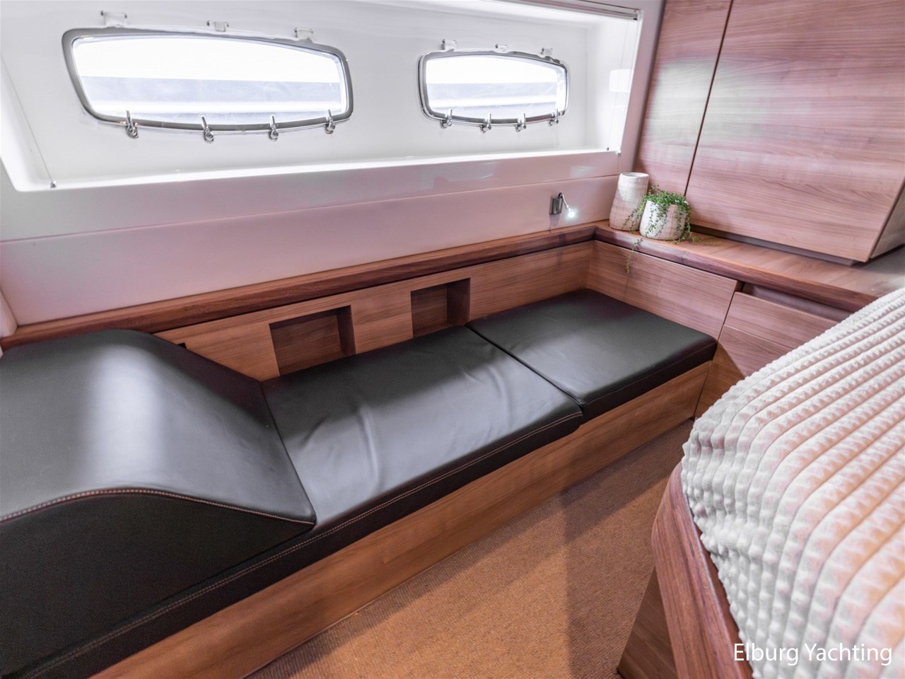 This bright and modern Sealine offers huge deck space, which can be sailed either open (large sliding roof, aft) or closed. Either way, the boat is well and easily walkable, with spacious gangways and easy steps to the bathing platform. The yacht further features a ship-wide owner's cabin with windows in the hull, a good guest cabin with french bed, and finally a spacious combination galley/dinette. Further equipment includes; camera system with 4 cameras (bow camera, port, starboard, stern camera), well-walkable gangway with handle on superstructure, 2 x pocket window in saloon, one of which is next to the steering position, stainless steel sea rail, various storage compartments around bathing platform, low-maintenance yacht, beautiful hinges and locks, handleless cupboard doors, ship-wide owner's cabin with lots of light and space, private seating, an ensuite bathroom which is unprecedented on a 47-footer, beautiful finish, cockpit tent that can be zipped away in parts, wetbar with outdoor grill, refrigerator and cooling compartment, Fusion sound system, electronic throttles with joystick control for mooring, trim tabs, clear dashboard, smartcraft vesselview tank indicators, large sunbed in deck saloon, panoramic windscreen and large windows all around in deck saloon.