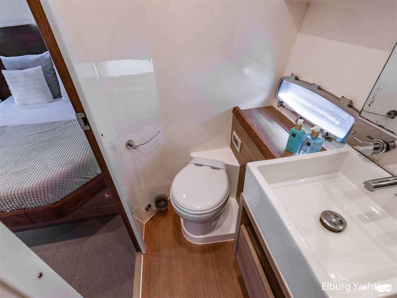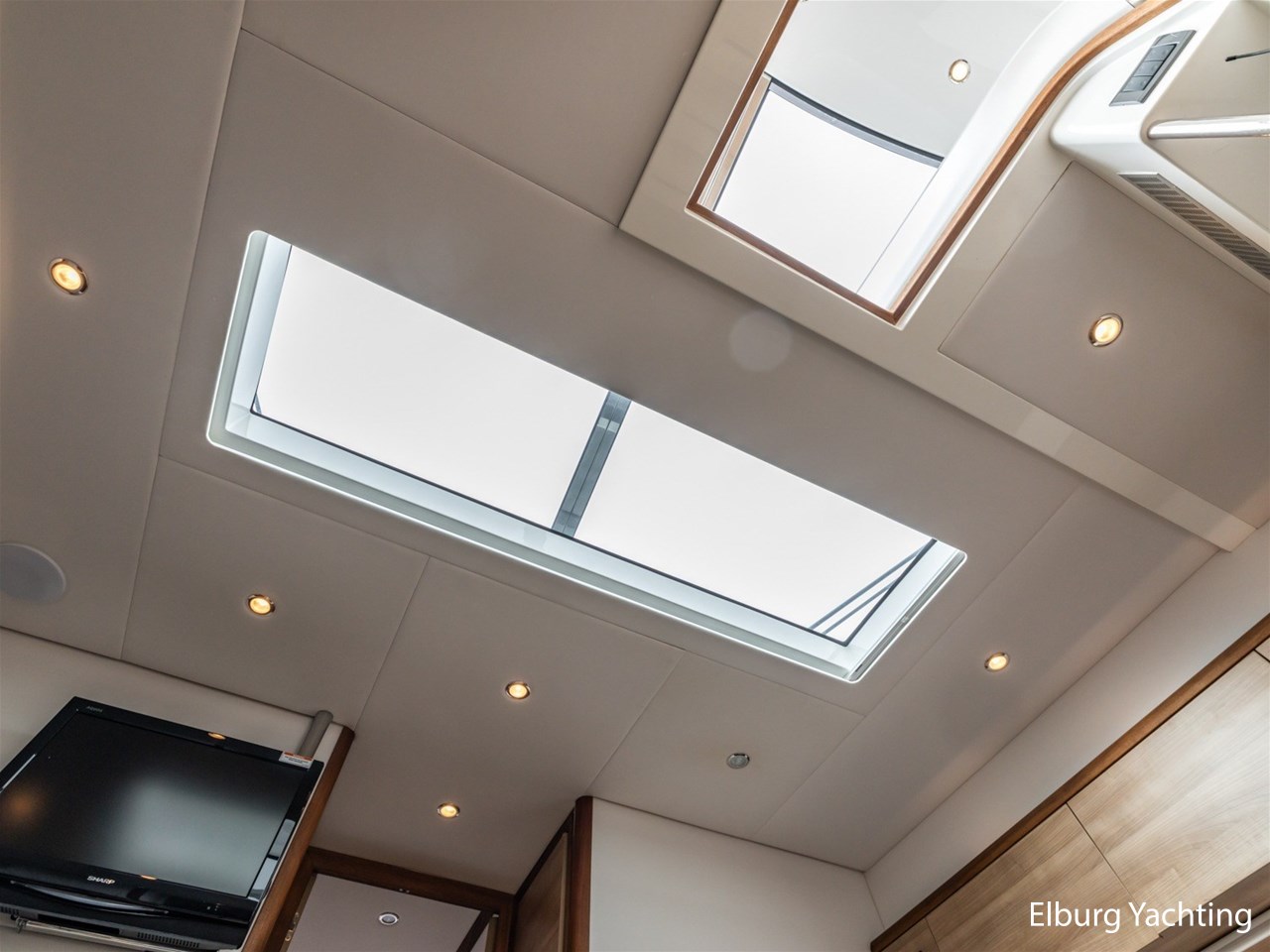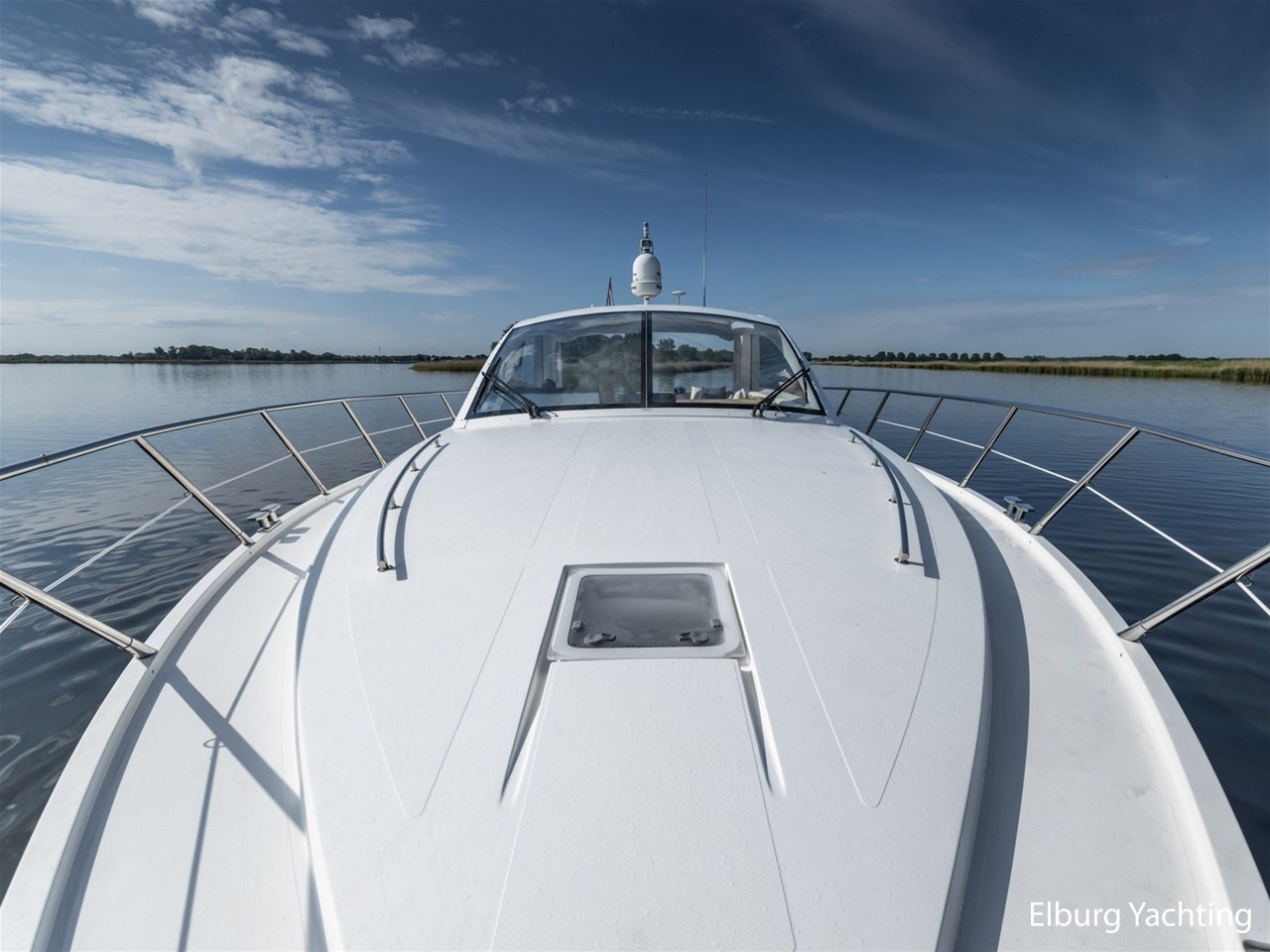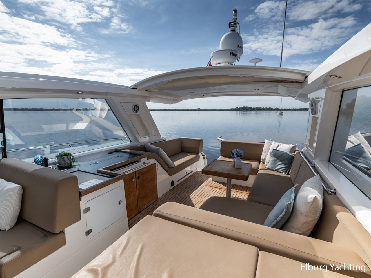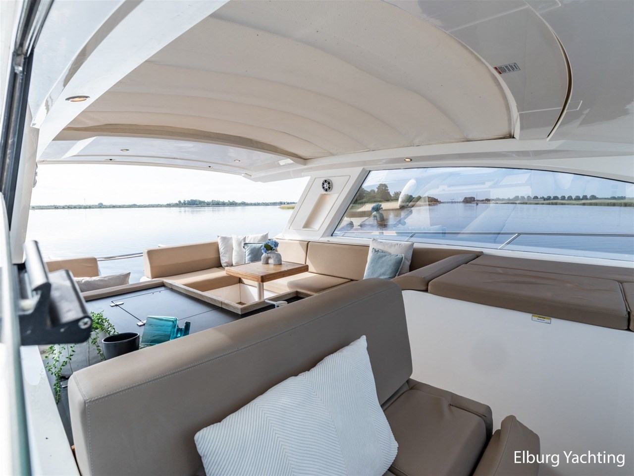 This bright and modern Sealine offers huge deck space, which can be sailed either open (large sliding roof, aft) or closed. Either way, the boat is well and easily walkable, with spacious gangways and easy steps to the bathing platform. The yacht further features a ship-wide owner's cabin with windows in the hull, a good guest cabin with french bed, and finally a spacious combination galley/dinette. Further equipment includes; camera system with 4 cameras (bow camera, port, starboard, stern camera), well-walkable gangway with handle on superstructure, 2 x pocket window in saloon, one of which is next to the steering position, stainless steel sea rail, various storage compartments around bathing platform, low-maintenance yacht, beautiful hinges and locks, handleless cupboard doors, ship-wide owner's cabin with lots of light and space, private seating, an ensuite bathroom which is unprecedented on a 47-footer, beautiful finish, cockpit tent that can be zipped away in parts, wetbar with outdoor grill, refrigerator and cooling compartment, Fusion sound system, electronic throttles with joystick control for mooring, trim tabs, clear dashboard, smartcraft vesselview tank indicators, large sunbed in deck saloon, panoramic windscreen and large windows all around in deck saloon.