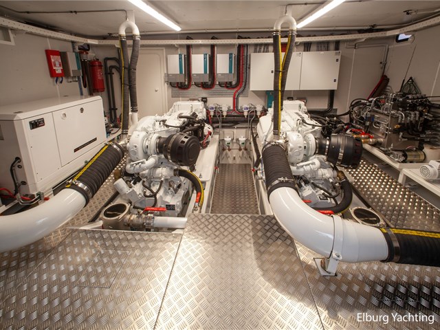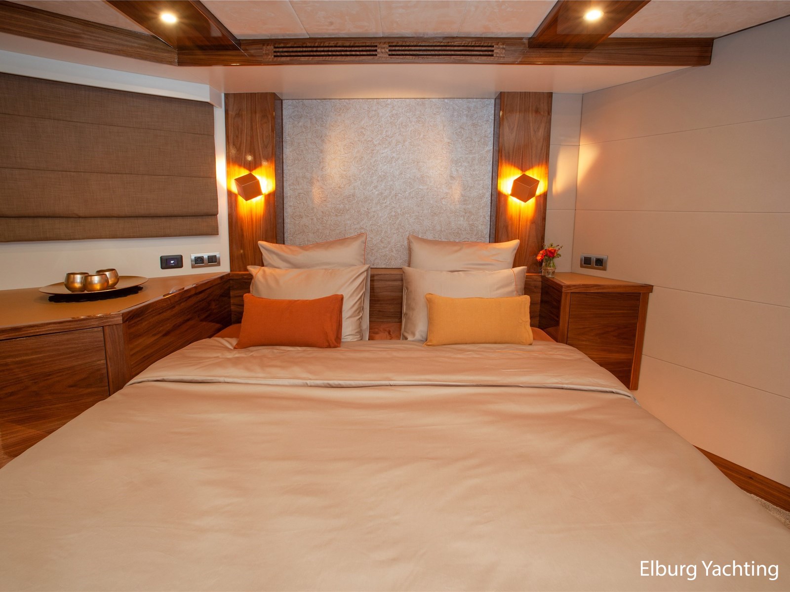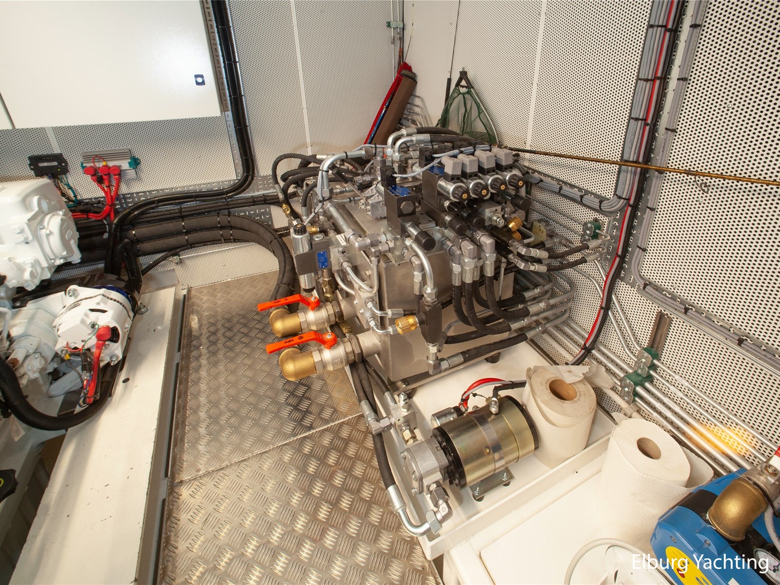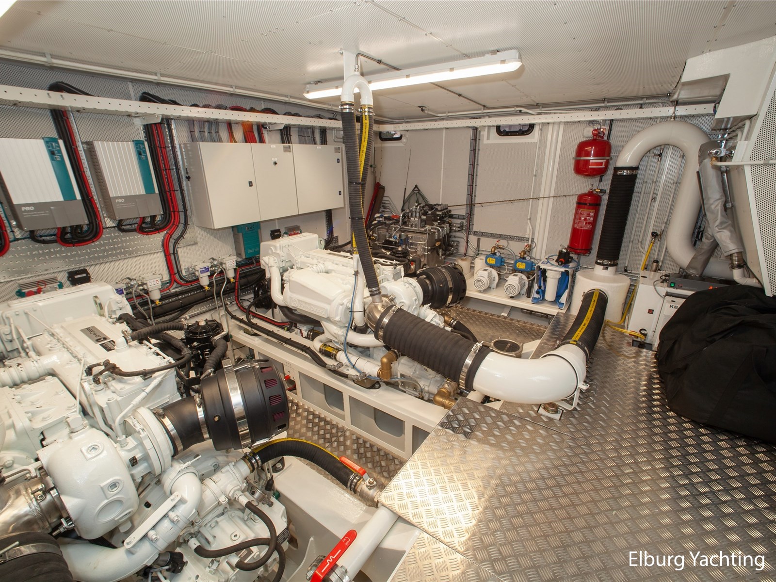 The deck-level saloon offers spectacular 360-degree views, enhancing the sense of space and light through the large windows. Wide sidedecks all around make it safe and easy to move around on a single level. The foredeck offers ample space for lounging, complete with a comfortable sofa for enjoying the view. The aft deck is also generously sized, with a semi-circular sofa for five people and a covered area providing shade on sunny days. Stylish stairs on both sides of the yacht lead to the spacious bathing platform, which also provides access to the professionally equipped engine room with good headroom. You'll enjoy a daily inspection here and see at one glance that all the technology is in working order. This vessel holds a valid CVO certificate.