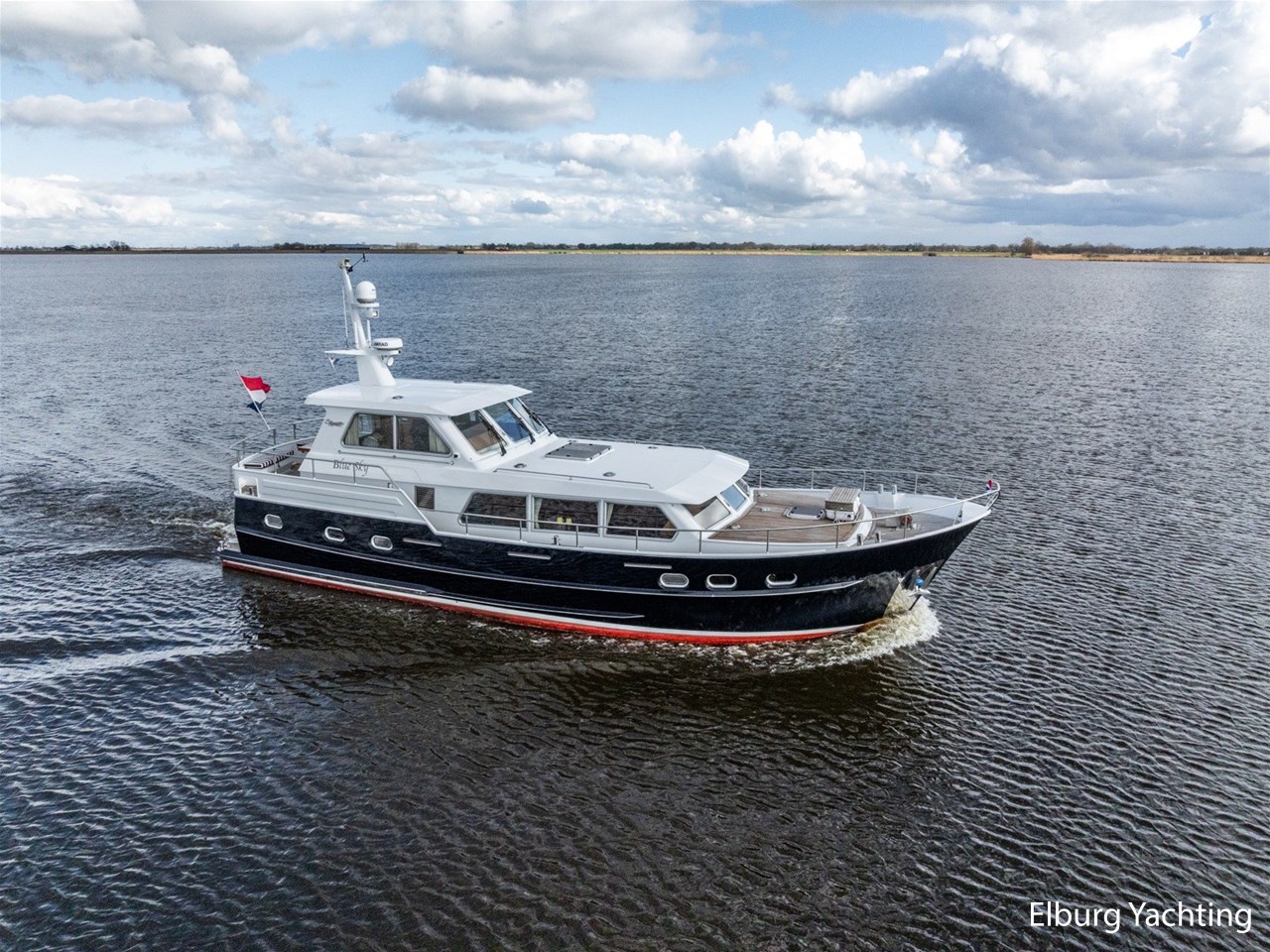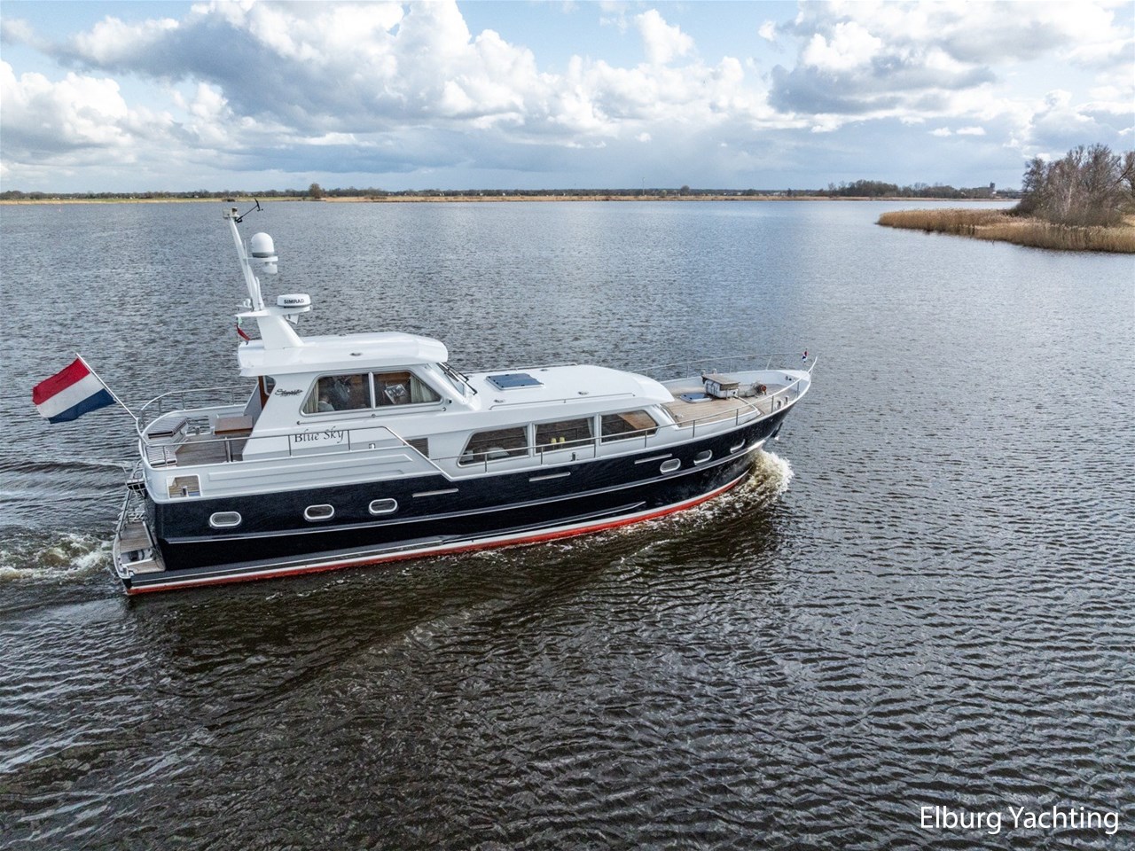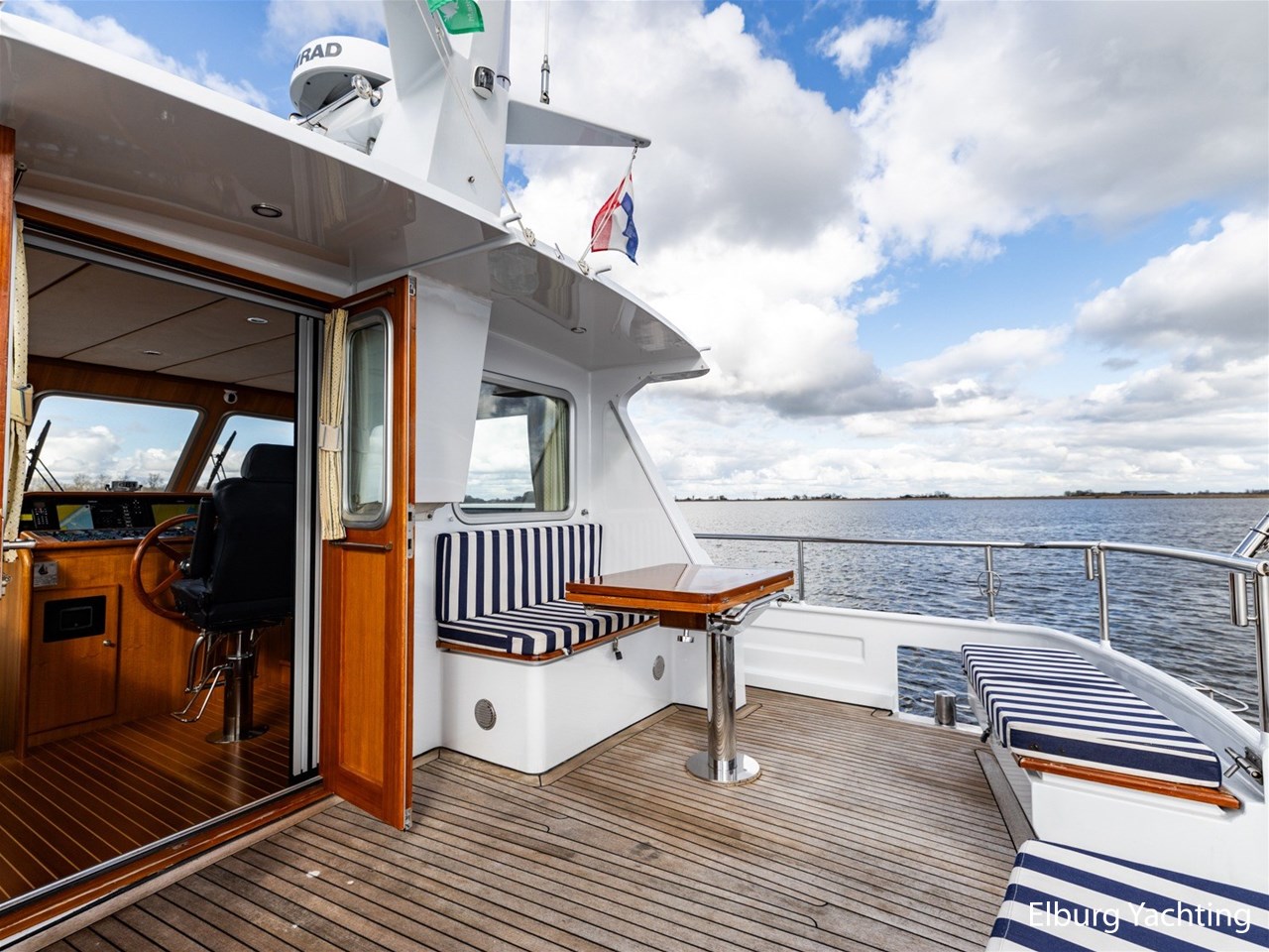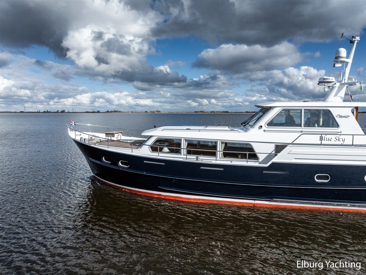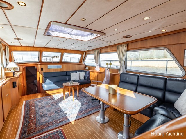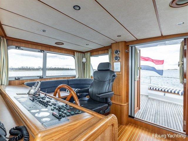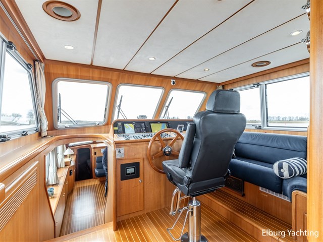 Sturier 520 AC (aft cabin) with raised wheelhouse provides maximum all-round visibility and good contact with people on deck. The saloon is very spacious with lots of natural light and not only has a ship's character but also immediately creates a living room atmosphere. The galley is accessible from the saloon and is fully equipped with modern equipment. The fore and aft cabin each have a double freestanding bed with a en-suite bathroom. The ship has more than proven itself on beautiful seagoing trips in and around Northern Europe. Refit work carried out: Hull in Majestic Blue and superstructure in Matterhorn White repainted in 2022, 6 x Mastervolt Gel batteries 220Ah / Mastervolt Easy 5 display / Mastervolt Mass Combi 24V 3500W 100Amp inverter renewed in 2022, complete dashboard renewed and modernized with Simrad equipment in 2021 and various smaller renewings on board. The Sturier 520 AC 'Blue Sky' is equipped with: double varnished teak door to the wheelhouse, Bosch dishwasher, Eumenia washer/dryer in bathroom front cabin, stainless steel towel heaters in both bathrooms, electric Morsche engine control with engine synchronization function, 5-blade propellers, Hydronautica remote control with which mooring and unmooring becomes child's play by operating the bow and stern thrusters and also the main engine stationary forwards and backwards, KVH TracVision TV3 dome, TV in saloon on lift, WiFi router on board (SIM card not included), 2 x sliding windows in wheelhouse, deck wash connection on SB + BB, fly screens for hatches and portholes and fly screen door in wheelhouse, hydraulically foldable mast, clearance height with mast up approx. 6.60m and with folded mast approx. 4.10m. The maximum speed is approximately 9 knots, the cruising speed is approximately 7.5 knots with a total consumption of approximately 15 litres p/hour. For questions and/or to make an appointment, you are welcome at Elburg Yachting 7 days a week.