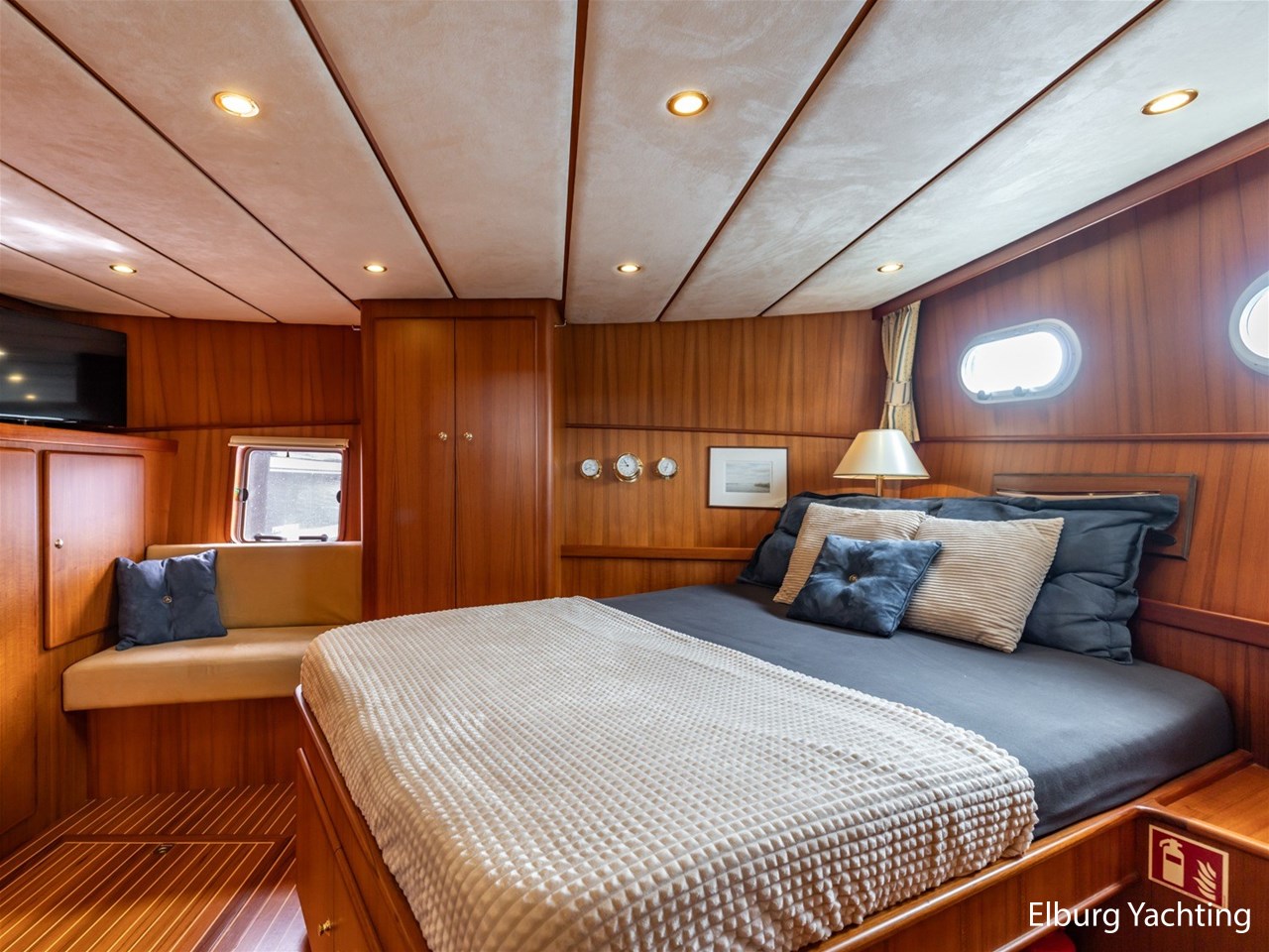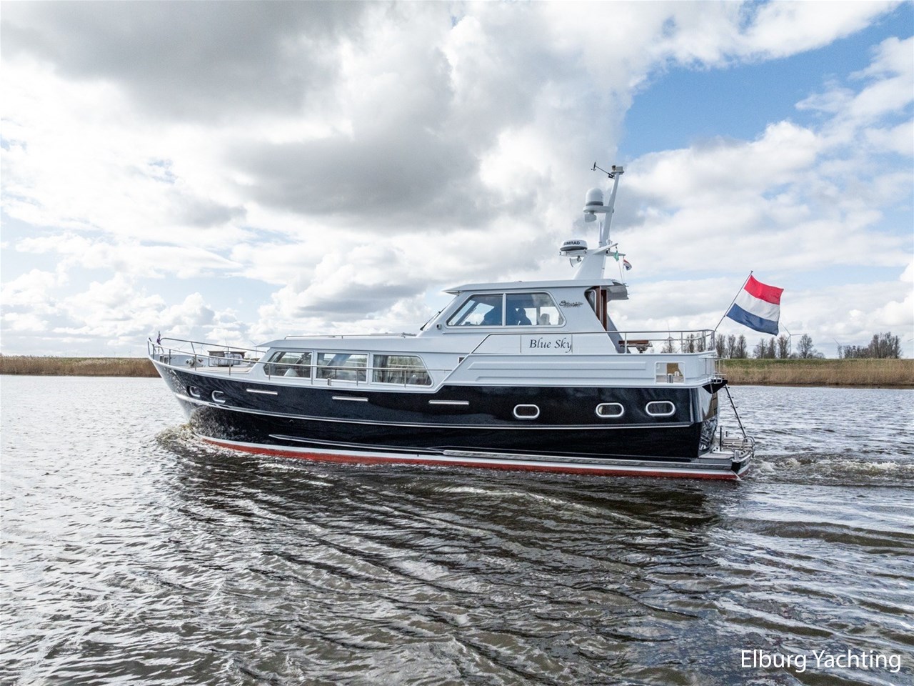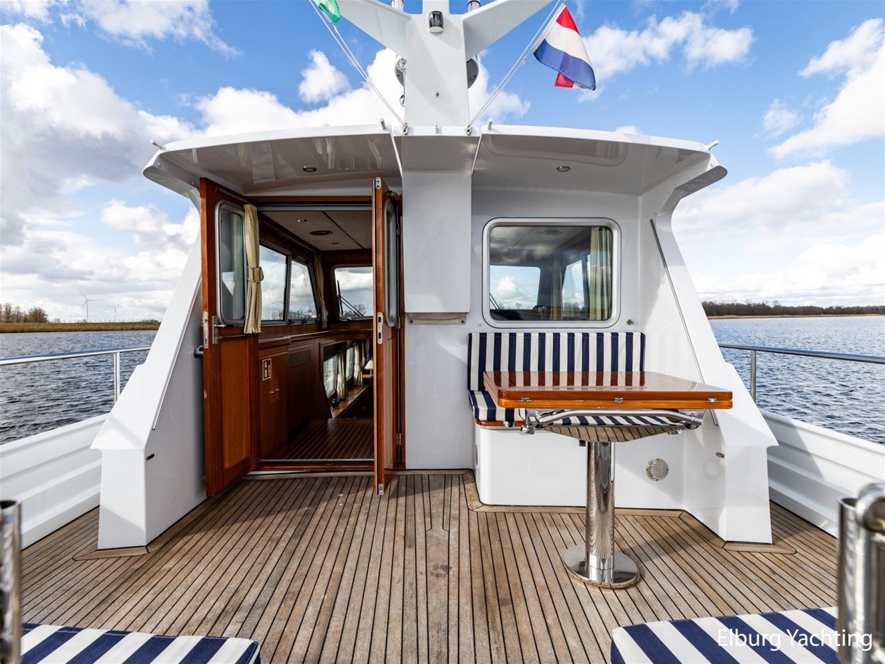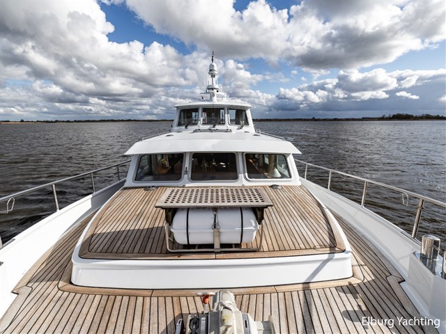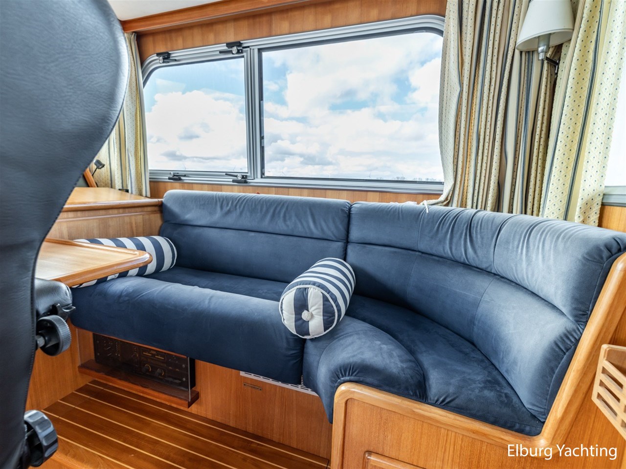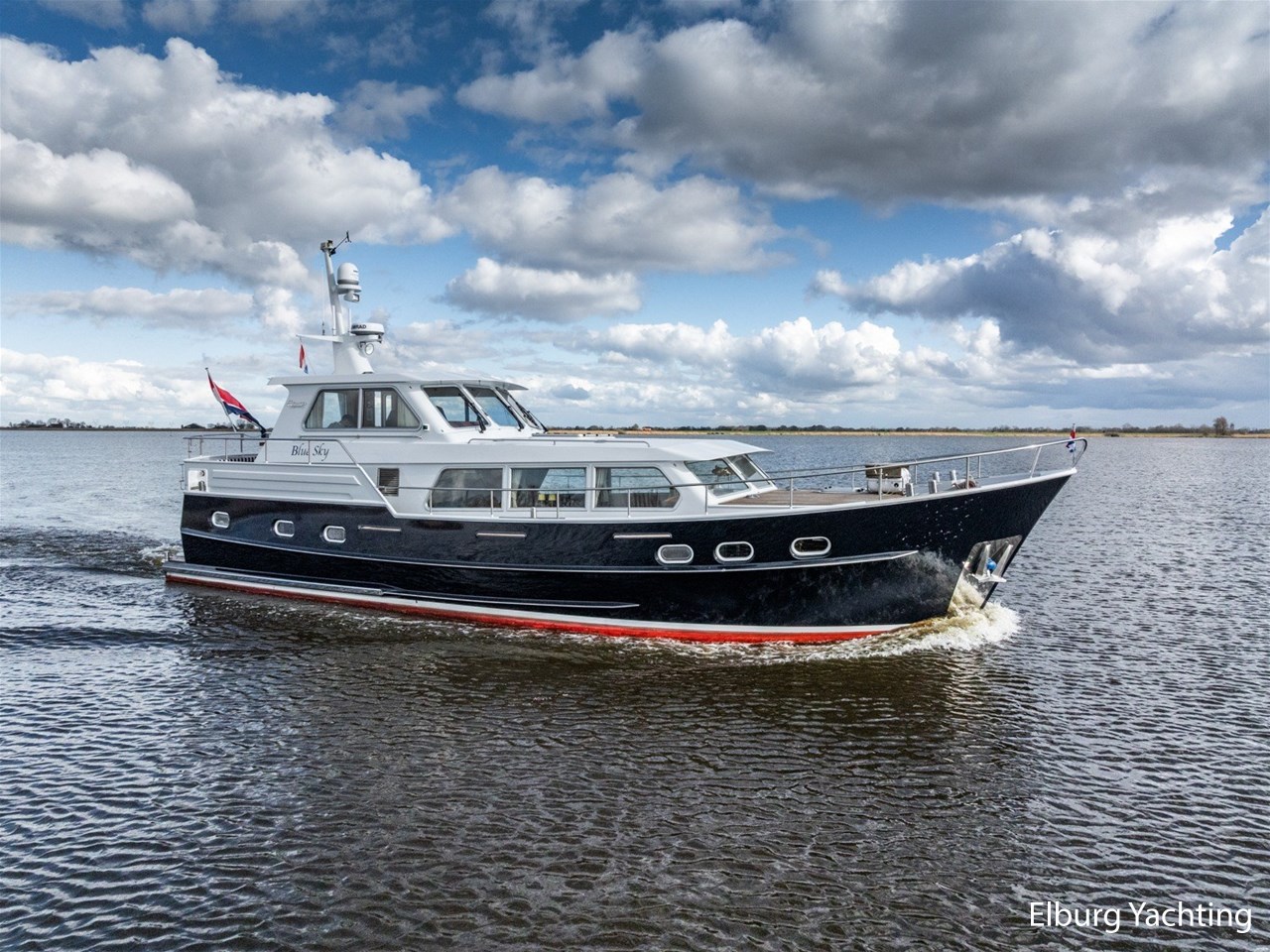 Sturier 520 AC (aft cabin) with raised wheelhouse provides maximum all-round visibility and good contact with people on deck. The saloon is very spacious with lots of natural light and not only has a ship's character but also immediately creates a living room atmosphere. The galley is accessible from the saloon and is fully equipped with modern equipment. The fore and aft cabin each have a double freestanding bed with a en-suite bathroom. The ship has more than proven itself on beautiful seagoing trips in and around Northern Europe. Refit work carried out: Hull in Majestic Blue and superstructure in Matterhorn White repainted in 2022, 6 x Mastervolt Gel batteries 220Ah / Mastervolt Easy 5 display / Mastervolt Mass Combi 24V 3500W 100Amp inverter renewed in 2022, complete dashboard renewed and modernized with Simrad equipment in 2021 and various smaller renewings on board. The Sturier 520 AC 'Blue Sky' is equipped with: double varnished teak door to the wheelhouse, Bosch dishwasher, Eumenia washer/dryer in bathroom front cabin, stainless steel towel heaters in both bathrooms, electric Morsche engine control with engine synchronization function, 5-blade propellers, Hydronautica remote control with which mooring and unmooring becomes child's play by operating the bow and stern thrusters and also the main engine stationary forwards and backwards, KVH TracVision TV3 dome, TV in saloon on lift, WiFi router on board (SIM card not included), 2 x sliding windows in wheelhouse, deck wash connection on SB + BB, fly screens for hatches and portholes and fly screen door in wheelhouse, hydraulically foldable mast, clearance height with mast up approx. 6.60m and with folded mast approx. 4.10m. The maximum speed is approximately 9 knots, the cruising speed is approximately 7.5 knots with a total consumption of approximately 15 litres p/hour. For questions and/or to make an appointment, you are welcome at Elburg Yachting 7 days a week.
