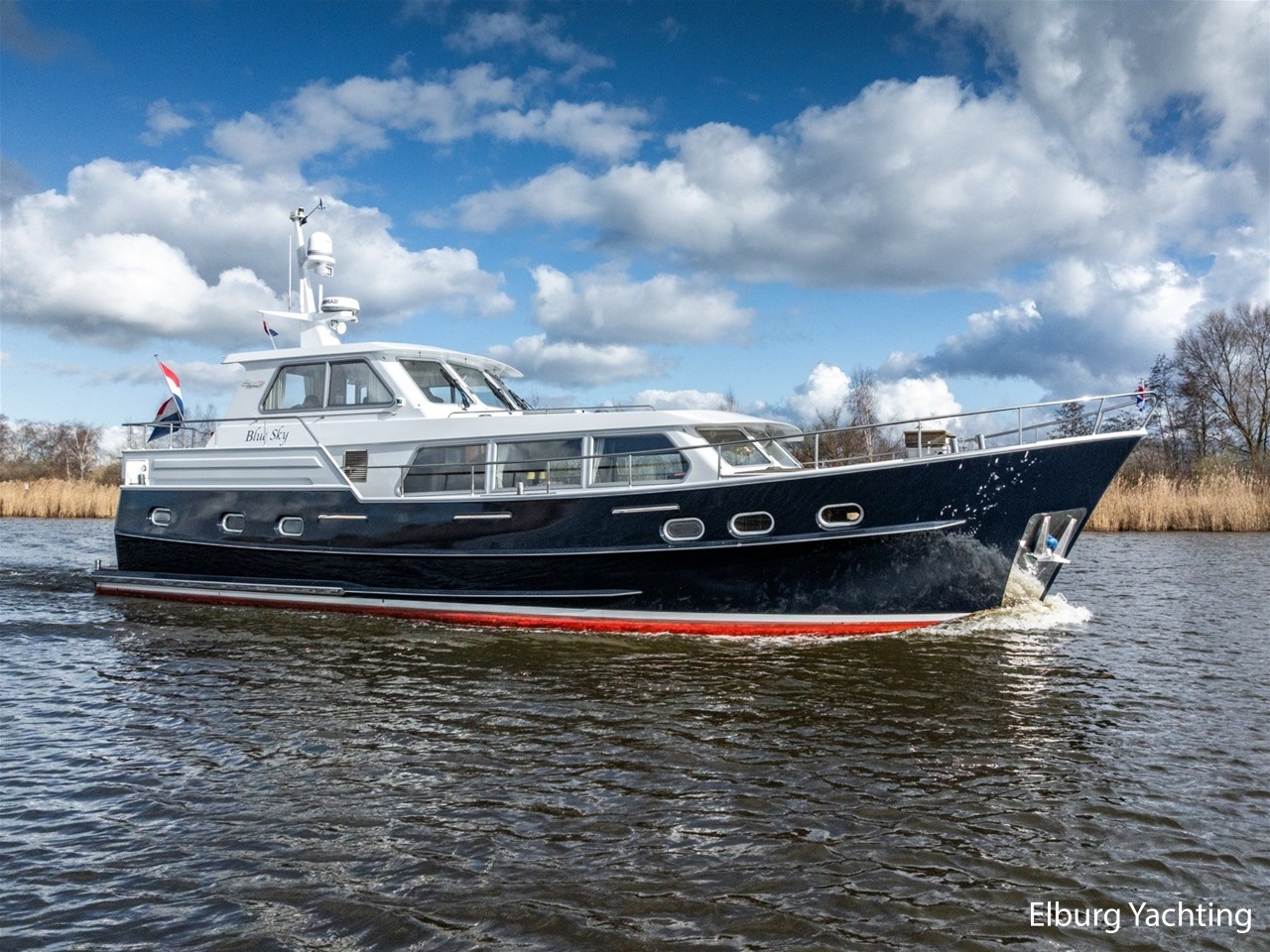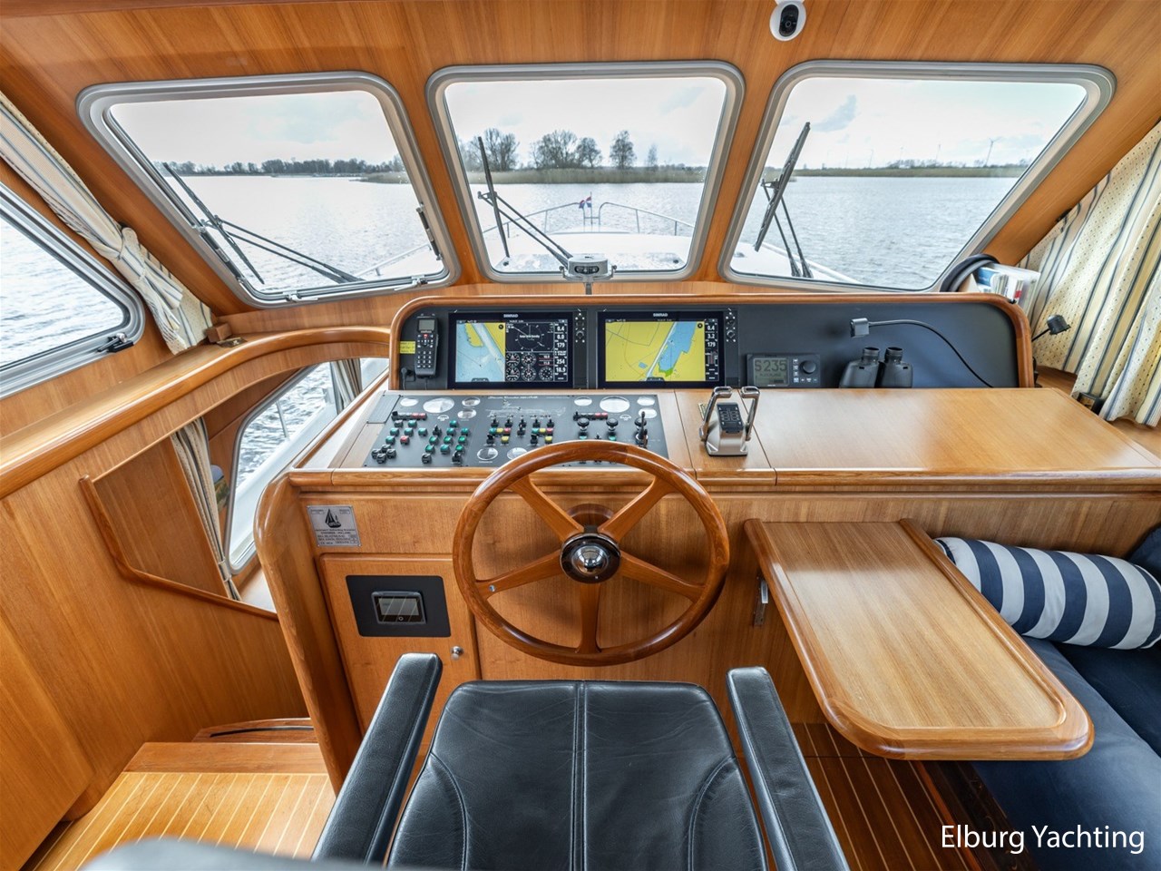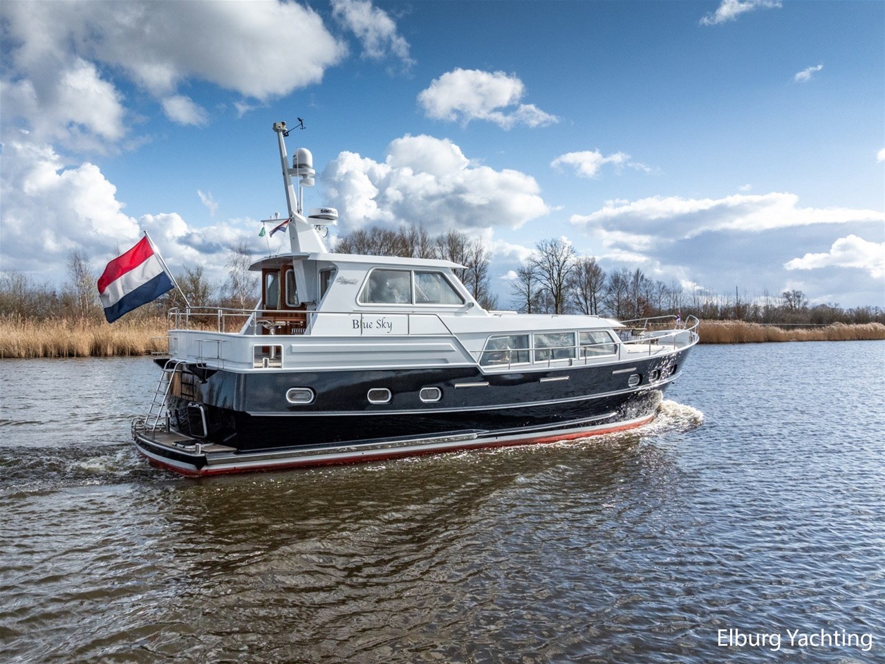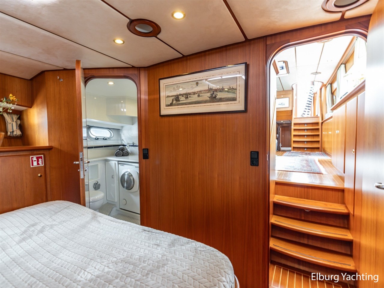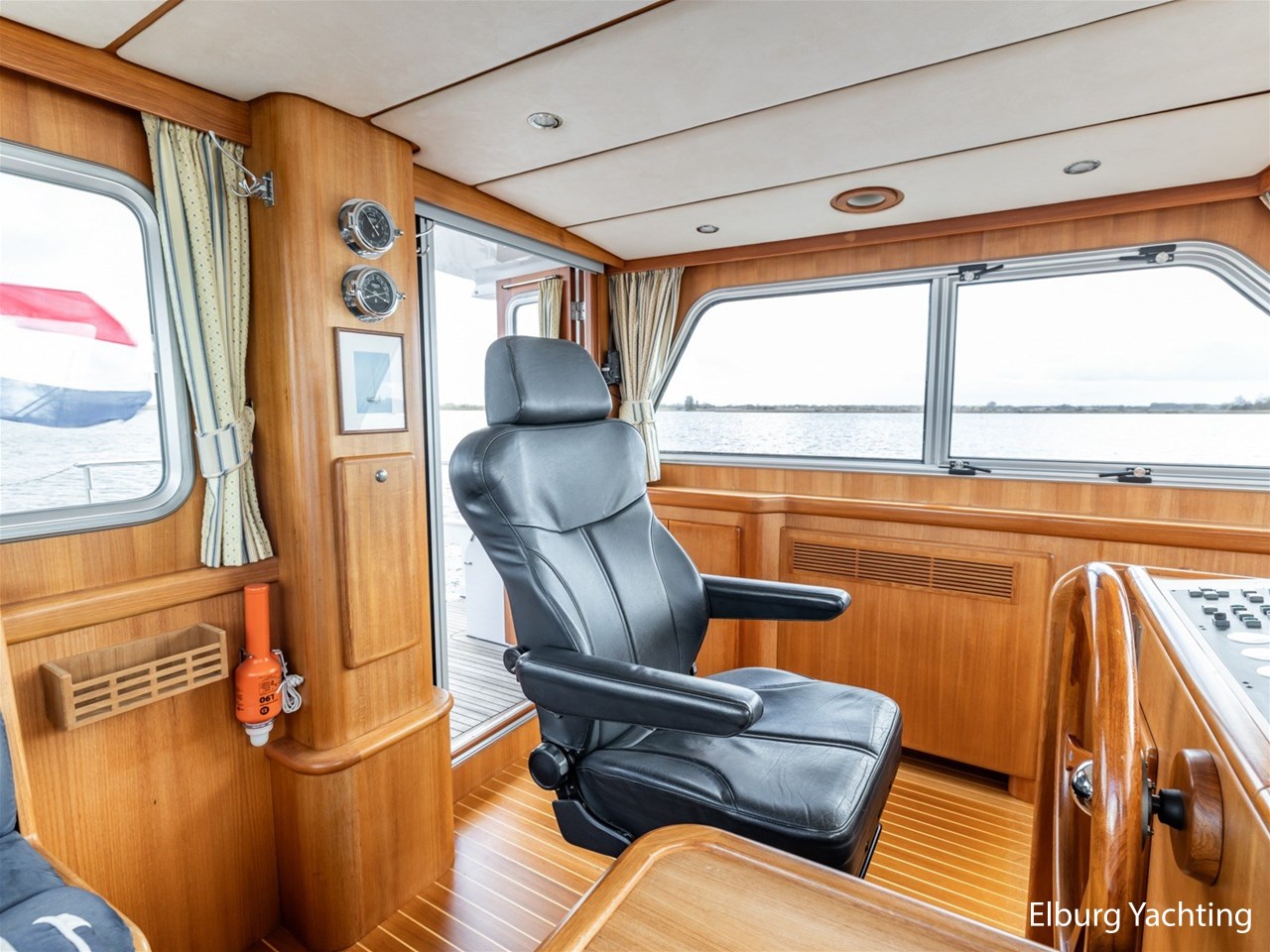 Sturier 520 AC (aft cabin) with raised wheelhouse provides maximum all-round visibility and good contact with people on deck. The saloon is very spacious with lots of natural light and not only has a ship's character but also immediately creates a living room atmosphere. The galley is accessible from the saloon and is fully equipped with modern equipment. The fore and aft cabin each have a double freestanding bed with a en-suite bathroom. The ship has more than proven itself on beautiful seagoing trips in and around Northern Europe. Refit work carried out: Hull in Majestic Blue and superstructure in Matterhorn White repainted in 2022, 6 x Mastervolt Gel batteries 220Ah / Mastervolt Easy 5 display / Mastervolt Mass Combi 24V 3500W 100Amp inverter renewed in 2022, complete dashboard renewed and modernized with Simrad equipment in 2021 and various smaller renewings on board. The Sturier 520 AC 'Blue Sky' is equipped with: double varnished teak door to the wheelhouse, Bosch dishwasher, Eumenia washer/dryer in bathroom front cabin, stainless steel towel heaters in both bathrooms, electric Morsche engine control with engine synchronization function, 5-blade propellers, Hydronautica remote control with which mooring and unmooring becomes child's play by operating the bow and stern thrusters and also the main engine stationary forwards and backwards, KVH TracVision TV3 dome, TV in saloon on lift, WiFi router on board (SIM card not included), 2 x sliding windows in wheelhouse, deck wash connection on SB + BB, fly screens for hatches and portholes and fly screen door in wheelhouse, hydraulically foldable mast, clearance height with mast up approx. 6.60m and with folded mast approx. 4.10m. The maximum speed is approximately 9 knots, the cruising speed is approximately 7.5 knots with a total consumption of approximately 15 litres p/hour. For questions and/or to make an appointment, you are welcome at Elburg Yachting 7 days a week.