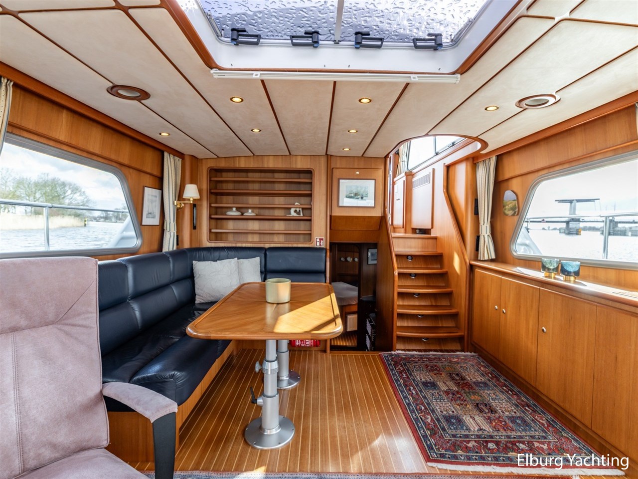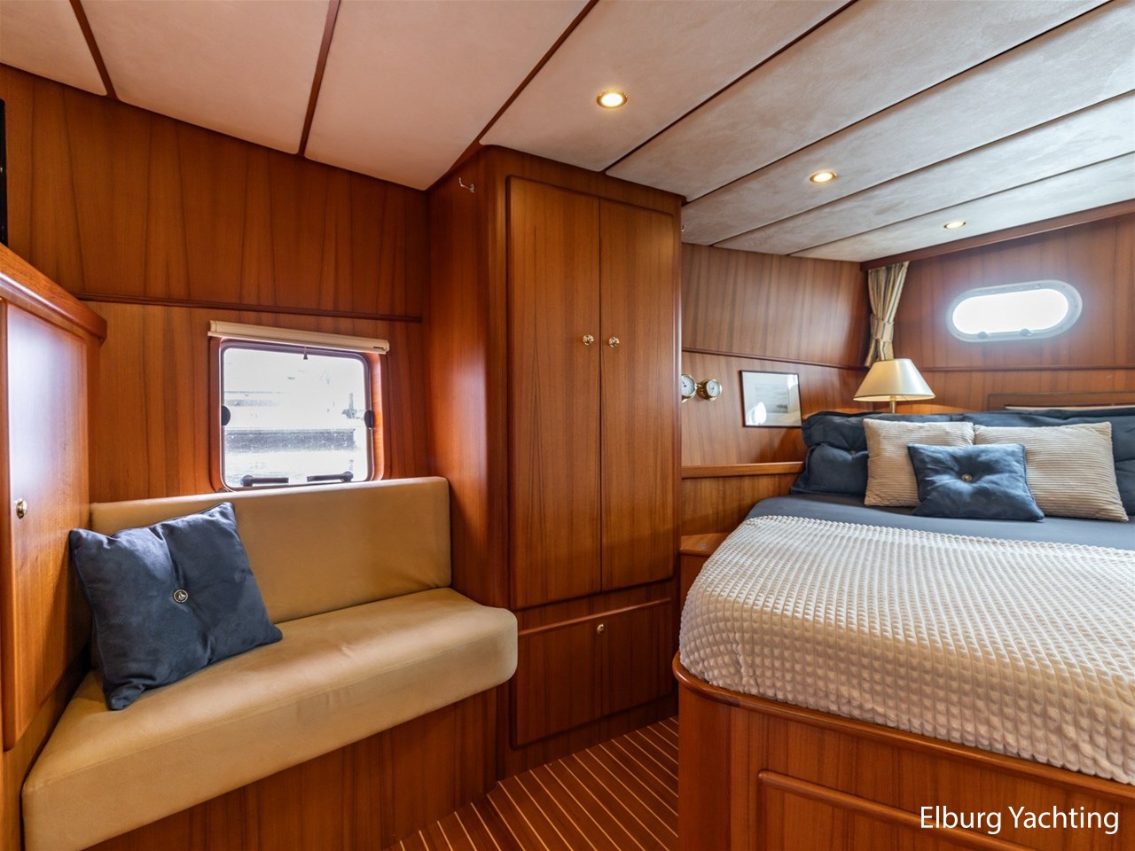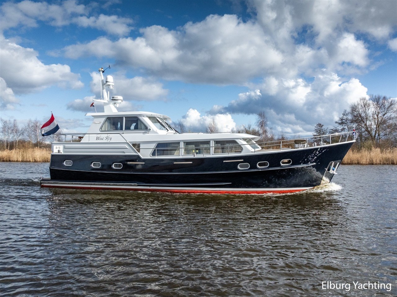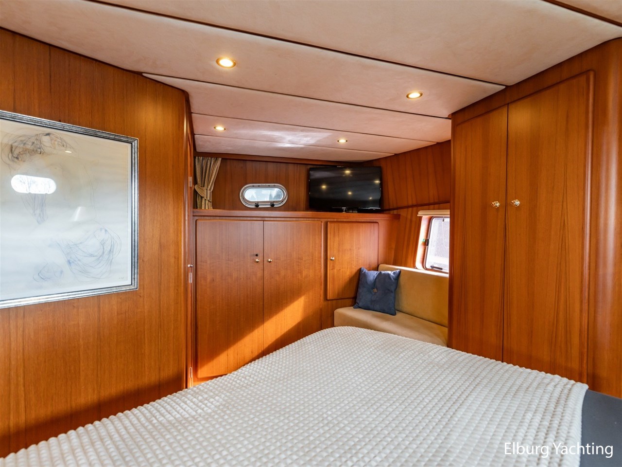 Sturier 520 AC (aft cabin) with raised wheelhouse provides maximum all-round visibility and good contact with people on deck. The saloon is very spacious with lots of natural light and not only has a ship's character but also immediately creates a living room atmosphere. The galley is accessible from the saloon and is fully equipped with modern equipment. The fore and aft cabin each have a double freestanding bed with a en-suite bathroom. The ship has more than proven itself on beautiful seagoing trips in and around Northern Europe. Refit work carried out: Hull in Majestic Blue and superstructure in Matterhorn White repainted in 2022, 6 x Mastervolt Gel batteries 220Ah / Mastervolt Easy 5 display / Mastervolt Mass Combi 24V 3500W 100Amp inverter renewed in 2022, complete dashboard renewed and modernized with Simrad equipment in 2021 and various smaller renewings on board. The Sturier 520 AC 'Blue Sky' is equipped with: double varnished teak door to the wheelhouse, Bosch dishwasher, Eumenia washer/dryer in bathroom front cabin, stainless steel towel heaters in both bathrooms, electric Morsche engine control with engine synchronization function, 5-blade propellers, Hydronautica remote control with which mooring and unmooring becomes child's play by operating the bow and stern thrusters and also the main engine stationary forwards and backwards, KVH TracVision TV3 dome, TV in saloon on lift, WiFi router on board (SIM card not included), 2 x sliding windows in wheelhouse, deck wash connection on SB + BB, fly screens for hatches and portholes and fly screen door in wheelhouse, hydraulically foldable mast, clearance height with mast up approx. 6.60m and with folded mast approx. 4.10m. The maximum speed is approximately 9 knots, the cruising speed is approximately 7.5 knots with a total consumption of approximately 15 litres p/hour. For questions and/or to make an appointment, you are welcome at Elburg Yachting 7 days a week.