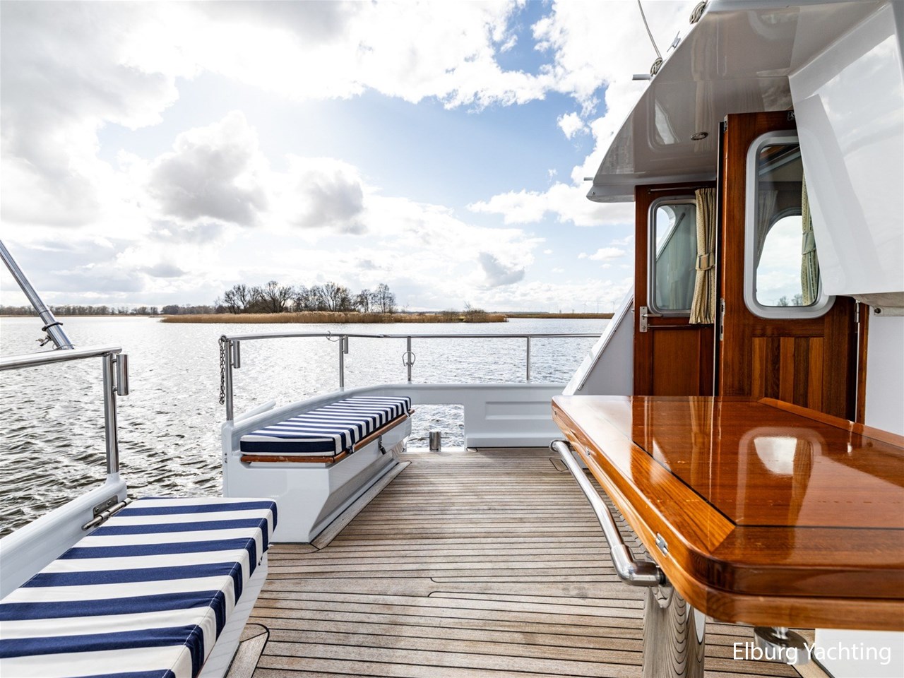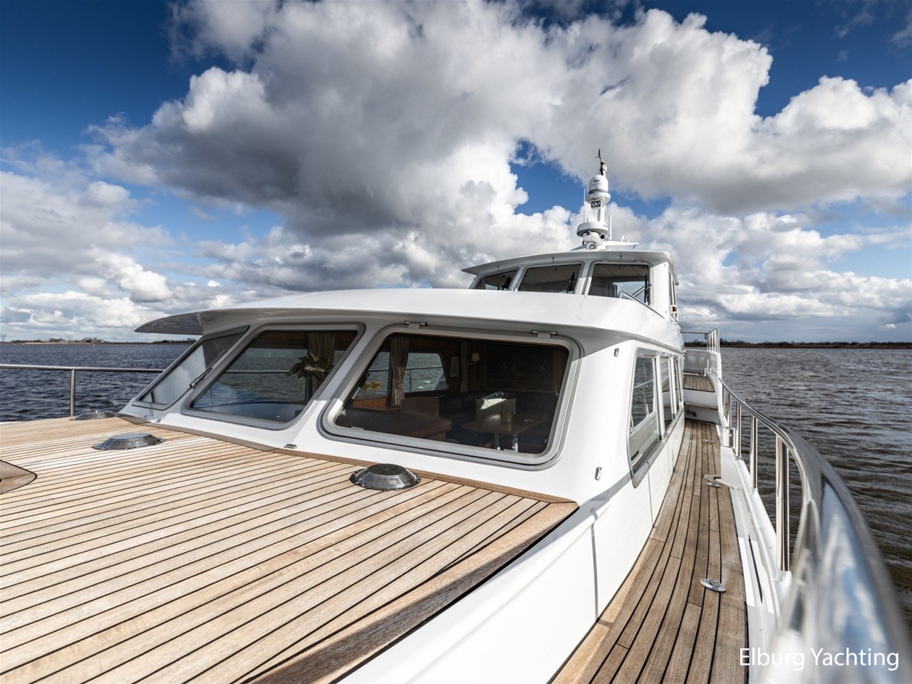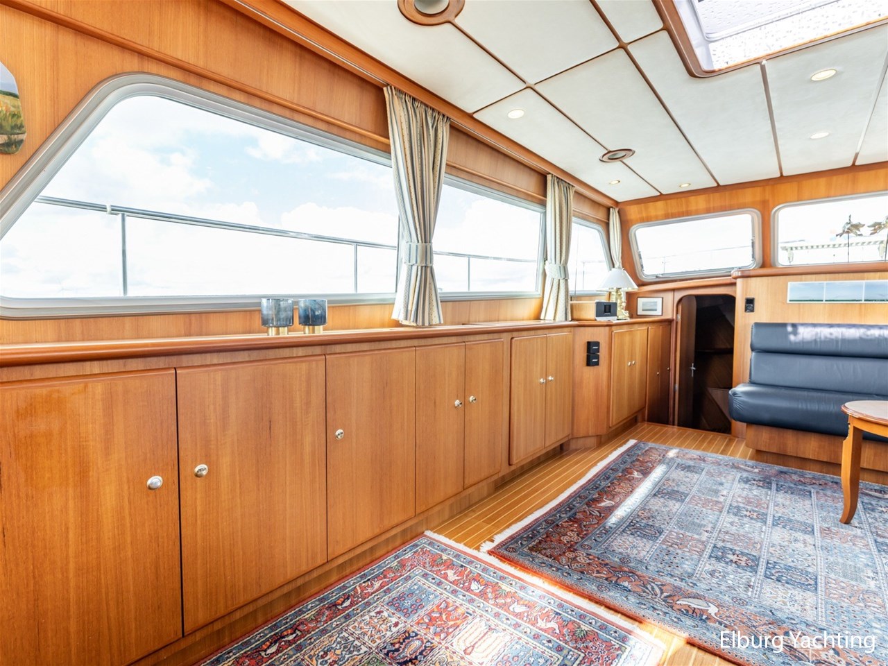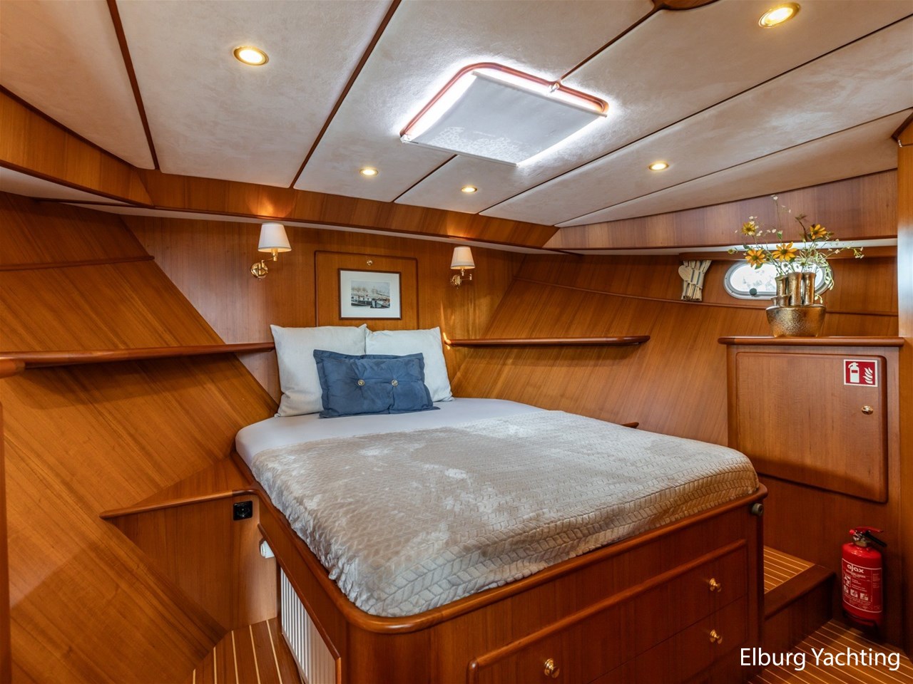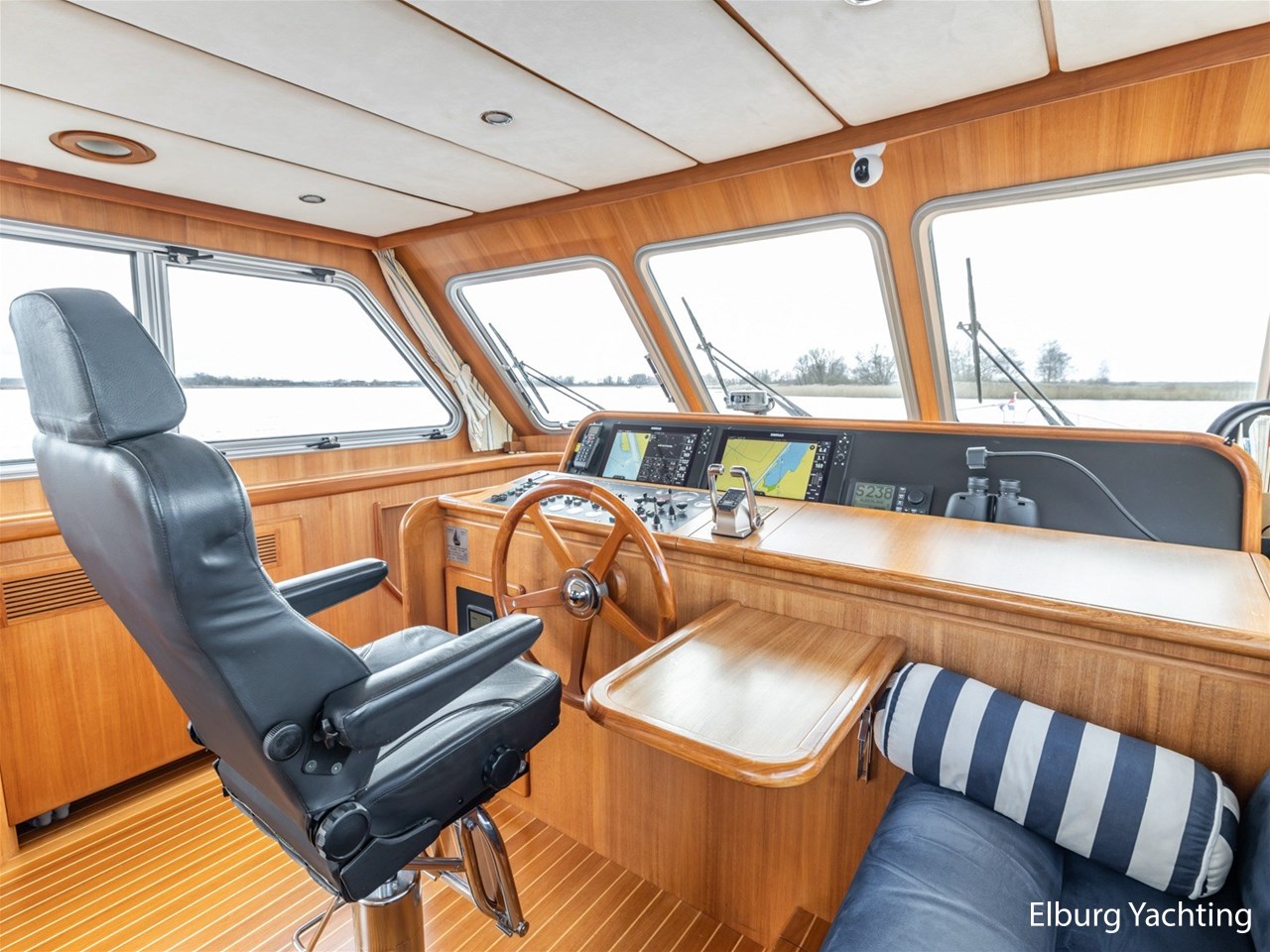Sturier 520 AC (aft cabin) with raised wheelhouse provides maximum all-round visibility and good contact with people on deck. The saloon is very spacious with lots of natural light and not only has a ship's character but also immediately creates a living room atmosphere. The galley is accessible from the saloon and is fully equipped with modern equipment. The fore and aft cabin each have a double freestanding bed with a en-suite bathroom. The ship has more than proven itself on beautiful seagoing trips in and around Northern Europe. Refit work carried out: Hull in Majestic Blue and superstructure in Matterhorn White repainted in 2022, 6 x Mastervolt Gel batteries 220Ah / Mastervolt Easy 5 display / Mastervolt Mass Combi 24V 3500W 100Amp inverter renewed in 2022, complete dashboard renewed and modernized with Simrad equipment in 2021 and various smaller renewings on board. The Sturier 520 AC 'Blue Sky' is equipped with: double varnished teak door to the wheelhouse, Bosch dishwasher, Eumenia washer/dryer in bathroom front cabin, stainless steel towel heaters in both bathrooms, electric Morsche engine control with engine synchronization function, 5-blade propellers, Hydronautica remote control with which mooring and unmooring becomes child's play by operating the bow and stern thrusters and also the main engine stationary forwards and backwards, KVH TracVision TV3 dome, TV in saloon on lift, WiFi router on board (SIM card not included), 2 x sliding windows in wheelhouse, deck wash connection on SB + BB, fly screens for hatches and portholes and fly screen door in wheelhouse, hydraulically foldable mast, clearance height with mast up approx. 6.60m and with folded mast approx. 4.10m. The maximum speed is approximately 9 knots, the cruising speed is approximately 7.5 knots with a total consumption of approximately 15 litres p/hour. For questions and/or to make an appointment, you are welcome at Elburg Yachting 7 days a week.