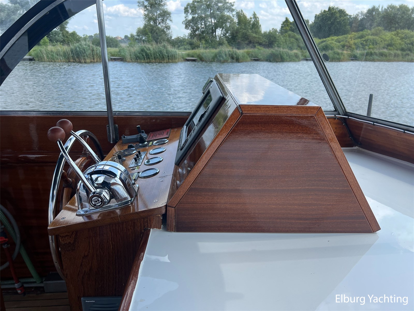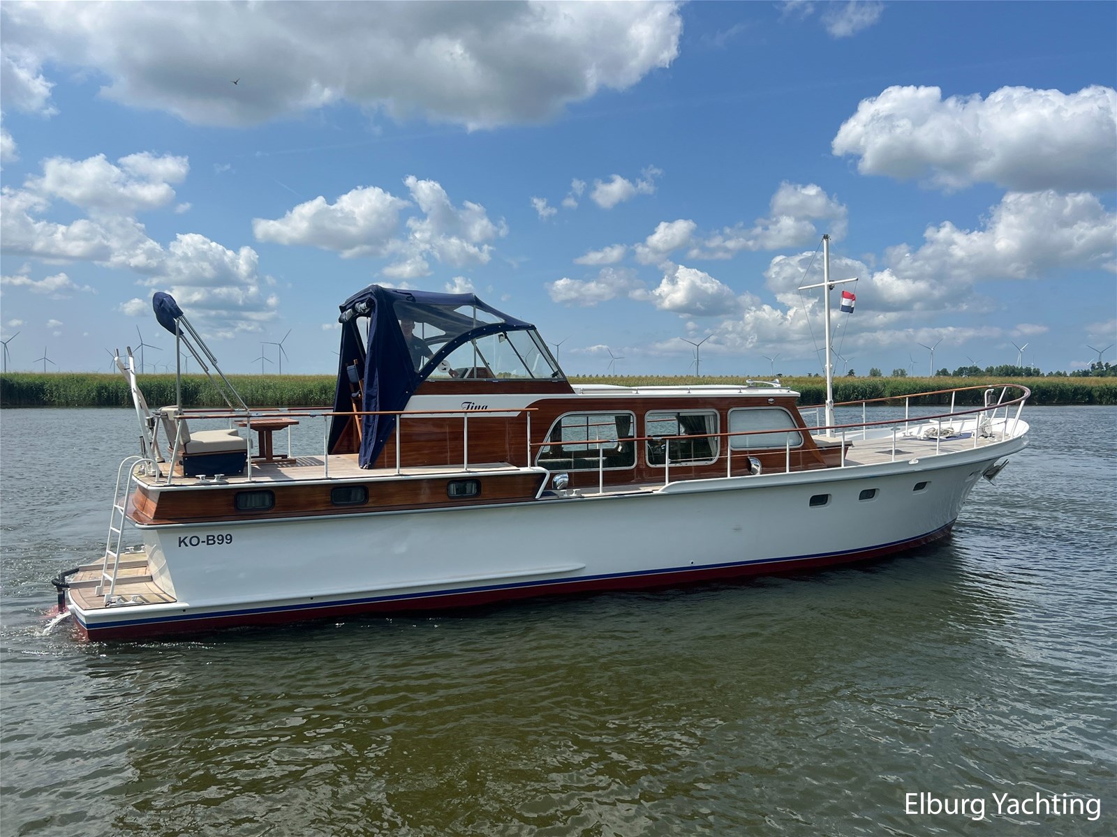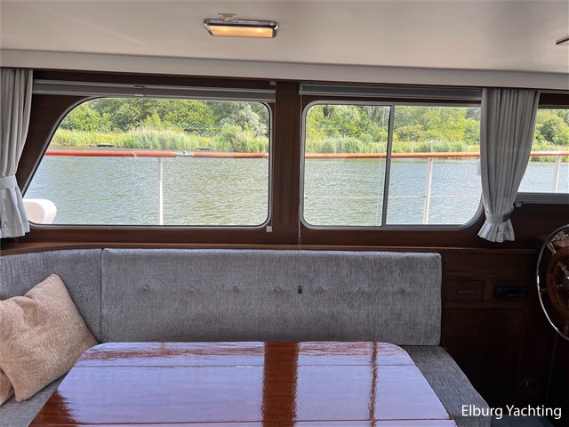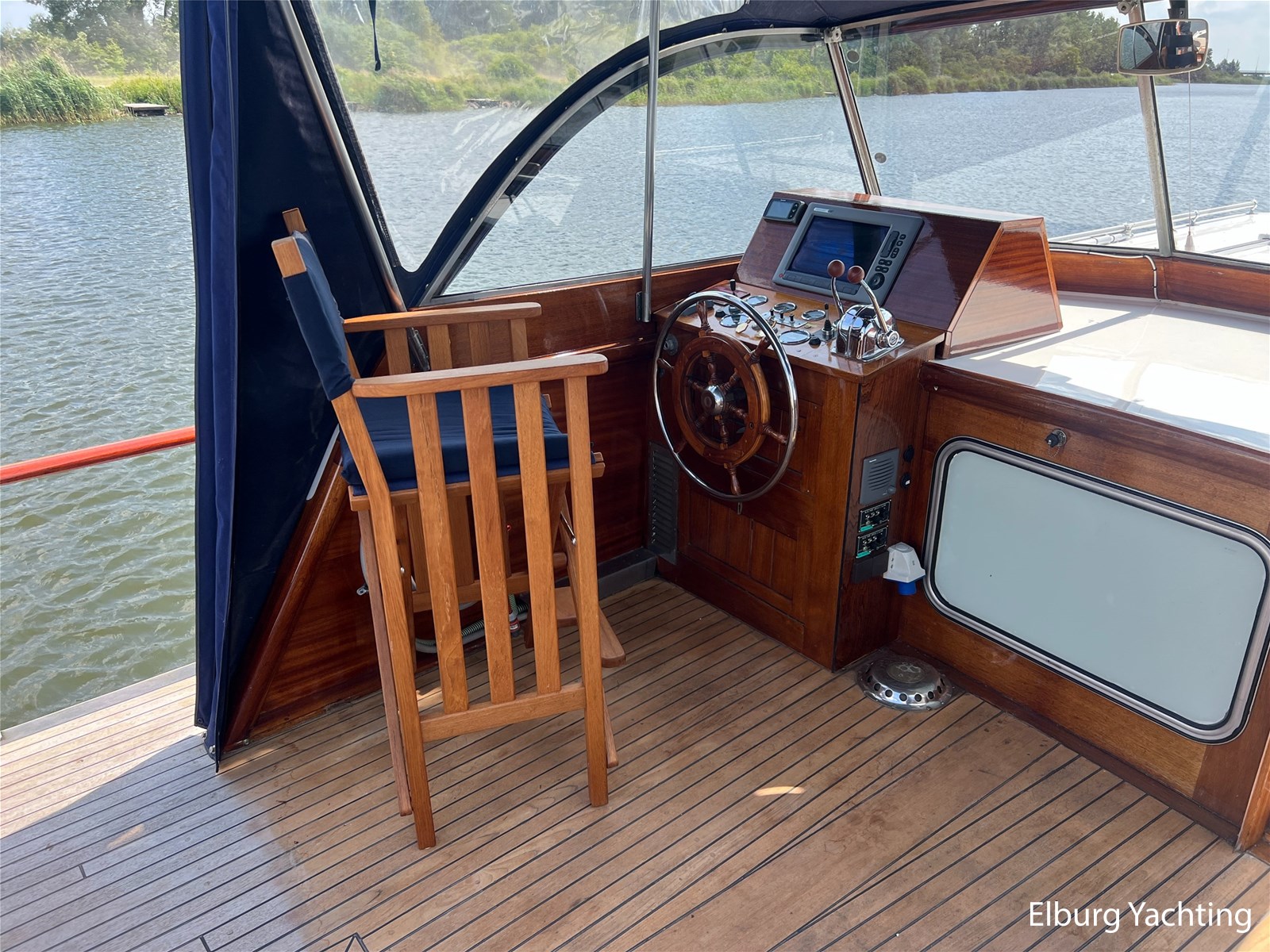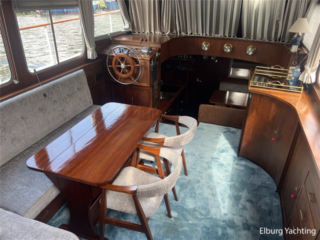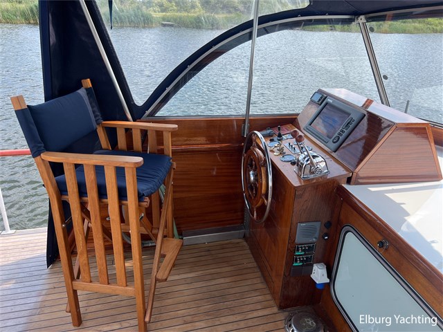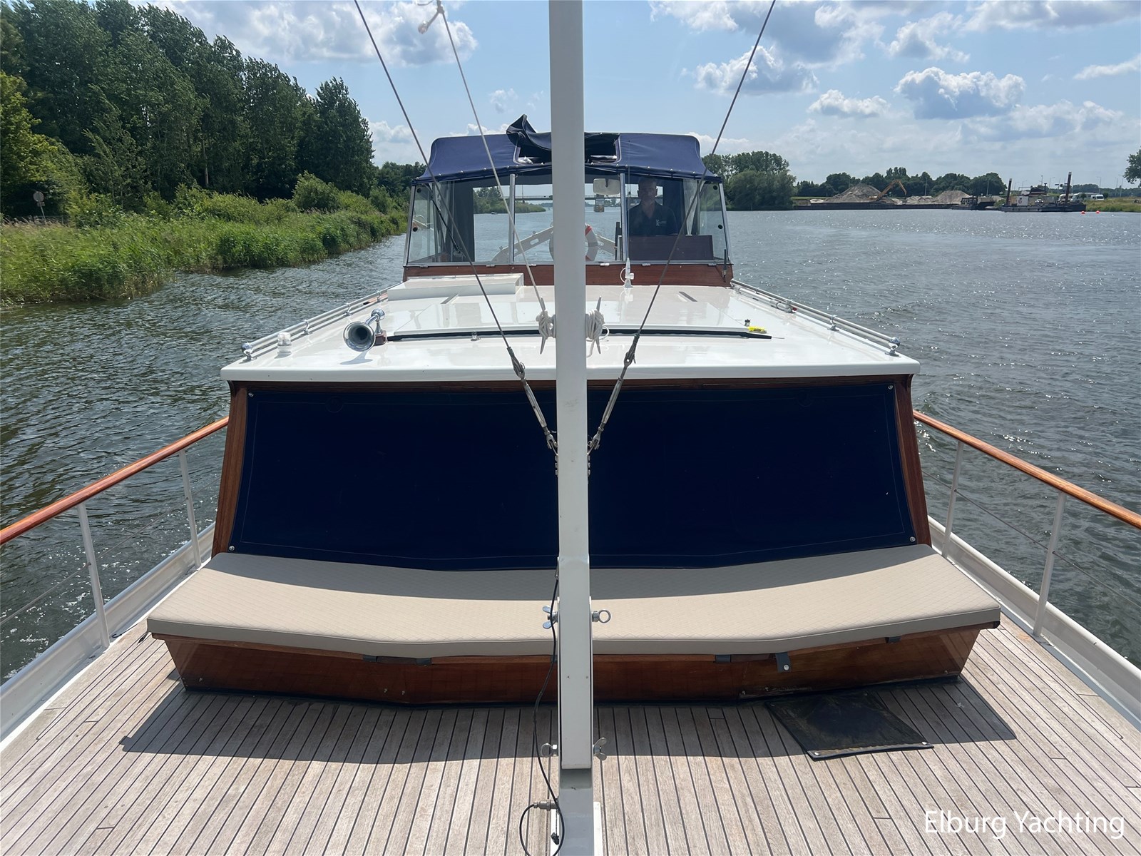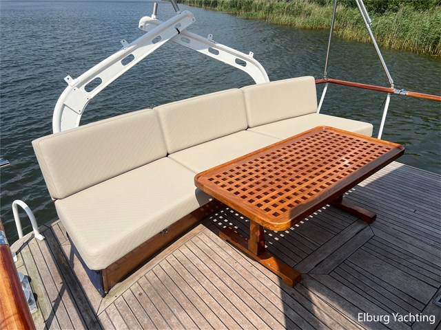 This beautiful Super van Craft 13.80 with her beautiful classic line is an elegant appearance on the water. Due to her low crawl height, the ship is suitable for sailing through the French canals. The Super van Craft 13.80 has a spacious L-dinette in the saloon with 2 chairs, sliding hatch in saloon, ship's wooden interior, U-dinette opposite the galley, two beds in the owner's cabin with recently renewed mattresses, electric cooking, guest cabin with a separate toilet, complete with bow and stern thruster, recently renewed upholstery and carpeting, recently renewed tent over the aft deck, complete winter tent for over the superstructure available. For questions and/or to make an appointment, you are welcome 7 days a week at Elburg Yachting.