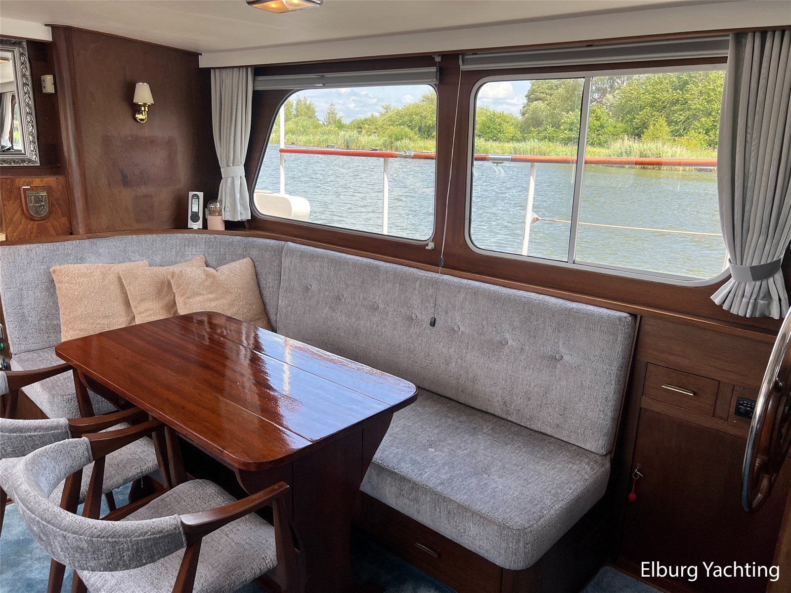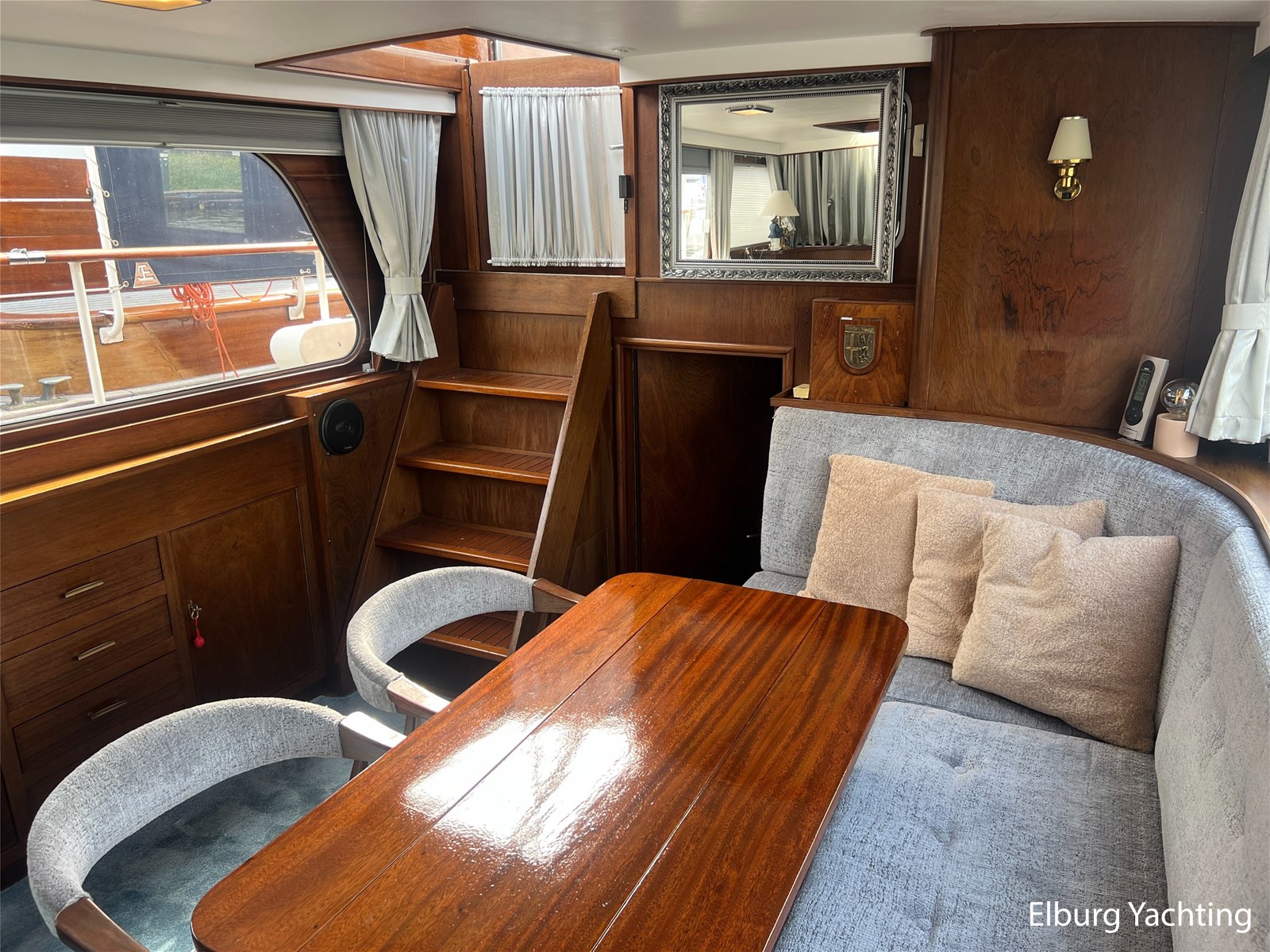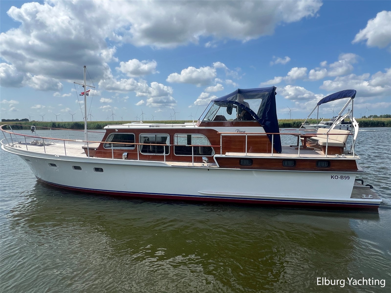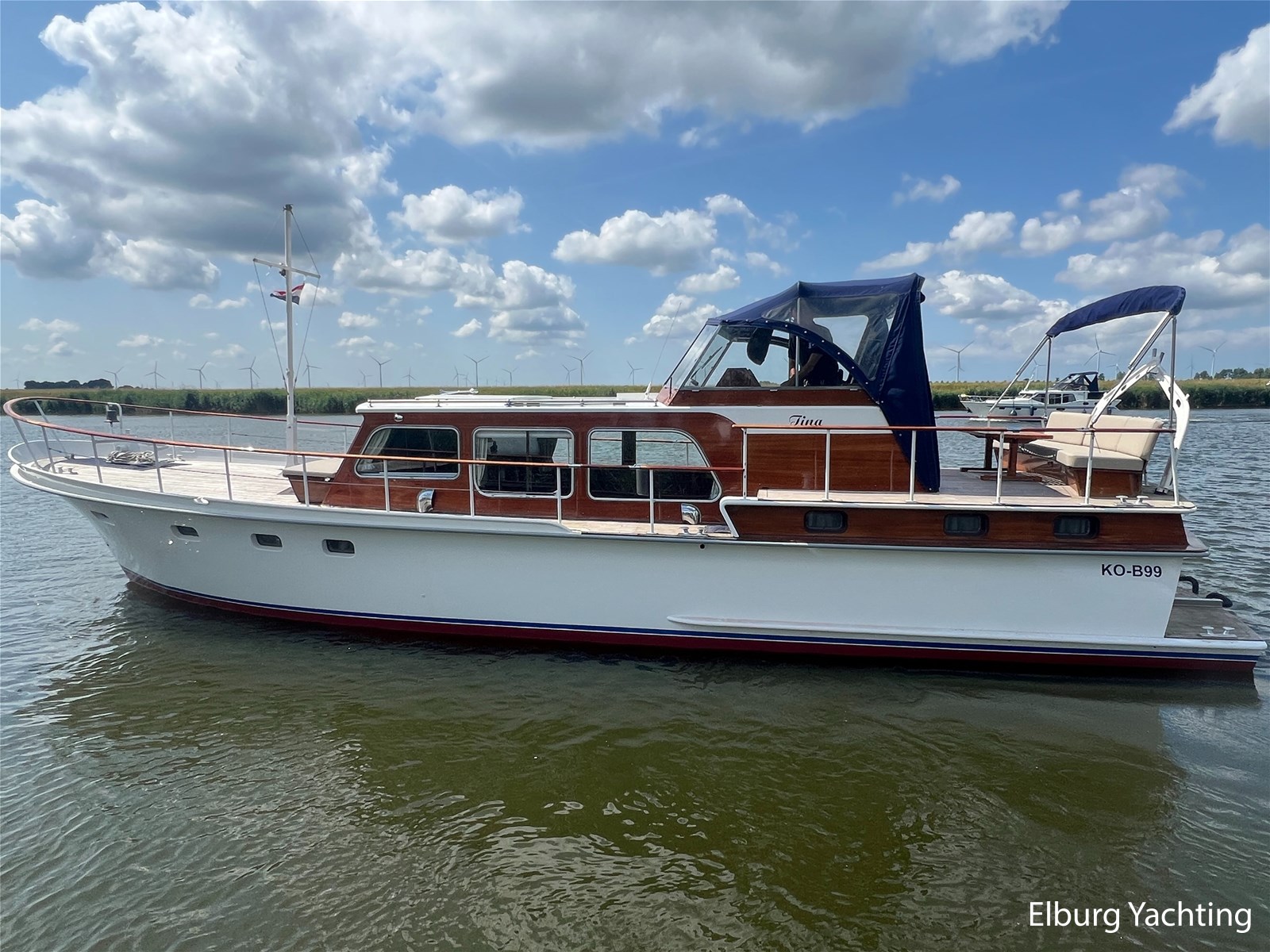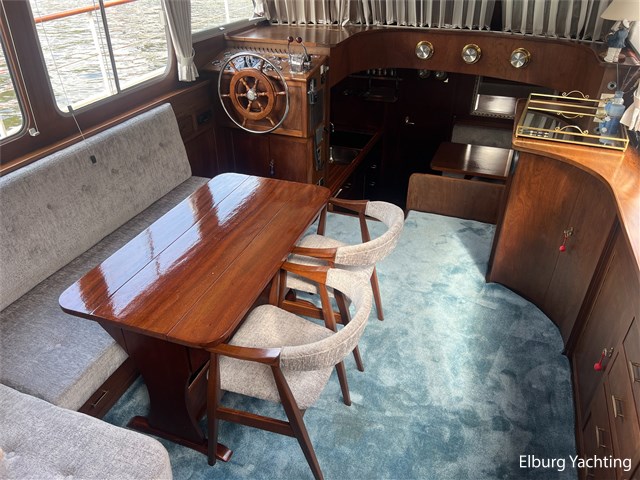 This beautiful Super van Craft 13.80 with her beautiful classic line is an elegant appearance on the water. Due to her low crawl height, the ship is suitable for sailing through the French canals. The Super van Craft 13.80 has a spacious L-dinette in the saloon with 2 chairs, sliding hatch in saloon, ship's wooden interior, U-dinette opposite the galley, two beds in the owner's cabin with recently renewed mattresses, electric cooking, guest cabin with a separate toilet, complete with bow and stern thruster, recently renewed upholstery and carpeting, recently renewed tent over the aft deck, complete winter tent for over the superstructure available. For questions and/or to make an appointment, you are welcome 7 days a week at Elburg Yachting.