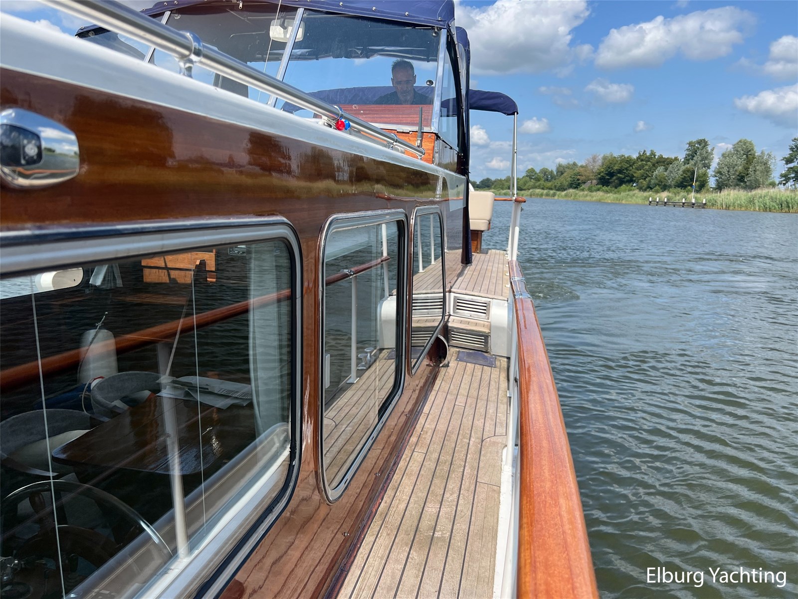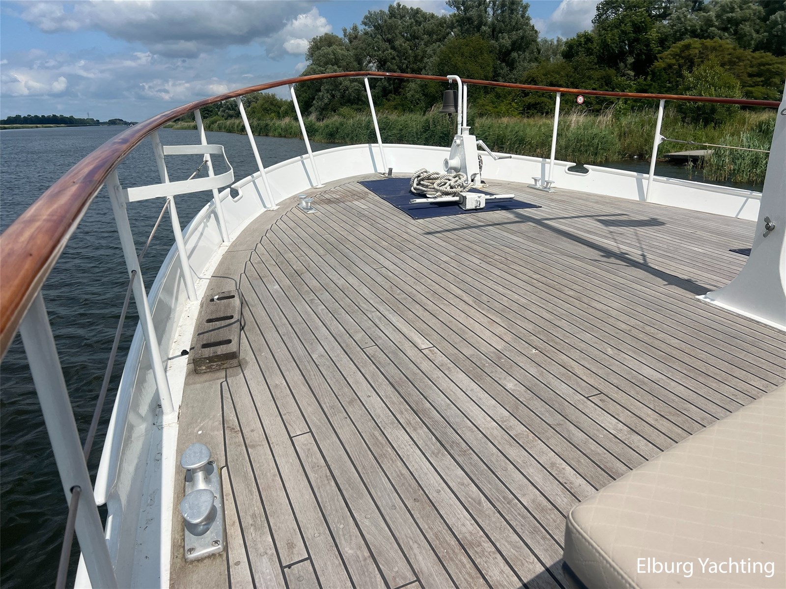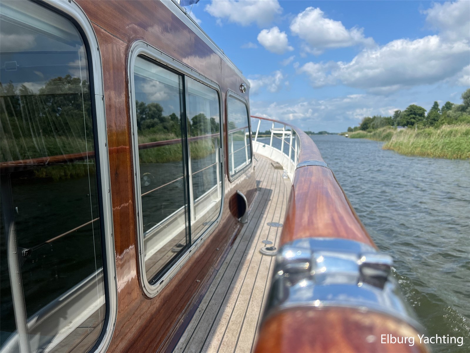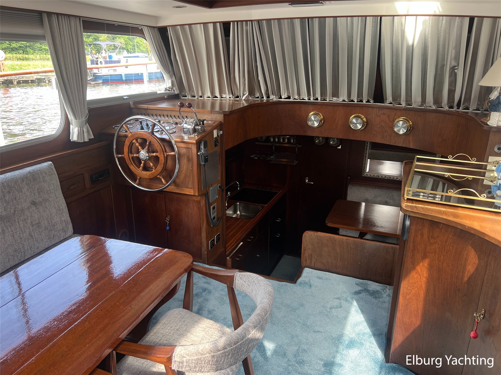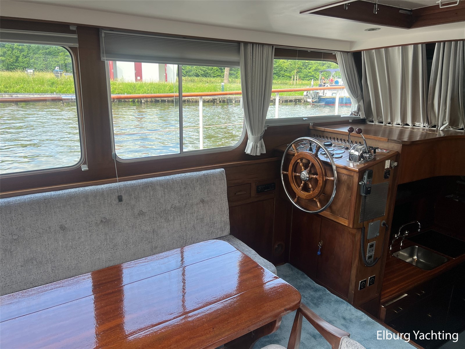 This beautiful Super van Craft 13.80 with her beautiful classic line is an elegant appearance on the water. Due to her low crawl height, the ship is suitable for sailing through the French canals. The Super van Craft 13.80 has a spacious L-dinette in the saloon with 2 chairs, sliding hatch in saloon, ship's wooden interior, U-dinette opposite the galley, two beds in the owner's cabin with recently renewed mattresses, electric cooking, guest cabin with a separate toilet, complete with bow and stern thruster, recently renewed upholstery and carpeting, recently renewed tent over the aft deck, complete winter tent for over the superstructure available. For questions and/or to make an appointment, you are welcome 7 days a week at Elburg Yachting.