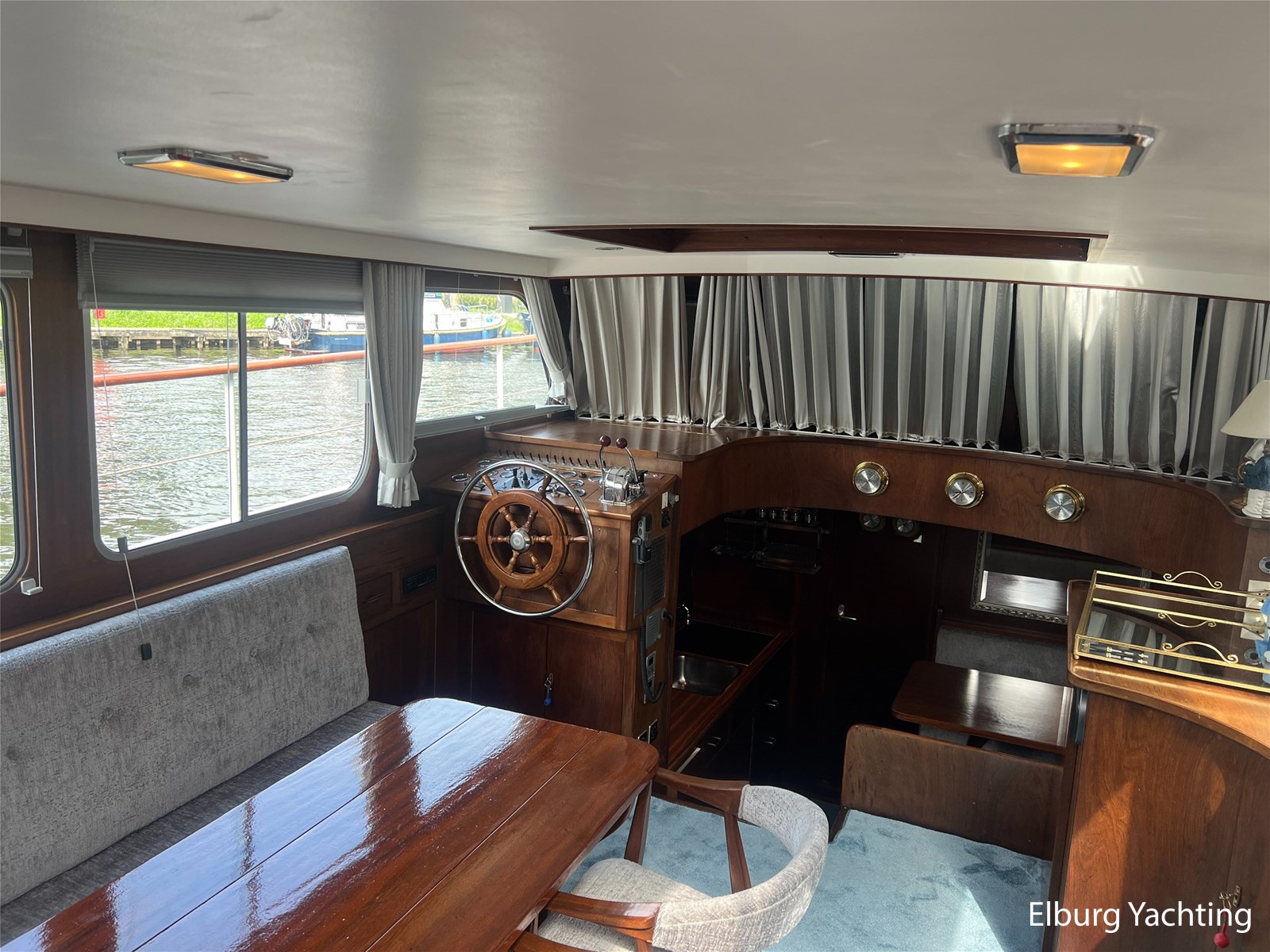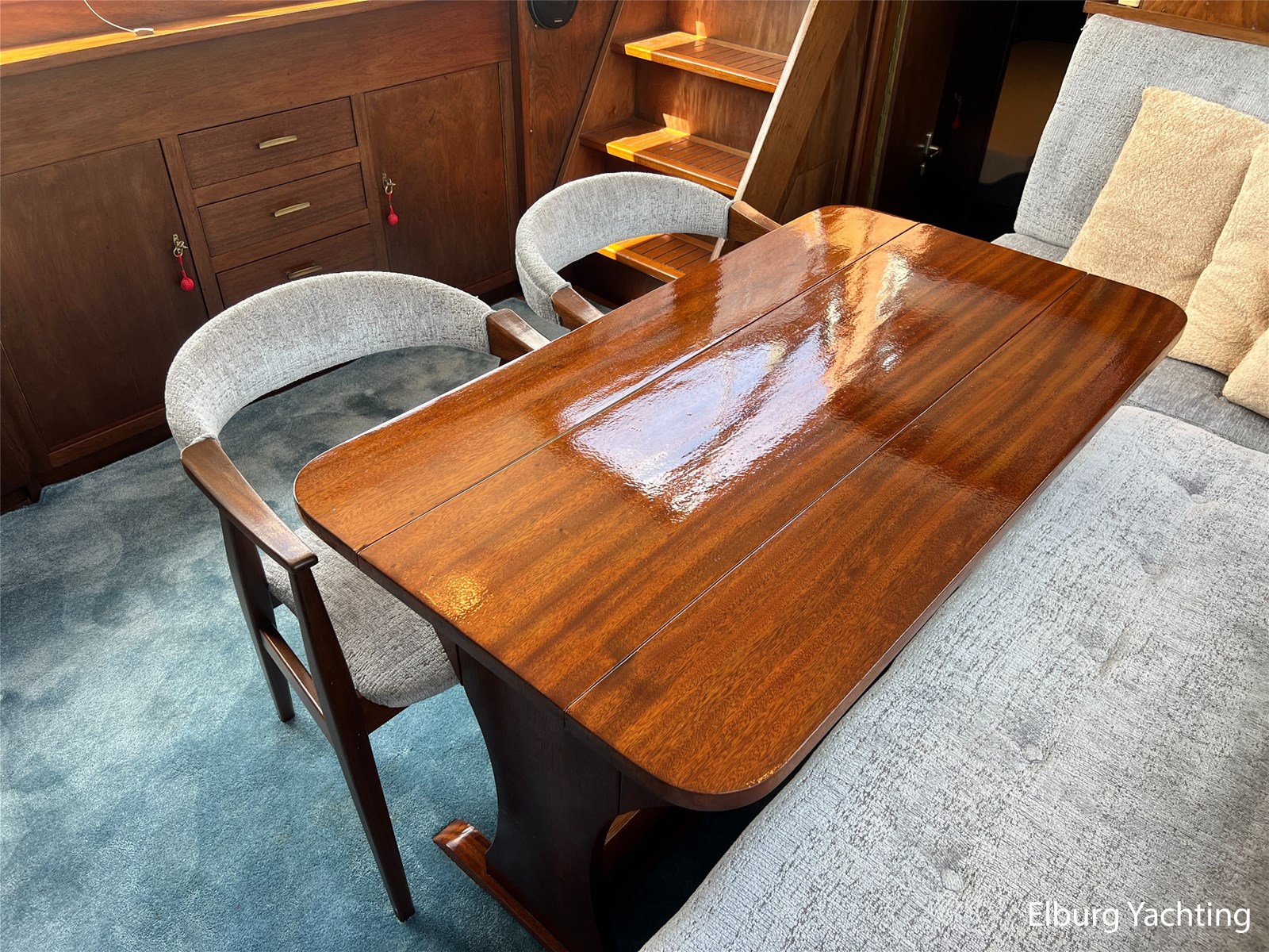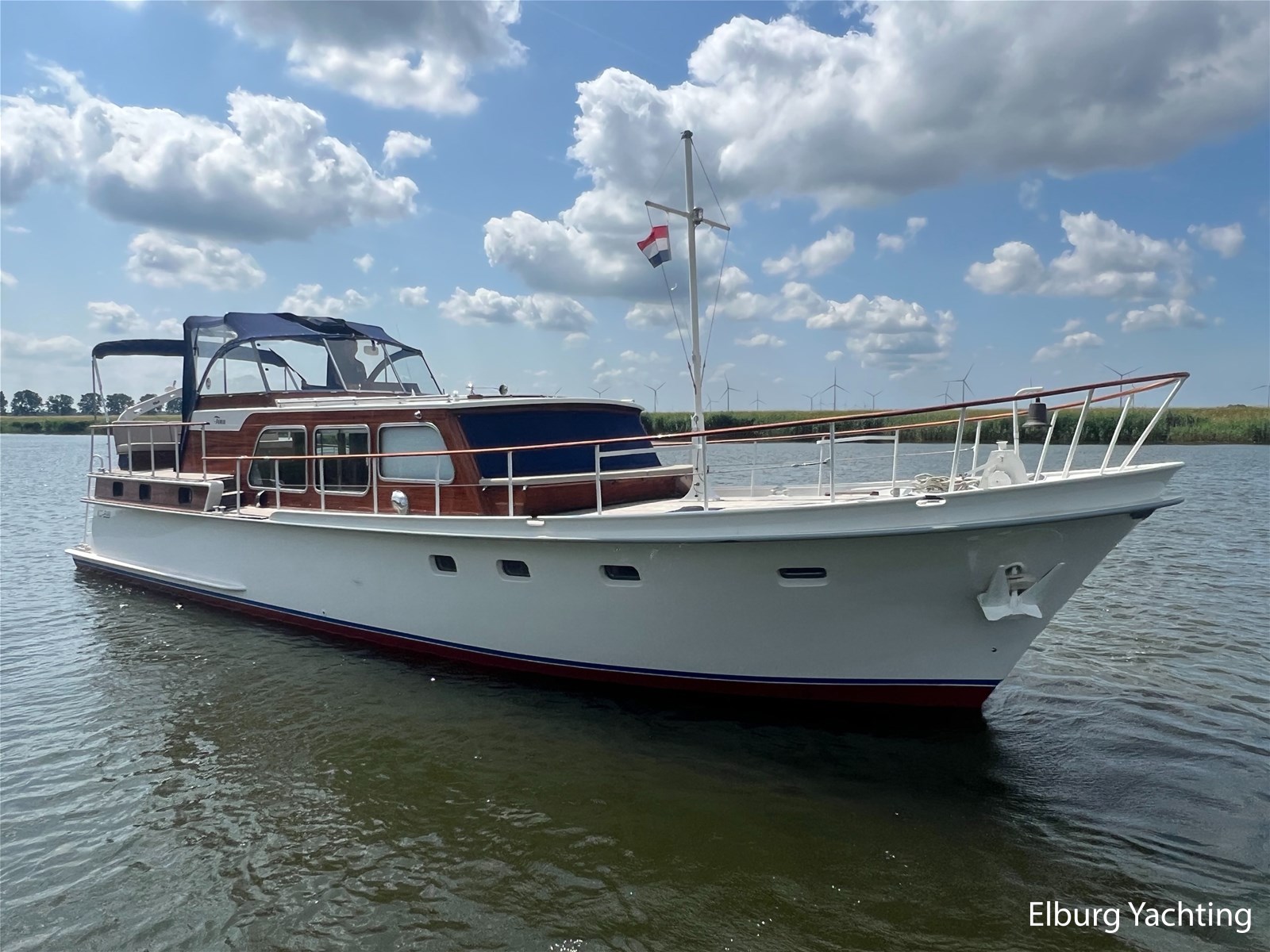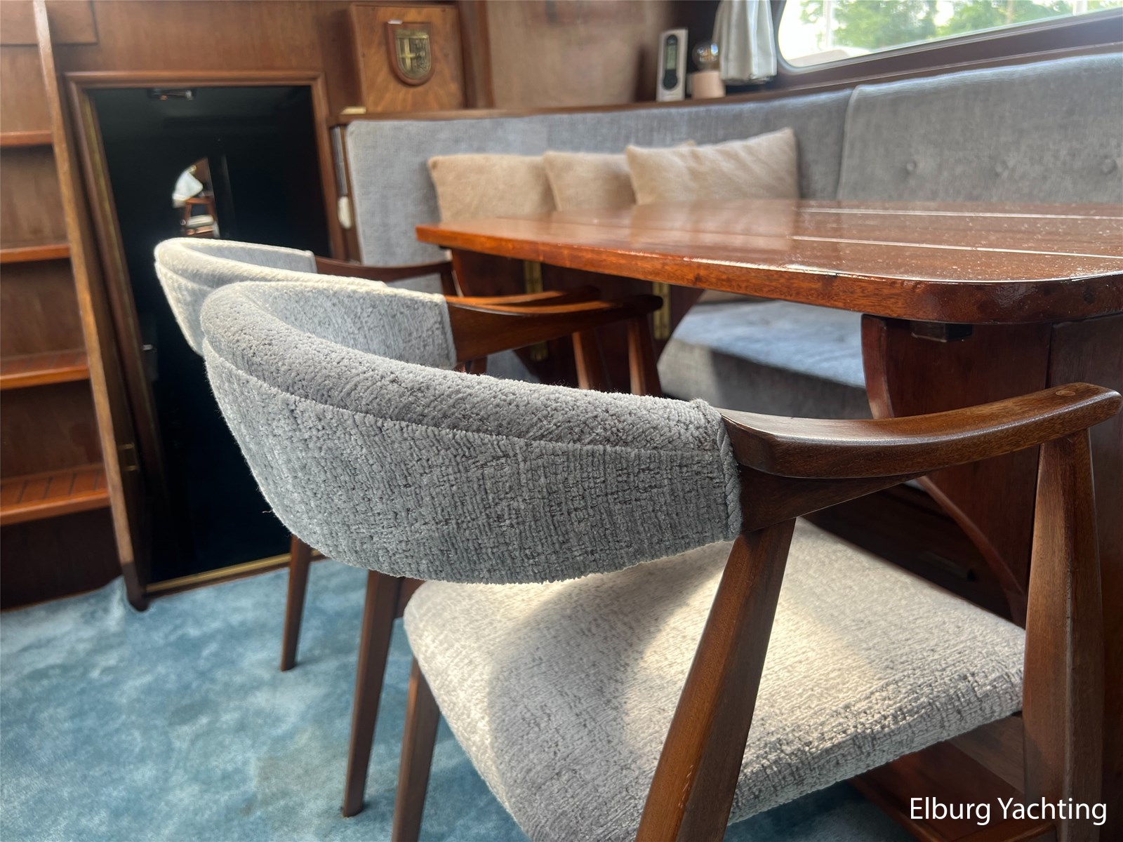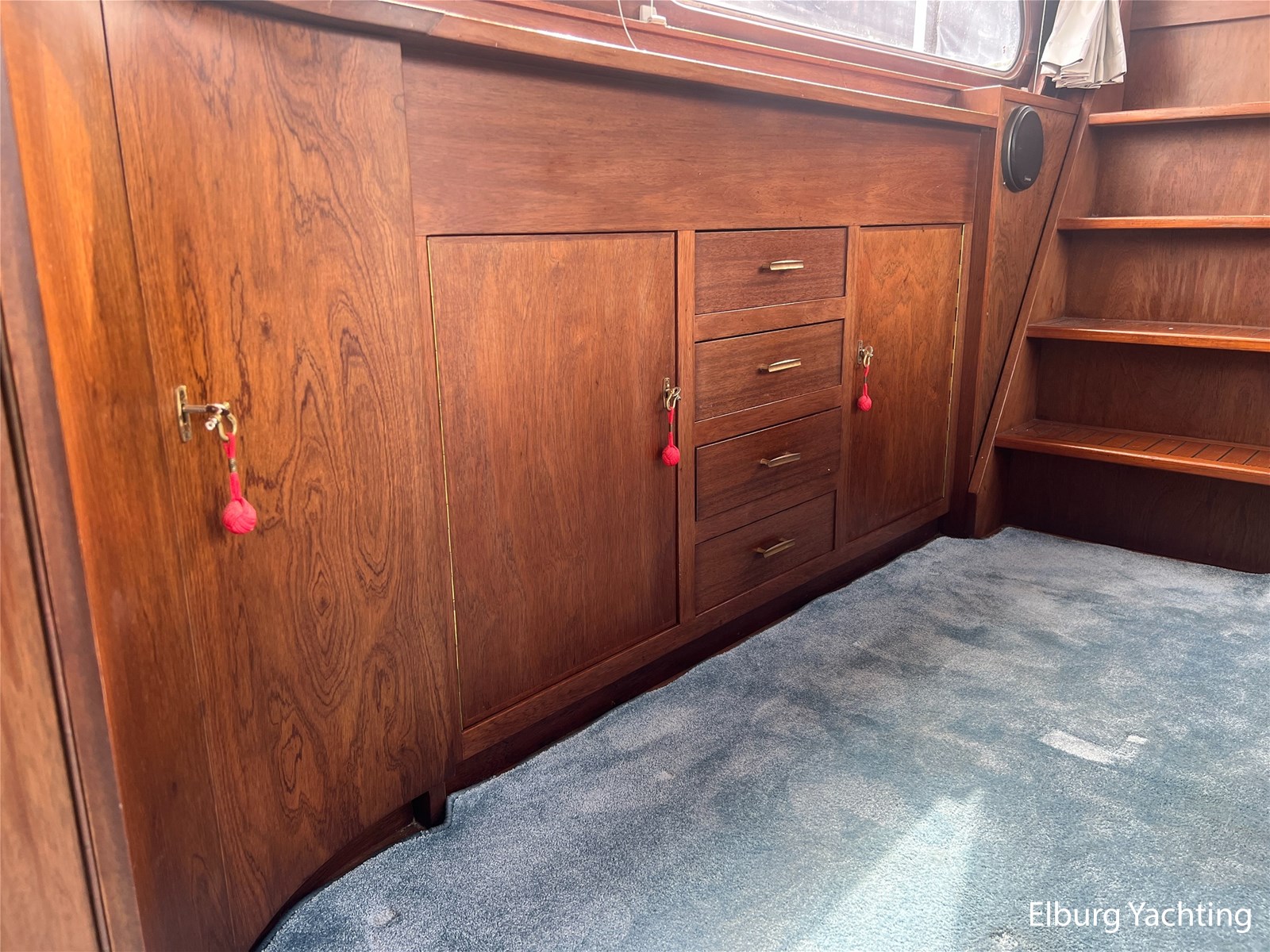 This beautiful Super van Craft 13.80 with her beautiful classic line is an elegant appearance on the water. Due to her low crawl height, the ship is suitable for sailing through the French canals. The Super van Craft 13.80 has a spacious L-dinette in the saloon with 2 chairs, sliding hatch in saloon, ship's wooden interior, U-dinette opposite the galley, two beds in the owner's cabin with recently renewed mattresses, electric cooking, guest cabin with a separate toilet, complete with bow and stern thruster, recently renewed upholstery and carpeting, recently renewed tent over the aft deck, complete winter tent for over the superstructure available. For questions and/or to make an appointment, you are welcome 7 days a week at Elburg Yachting.