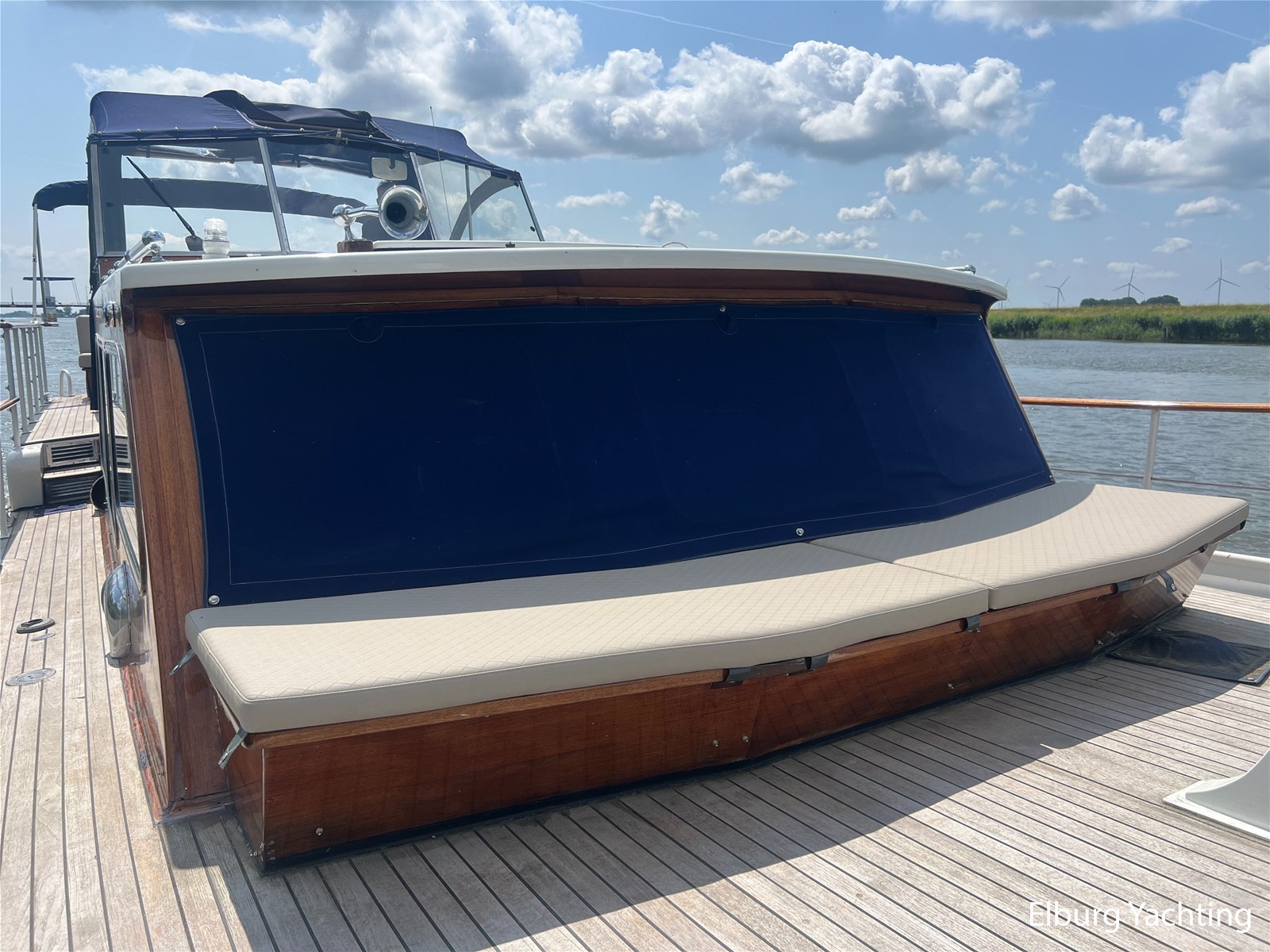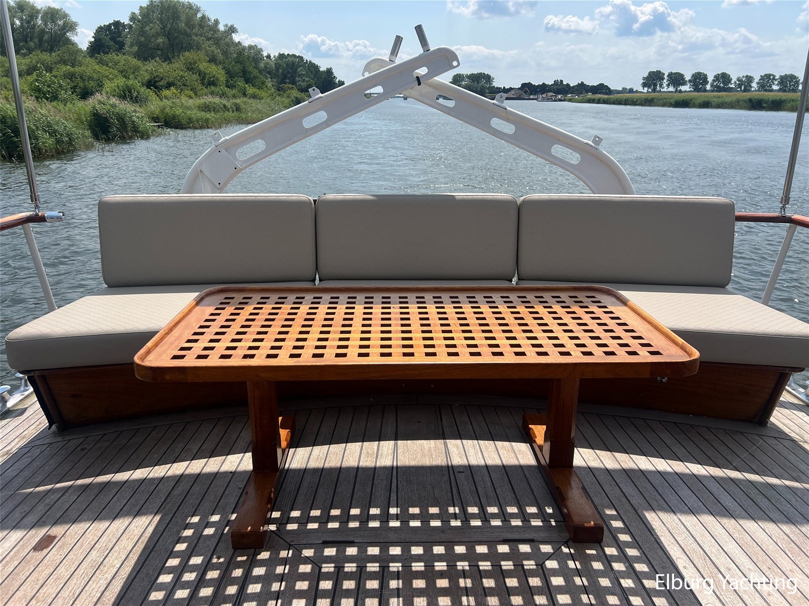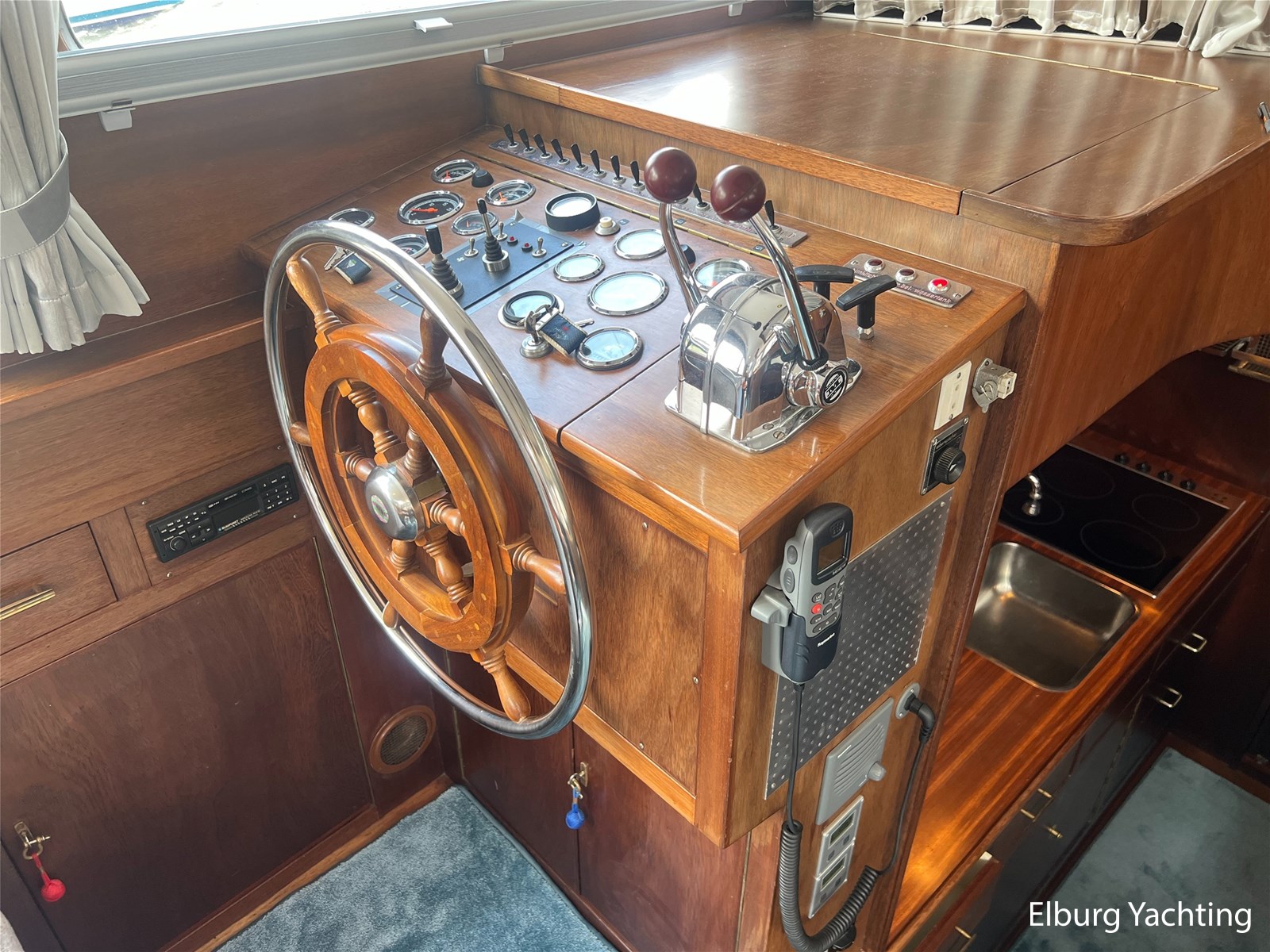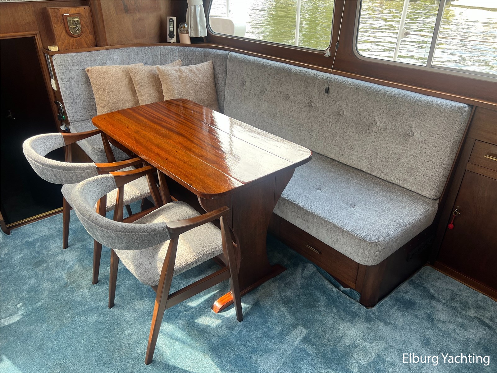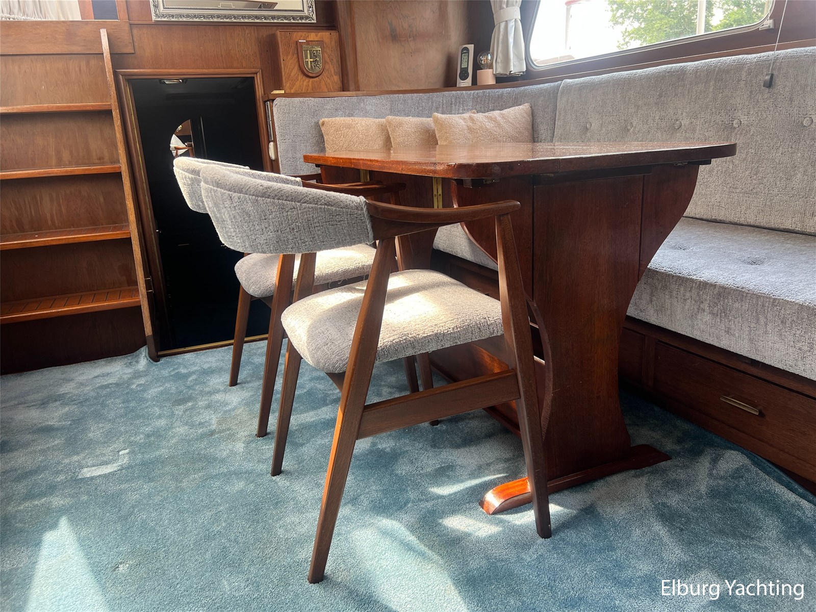 This beautiful Super van Craft 13.80 with her beautiful classic line is an elegant appearance on the water. Due to her low crawl height, the ship is suitable for sailing through the French canals. The Super van Craft 13.80 has a spacious L-dinette in the saloon with 2 chairs, sliding hatch in saloon, ship's wooden interior, U-dinette opposite the galley, two beds in the owner's cabin with recently renewed mattresses, electric cooking, guest cabin with a separate toilet, complete with bow and stern thruster, recently renewed upholstery and carpeting, recently renewed tent over the aft deck, complete winter tent for over the superstructure available. For questions and/or to make an appointment, you are welcome 7 days a week at Elburg Yachting.