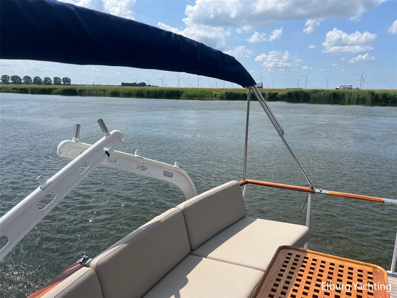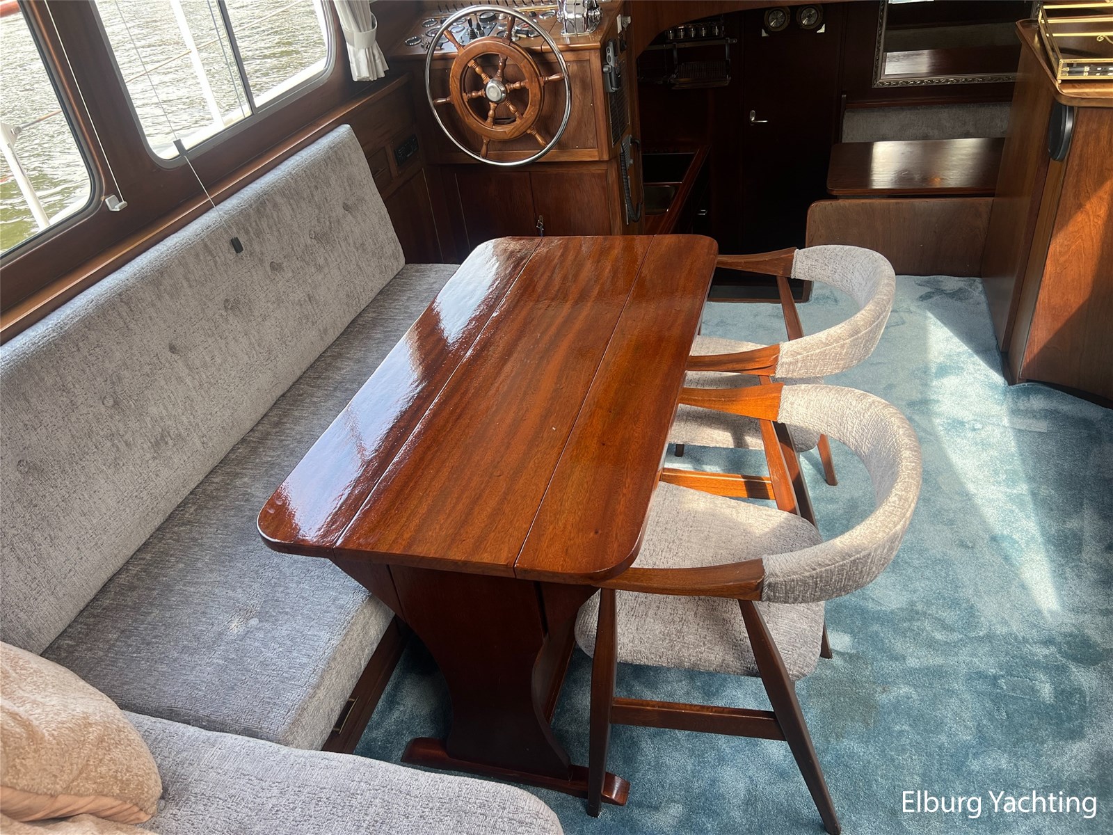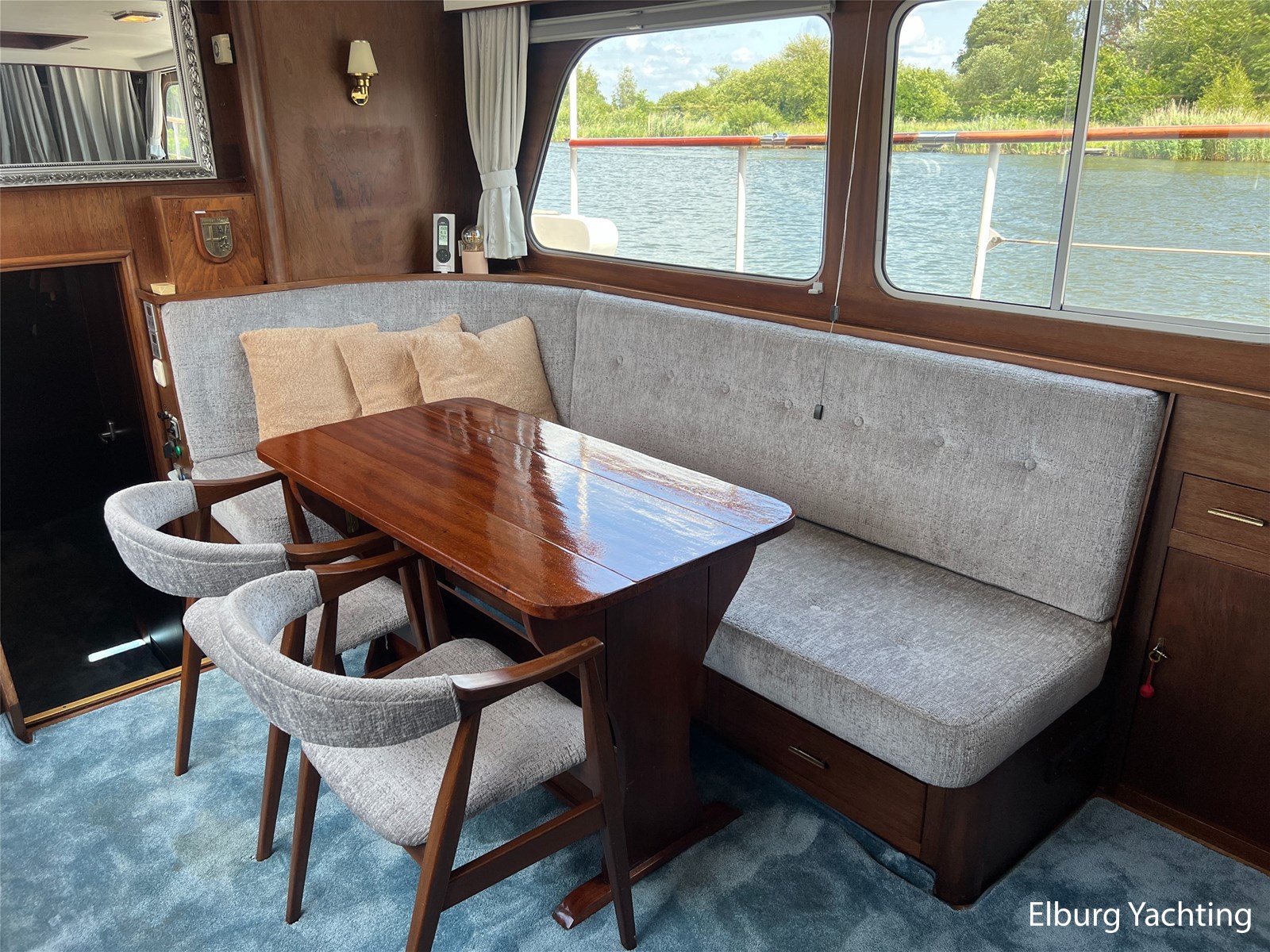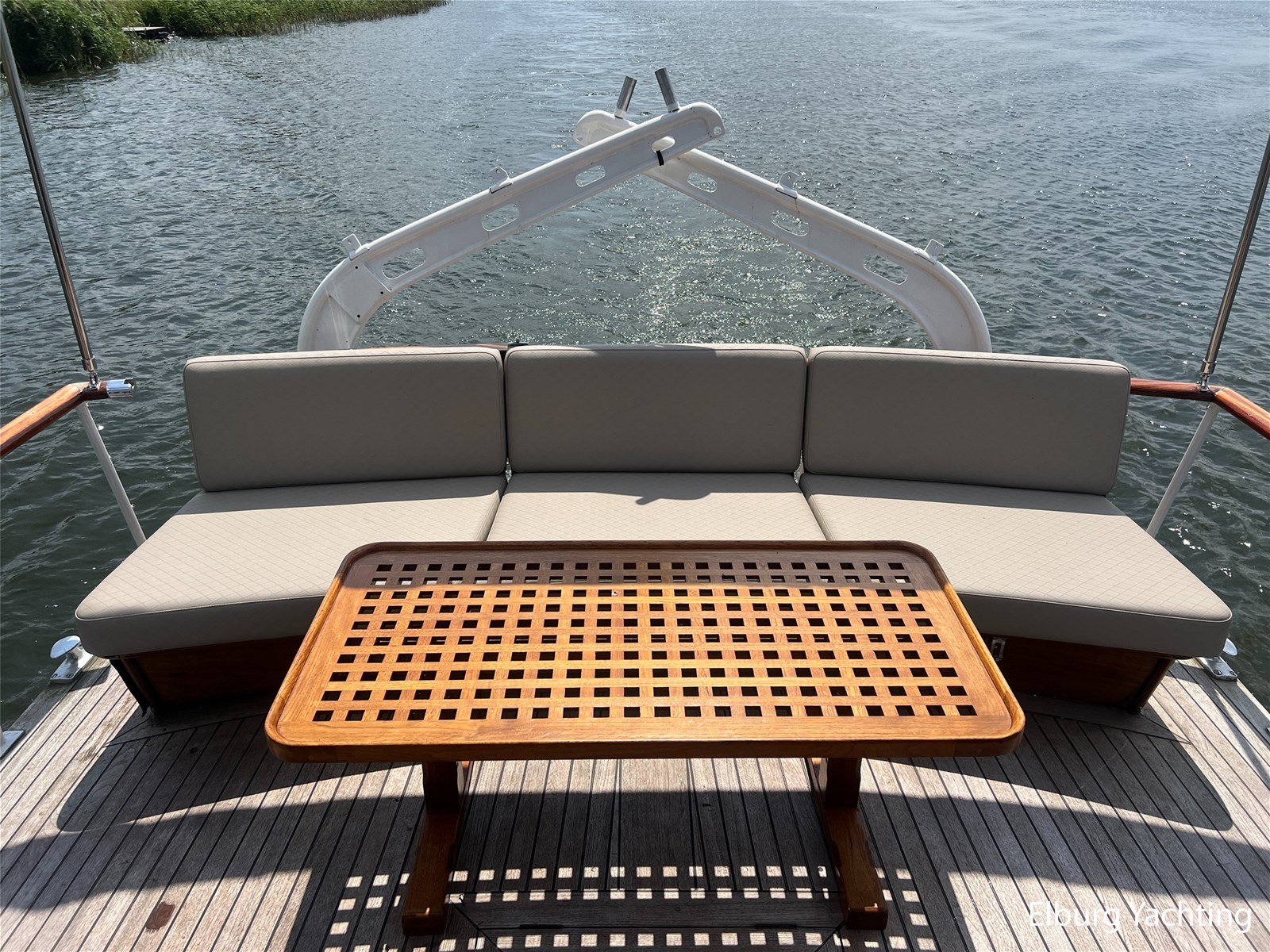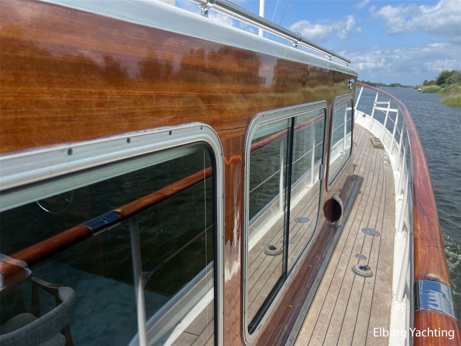This beautiful Super van Craft 13.80 with her beautiful classic line is an elegant appearance on the water. Due to her low crawl height, the ship is suitable for sailing through the French canals. The Super van Craft 13.80 has a spacious L-dinette in the saloon with 2 chairs, sliding hatch in saloon, ship's wooden interior, U-dinette opposite the galley, two beds in the owner's cabin with recently renewed mattresses, electric cooking, guest cabin with a separate toilet, complete with bow and stern thruster, recently renewed upholstery and carpeting, recently renewed tent over the aft deck, complete winter tent for over the superstructure available. For questions and/or to make an appointment, you are welcome 7 days a week at Elburg Yachting.