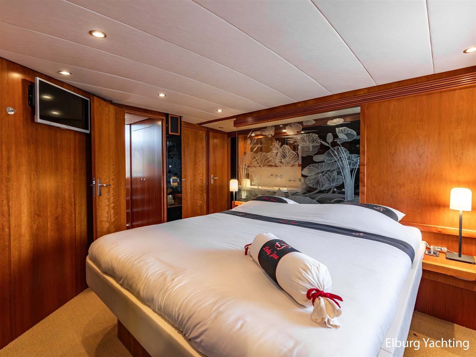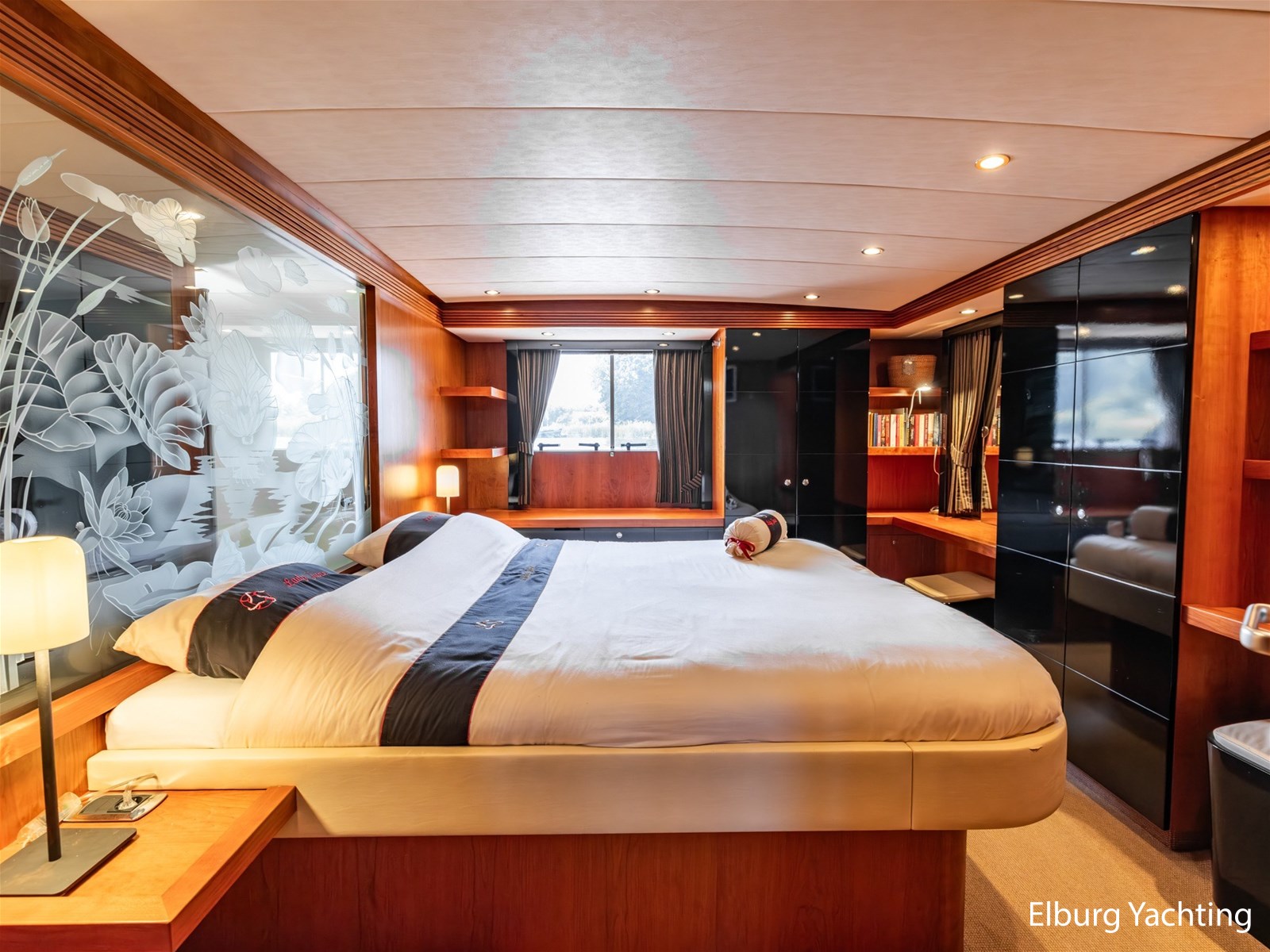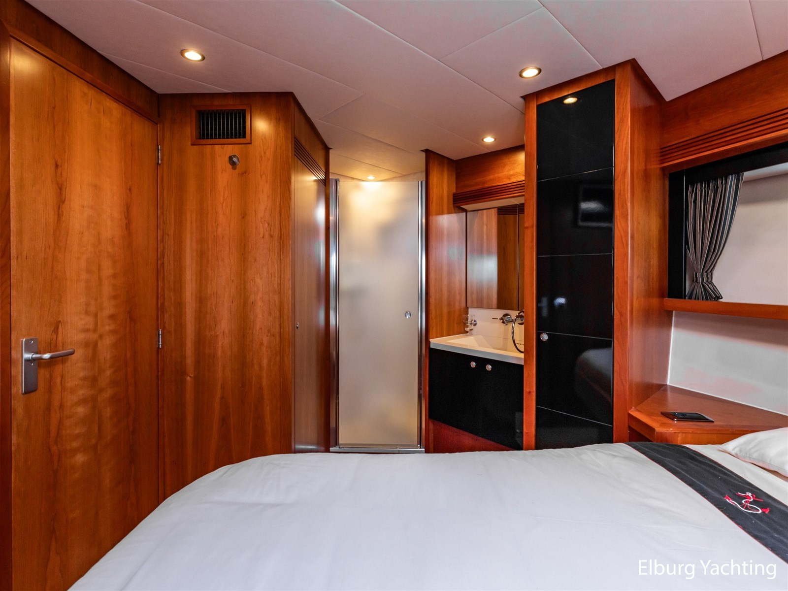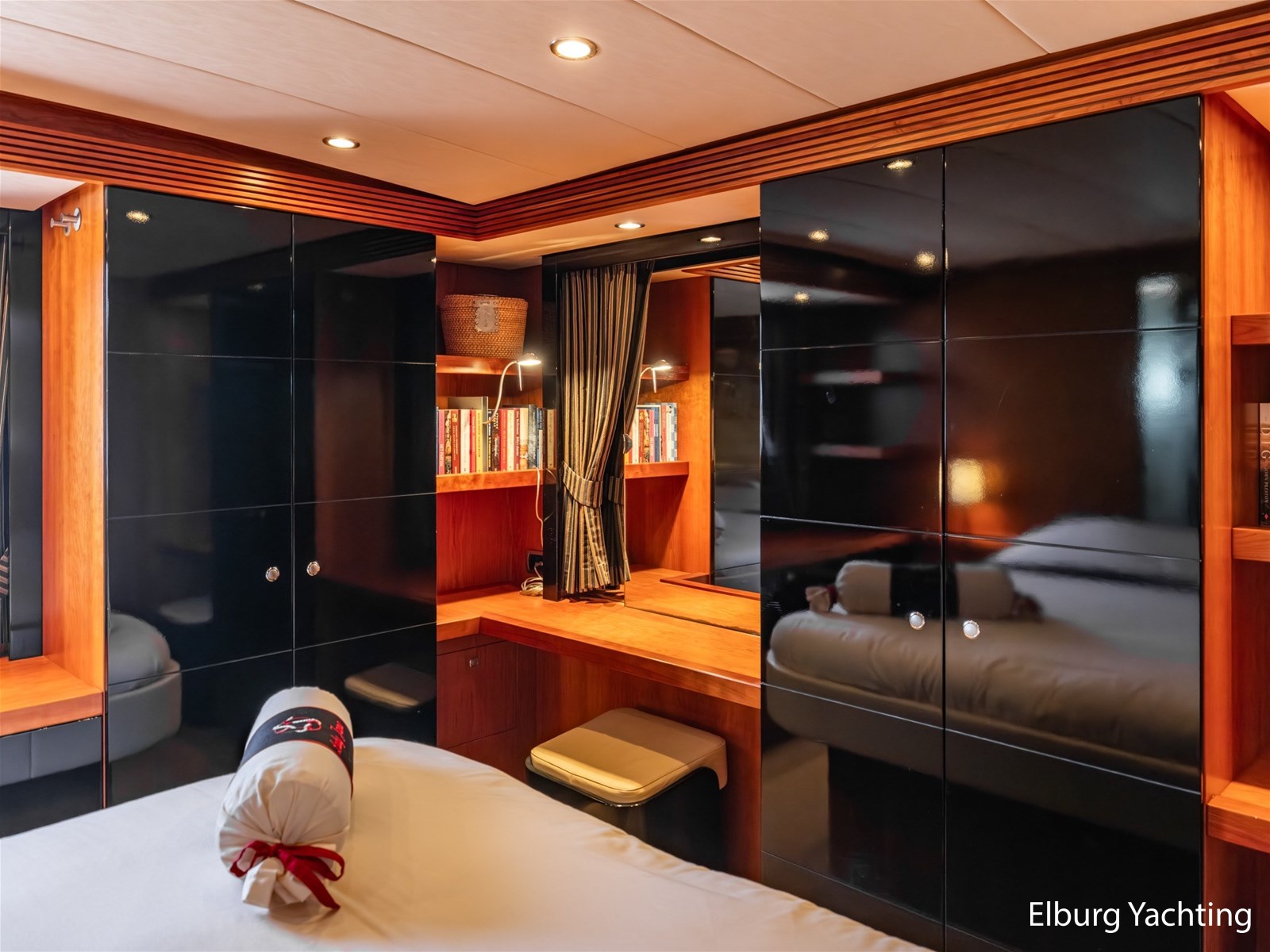 The owner's cabin aft is particularly spacious and spans the full beam of the yacht. This luxurious master cabin offers a freestanding double bed, en-suite bathroom, generous closet space, and an elegant finish.