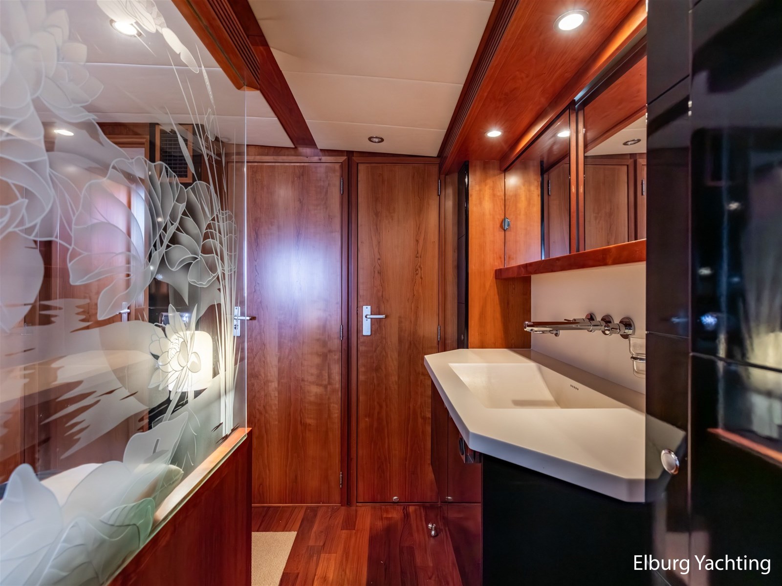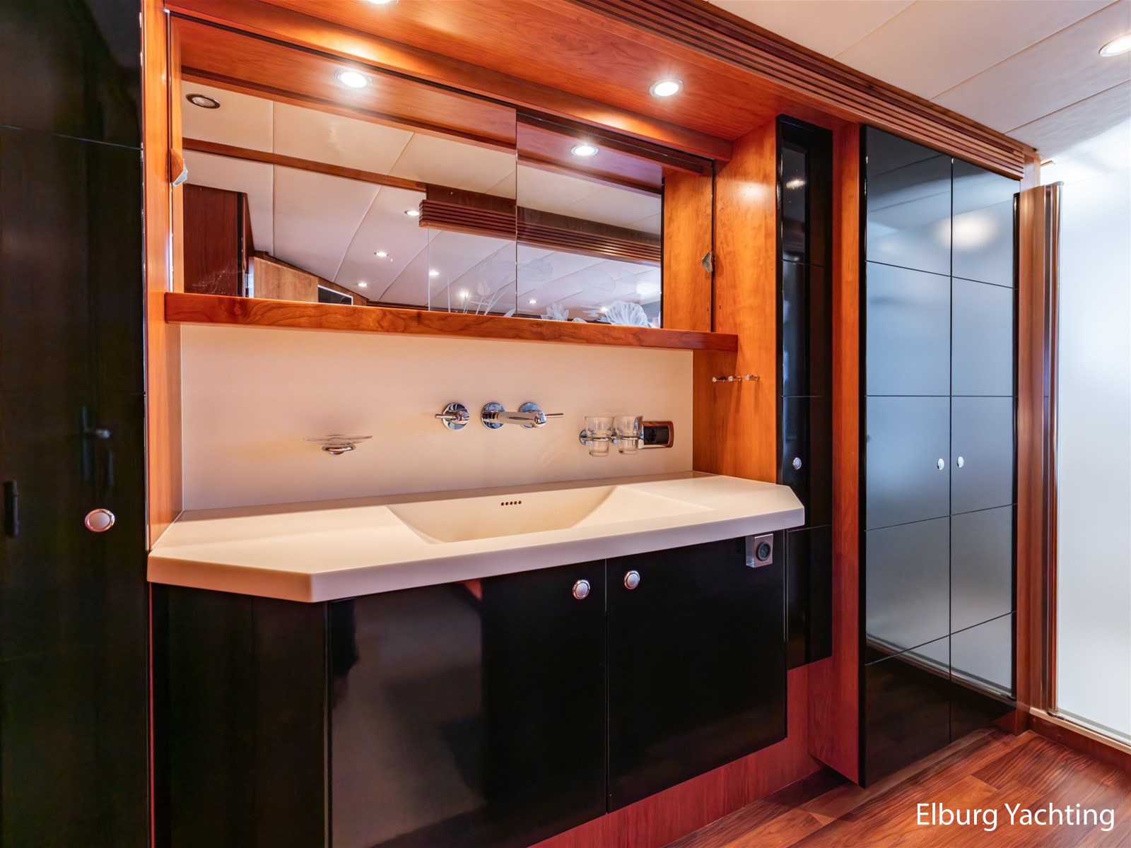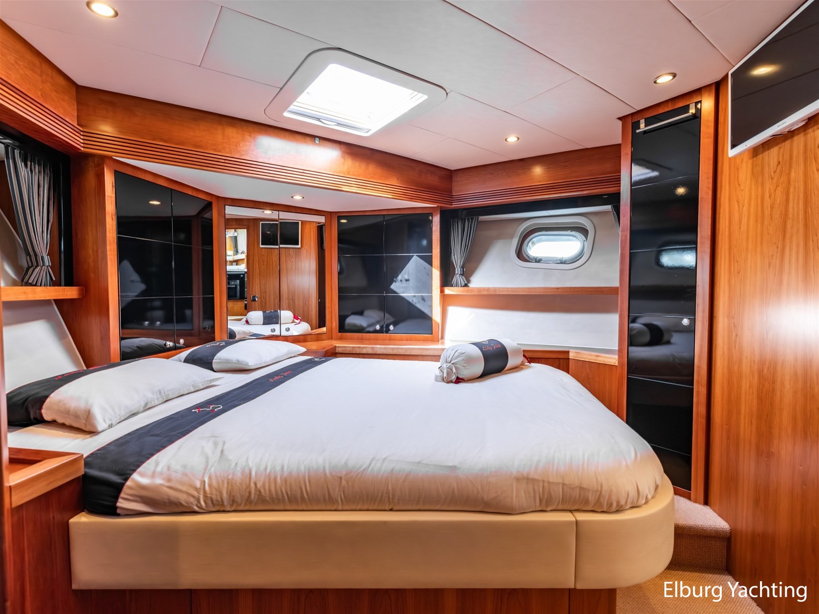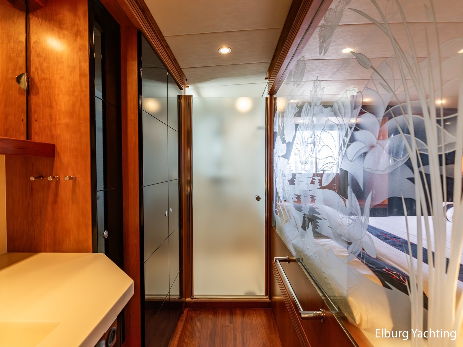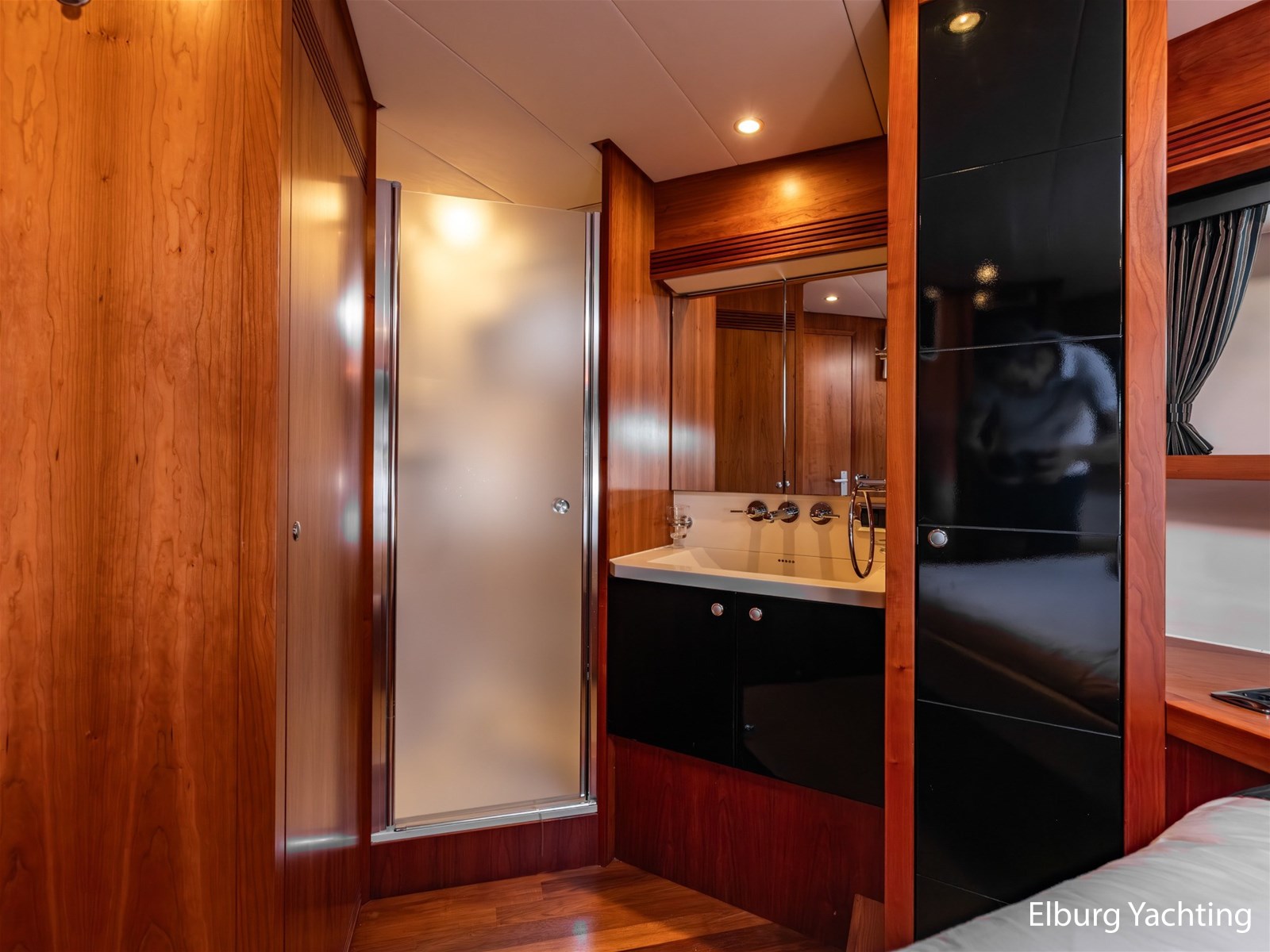 The owner's cabin aft is particularly spacious and spans the full beam of the yacht. This luxurious master cabin offers a freestanding double bed, en-suite bathroom, generous closet space, and an elegant finish.