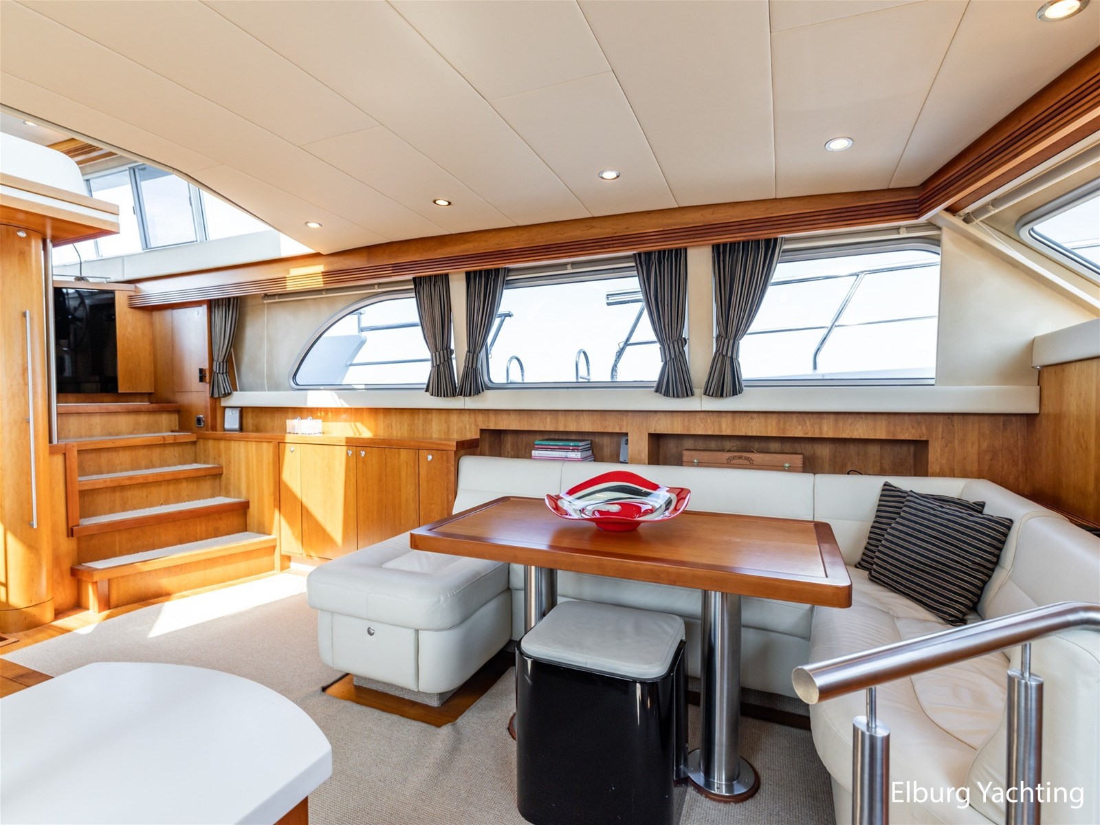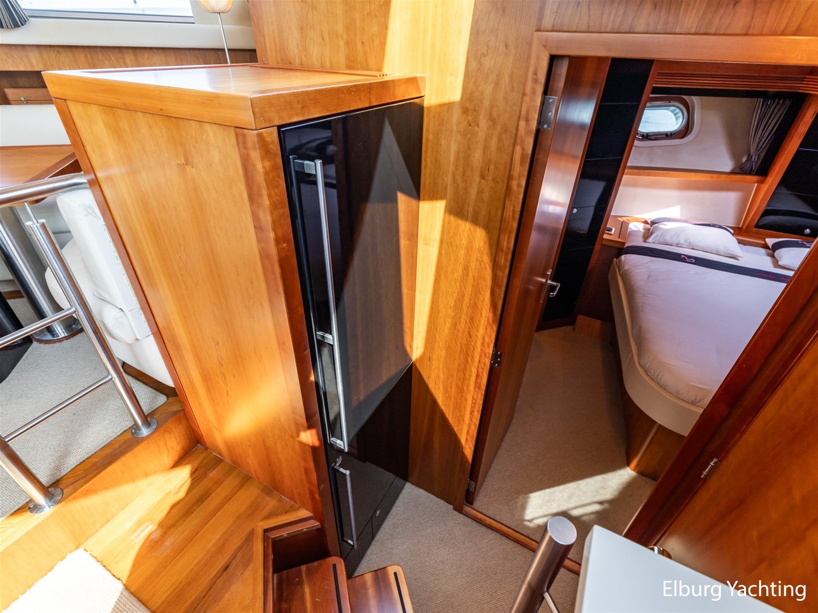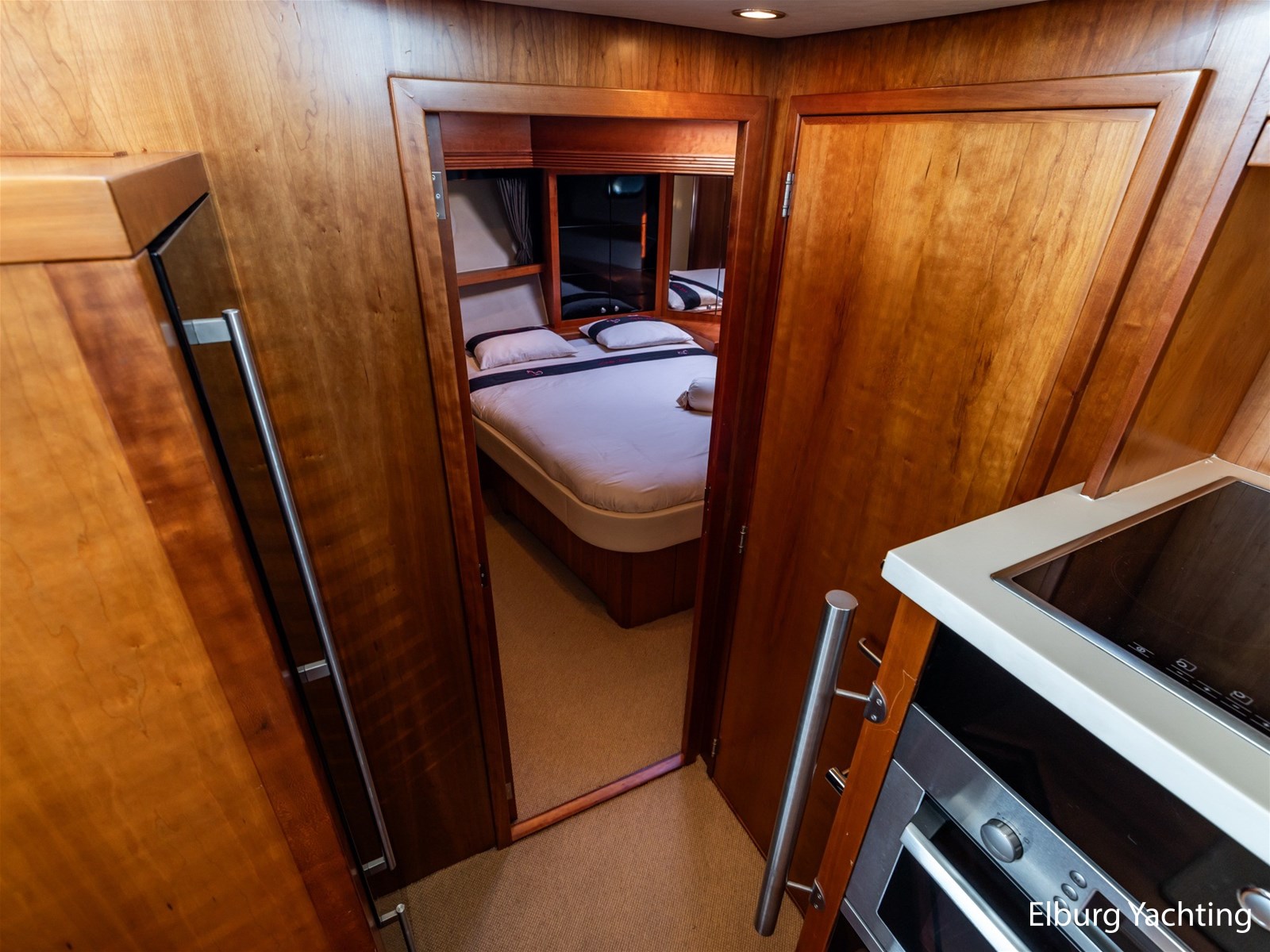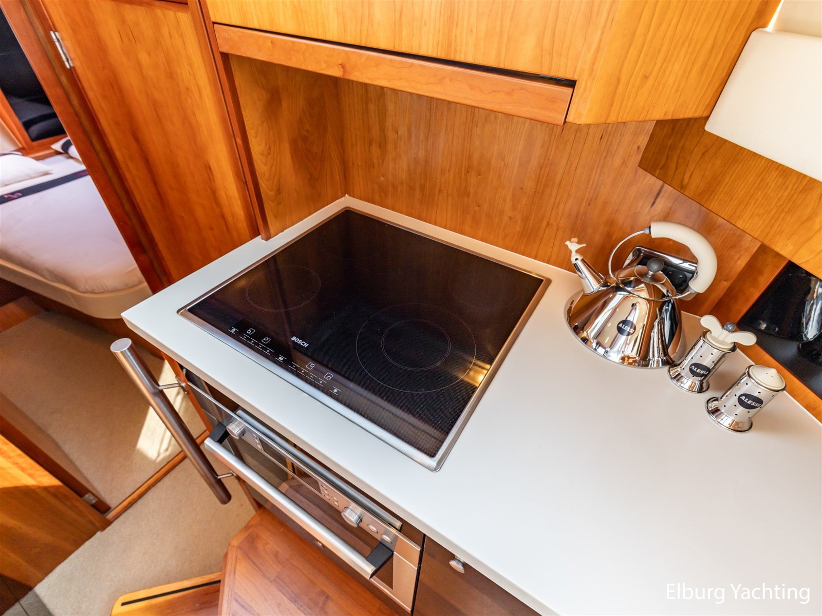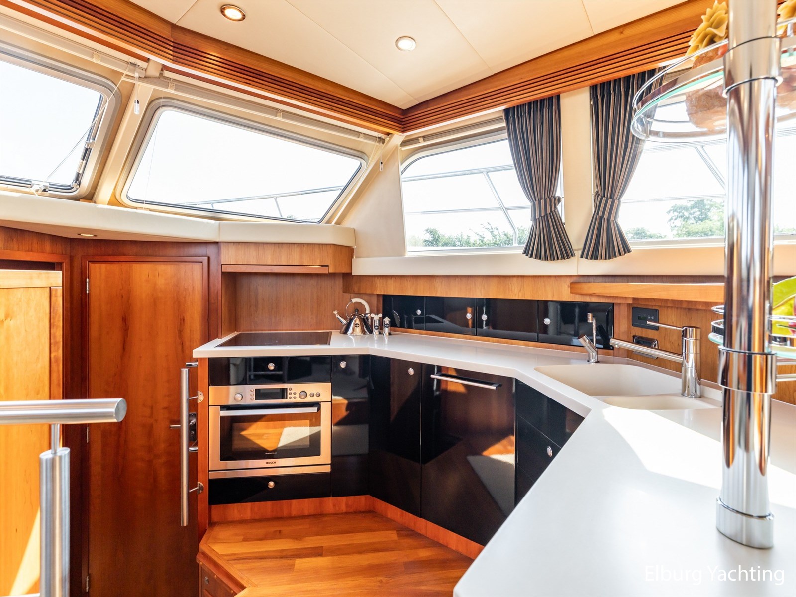 From the wheelhouse, a small level change leads to the spacious salon, finished in teak wood with cream-white leather upholstery and generous natural light from the large windows. Just a few steps down from the salon, you’ll find the fully equipped galley, featuring a Corian countertop, ceramic cooktop, extractor hood, Bosch oven, combination microwave, and double refrigerator. Everything is in place for full onboard living and cooking.