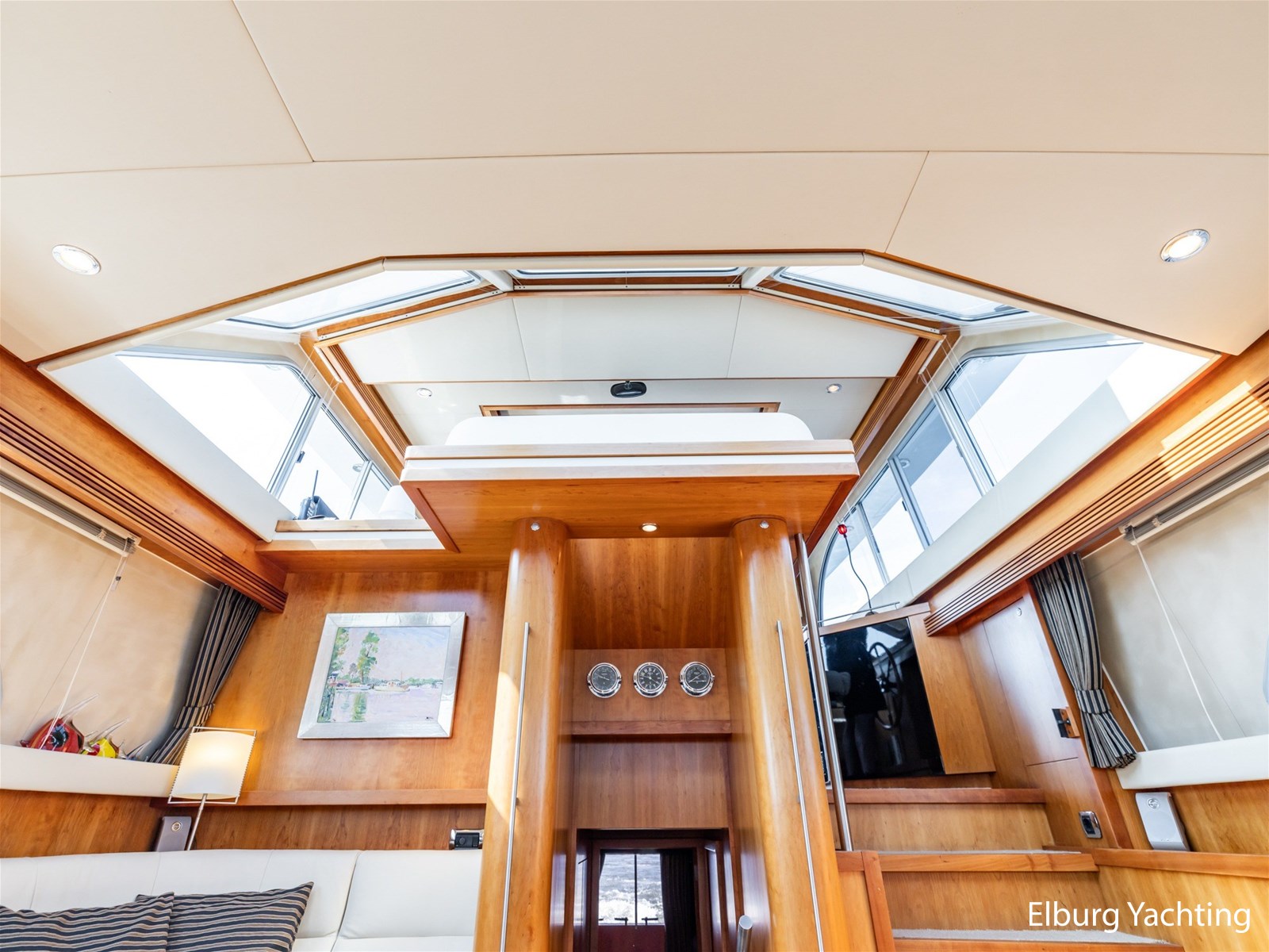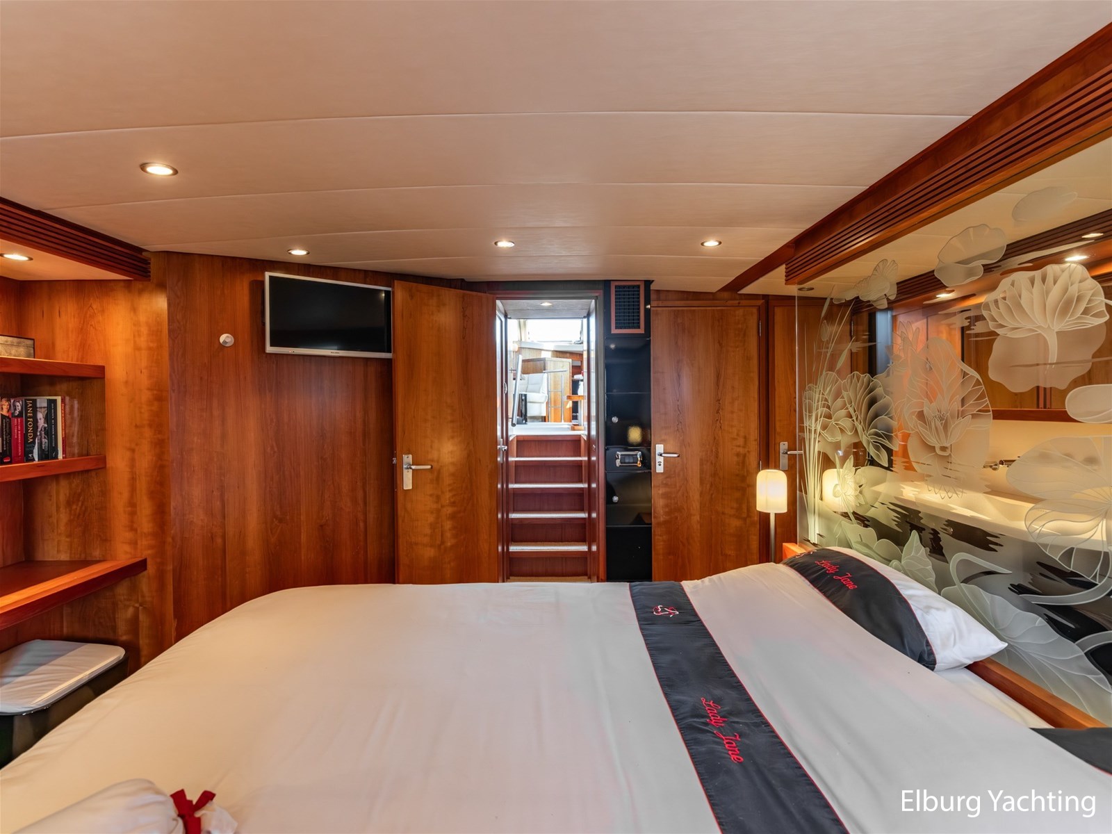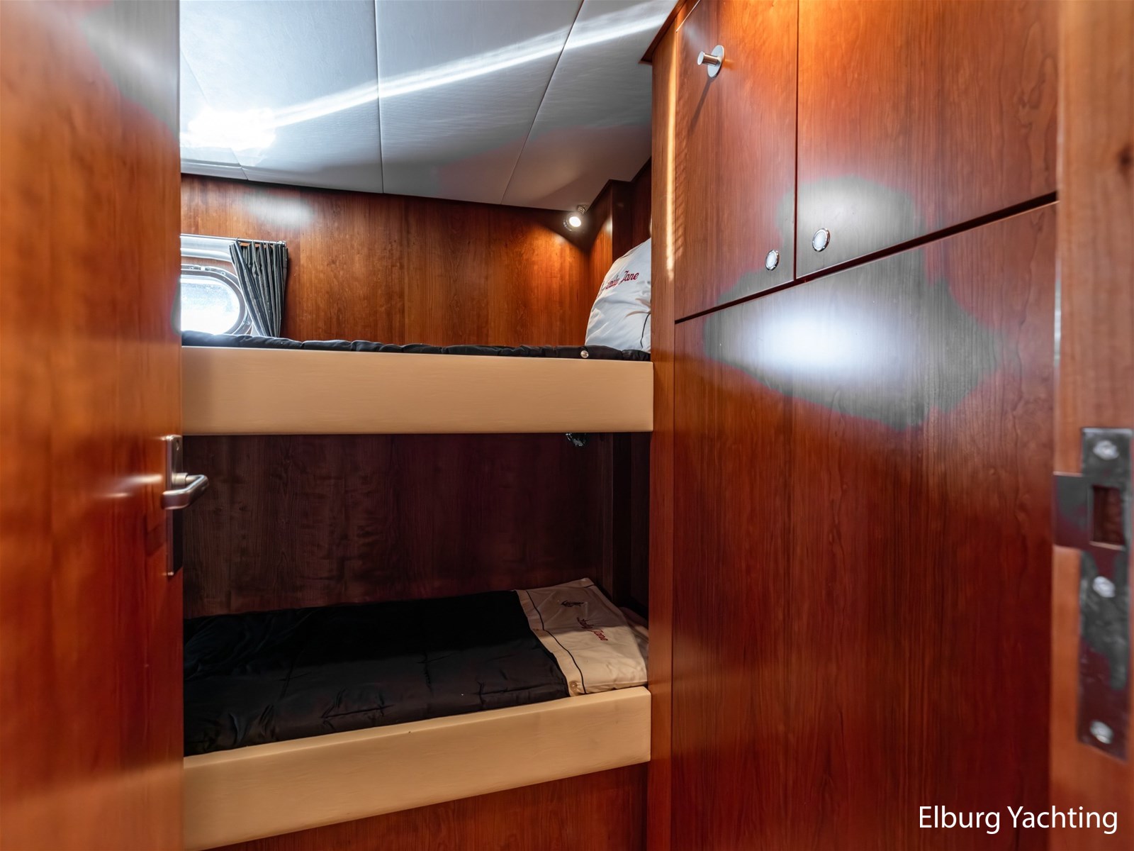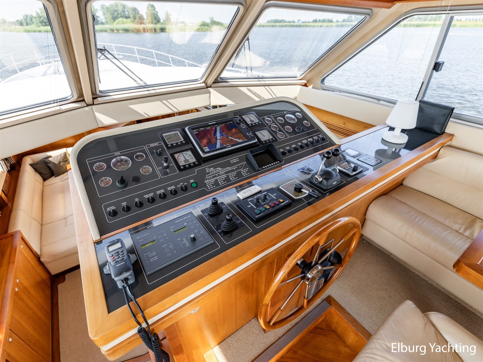 The wheelhouse is fully equipped, including autopilot, radar, chartplotter, camera system, electric searchlight, bow and stern thrusters with remote control, interval wipers, VHF radio, and other accessories. Everything is in place for both relaxed and safe cruising, regardless of the sailing area.