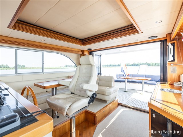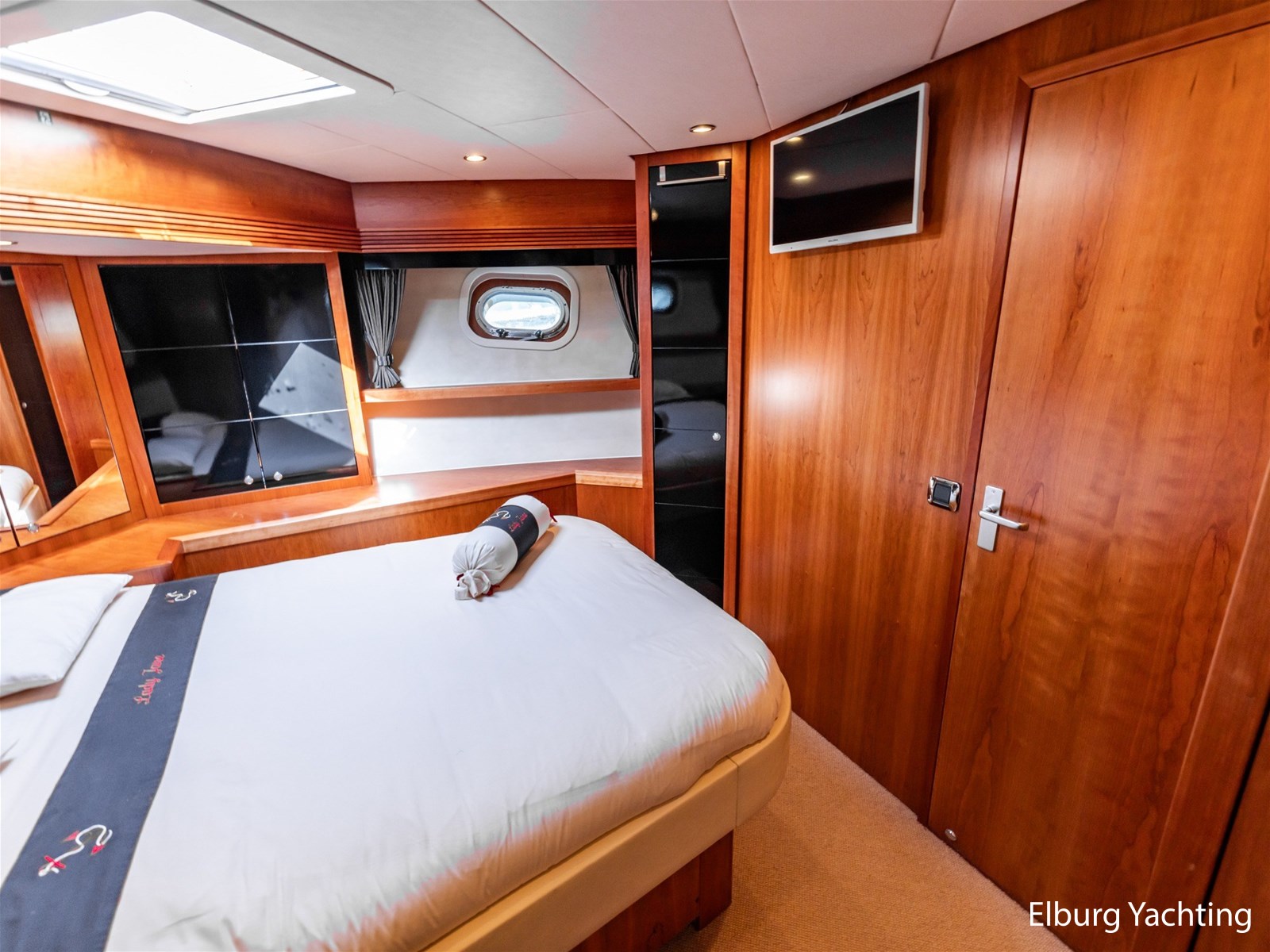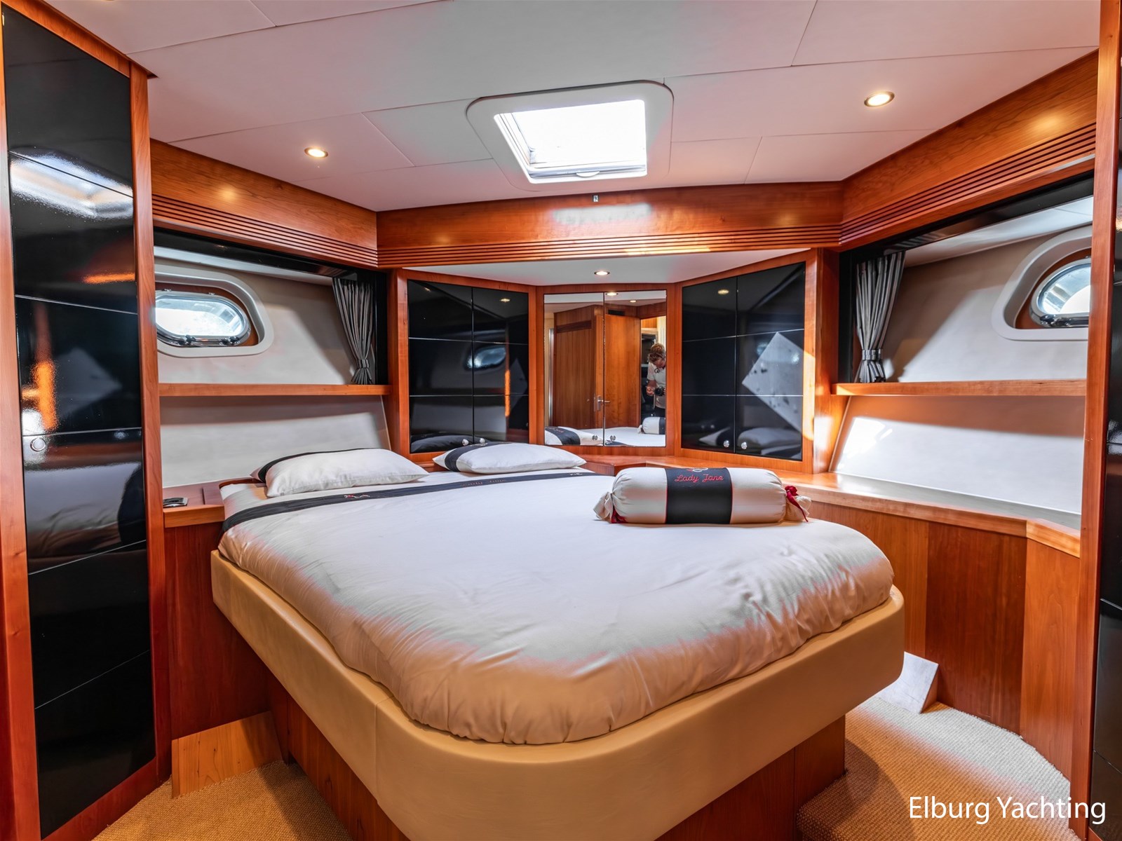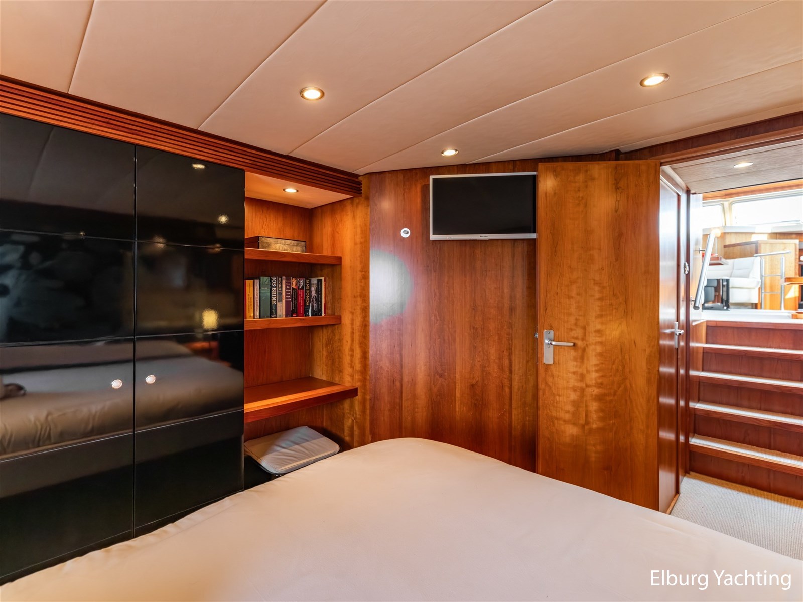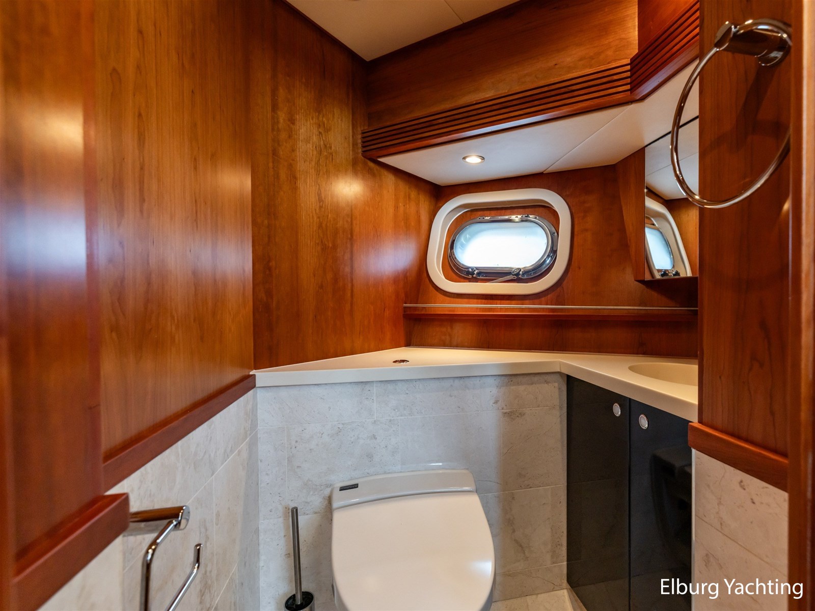 The wheelhouse is fully equipped, including autopilot, radar, chartplotter, camera system, electric searchlight, bow and stern thrusters with remote control, interval wipers, VHF radio, and other accessories. Everything is in place for both relaxed and safe cruising, regardless of the sailing area.