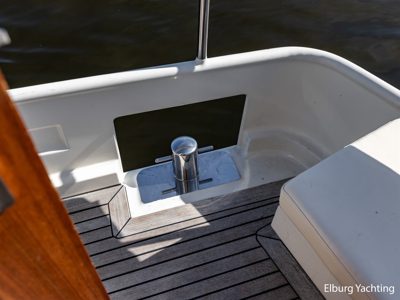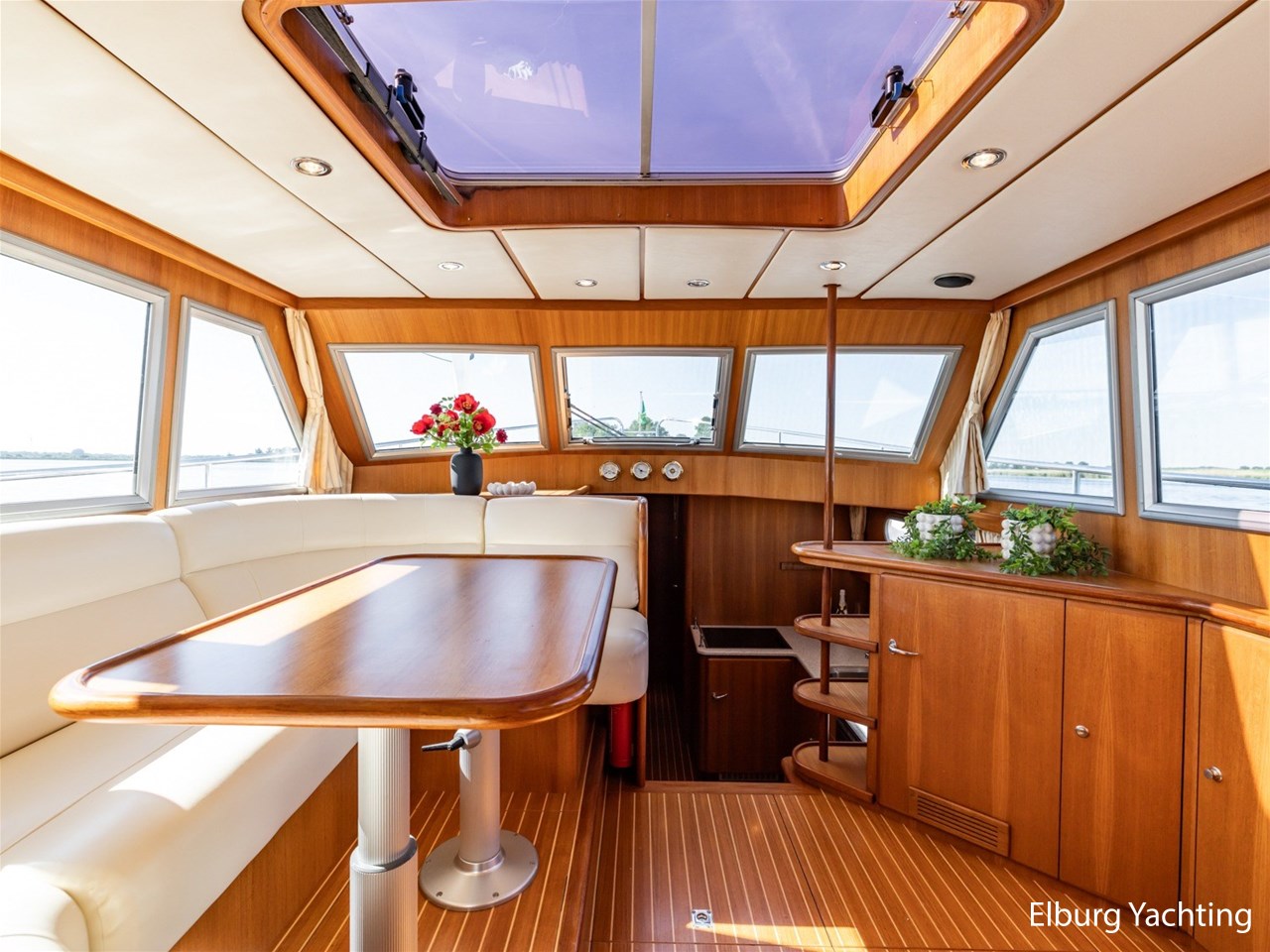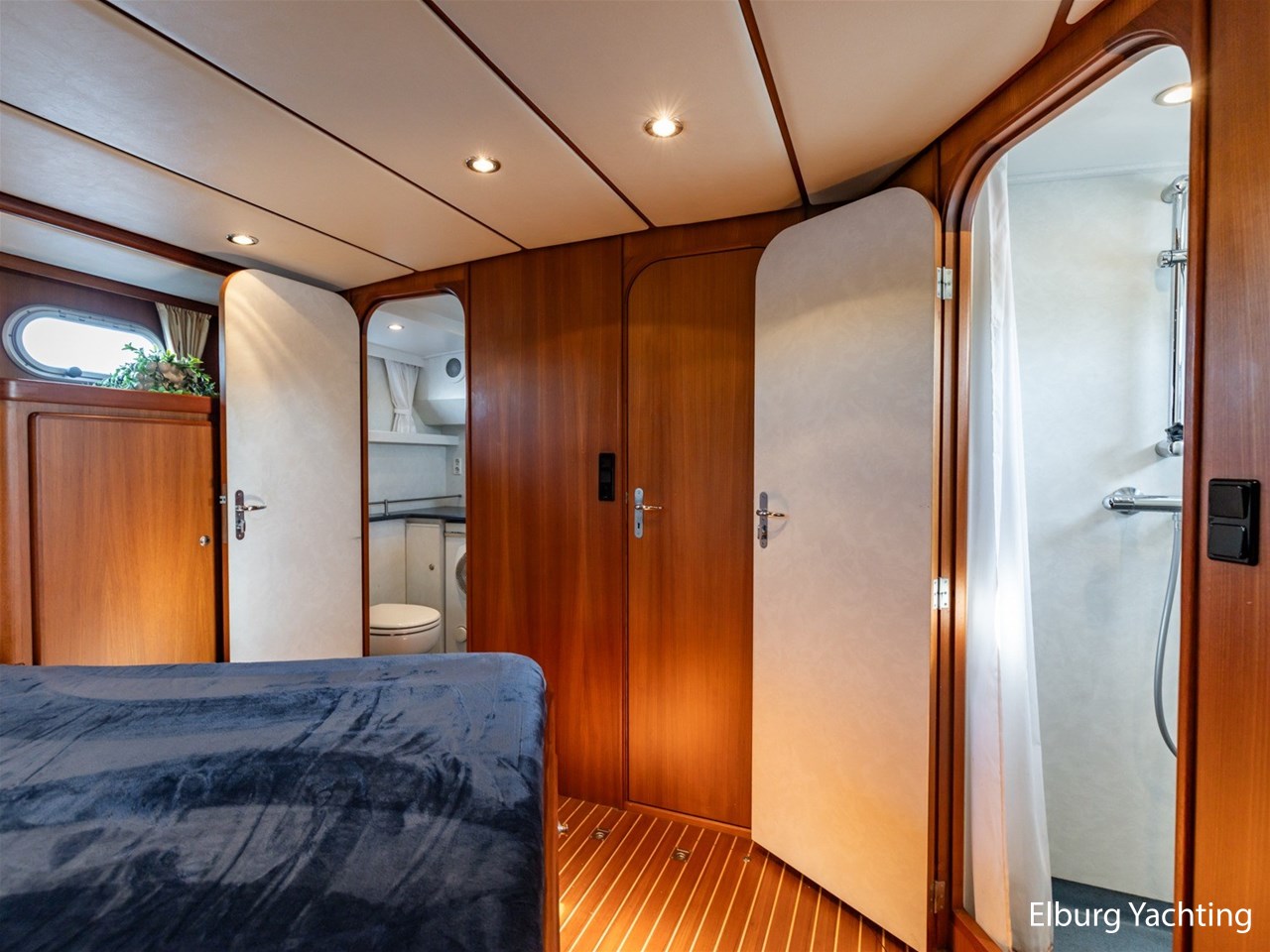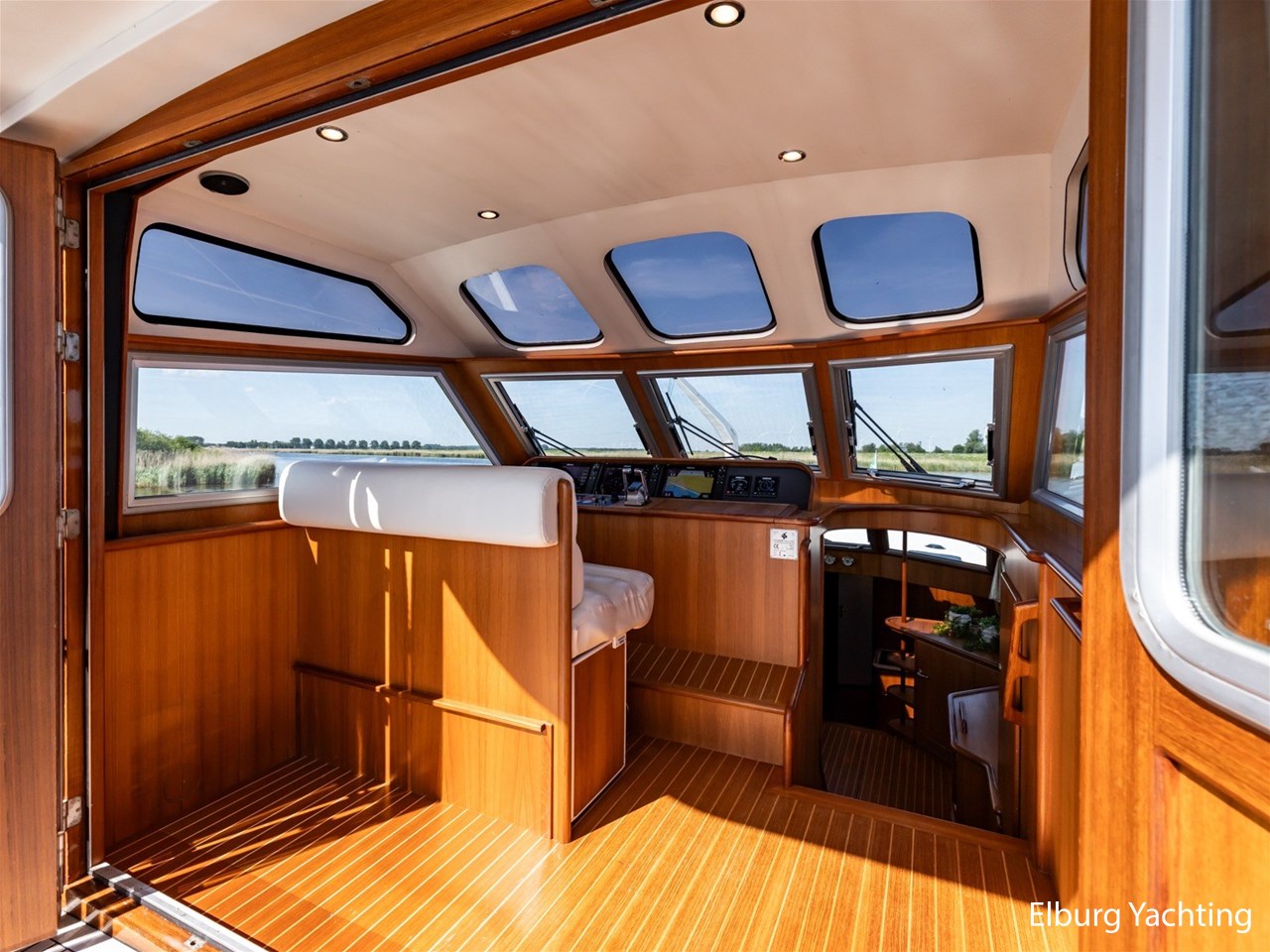 This beautiful Sturiër 480 AC - Fixed Wheelhouse - Stabilisers is offered by a true lover of the brand with an eye for detail. Originally, this yacht was called the Sturiër Trawler 480 AC. The solid Teak panelling combined with the white artificial leather upholstery gives this yacht a classic yet modern look. The yacht is equipped with 2 spacious cabins, the forward cabin is fitted with 4 single beds in V-shape and the aft cabin is fitted with a diagonally placed spacious double bed. The yacht is equipped with two wet rooms and to port side an office area with desk.