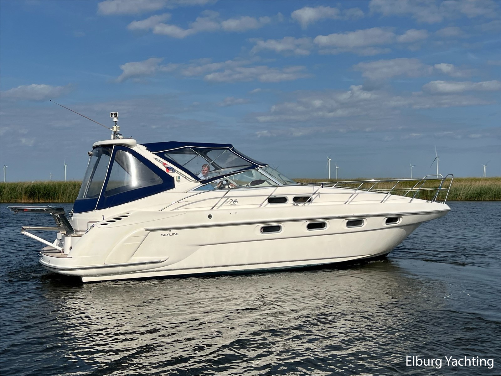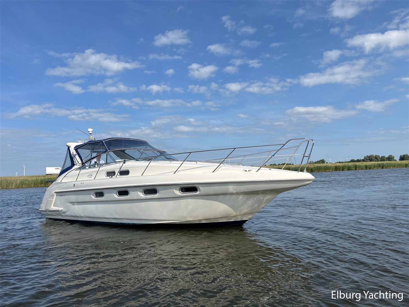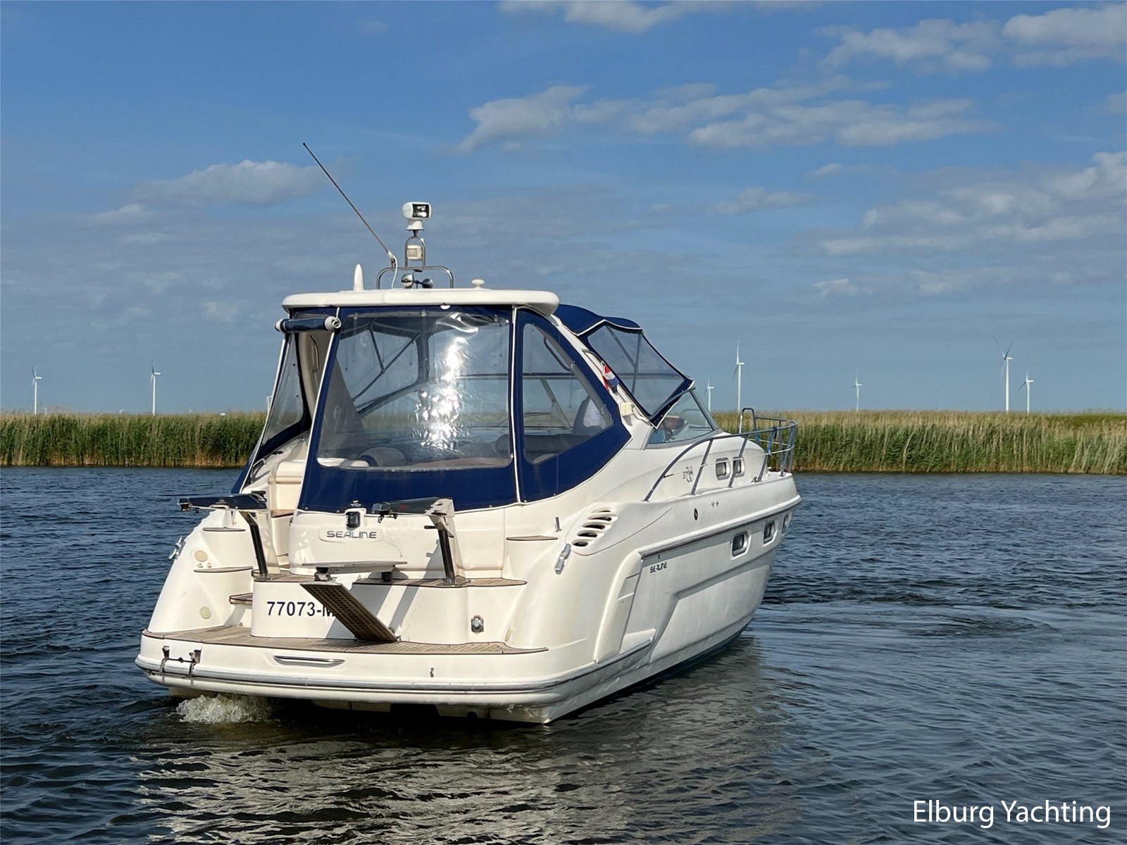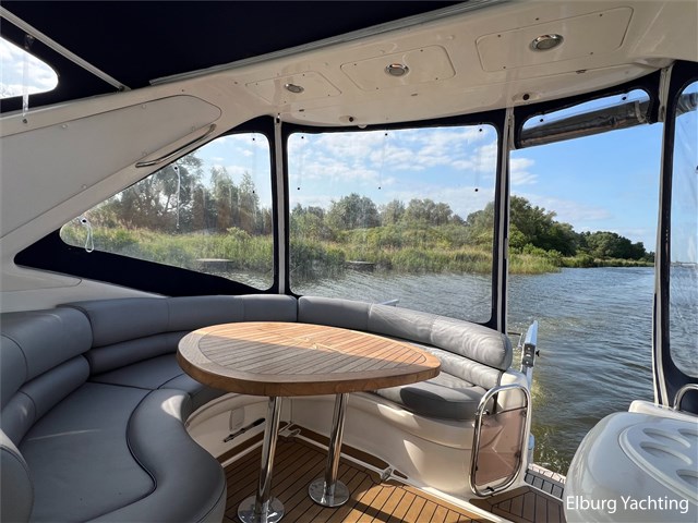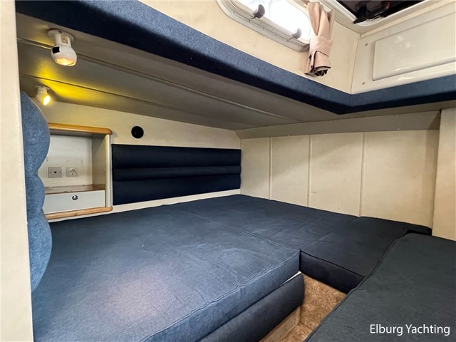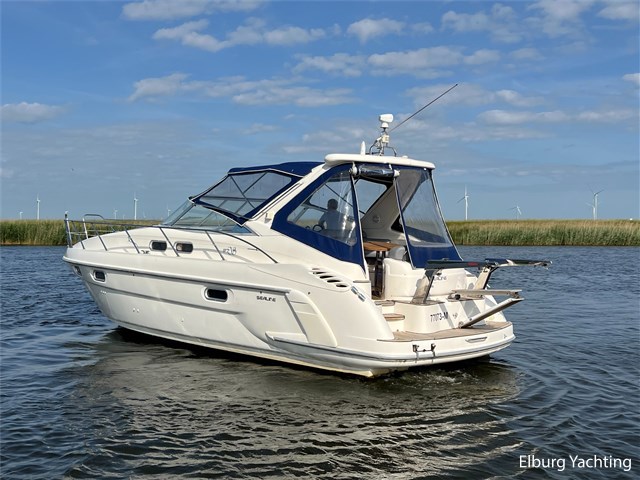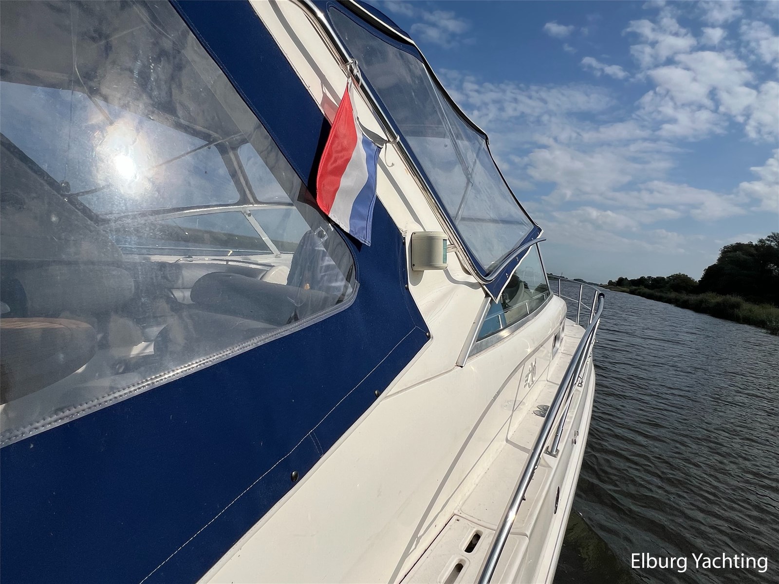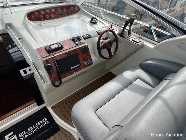 This 1996 Sealine S37 is a fast going motoryacht with a spacious living area on deck level and a comfortable saloon below deck. In the open cockpit there is a U-shaped fixed bench with removable cushions. The cockpit table can be lowered to create a large sunbed. Opposite there is an outdoor refrigerator with sink (hot/cold). The steering position has a 2-person pilot seat from where you have a clear view on the instruments. The entire cockpit is equipped with a low-maintenance synthetic teak deck. The ship has a two-cabin layout with the owner's cabin in the foreship equipped with a 2-person French bed and the 2-person guest cabin amidships. In recent years, much has been invested in the ship in service and improvements on board. The latest renovations were carried out in 2023, including a new teak floor in the saloon, upholstery inside + outside, multiple 230V sockets type F, carpeting and curtains, cockpit tent, maintenance on both engines and Z-drives. This Sealine S37 is furthermore equipped with: Lighting in open cockpit, many stainless steel details on deck, pilot seat for 2 persons, full tent around open cockpit with removable parts, leather upholstery in cockpit, sunbed on the foredeck, wetbar in cockpit with refrigerator and sink, integrated cup holders, foldable table at the outdoor seating area so that it can be converted into a sunbed, TV in saloon (2023), Sony radio (2023), foldable/removable gangway on the bathing platform. For questions and/or to make an appointment, you are welcome at Elburg Yachting 7 days a week.