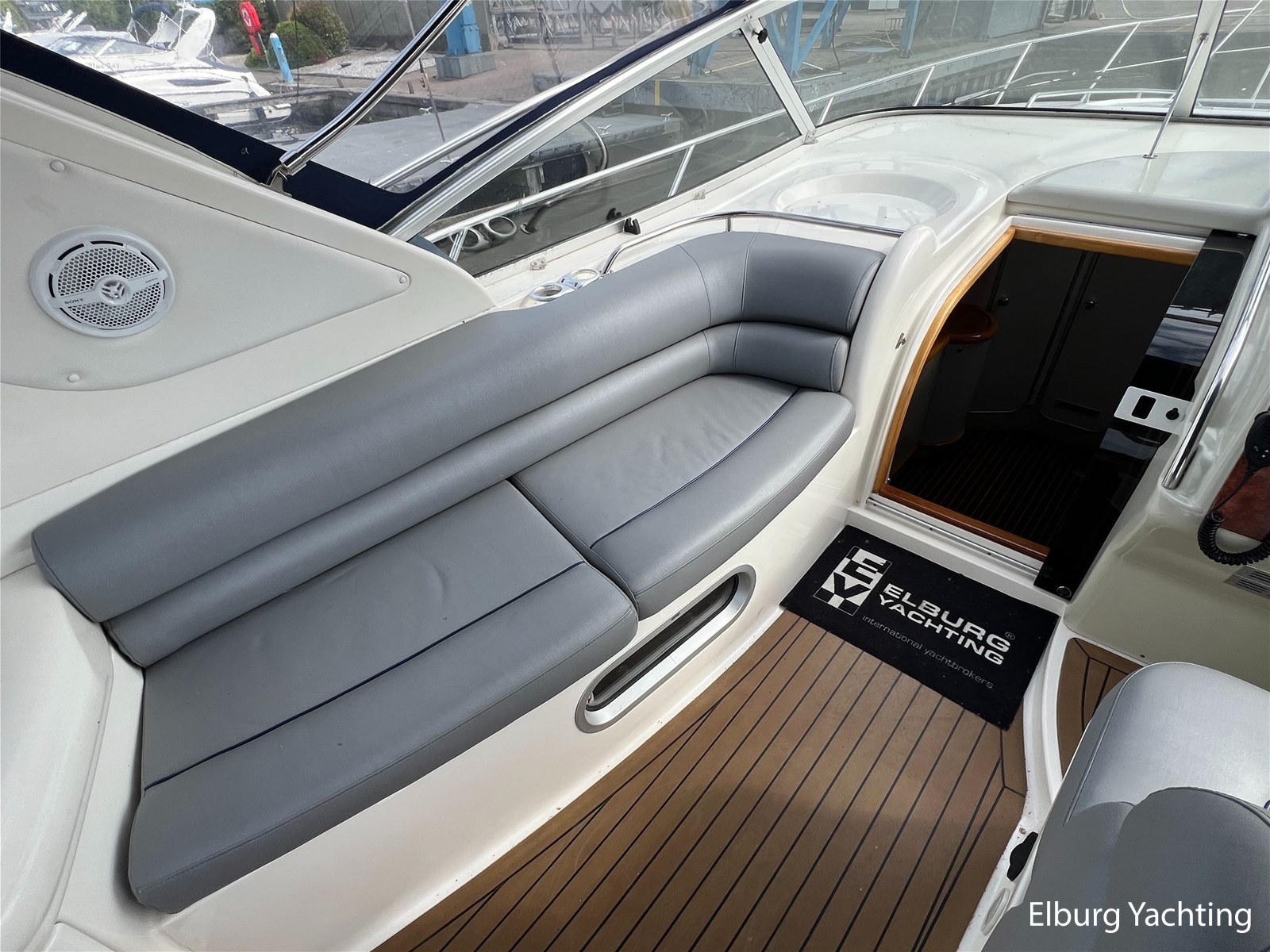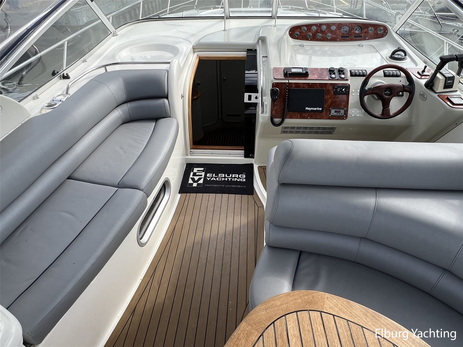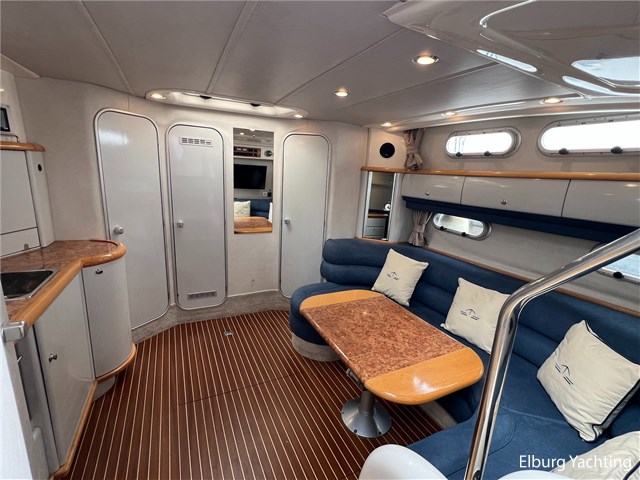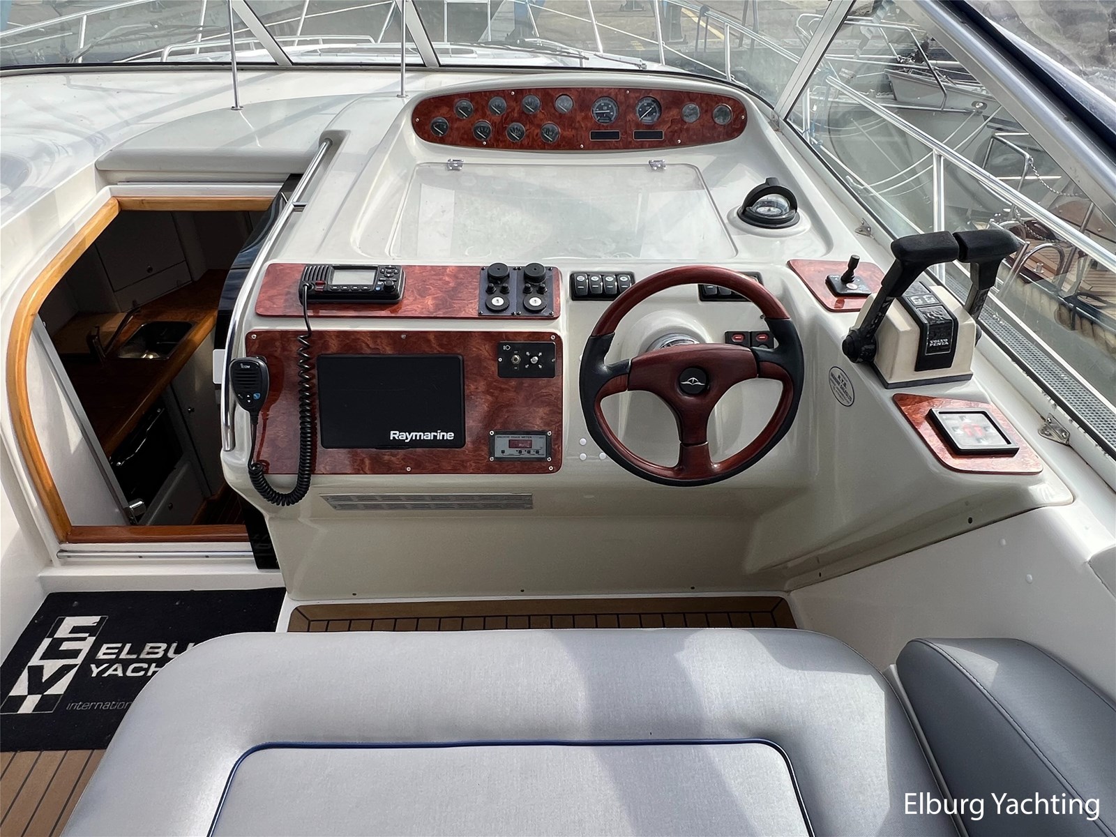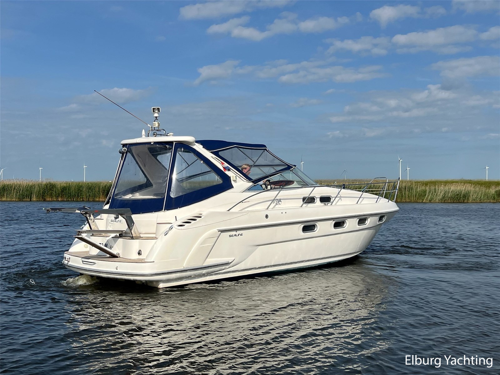This 1996 Sealine S37 is a fast going motoryacht with a spacious living area on deck level and a comfortable saloon below deck. In the open cockpit there is a U-shaped fixed bench with removable cushions. The cockpit table can be lowered to create a large sunbed. Opposite there is an outdoor refrigerator with sink (hot/cold). The steering position has a 2-person pilot seat from where you have a clear view on the instruments. The entire cockpit is equipped with a low-maintenance synthetic teak deck. The ship has a two-cabin layout with the owner's cabin in the foreship equipped with a 2-person French bed and the 2-person guest cabin amidships. In recent years, much has been invested in the ship in service and improvements on board. The latest renovations were carried out in 2023, including a new teak floor in the saloon, upholstery inside + outside, multiple 230V sockets type F, carpeting and curtains, cockpit tent, maintenance on both engines and Z-drives. This Sealine S37 is furthermore equipped with: Lighting in open cockpit, many stainless steel details on deck, pilot seat for 2 persons, full tent around open cockpit with removable parts, leather upholstery in cockpit, sunbed on the foredeck, wetbar in cockpit with refrigerator and sink, integrated cup holders, foldable table at the outdoor seating area so that it can be converted into a sunbed, TV in saloon (2023), Sony radio (2023), foldable/removable gangway on the bathing platform. For questions and/or to make an appointment, you are welcome at Elburg Yachting 7 days a week.