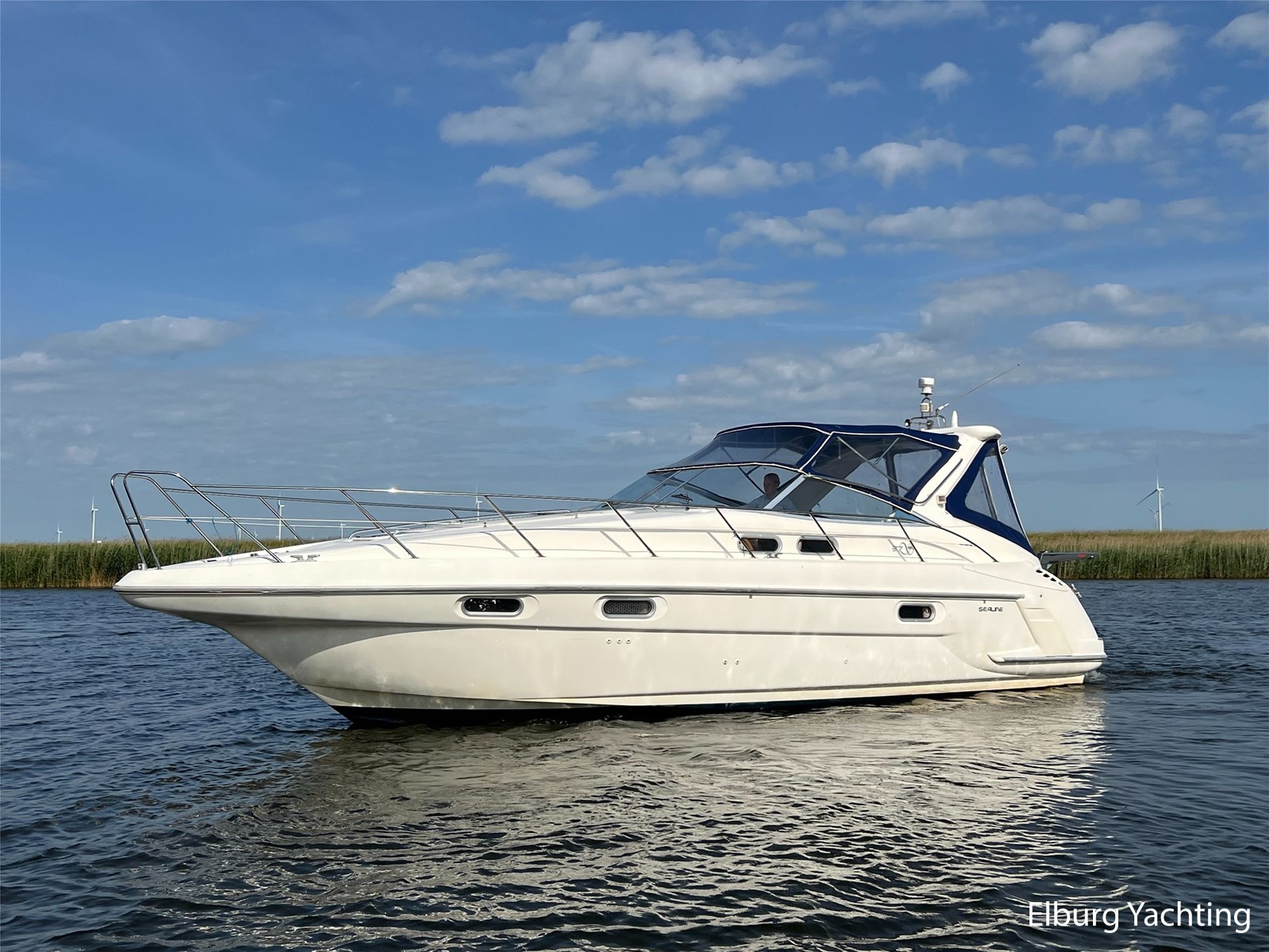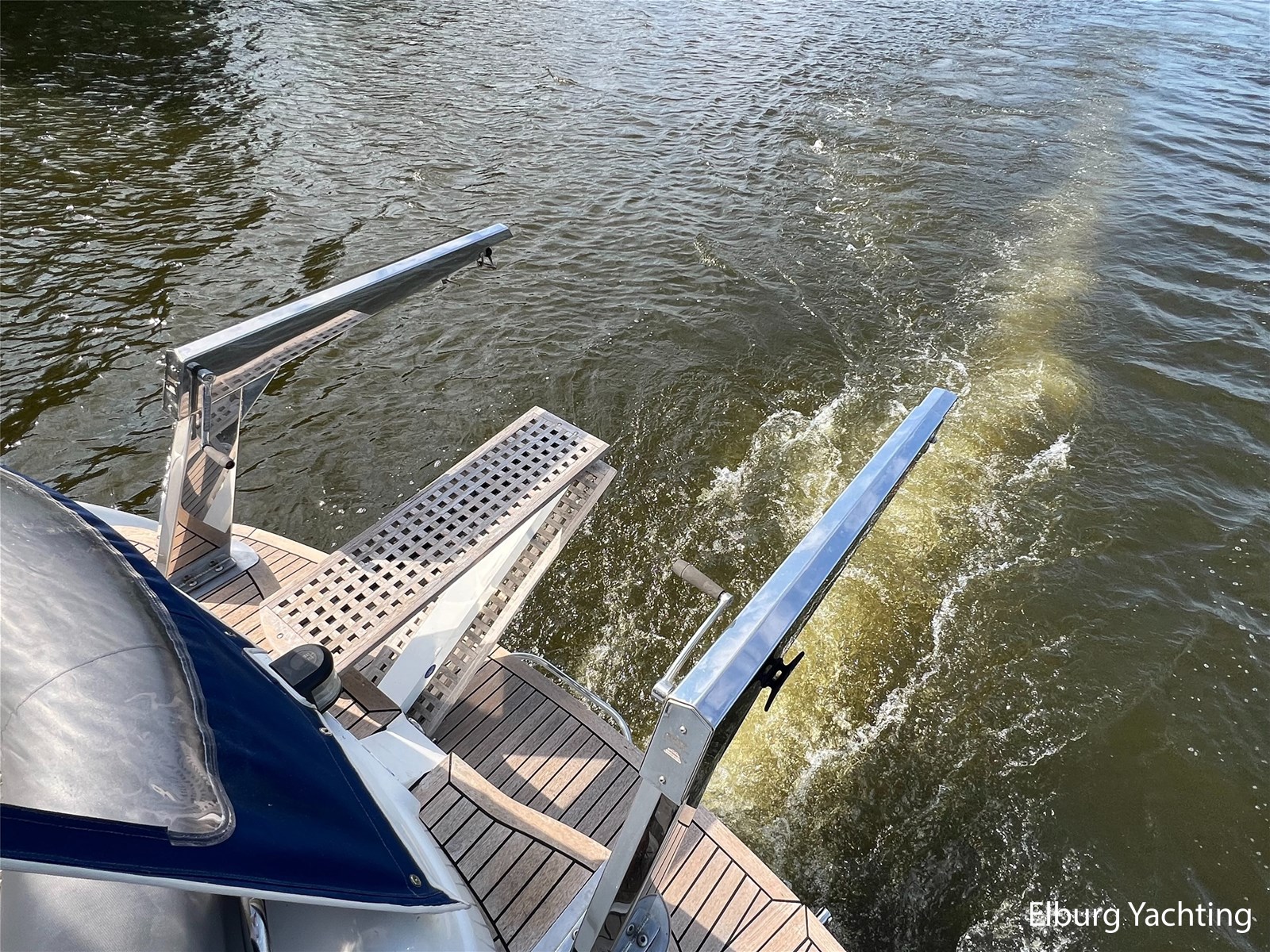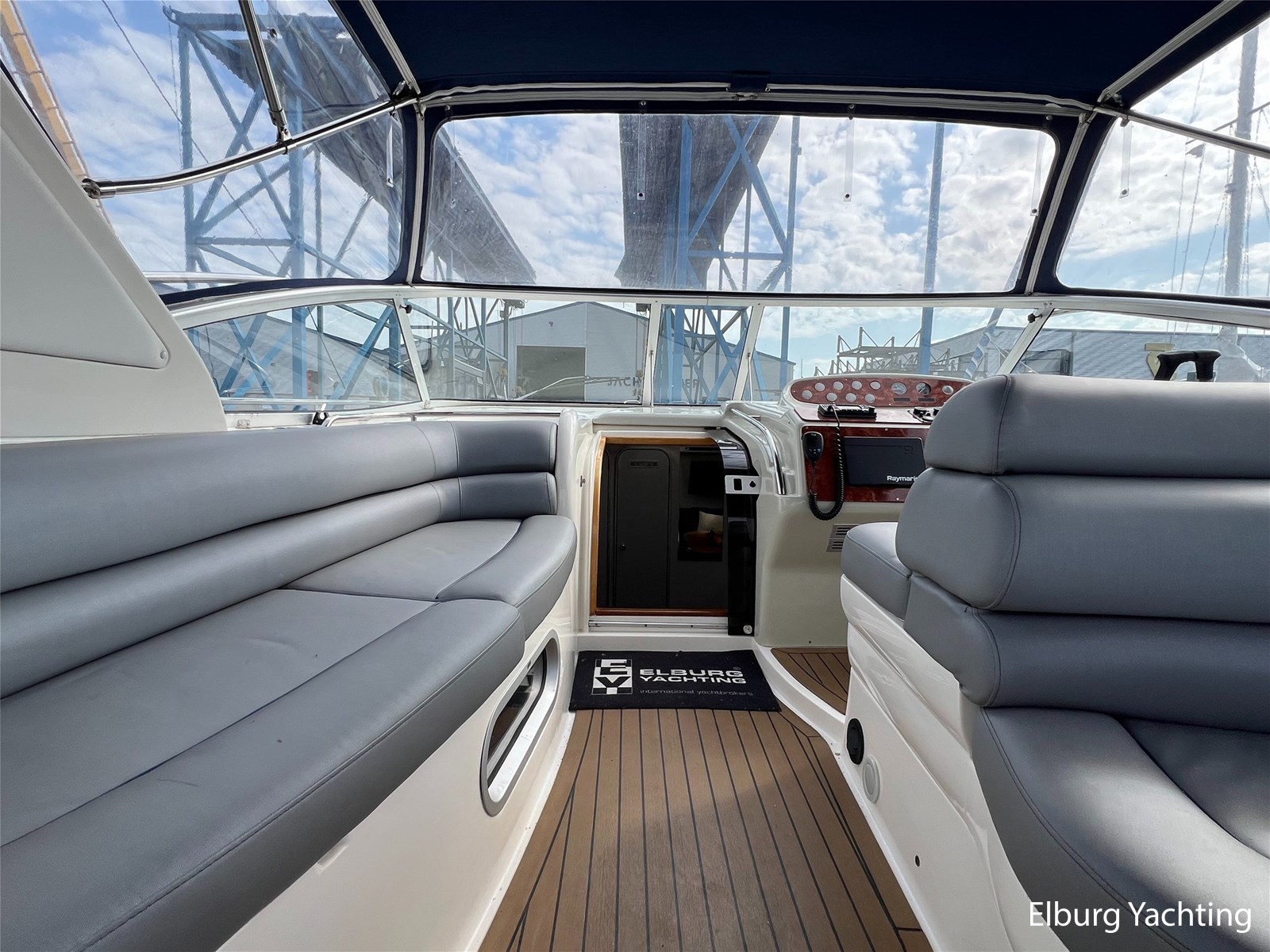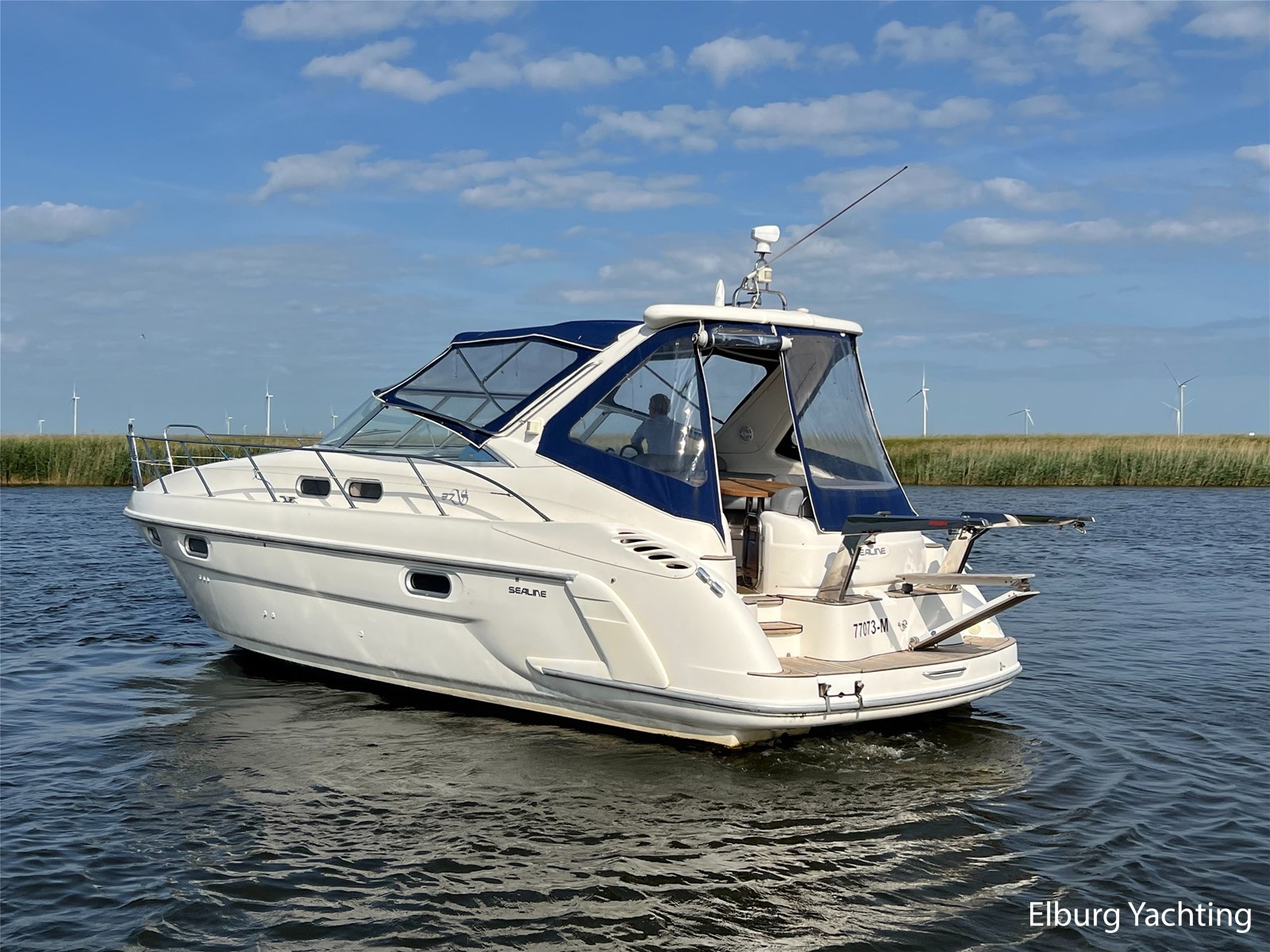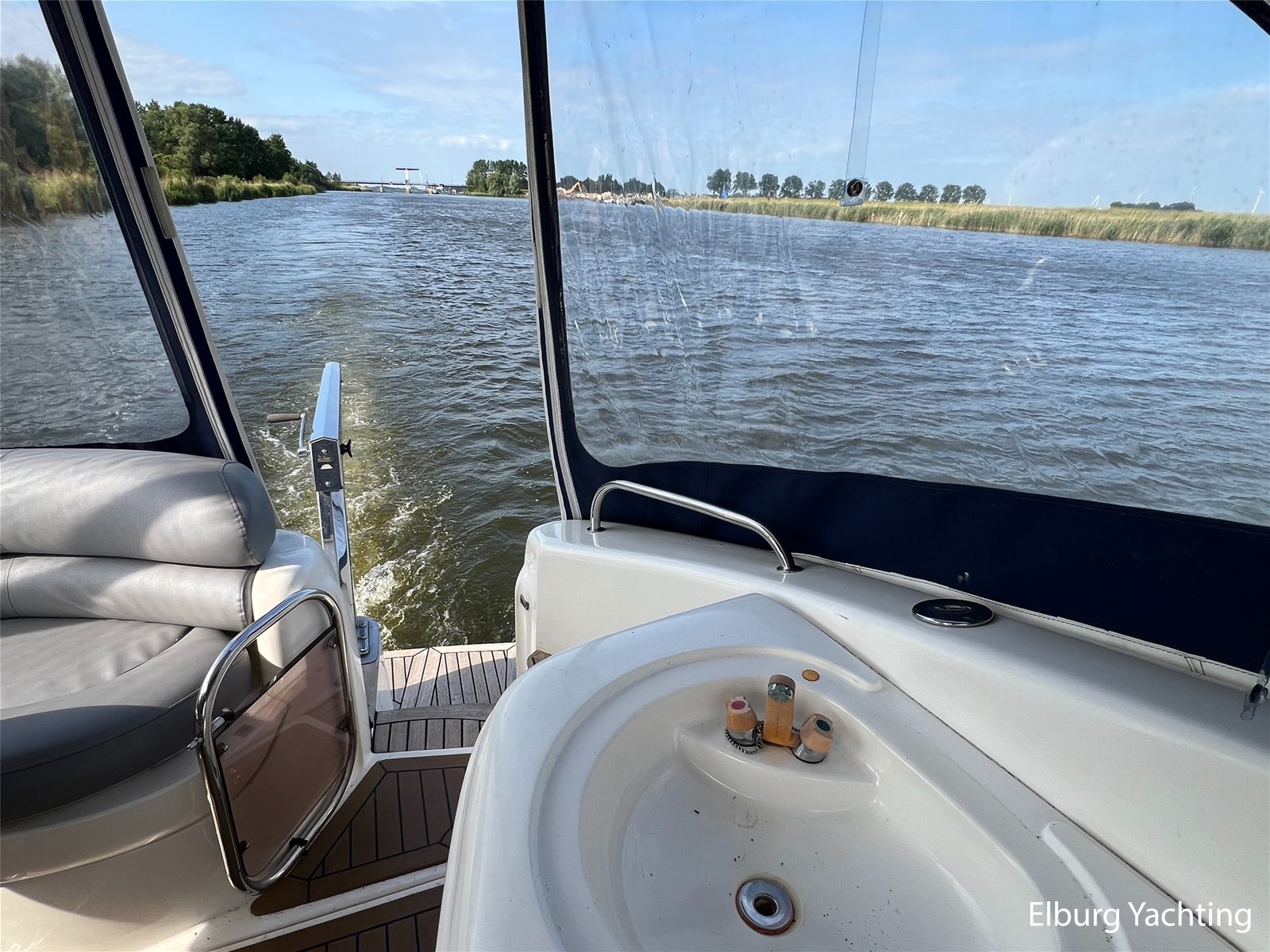 This 1996 Sealine S37 is a fast going motoryacht with a spacious living area on deck level and a comfortable saloon below deck. In the open cockpit there is a U-shaped fixed bench with removable cushions. The cockpit table can be lowered to create a large sunbed. Opposite there is an outdoor refrigerator with sink (hot/cold). The steering position has a 2-person pilot seat from where you have a clear view on the instruments. The entire cockpit is equipped with a low-maintenance synthetic teak deck. The ship has a two-cabin layout with the owner's cabin in the foreship equipped with a 2-person French bed and the 2-person guest cabin amidships. In recent years, much has been invested in the ship in service and improvements on board. The latest renovations were carried out in 2023, including a new teak floor in the saloon, upholstery inside + outside, multiple 230V sockets type F, carpeting and curtains, cockpit tent, maintenance on both engines and Z-drives. This Sealine S37 is furthermore equipped with: Lighting in open cockpit, many stainless steel details on deck, pilot seat for 2 persons, full tent around open cockpit with removable parts, leather upholstery in cockpit, sunbed on the foredeck, wetbar in cockpit with refrigerator and sink, integrated cup holders, foldable table at the outdoor seating area so that it can be converted into a sunbed, TV in saloon (2023), Sony radio (2023), foldable/removable gangway on the bathing platform. For questions and/or to make an appointment, you are welcome at Elburg Yachting 7 days a week.