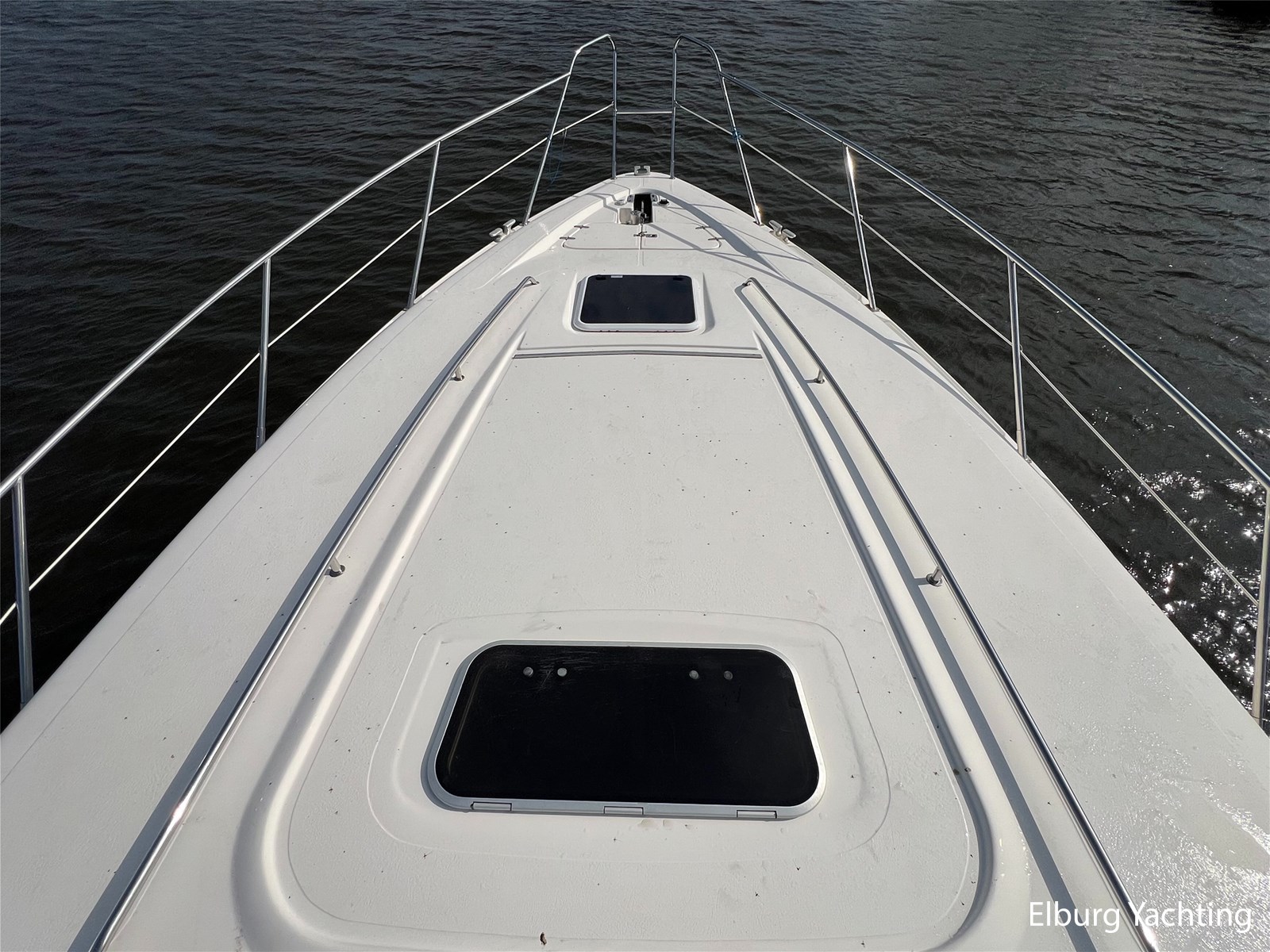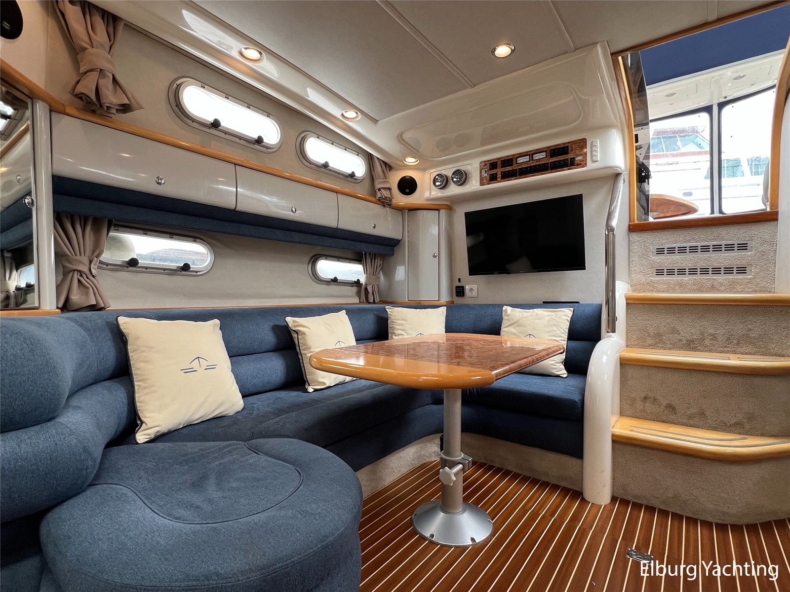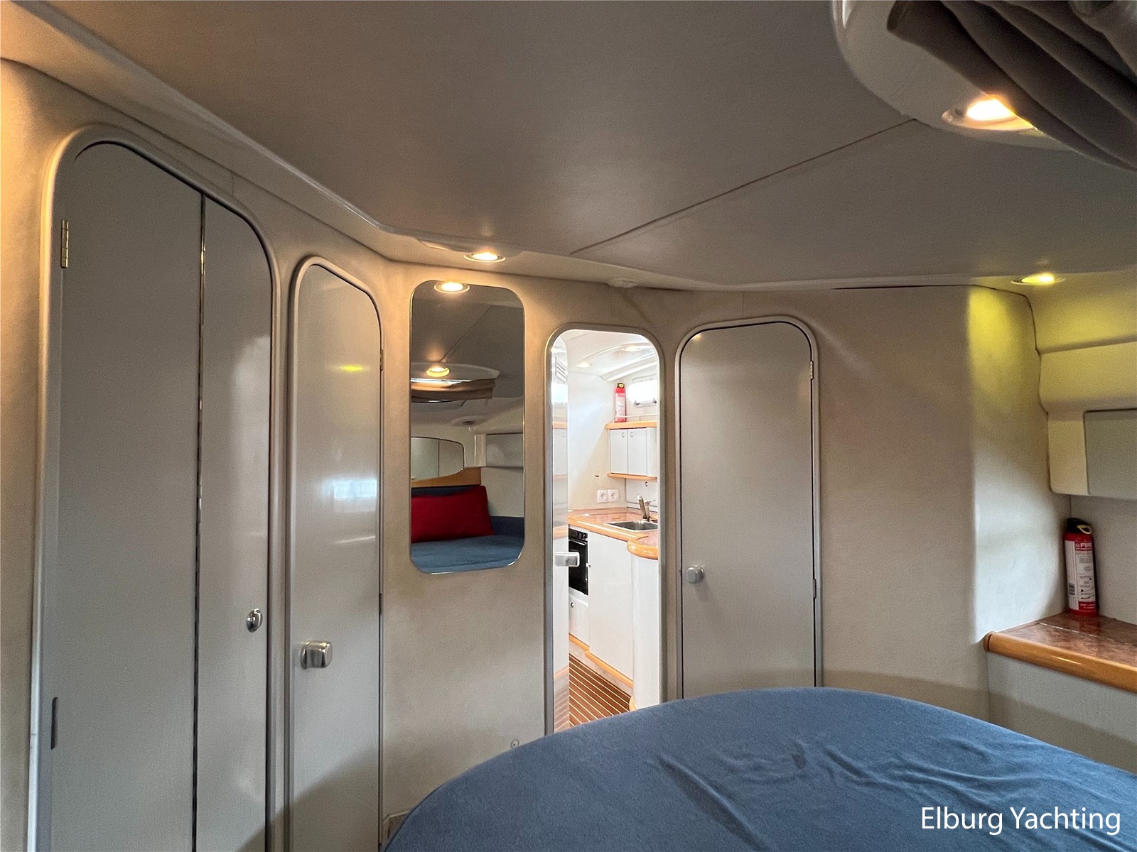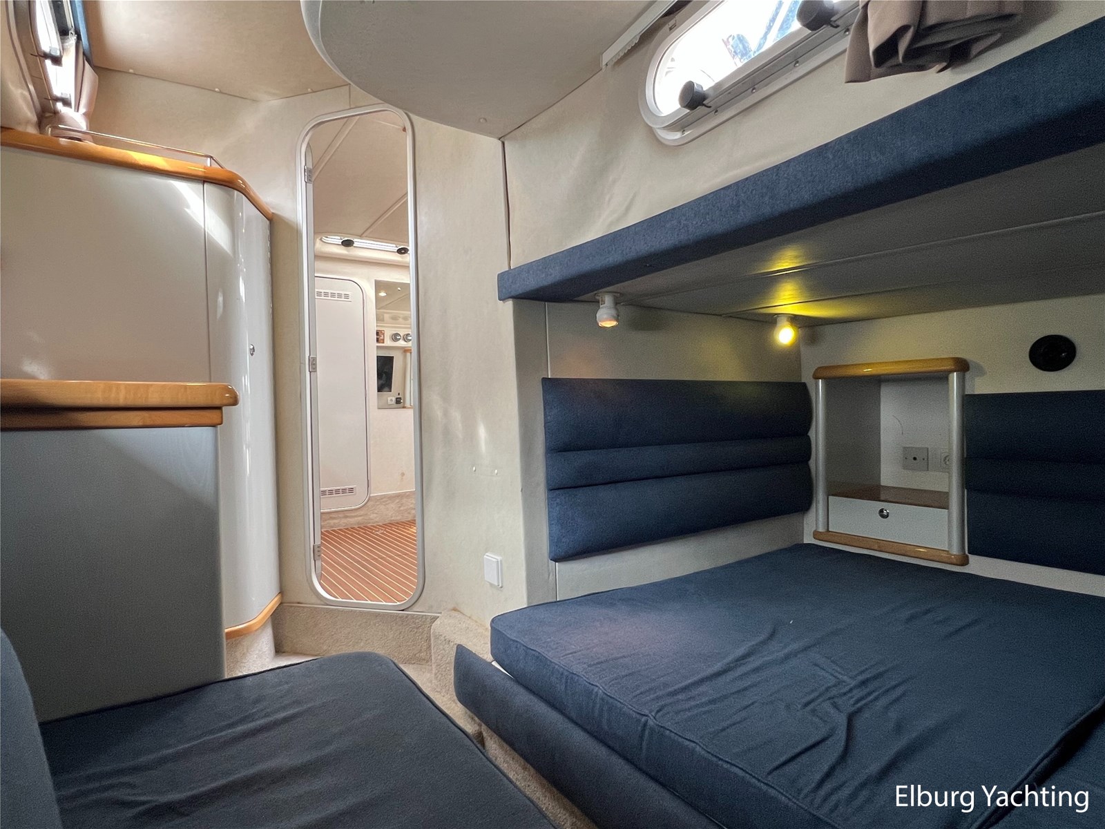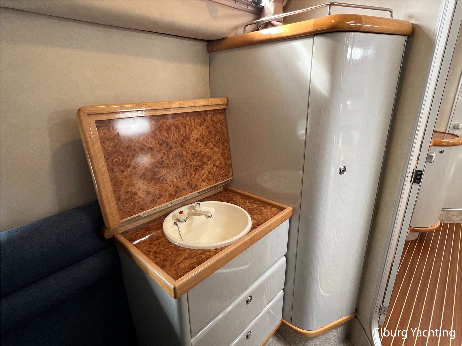 This 1996 Sealine S37 is a fast going motoryacht with a spacious living area on deck level and a comfortable saloon below deck. In the open cockpit there is a U-shaped fixed bench with removable cushions. The cockpit table can be lowered to create a large sunbed. Opposite there is an outdoor refrigerator with sink (hot/cold). The steering position has a 2-person pilot seat from where you have a clear view on the instruments. The entire cockpit is equipped with a low-maintenance synthetic teak deck. The ship has a two-cabin layout with the owner's cabin in the foreship equipped with a 2-person French bed and the 2-person guest cabin amidships. In recent years, much has been invested in the ship in service and improvements on board. The latest renovations were carried out in 2023, including a new teak floor in the saloon, upholstery inside + outside, multiple 230V sockets type F, carpeting and curtains, cockpit tent, maintenance on both engines and Z-drives. This Sealine S37 is furthermore equipped with: Lighting in open cockpit, many stainless steel details on deck, pilot seat for 2 persons, full tent around open cockpit with removable parts, leather upholstery in cockpit, sunbed on the foredeck, wetbar in cockpit with refrigerator and sink, integrated cup holders, foldable table at the outdoor seating area so that it can be converted into a sunbed, TV in saloon (2023), Sony radio (2023), foldable/removable gangway on the bathing platform. For questions and/or to make an appointment, you are welcome at Elburg Yachting 7 days a week.
