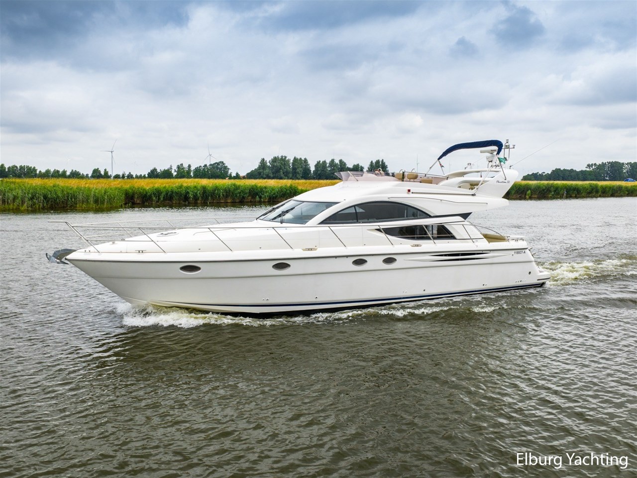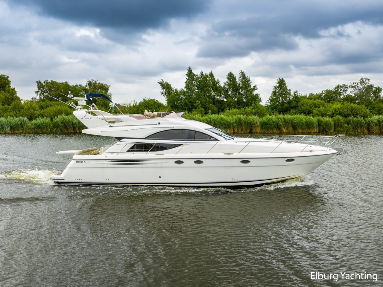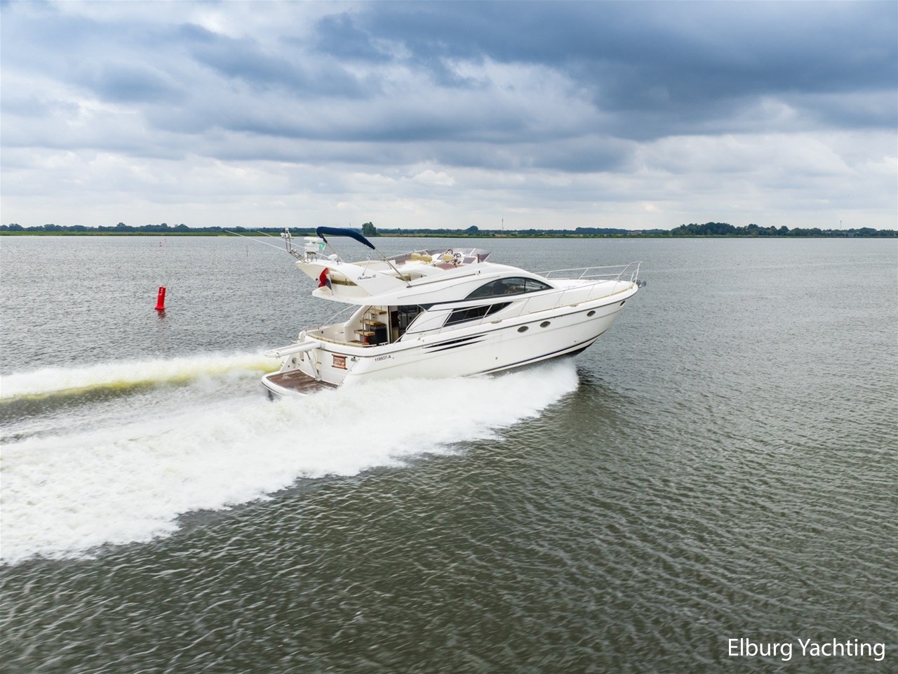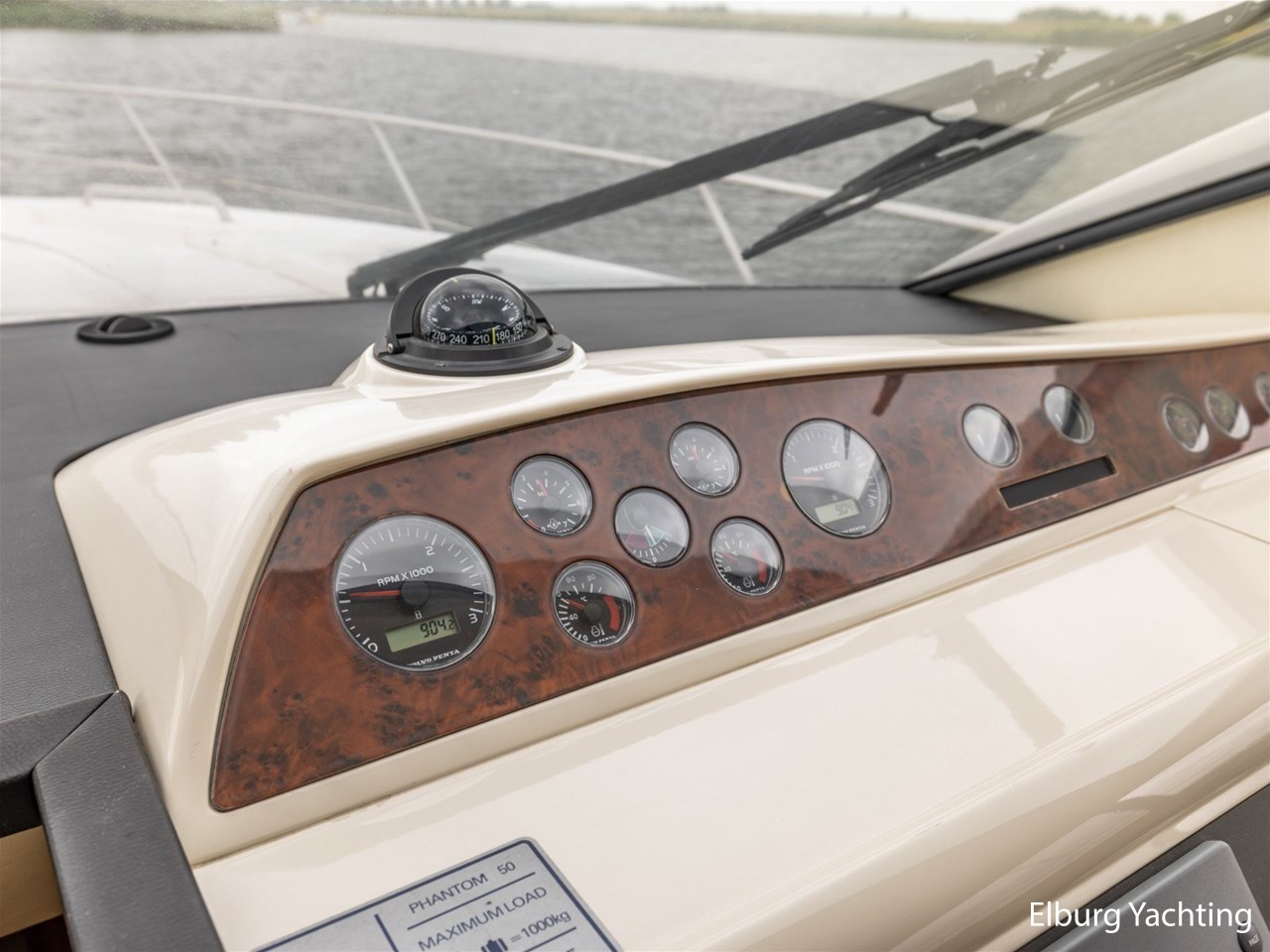 Refined and elegant, the Fairline Phantom 50 offers ultimate comfort combined with sport performance. With three full-size cabins, the vessel offers sleeping accommodation for six crew + 1 x crew cabin. This Fairline Phantom 50 is very full equipped including: Fixed bench seat in open cockpit with matching cushions (2022), cockpit and saloon on single level, stainless steel sliding door to saloon, "lazy" stairs to flybridge, U-shaped dinette on flybridge also to be used as sun bed, 2 x sailing chair at inside helm station and on flybridge, bimini top, outside lighting (blue), Zanussi washing machine, access engine room via open cockpit with spacious storage, kitchen at same level as saloon, mosquito nets for portholes, crew cabin with private entrance through open cockpit, trim tabs, cushions on foredeck, sunscreens around saloon windows, full tent (2021) around open cockpit, covers for benches on flybridge (2021) + full cover, stainless steel outside railing all around. 2 x diesel tanks cleaned in 2022, major engine maintenance (engines and generator) carried out in 2024.