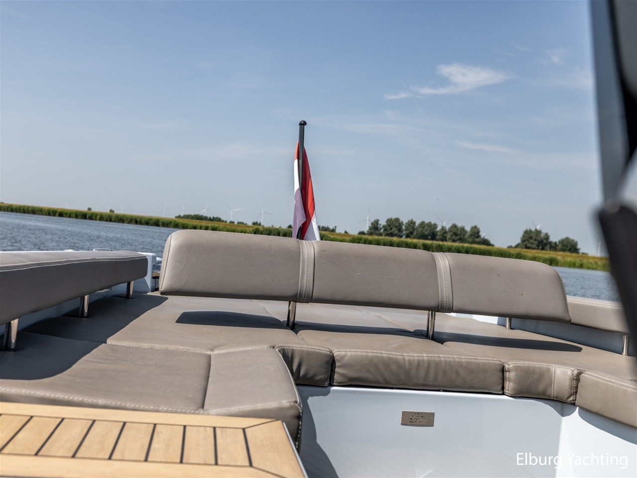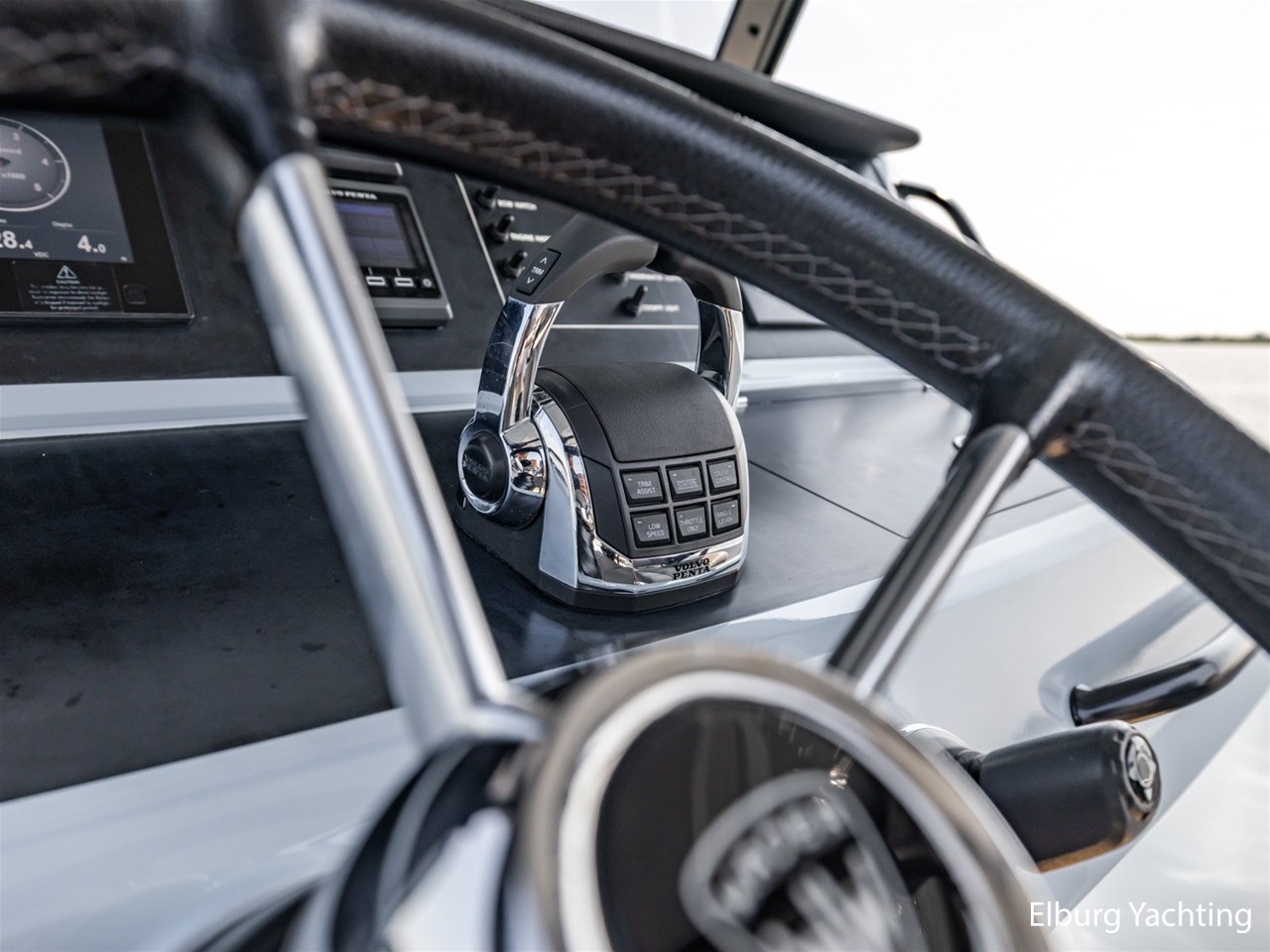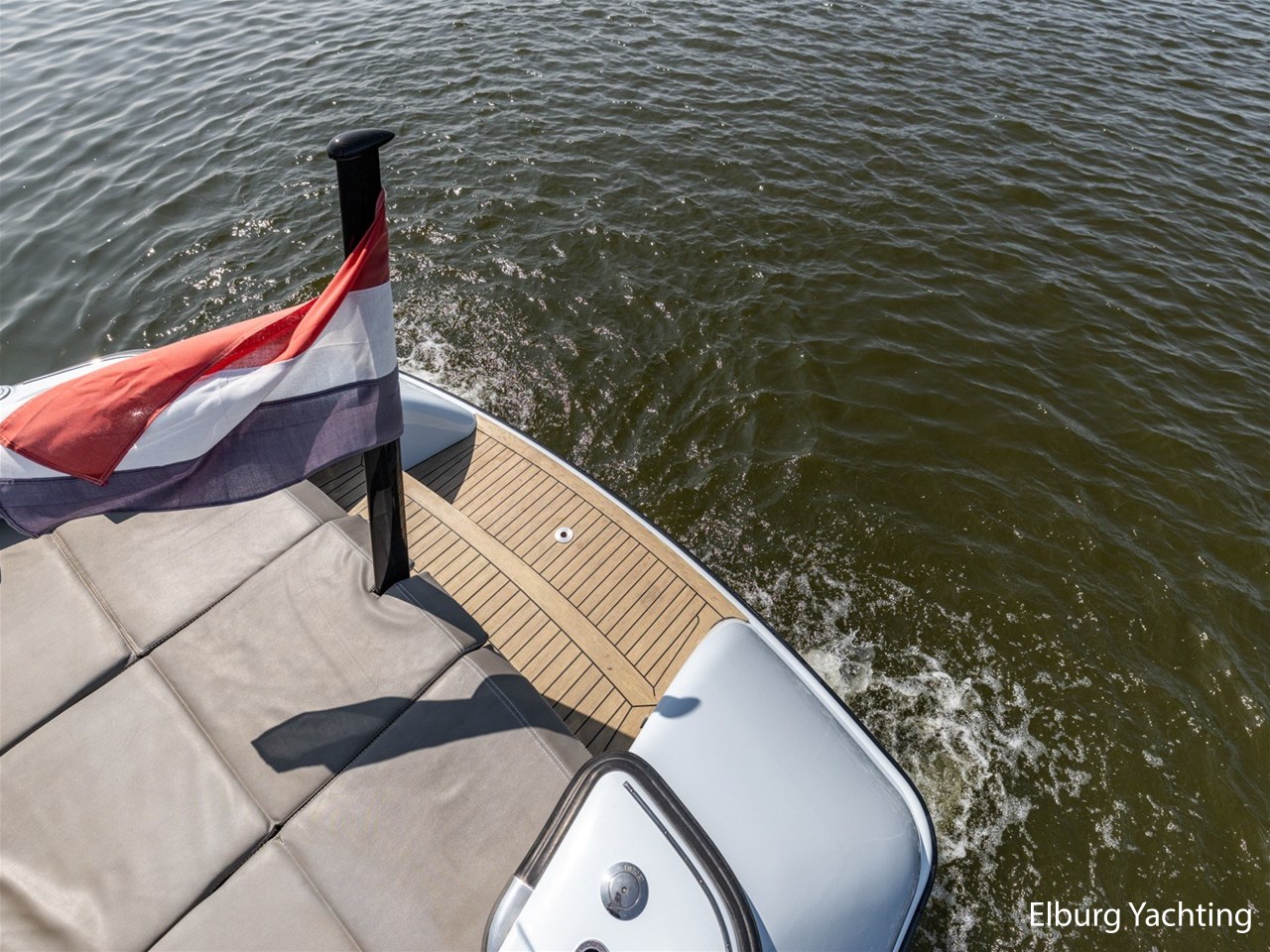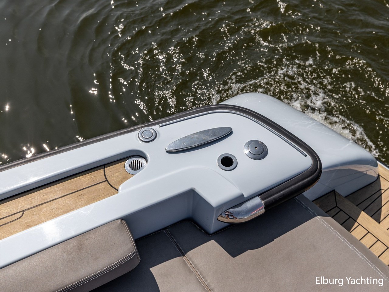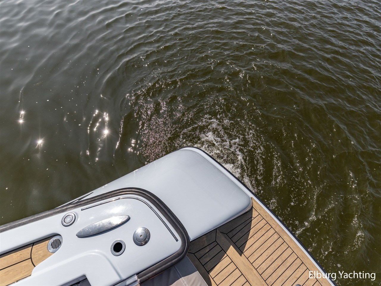 The yacht also features an electric engine hatch/sun deck in the stern, electric opening for dinette/sun deck for large storage space, spacious enclosed WC incl. sink, for dinette easy to convert into spacious sun deck suitable for 2 persons (wind-free lying), Volvo Penta docking joystick steering for easy mooring in any harbour, hard top version so always dry and/or sun-free sailing, rubber bumper around entire boat, several built-in cup holders, professional music system with several sound boxes, design carbon flagpole(s), many handles for handholds while sailing, high safe fixed bulwark, collapsible fenders, underwater lighting.