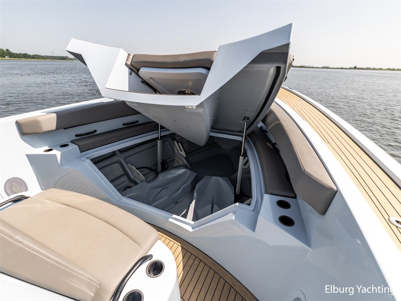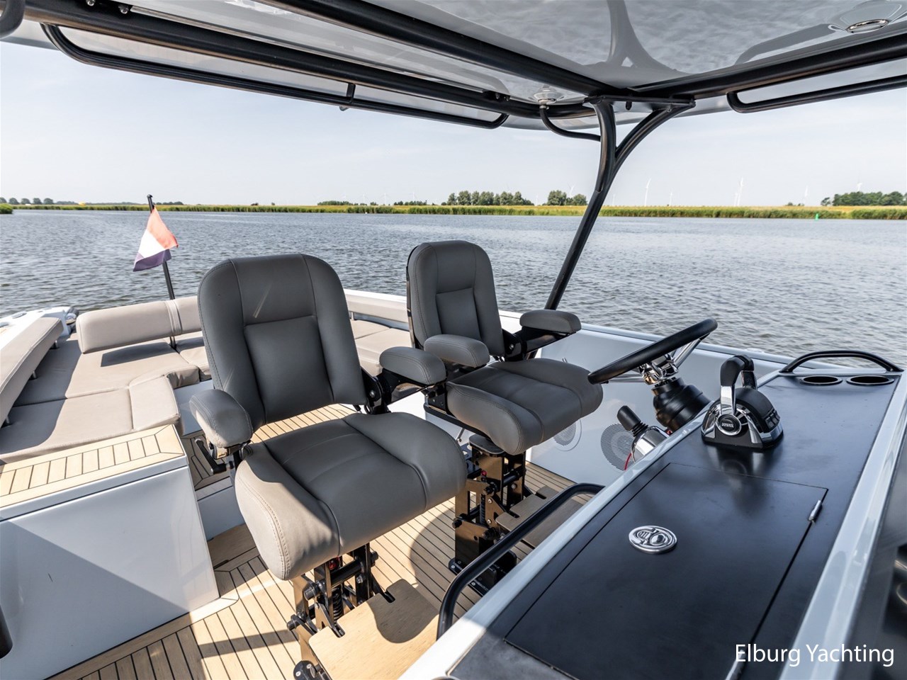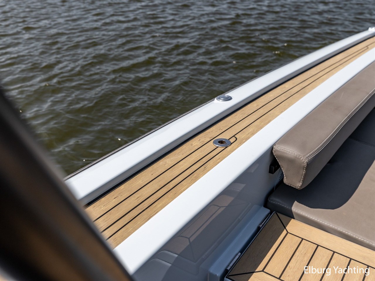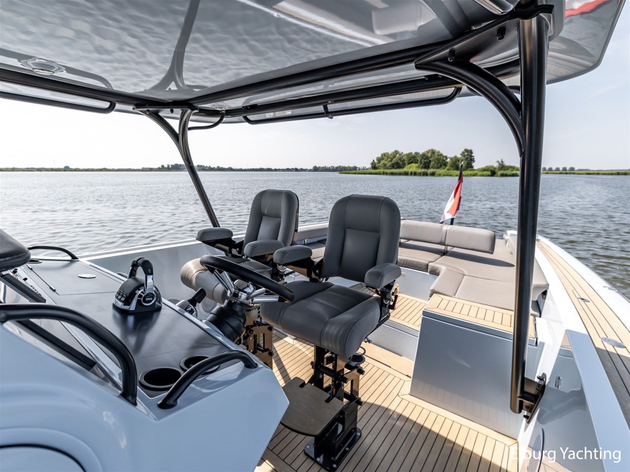 The yacht also features an electric engine hatch/sun deck in the stern, electric opening for dinette/sun deck for large storage space, spacious enclosed WC incl. sink, for dinette easy to convert into spacious sun deck suitable for 2 persons (wind-free lying), Volvo Penta docking joystick steering for easy mooring in any harbour, hard top version so always dry and/or sun-free sailing, rubber bumper around entire boat, several built-in cup holders, professional music system with several sound boxes, design carbon flagpole(s), many handles for handholds while sailing, high safe fixed bulwark, collapsible fenders, underwater lighting.