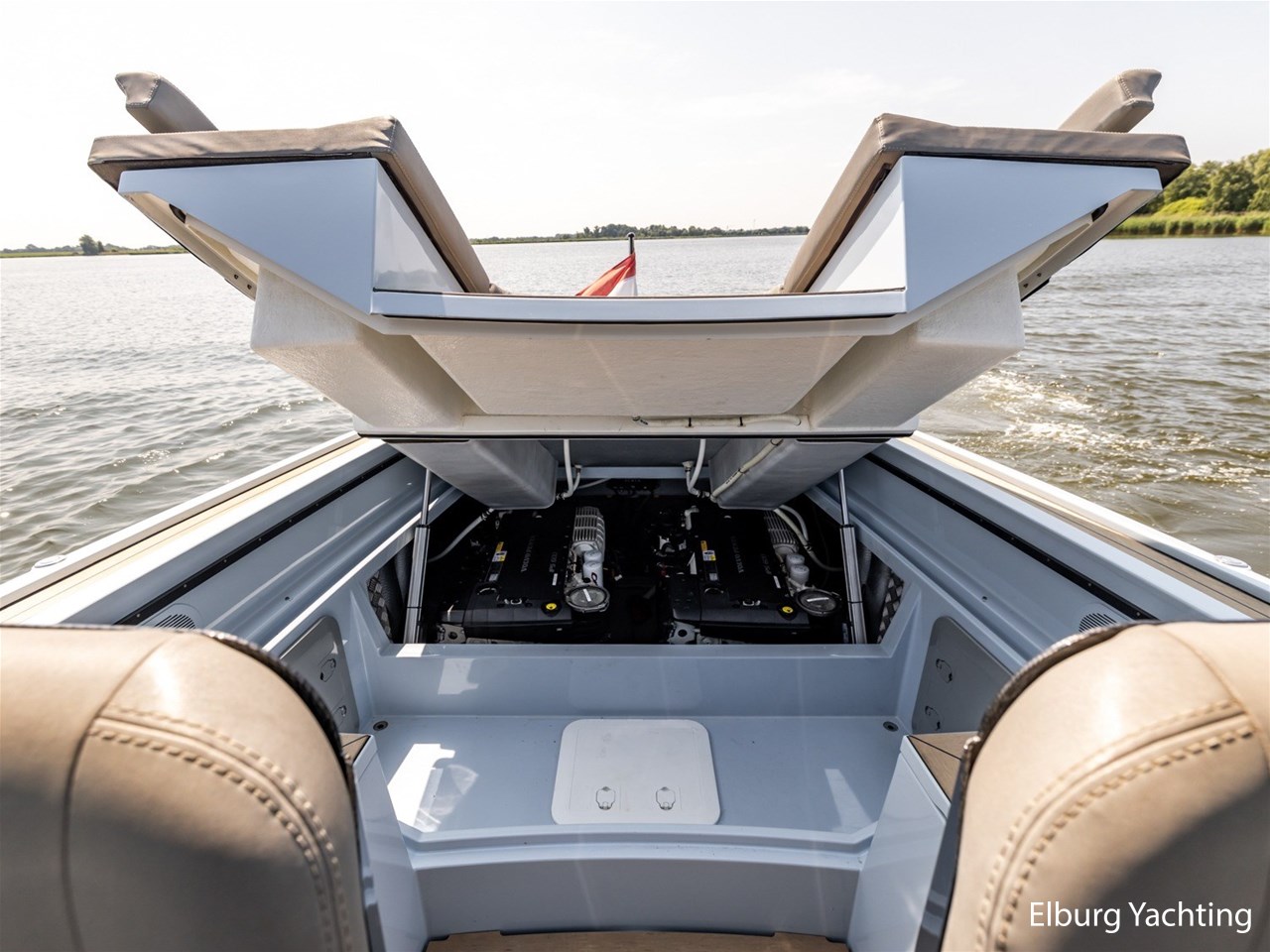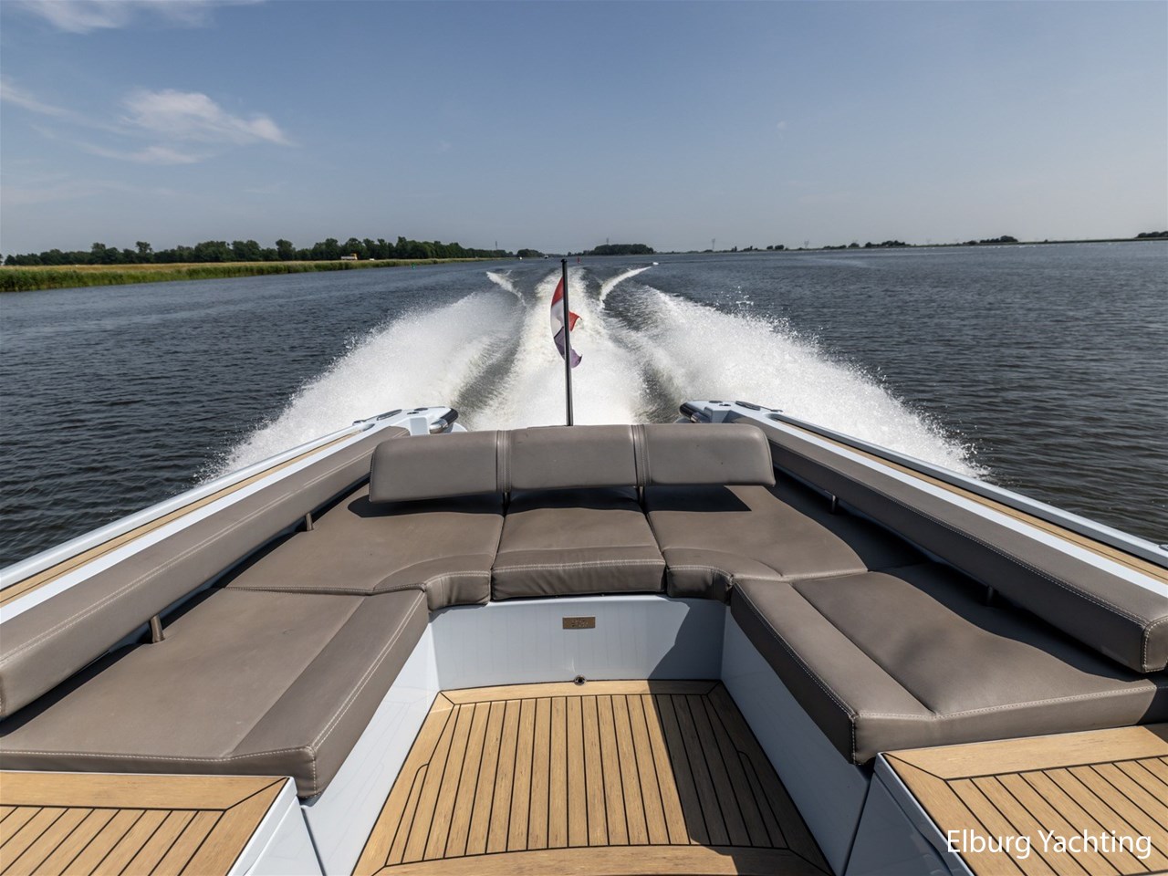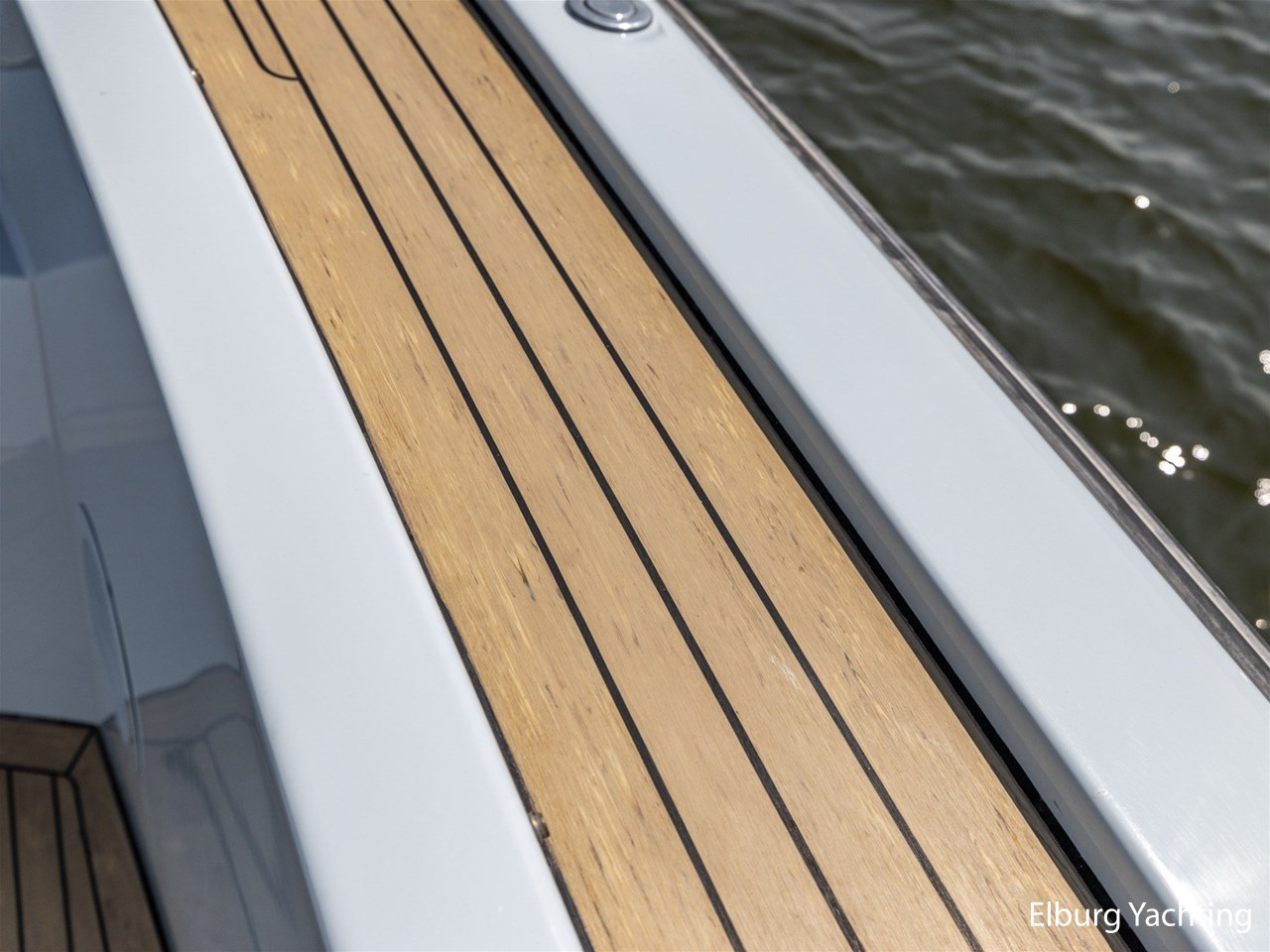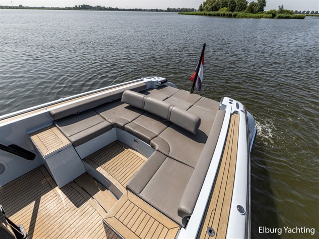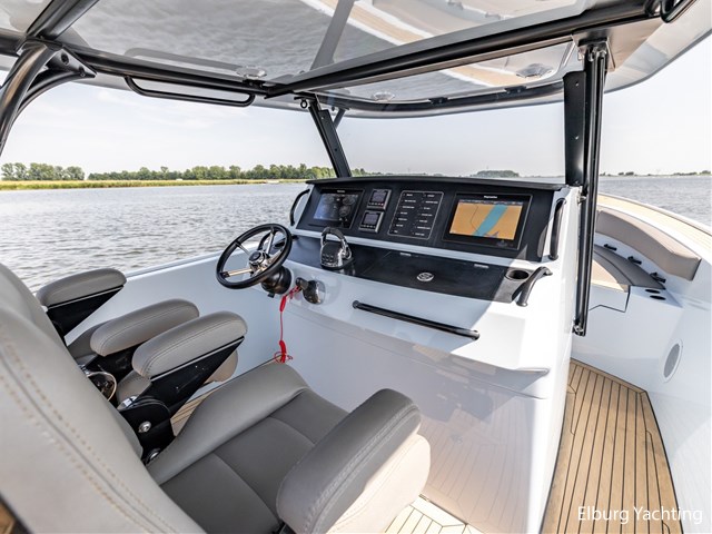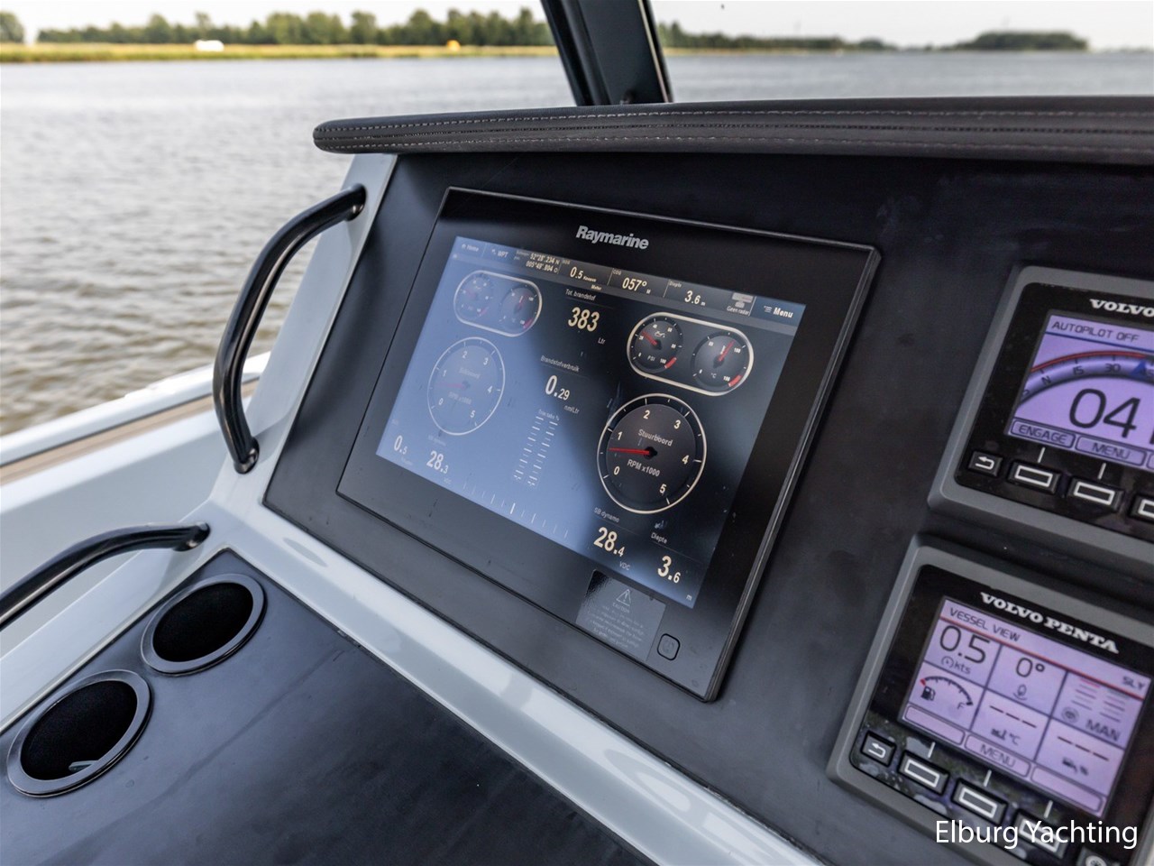 The yacht also features an electric engine hatch/sun deck in the stern, electric opening for dinette/sun deck for large storage space, spacious enclosed WC incl. sink, for dinette easy to convert into spacious sun deck suitable for 2 persons (wind-free lying), Volvo Penta docking joystick steering for easy mooring in any harbour, hard top version so always dry and/or sun-free sailing, rubber bumper around entire boat, several built-in cup holders, professional music system with several sound boxes, design carbon flagpole(s), many handles for handholds while sailing, high safe fixed bulwark, collapsible fenders, underwater lighting.