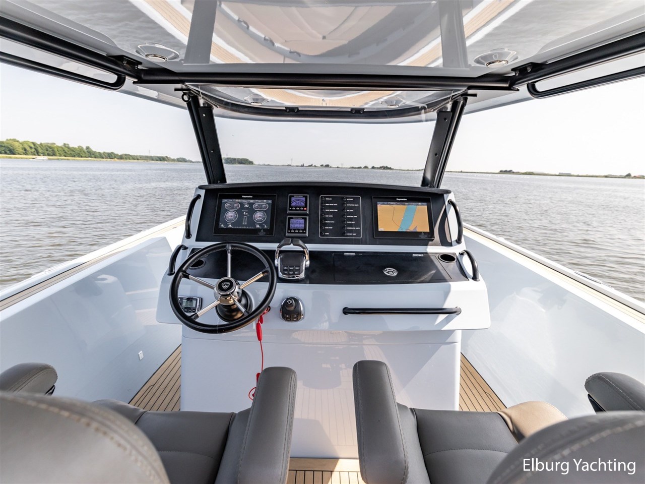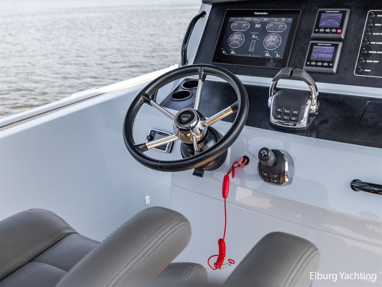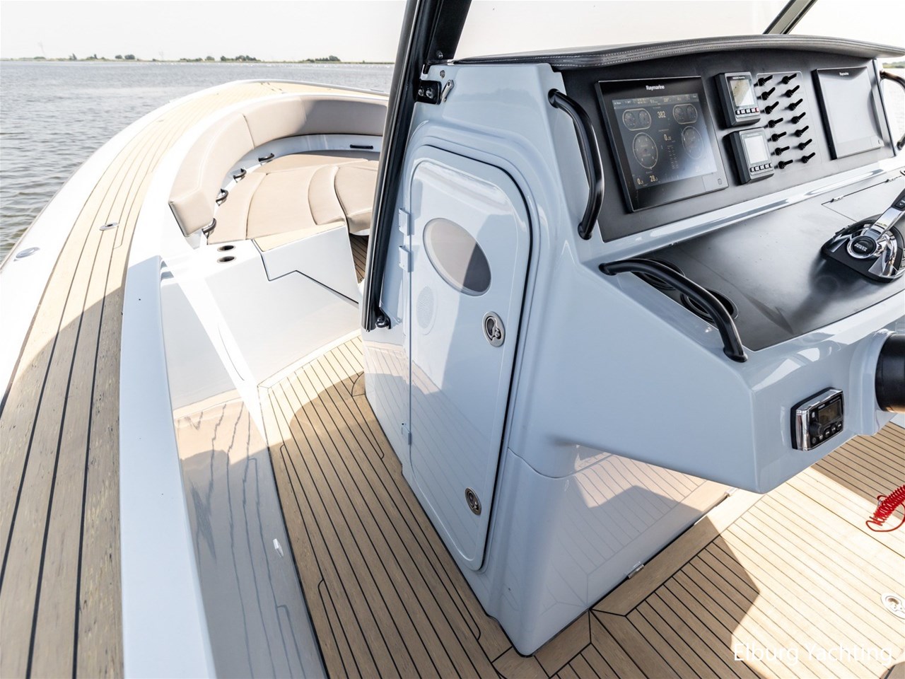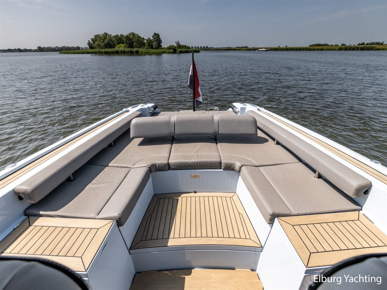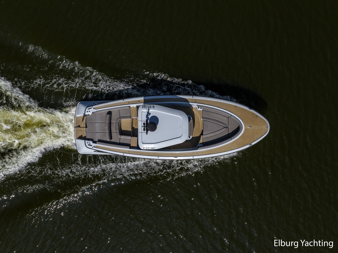 The yacht also features an electric engine hatch/sun deck in the stern, electric opening for dinette/sun deck for large storage space, spacious enclosed WC incl. sink, for dinette easy to convert into spacious sun deck suitable for 2 persons (wind-free lying), Volvo Penta docking joystick steering for easy mooring in any harbour, hard top version so always dry and/or sun-free sailing, rubber bumper around entire boat, several built-in cup holders, professional music system with several sound boxes, design carbon flagpole(s), many handles for handholds while sailing, high safe fixed bulwark, collapsible fenders, underwater lighting.