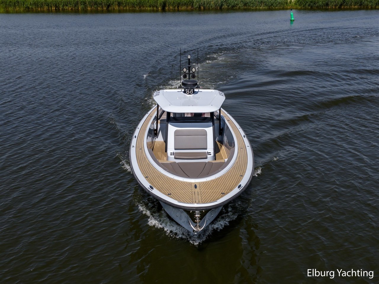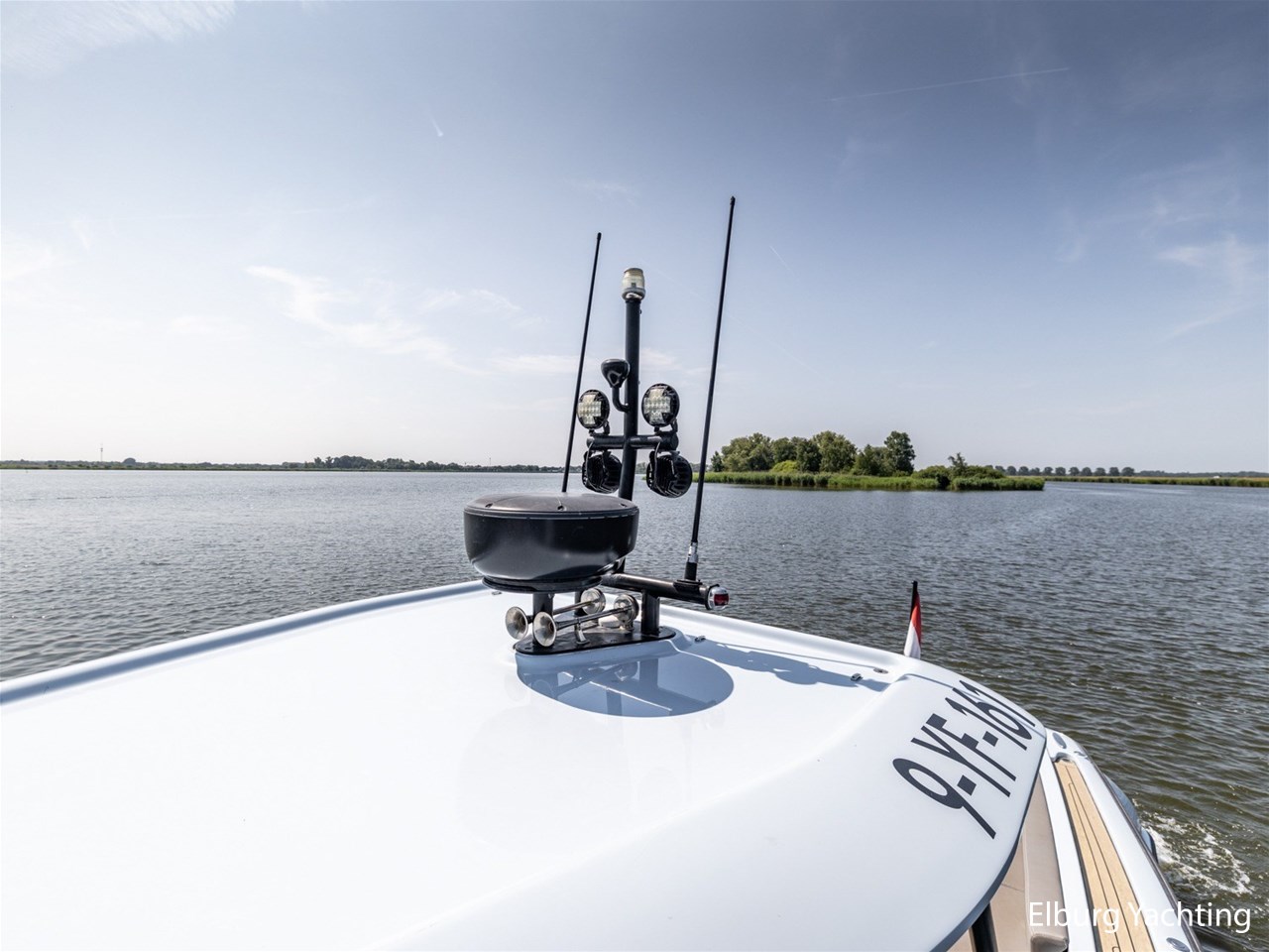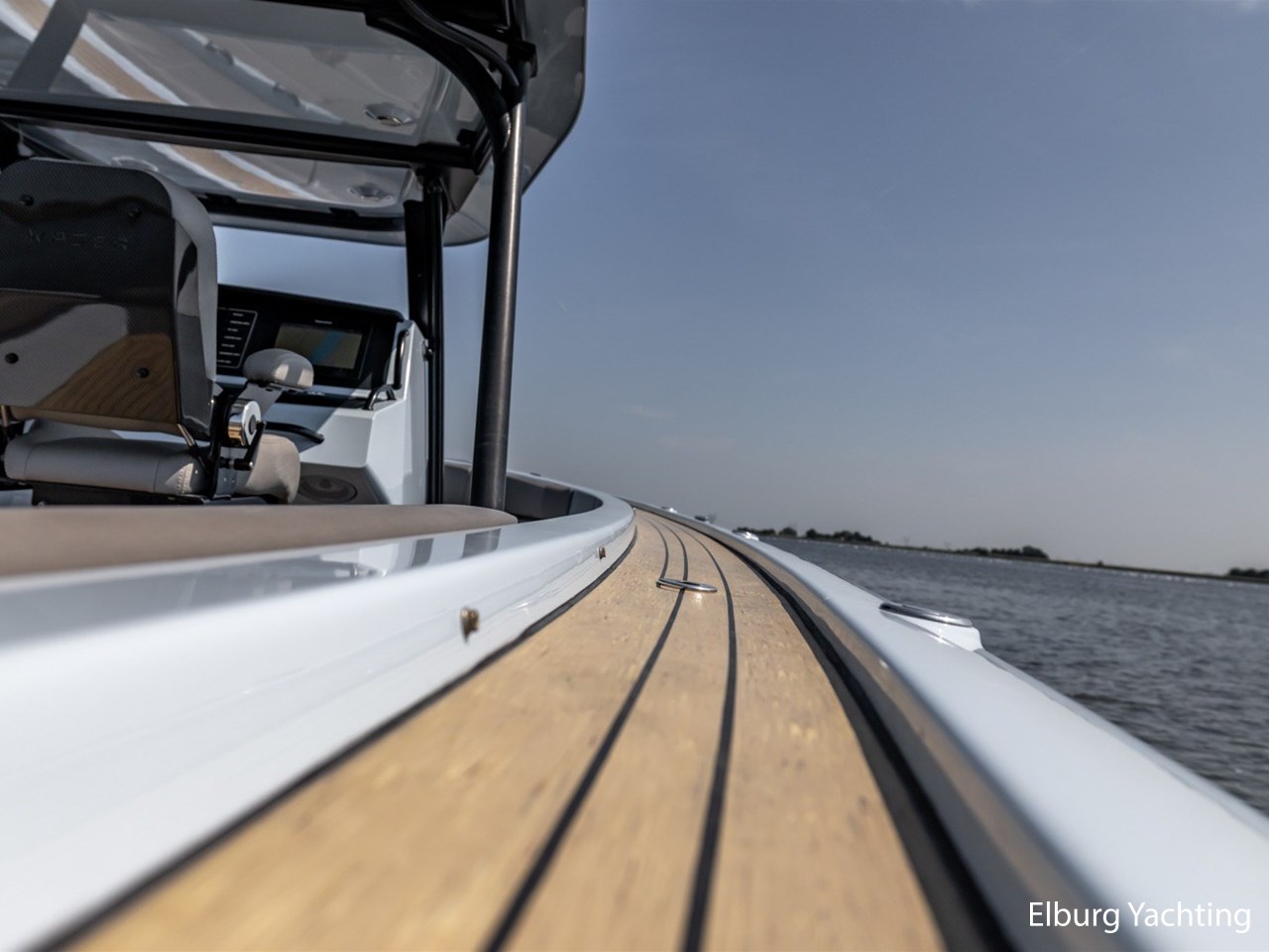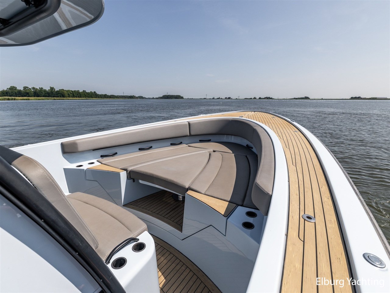 The yacht also features an electric engine hatch/sun deck in the stern, electric opening for dinette/sun deck for large storage space, spacious enclosed WC incl. sink, for dinette easy to convert into spacious sun deck suitable for 2 persons (wind-free lying), Volvo Penta docking joystick steering for easy mooring in any harbour, hard top version so always dry and/or sun-free sailing, rubber bumper around entire boat, several built-in cup holders, professional music system with several sound boxes, design carbon flagpole(s), many handles for handholds while sailing, high safe fixed bulwark, collapsible fenders, underwater lighting.