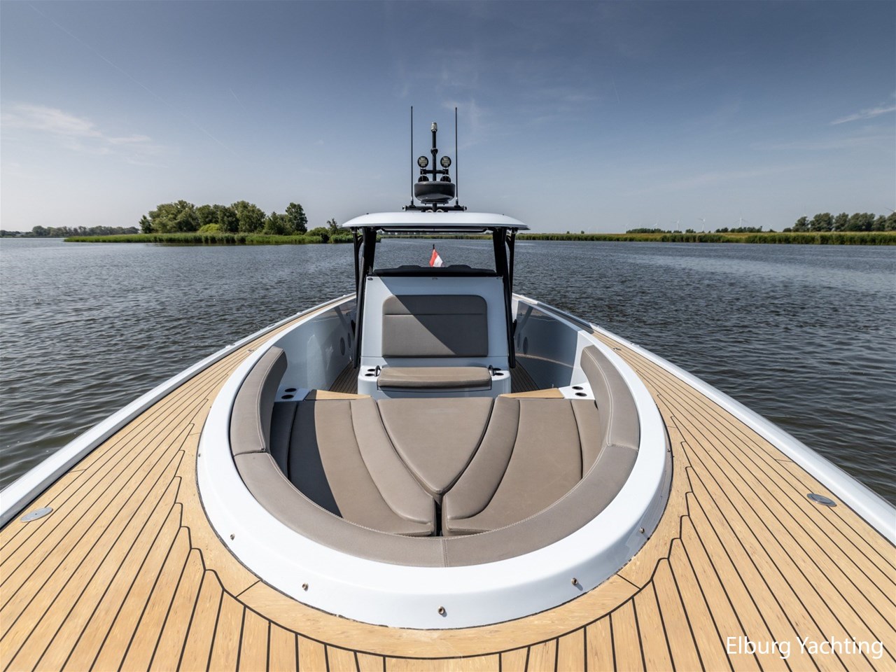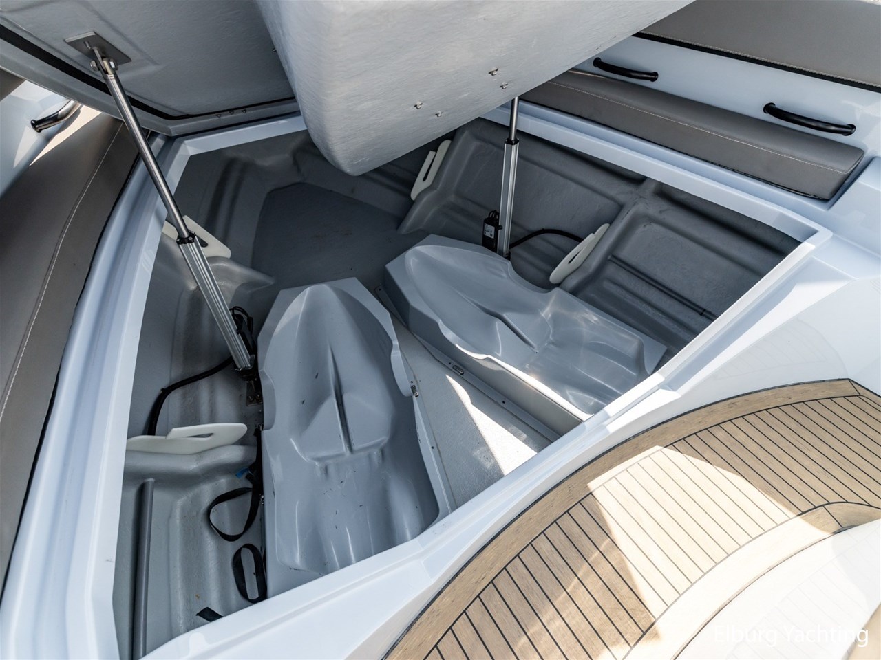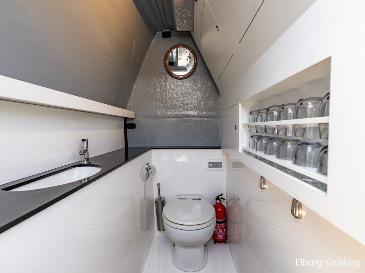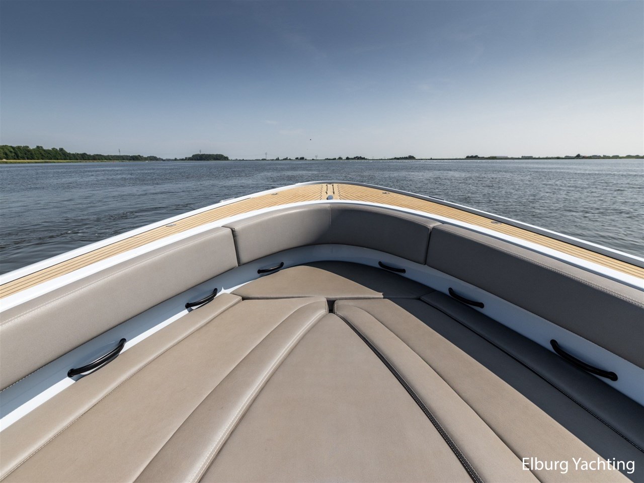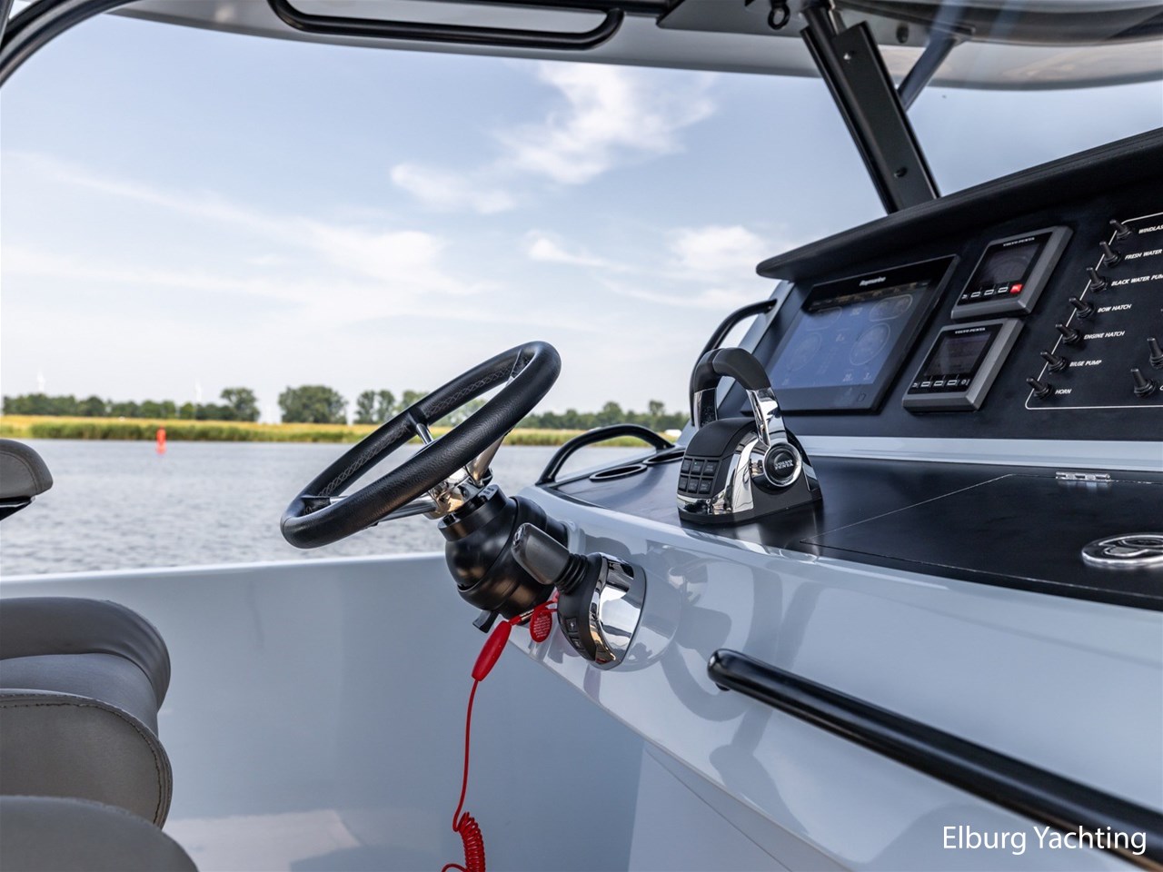 The yacht also features an electric engine hatch/sun deck in the stern, electric opening for dinette/sun deck for large storage space, spacious enclosed WC incl. sink, for dinette easy to convert into spacious sun deck suitable for 2 persons (wind-free lying), Volvo Penta docking joystick steering for easy mooring in any harbour, hard top version so always dry and/or sun-free sailing, rubber bumper around entire boat, several built-in cup holders, professional music system with several sound boxes, design carbon flagpole(s), many handles for handholds while sailing, high safe fixed bulwark, collapsible fenders, underwater lighting.