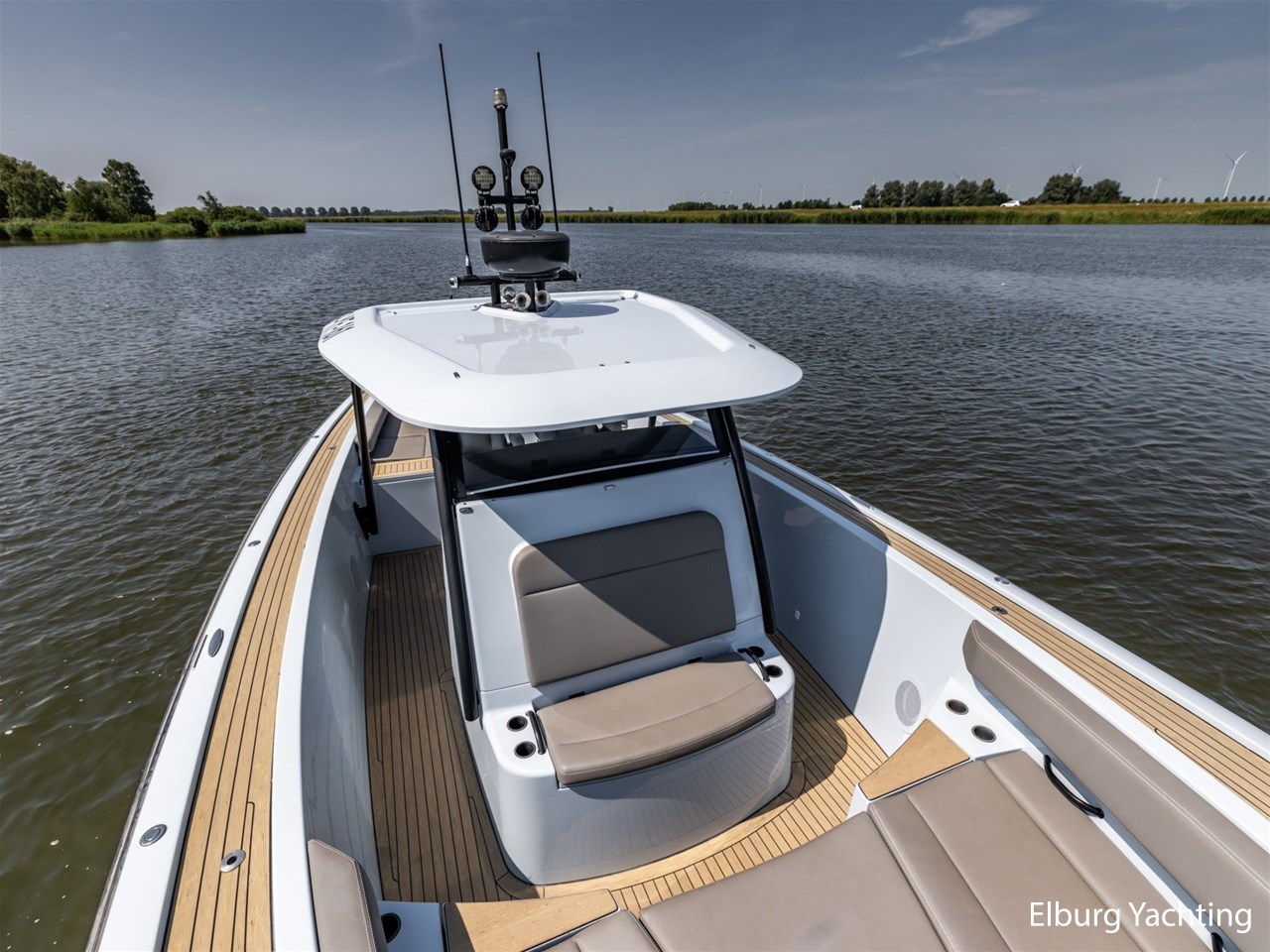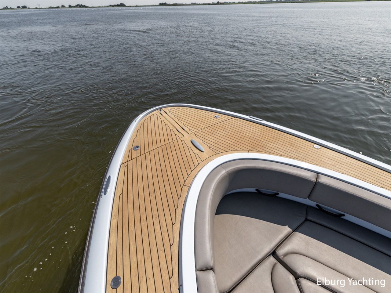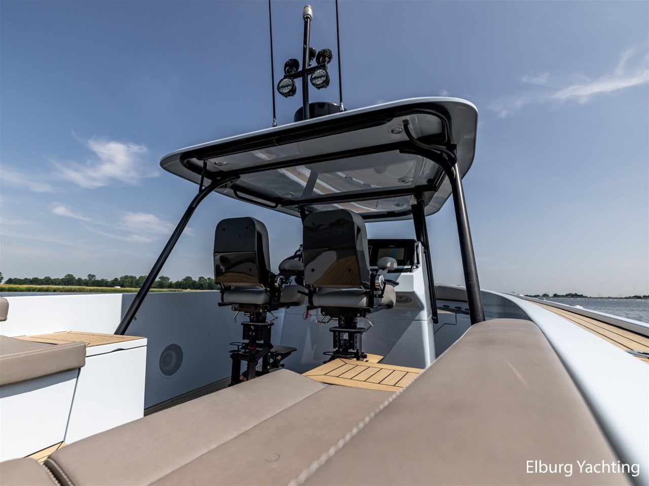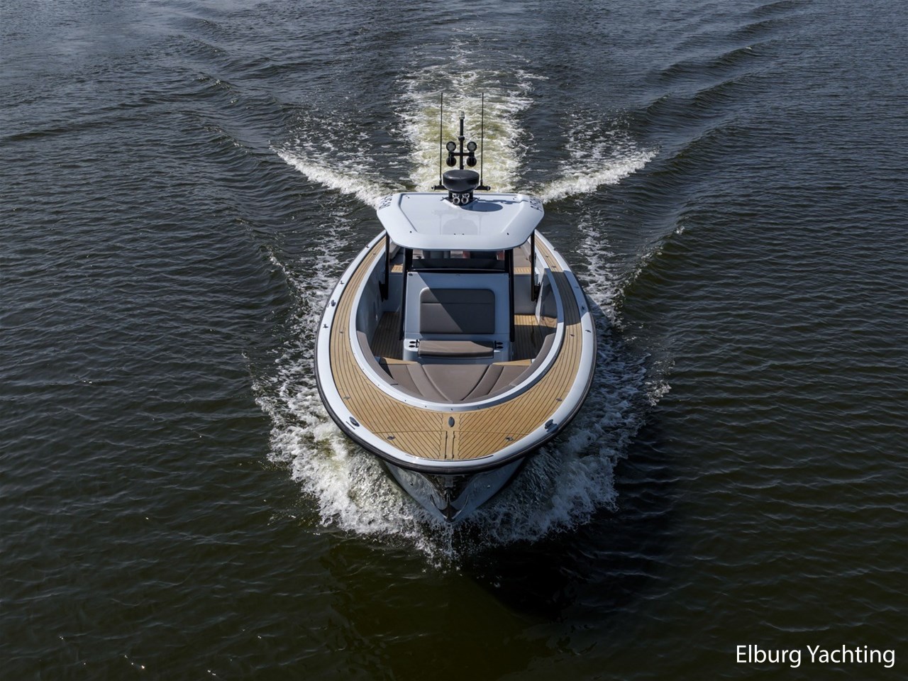 The yacht also features an electric engine hatch/sun deck in the stern, electric opening for dinette/sun deck for large storage space, spacious enclosed WC incl. sink, for dinette easy to convert into spacious sun deck suitable for 2 persons (wind-free lying), Volvo Penta docking joystick steering for easy mooring in any harbour, hard top version so always dry and/or sun-free sailing, rubber bumper around entire boat, several built-in cup holders, professional music system with several sound boxes, design carbon flagpole(s), many handles for handholds while sailing, high safe fixed bulwark, collapsible fenders, underwater lighting.