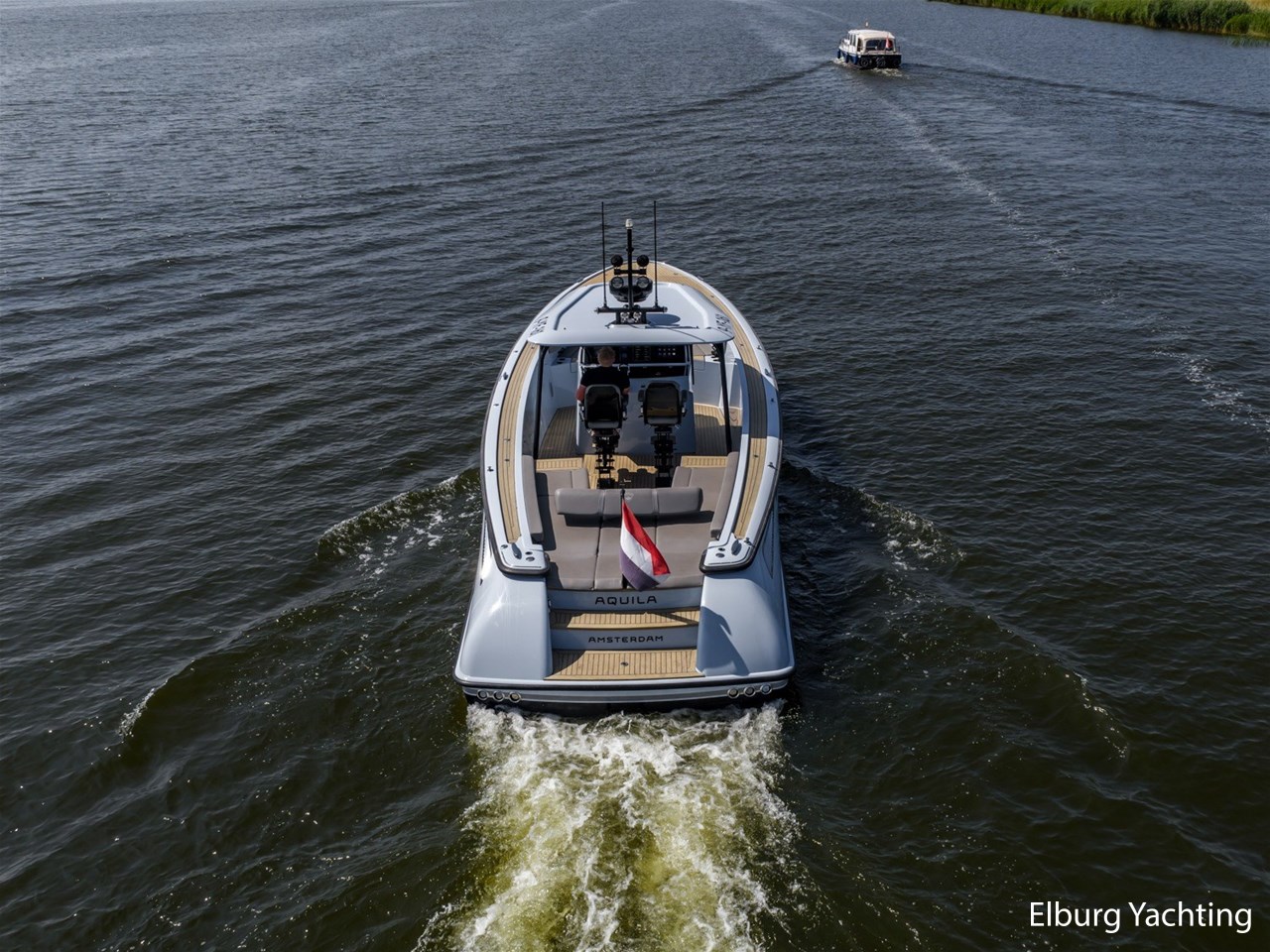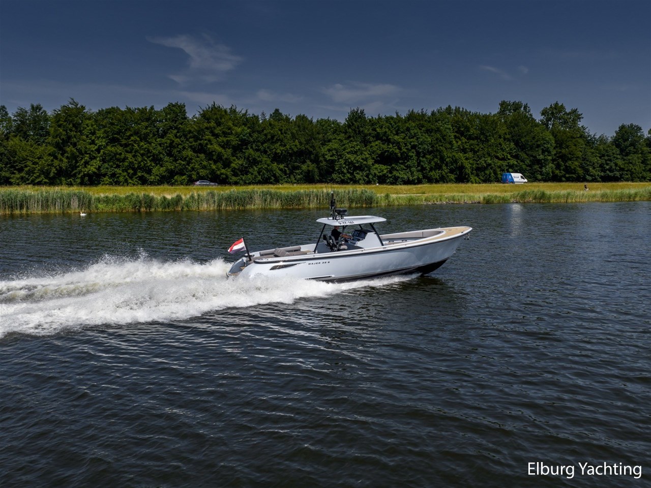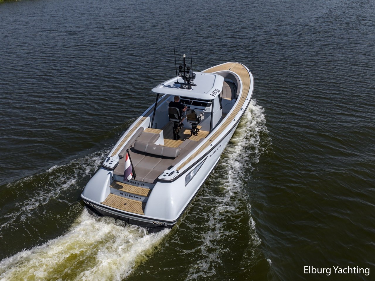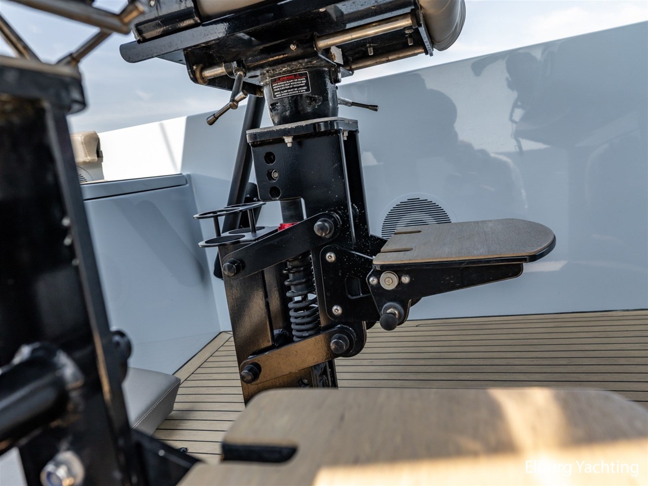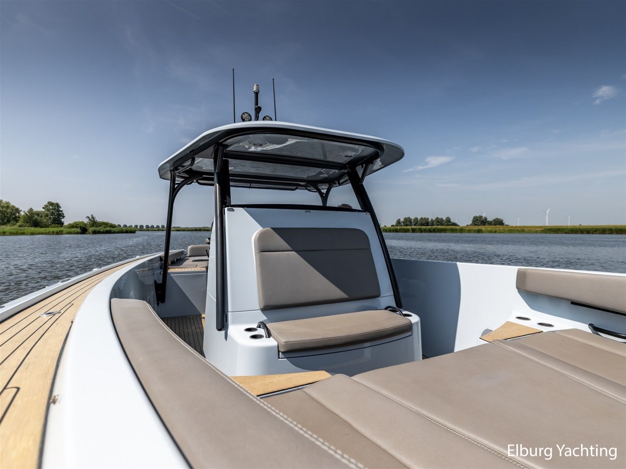 The yacht also features an electric engine hatch/sun deck in the stern, electric opening for dinette/sun deck for large storage space, spacious enclosed WC incl. sink, for dinette easy to convert into spacious sun deck suitable for 2 persons (wind-free lying), Volvo Penta docking joystick steering for easy mooring in any harbour, hard top version so always dry and/or sun-free sailing, rubber bumper around entire boat, several built-in cup holders, professional music system with several sound boxes, design carbon flagpole(s), many handles for handholds while sailing, high safe fixed bulwark, collapsible fenders, underwater lighting.