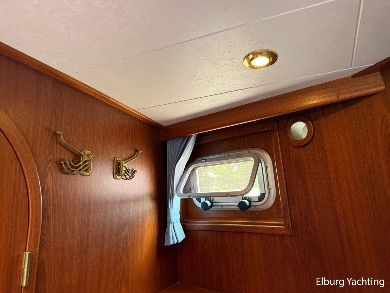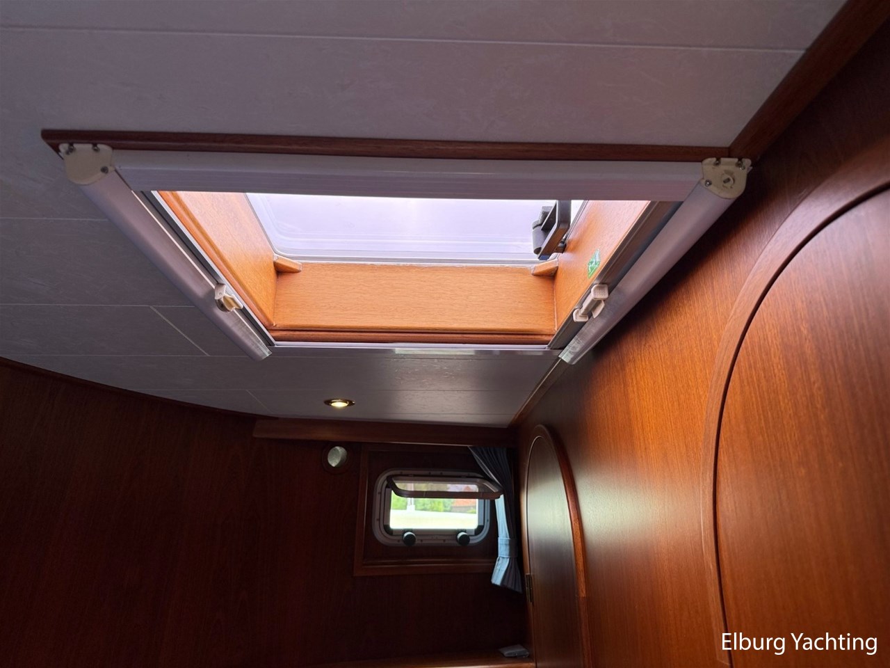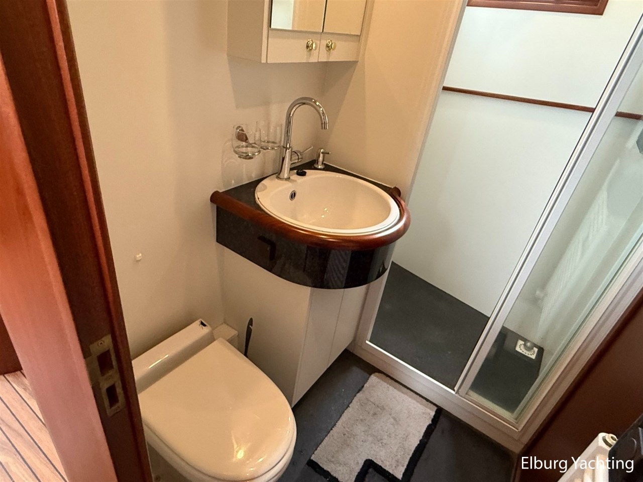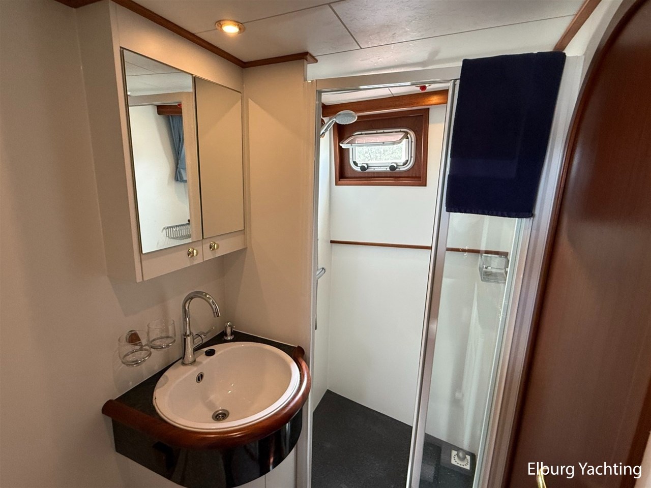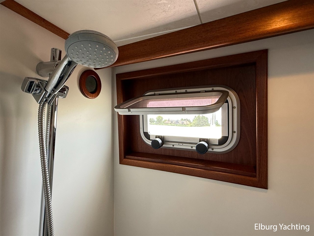 The boat is fitted with stainless steel railings all around and the deck is fitted with anti-slip paint with a Teak deck on the afterdeck. The mast can be lowered electrically and, when lowered, creates a vertical clearance of appr. 3 metres, making this Alm Classic 14.15 possibly suitable for the French canals. To ensure comfort, also when mooring, there are three guard rails: midships to starboard and port and in the stern to the swimming platform with teak. The spacious afterdeck features a Teak-lined cockpit bench under which there is plenty of storage space. Below the cockpit is a large storage hatch and access to the organised engine room. Through the sliding door on the afterdeck, the ground-level saloon + galley and wheelhouse can be comfortably reached. The wheelhouse has plenty of light through the sliding roof and the double-glazed Gebo windows fitted with aluminium window frames + window sails/sun blinds all around. Sliding doors on both starboard and port sides make the gangways easily accessible. The corridor can be accessed via stairs, with the guest cabin located directly to port. Further along is the wet room. The wet room can be accessed from the corridor and from the owner's cabin and is equipped with a spacious shower cubicle, electric toilet and washing facilities. The owner's cabin is equipped with a double French bed.