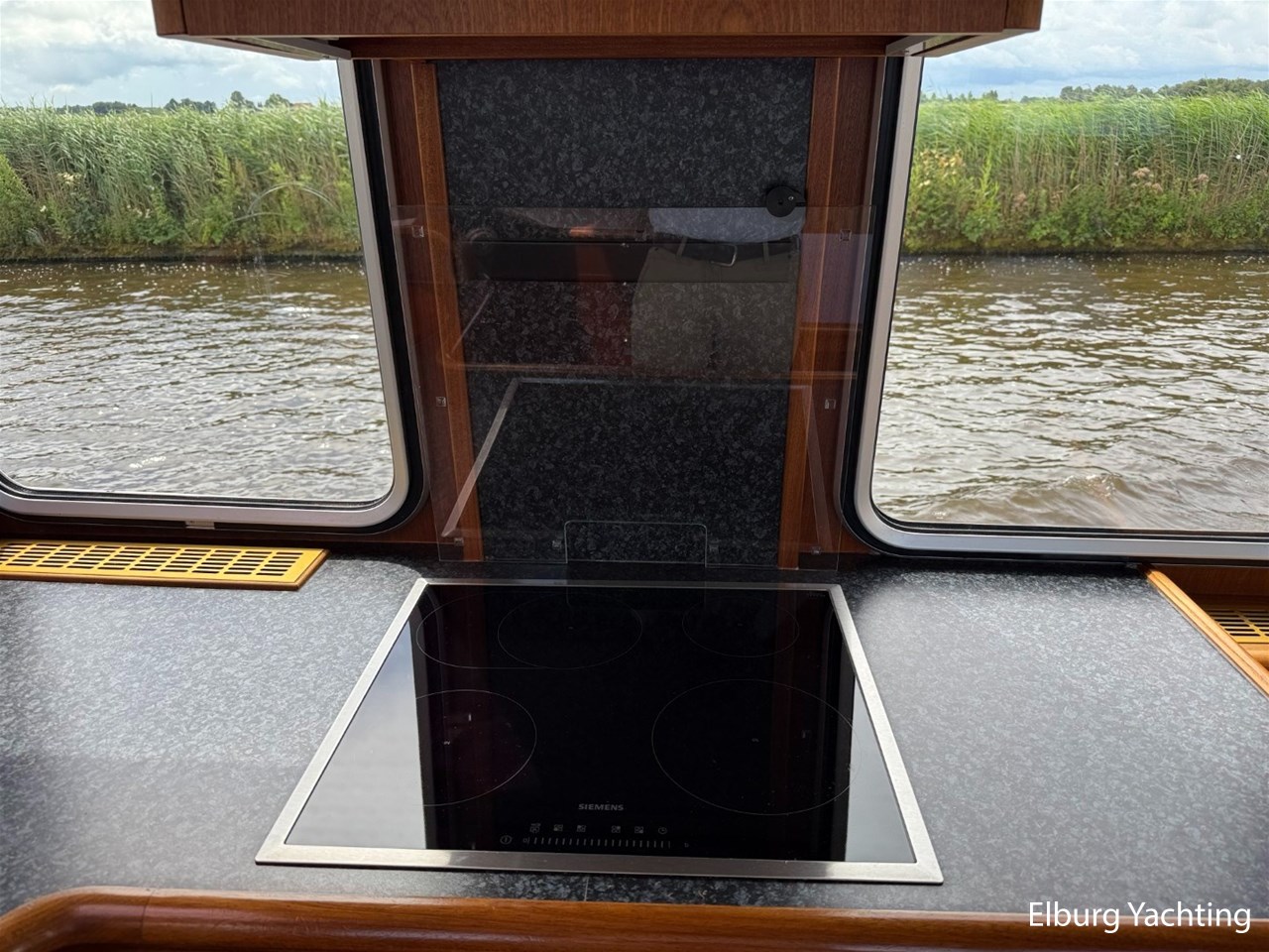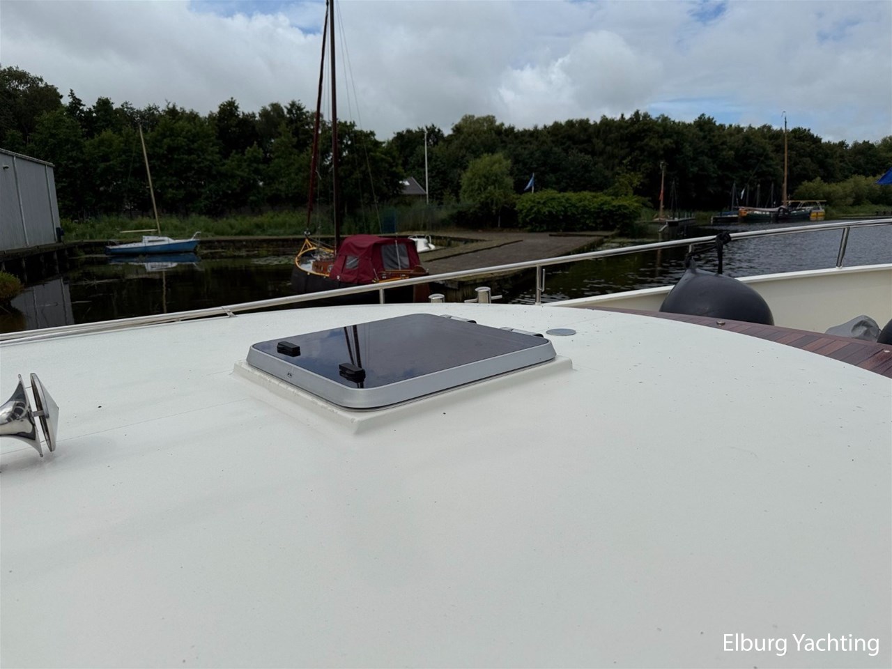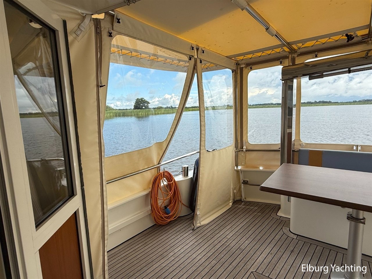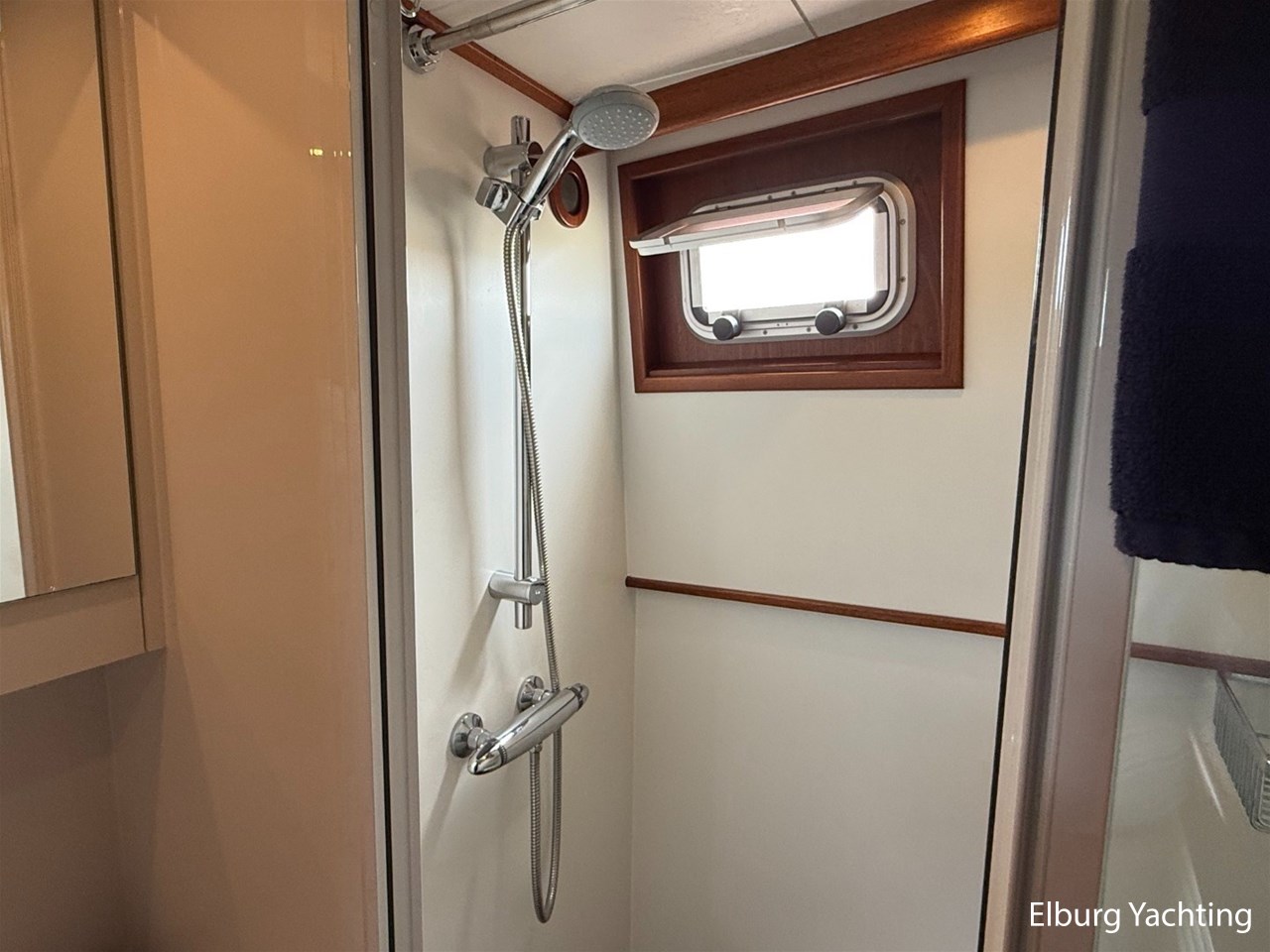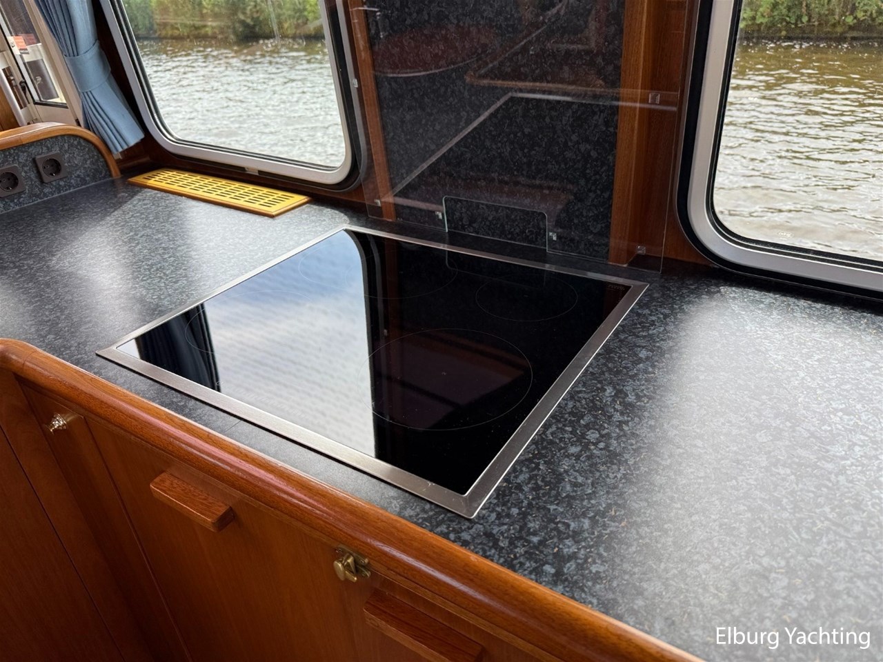 The boat is fitted with stainless steel railings all around and the deck is fitted with anti-slip paint with a Teak deck on the afterdeck. The mast can be lowered electrically and, when lowered, creates a vertical clearance of appr. 3 metres, making this Alm Classic 14.15 possibly suitable for the French canals. To ensure comfort, also when mooring, there are three guard rails: midships to starboard and port and in the stern to the swimming platform with teak. The spacious afterdeck features a Teak-lined cockpit bench under which there is plenty of storage space. Below the cockpit is a large storage hatch and access to the organised engine room. Through the sliding door on the afterdeck, the ground-level saloon + galley and wheelhouse can be comfortably reached. The wheelhouse has plenty of light through the sliding roof and the double-glazed Gebo windows fitted with aluminium window frames + window sails/sun blinds all around. Sliding doors on both starboard and port sides make the gangways easily accessible. The corridor can be accessed via stairs, with the guest cabin located directly to port. Further along is the wet room. The wet room can be accessed from the corridor and from the owner's cabin and is equipped with a spacious shower cubicle, electric toilet and washing facilities. The owner's cabin is equipped with a double French bed.