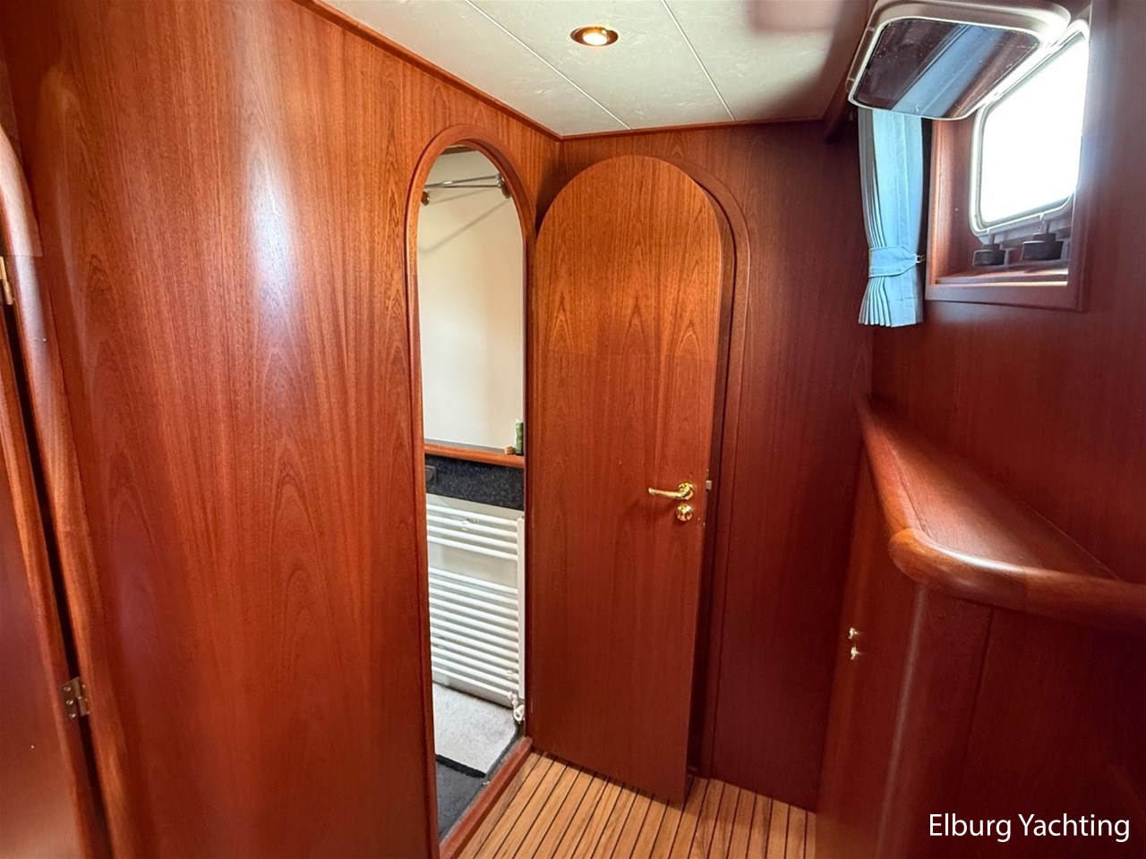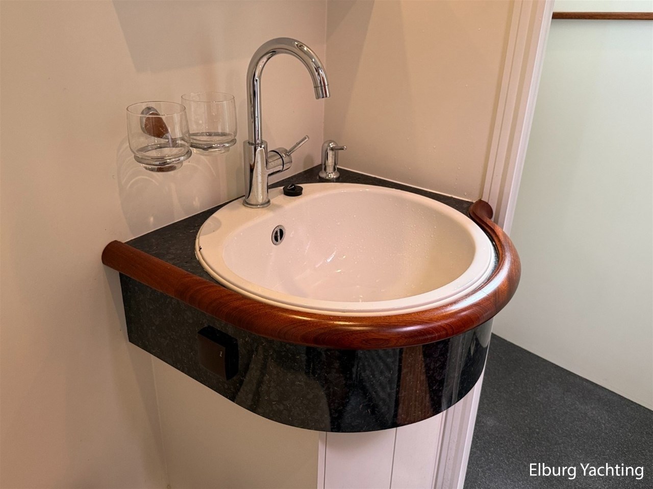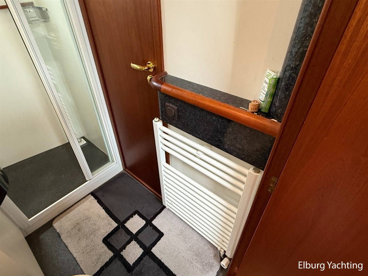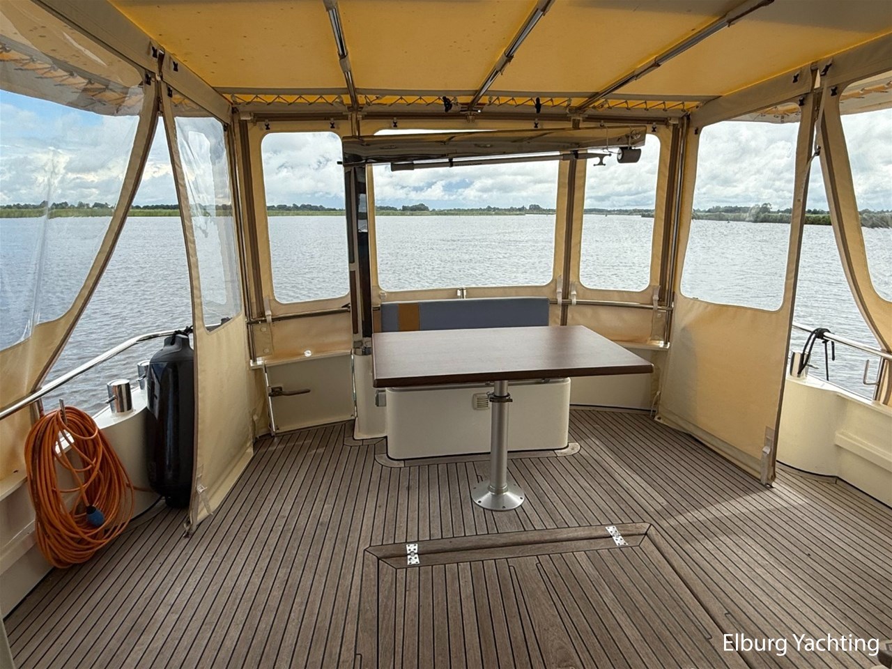 The boat is fitted with stainless steel railings all around and the deck is fitted with anti-slip paint with a Teak deck on the afterdeck. The mast can be lowered electrically and, when lowered, creates a vertical clearance of appr. 3 metres, making this Alm Classic 14.15 possibly suitable for the French canals. To ensure comfort, also when mooring, there are three guard rails: midships to starboard and port and in the stern to the swimming platform with teak. The spacious afterdeck features a Teak-lined cockpit bench under which there is plenty of storage space. Below the cockpit is a large storage hatch and access to the organised engine room. Through the sliding door on the afterdeck, the ground-level saloon + galley and wheelhouse can be comfortably reached. The wheelhouse has plenty of light through the sliding roof and the double-glazed Gebo windows fitted with aluminium window frames + window sails/sun blinds all around. Sliding doors on both starboard and port sides make the gangways easily accessible. The corridor can be accessed via stairs, with the guest cabin located directly to port. Further along is the wet room. The wet room can be accessed from the corridor and from the owner's cabin and is equipped with a spacious shower cubicle, electric toilet and washing facilities. The owner's cabin is equipped with a double French bed.