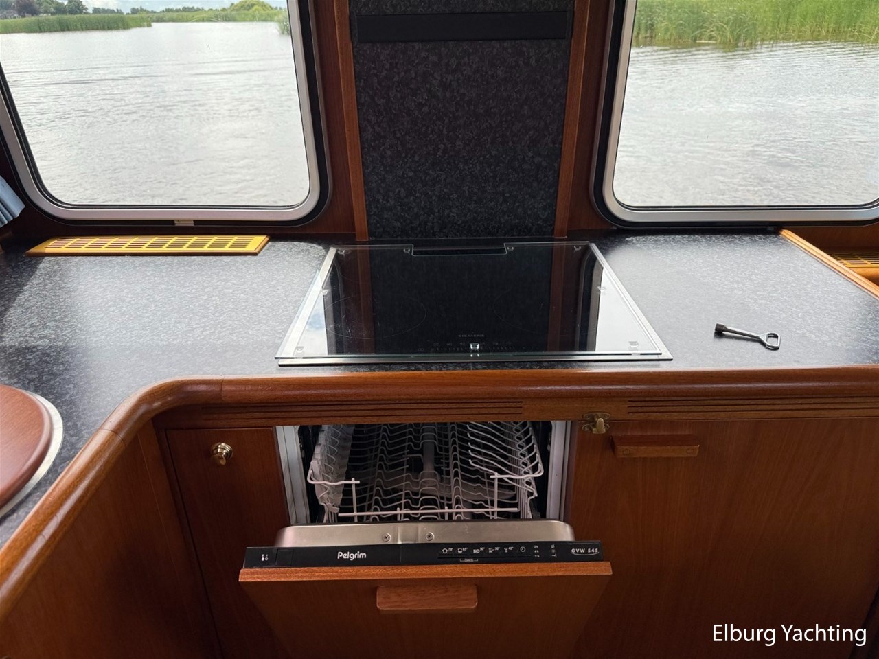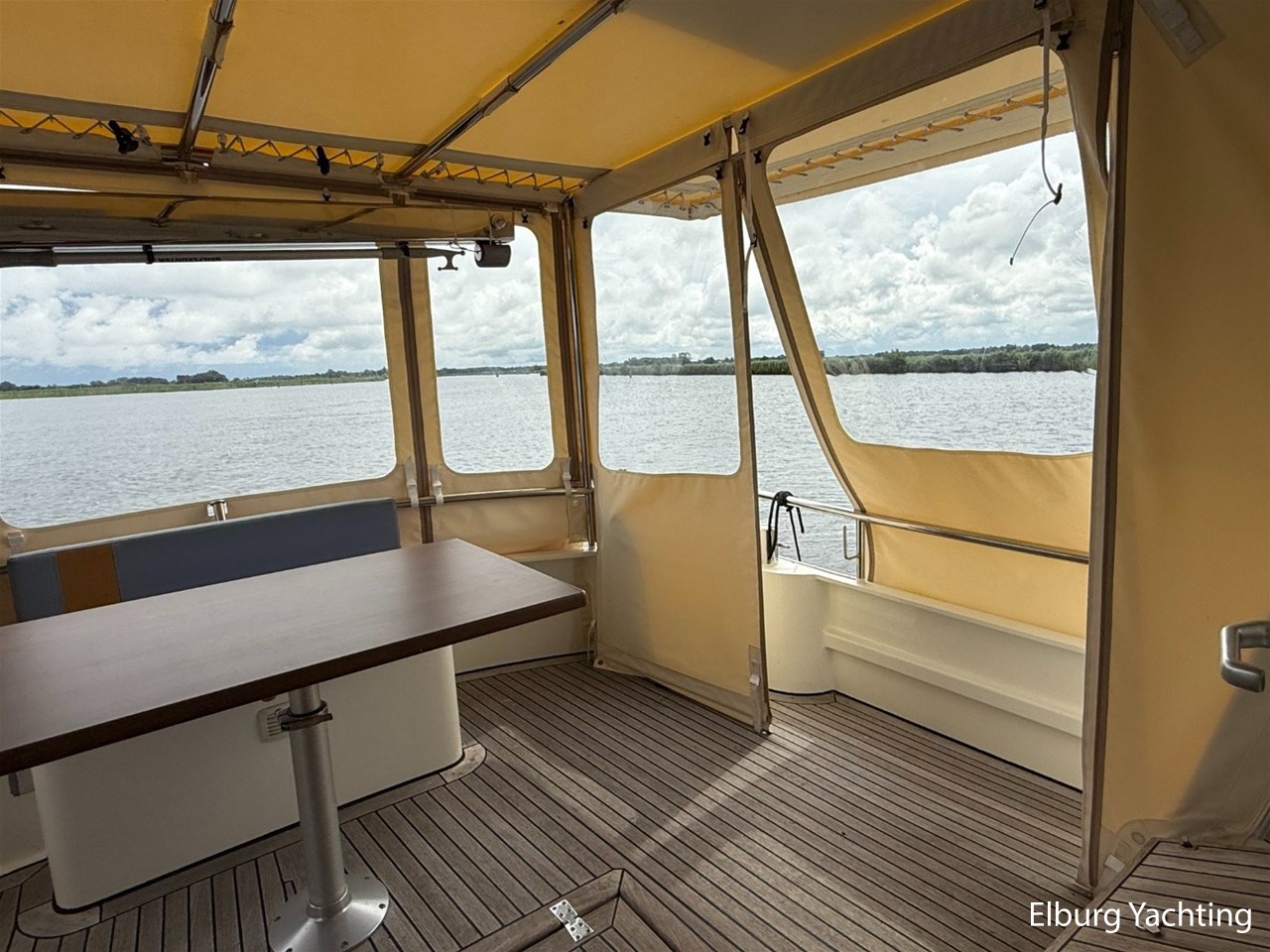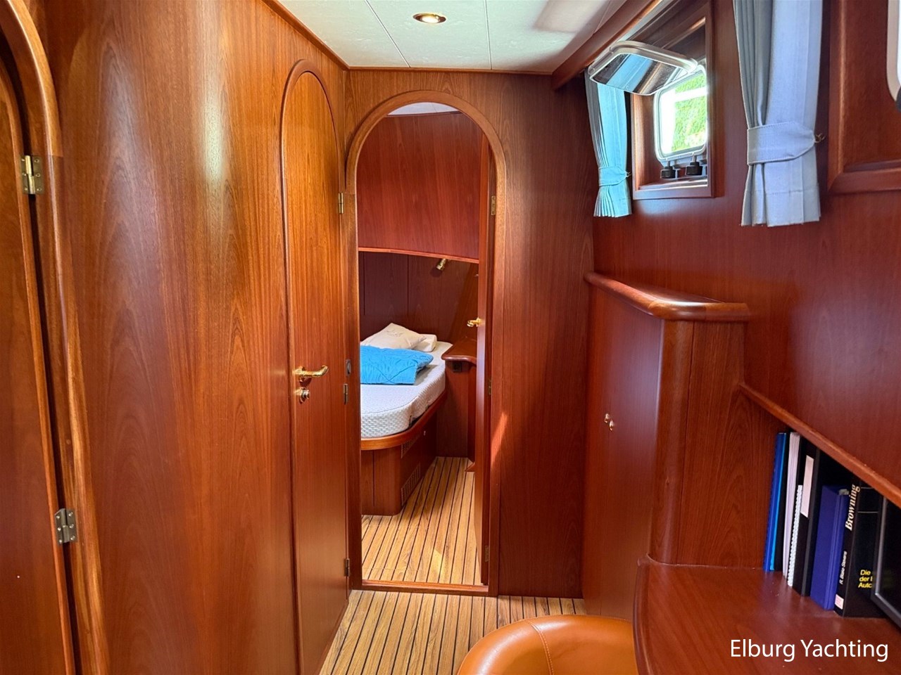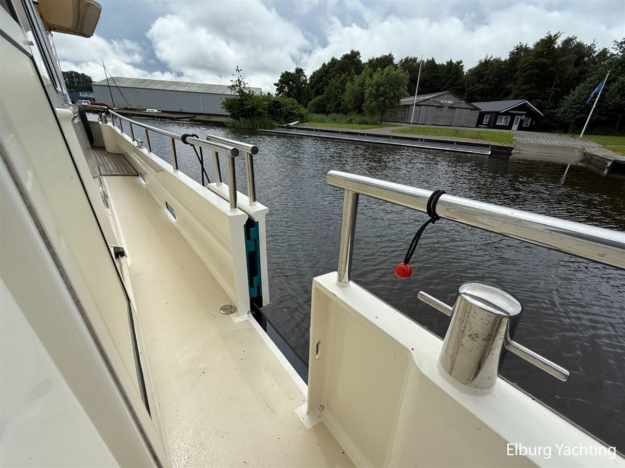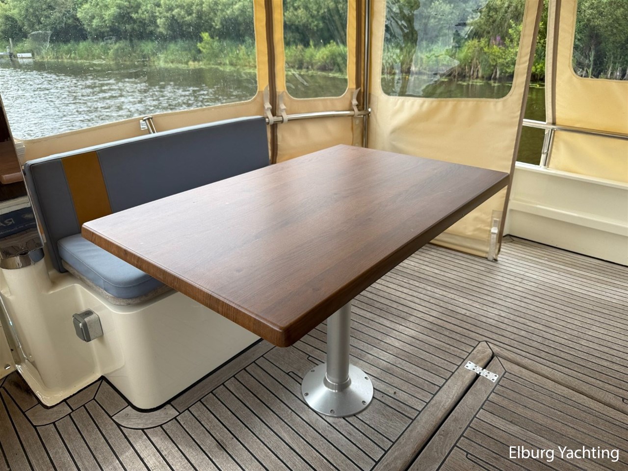 The boat is fitted with stainless steel railings all around and the deck is fitted with anti-slip paint with a Teak deck on the afterdeck. The mast can be lowered electrically and, when lowered, creates a vertical clearance of appr. 3 metres, making this Alm Classic 14.15 possibly suitable for the French canals. To ensure comfort, also when mooring, there are three guard rails: midships to starboard and port and in the stern to the swimming platform with teak. The spacious afterdeck features a Teak-lined cockpit bench under which there is plenty of storage space. Below the cockpit is a large storage hatch and access to the organised engine room. Through the sliding door on the afterdeck, the ground-level saloon + galley and wheelhouse can be comfortably reached. The wheelhouse has plenty of light through the sliding roof and the double-glazed Gebo windows fitted with aluminium window frames + window sails/sun blinds all around. Sliding doors on both starboard and port sides make the gangways easily accessible. The corridor can be accessed via stairs, with the guest cabin located directly to port. Further along is the wet room. The wet room can be accessed from the corridor and from the owner's cabin and is equipped with a spacious shower cubicle, electric toilet and washing facilities. The owner's cabin is equipped with a double French bed.