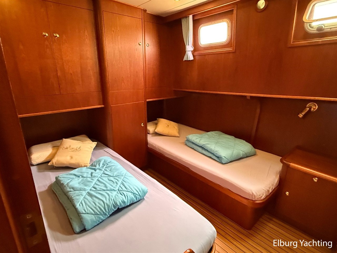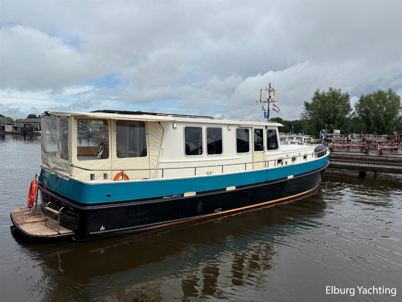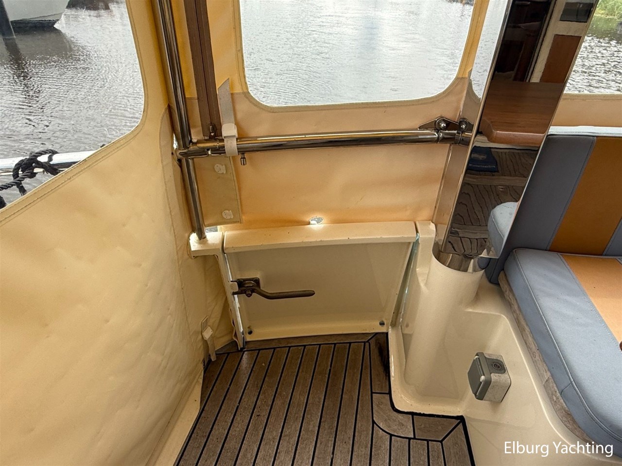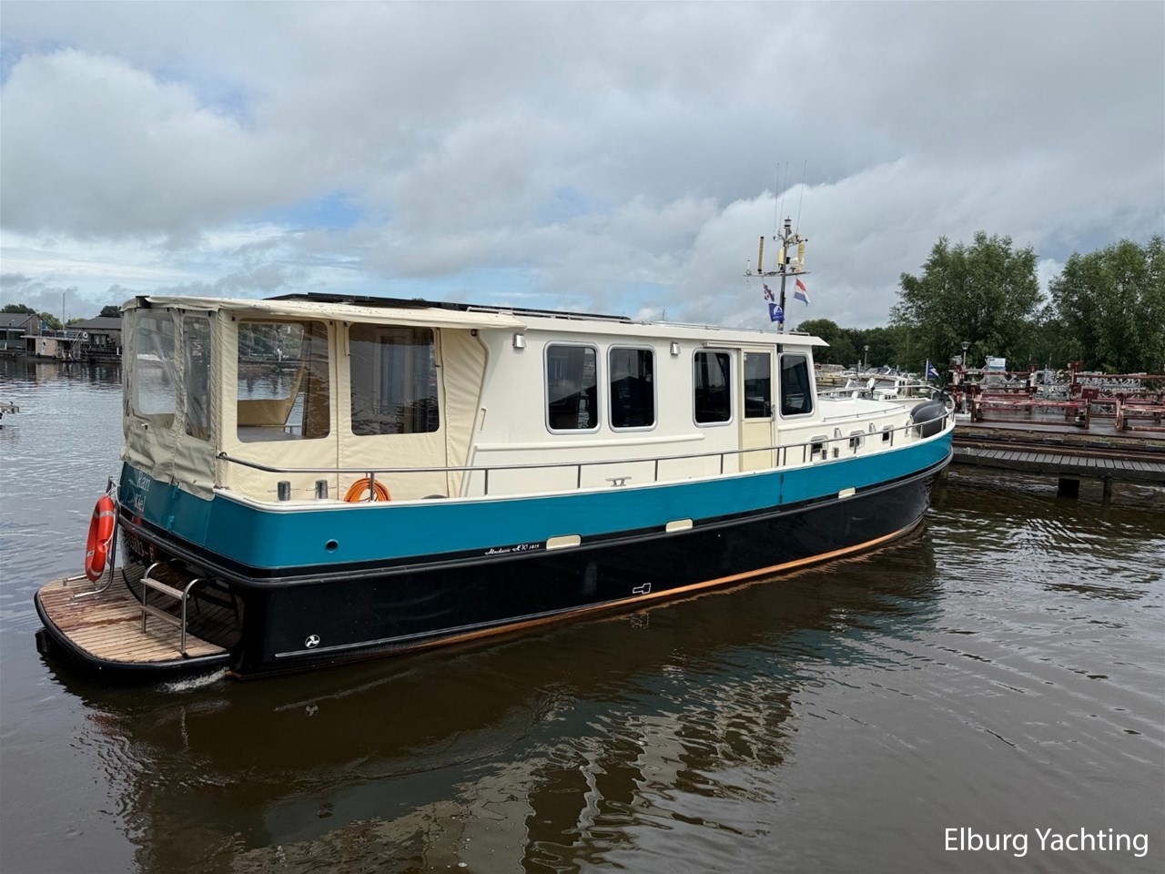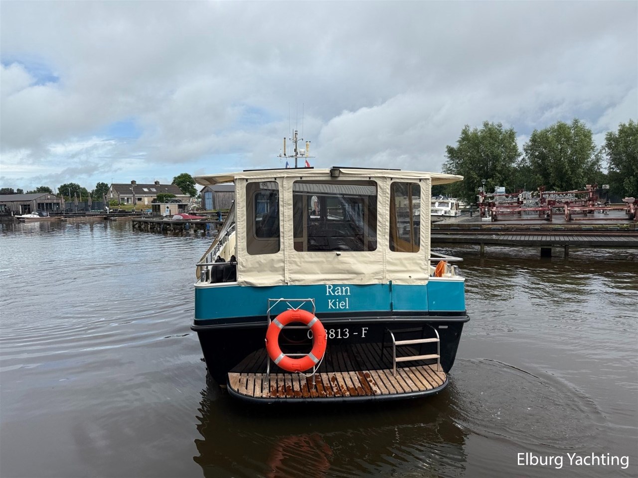 The boat is fitted with stainless steel railings all around and the deck is fitted with anti-slip paint with a Teak deck on the afterdeck. The mast can be lowered electrically and, when lowered, creates a vertical clearance of appr. 3 metres, making this Alm Classic 14.15 possibly suitable for the French canals. To ensure comfort, also when mooring, there are three guard rails: midships to starboard and port and in the stern to the swimming platform with teak. The spacious afterdeck features a Teak-lined cockpit bench under which there is plenty of storage space. Below the cockpit is a large storage hatch and access to the organised engine room. Through the sliding door on the afterdeck, the ground-level saloon + galley and wheelhouse can be comfortably reached. The wheelhouse has plenty of light through the sliding roof and the double-glazed Gebo windows fitted with aluminium window frames + window sails/sun blinds all around. Sliding doors on both starboard and port sides make the gangways easily accessible. The corridor can be accessed via stairs, with the guest cabin located directly to port. Further along is the wet room. The wet room can be accessed from the corridor and from the owner's cabin and is equipped with a spacious shower cubicle, electric toilet and washing facilities. The owner's cabin is equipped with a double French bed.