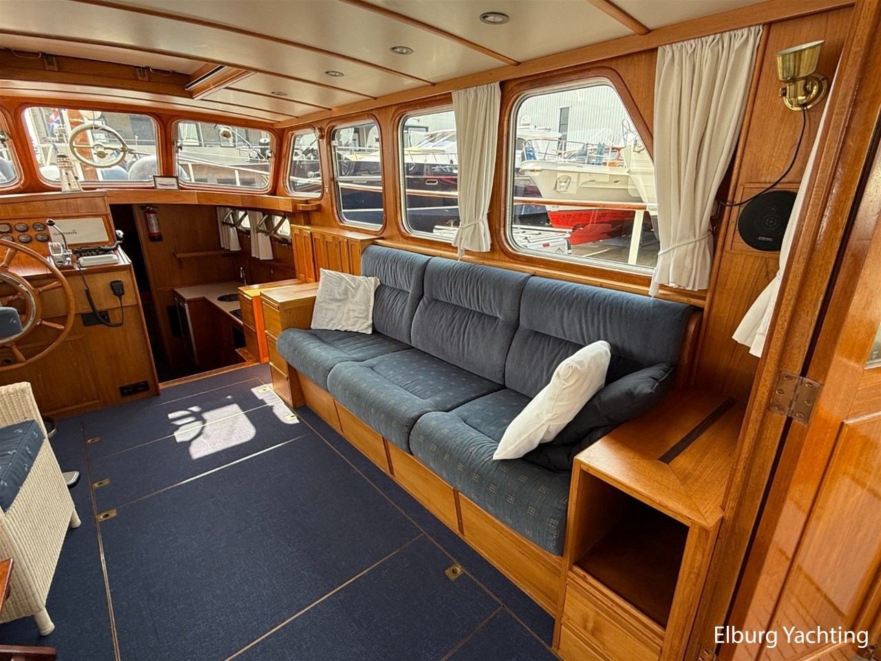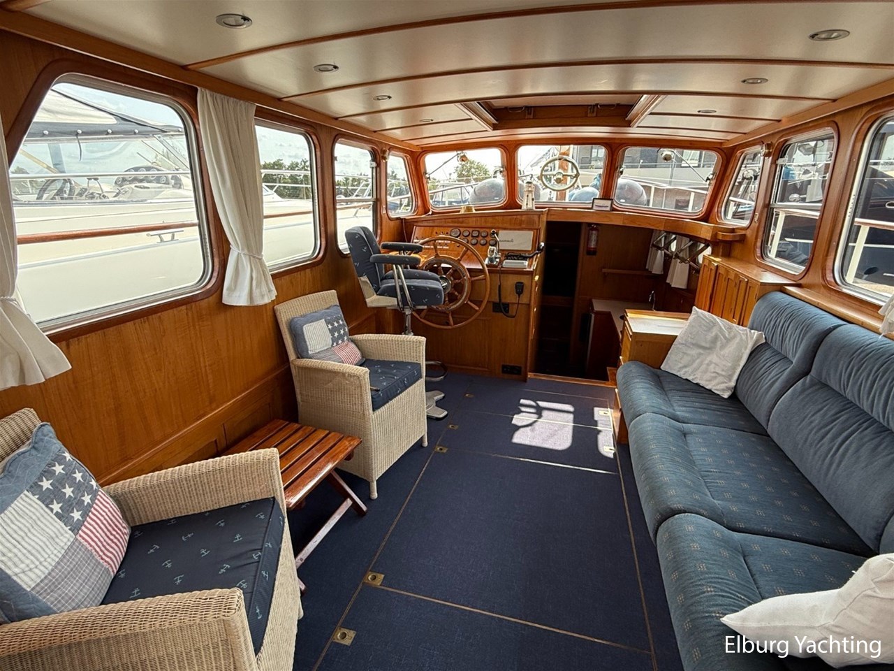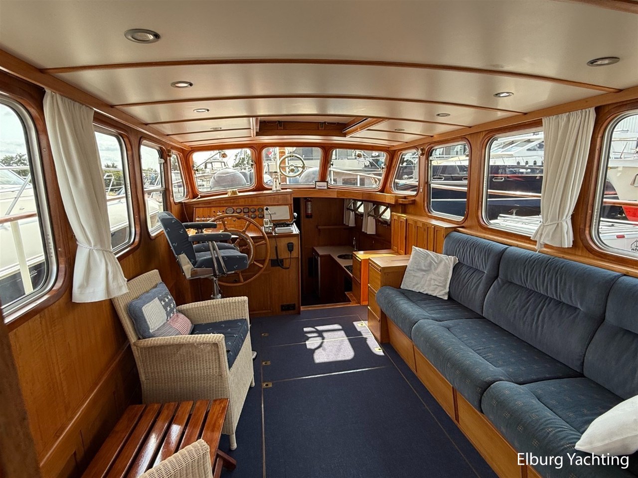 - Ship Teak interior with blue upholstery and recent blue carpeting